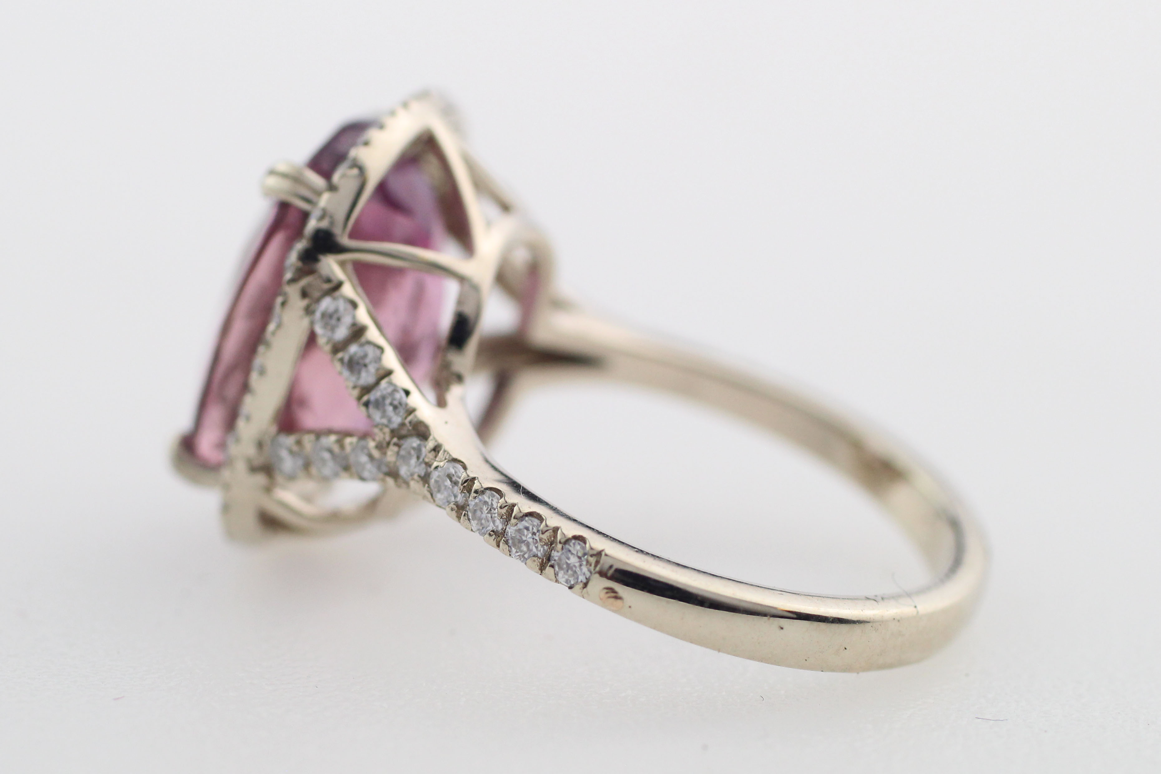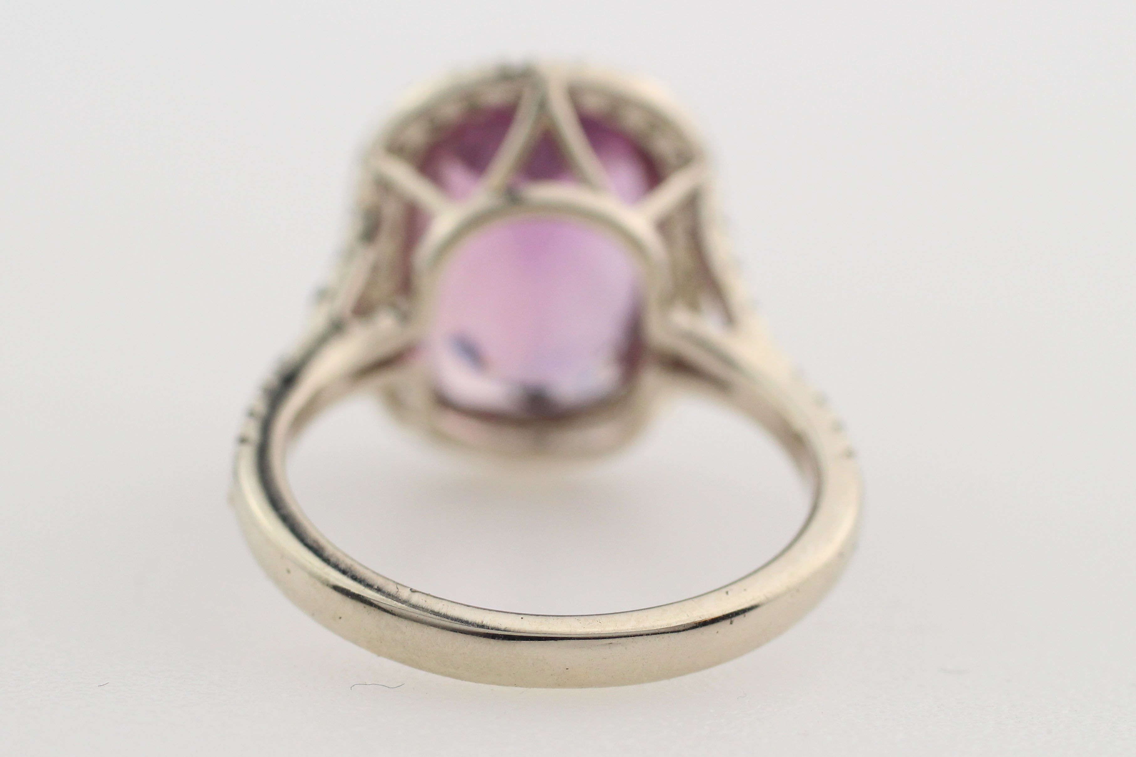 Ring 14K vitguld med en oval, blandslipad fancy Tanzanit (Zoisite). Den naturliga Tanzaniten är transparent rosa/lila till färgen och mäter 13,47 x 10,17 x 7,00 mm och har en vikt av 7,88ct. Ädelstensrapport utfärdad av Asian Institute of Gemological Services, #GF16061318, daterad 16 juni 2016. På var sida av den delade halvrunda skenan, och runt Tanzaniten finns fyrtioåtta färglösa safirer och moissaniter. Storlek US 7 (går att ändra storlek), vikt ca 5,43 gram. Den rosa Tanzaniten är extremt sällsynt och räknas till de mest ovanligate ädelstenarna i världen. Nyckick.