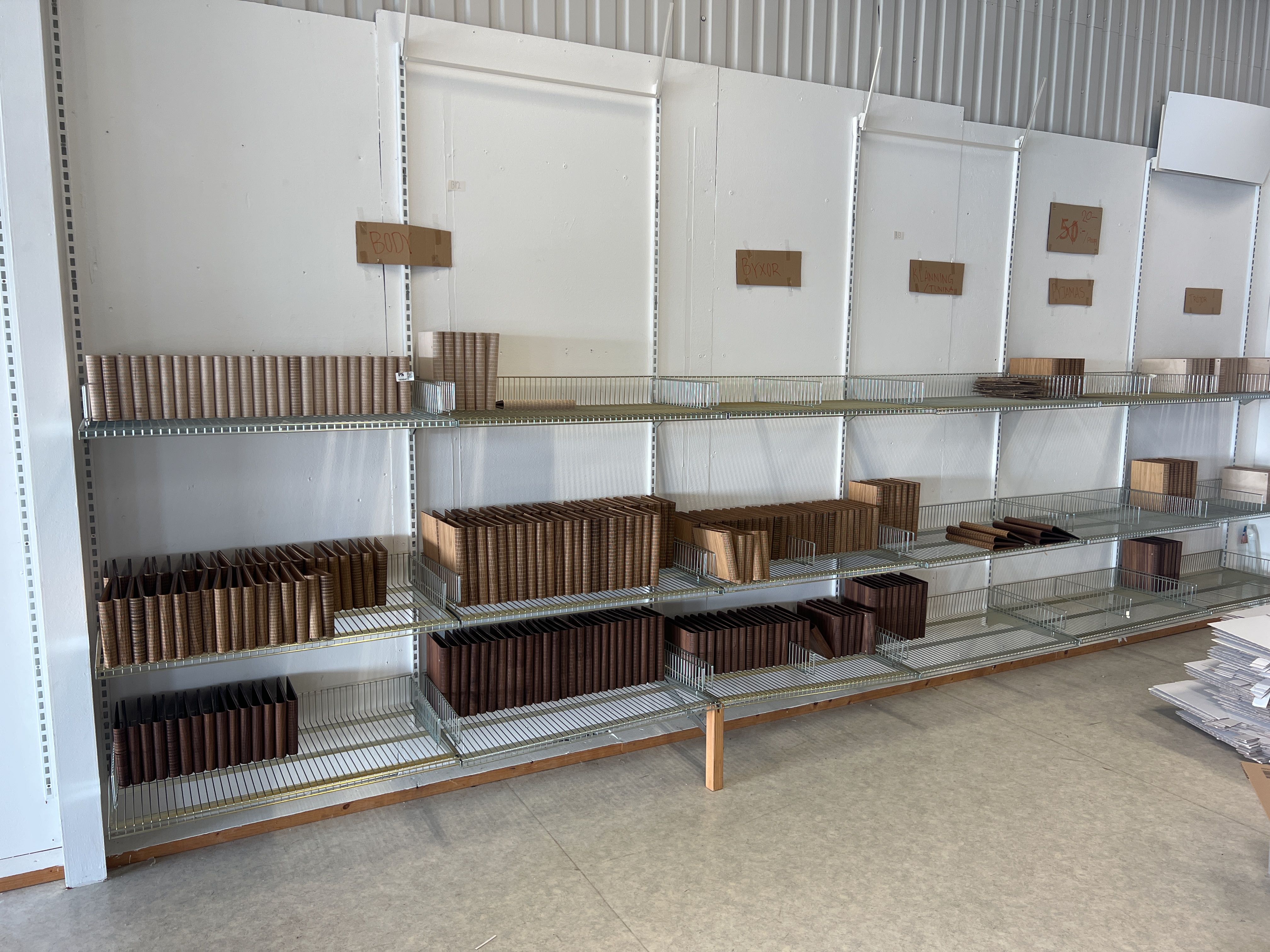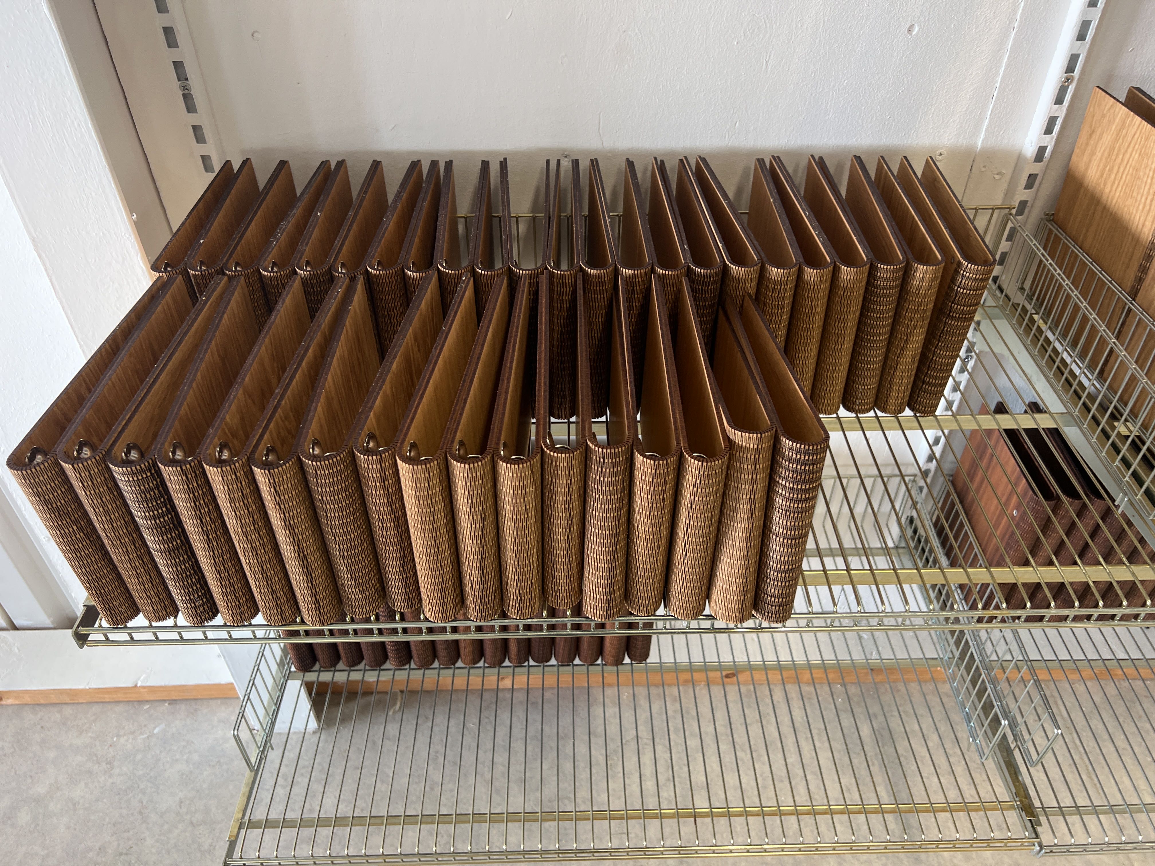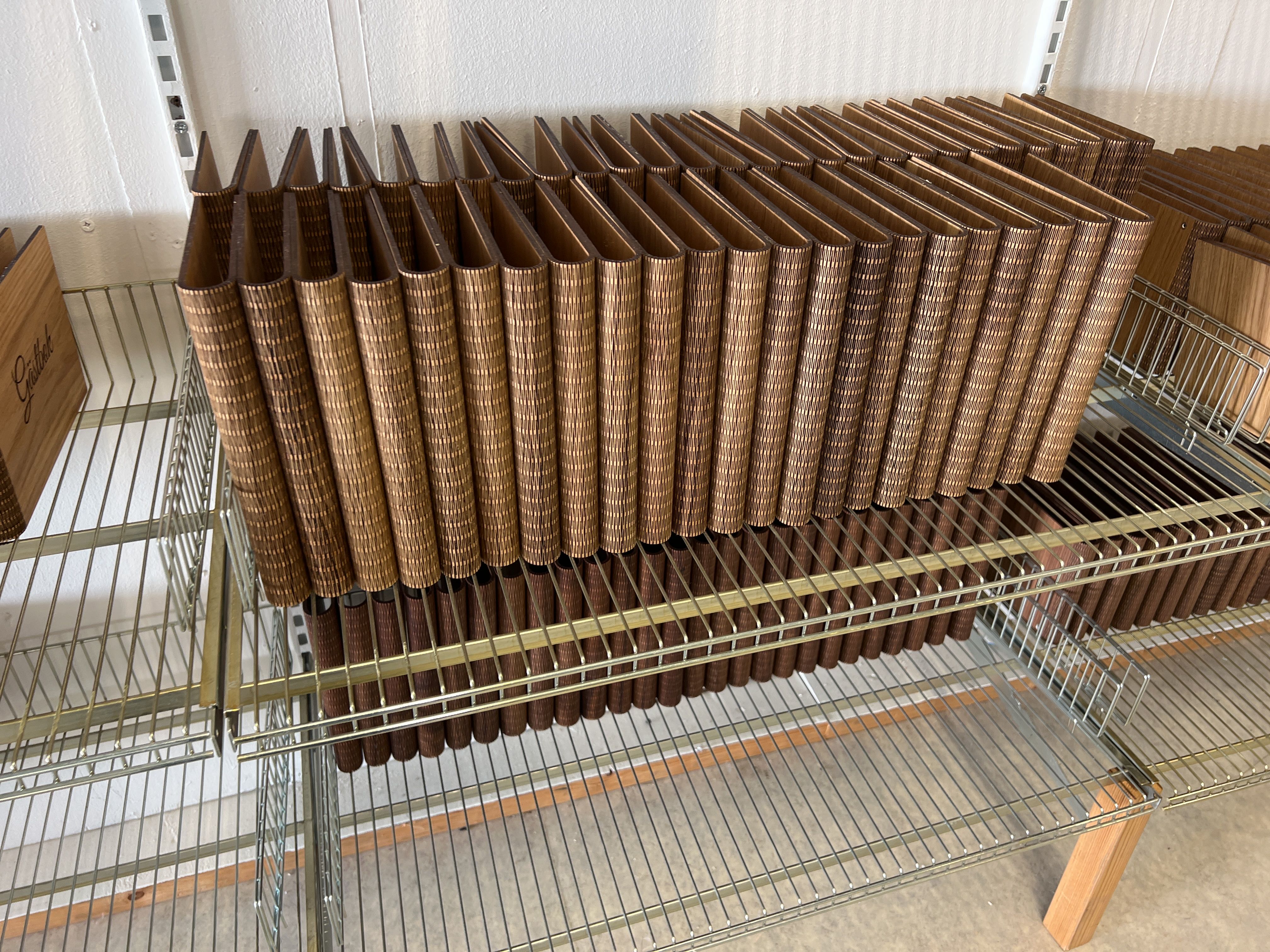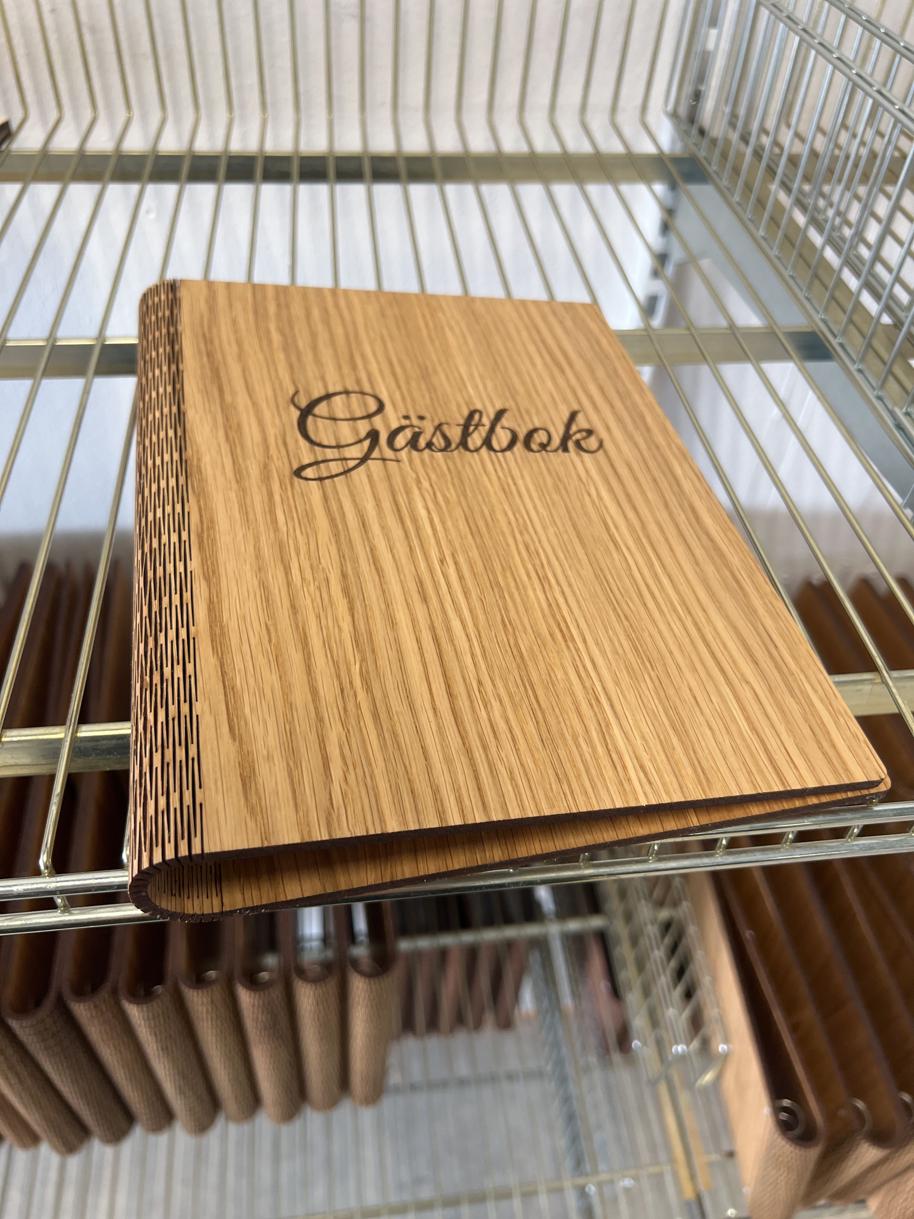 Gästböcker i trä med lösa pappersark i lådor.