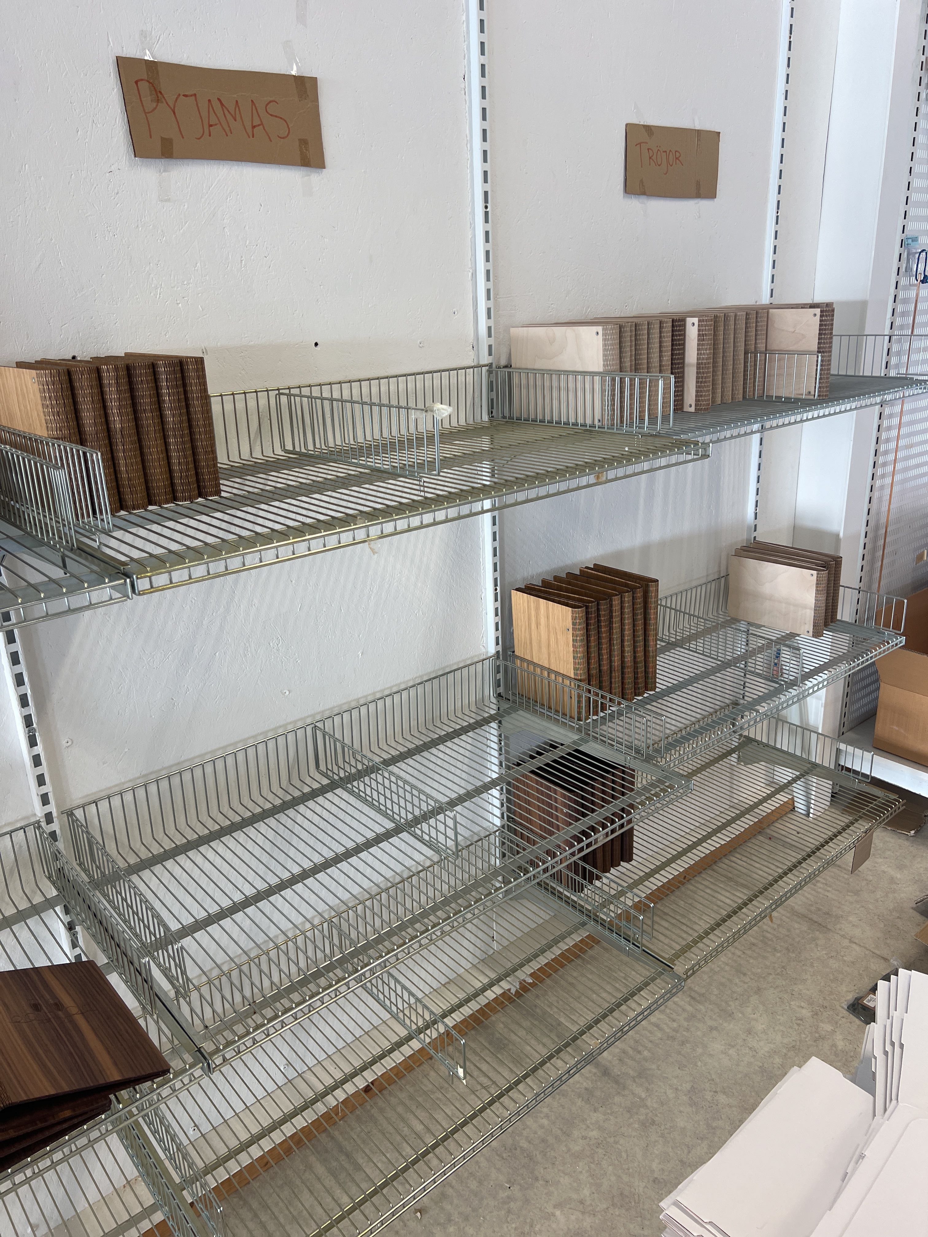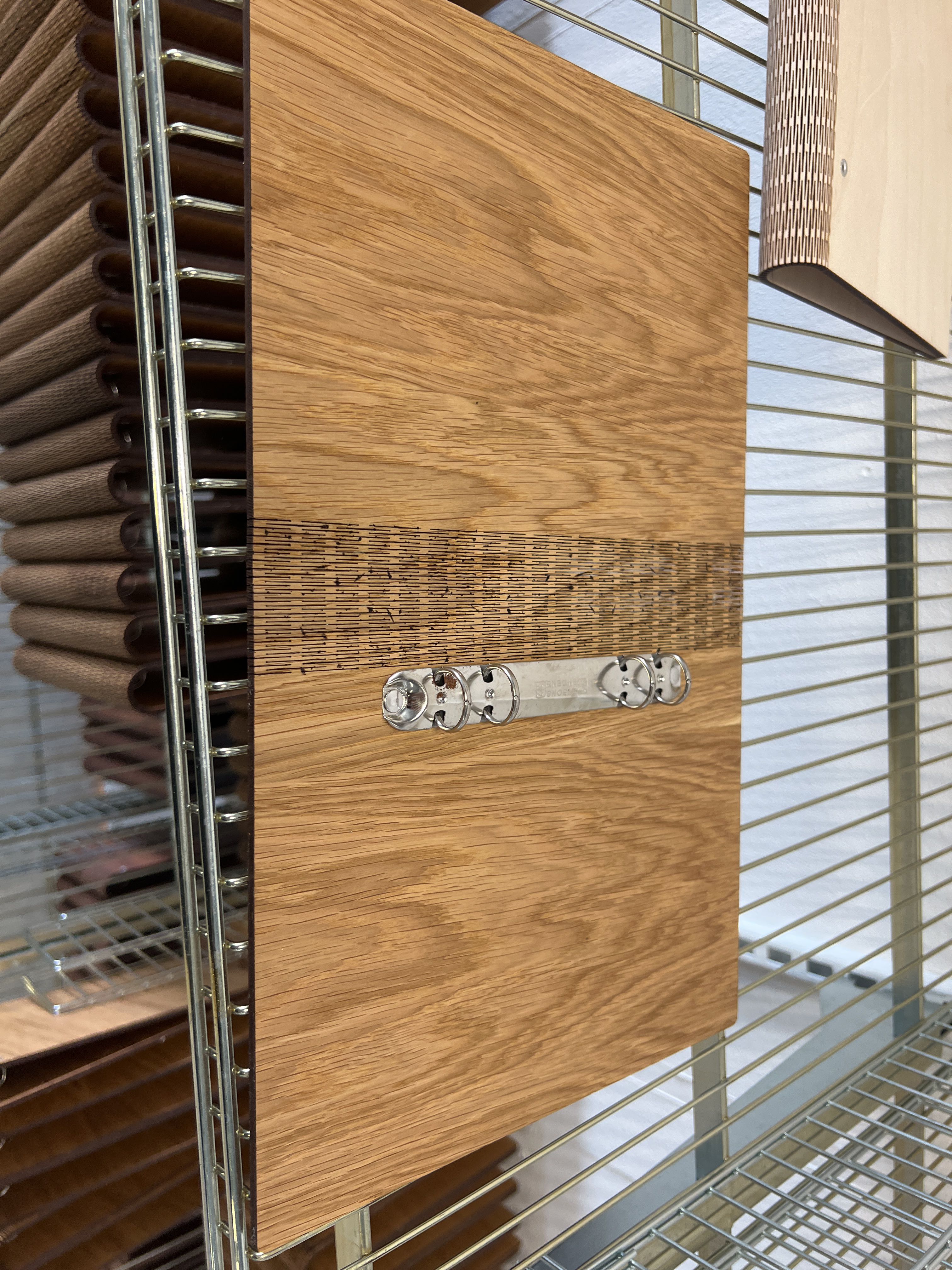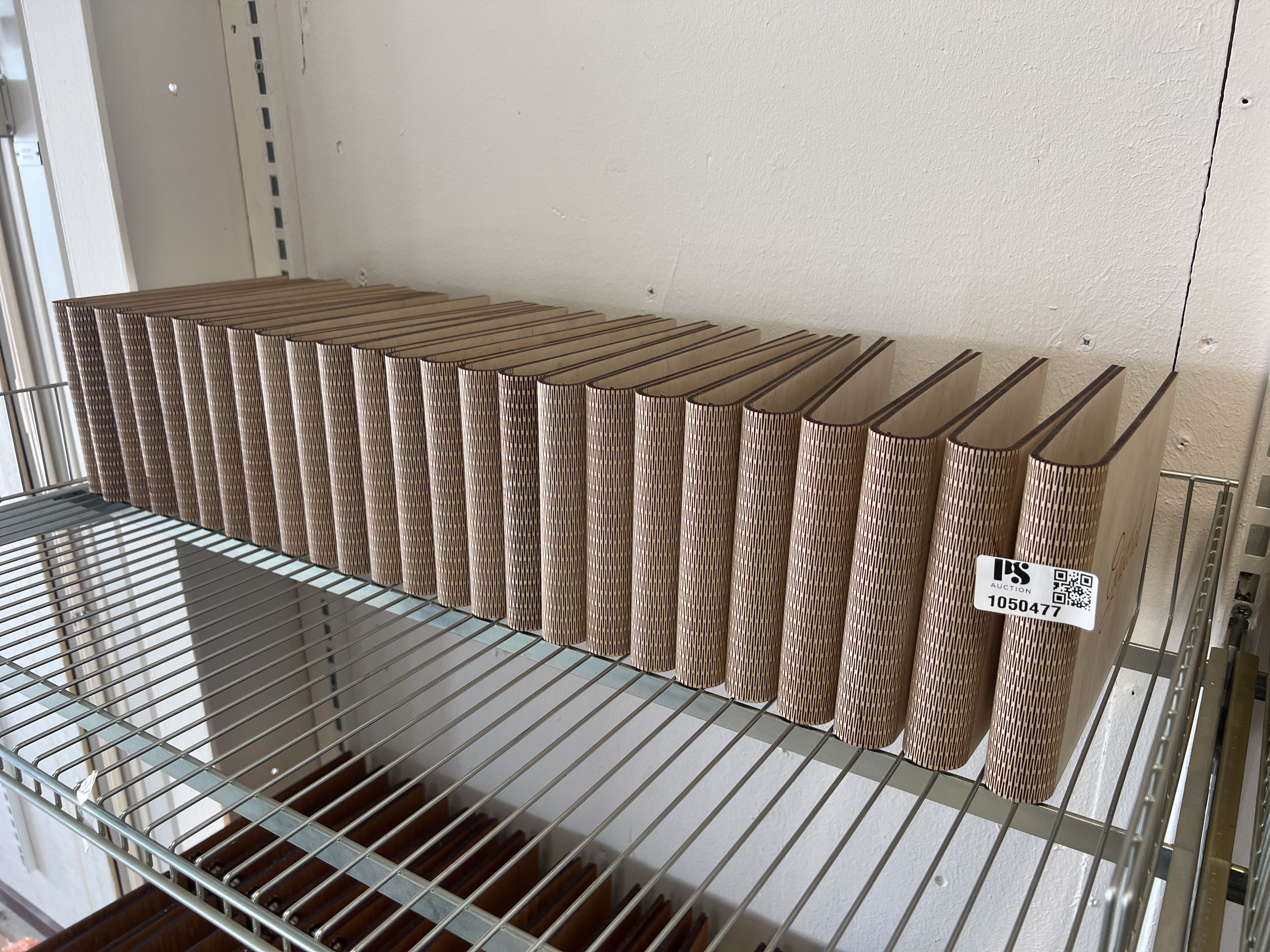 Gästböcker i trä med lösa pappersark i lådor.