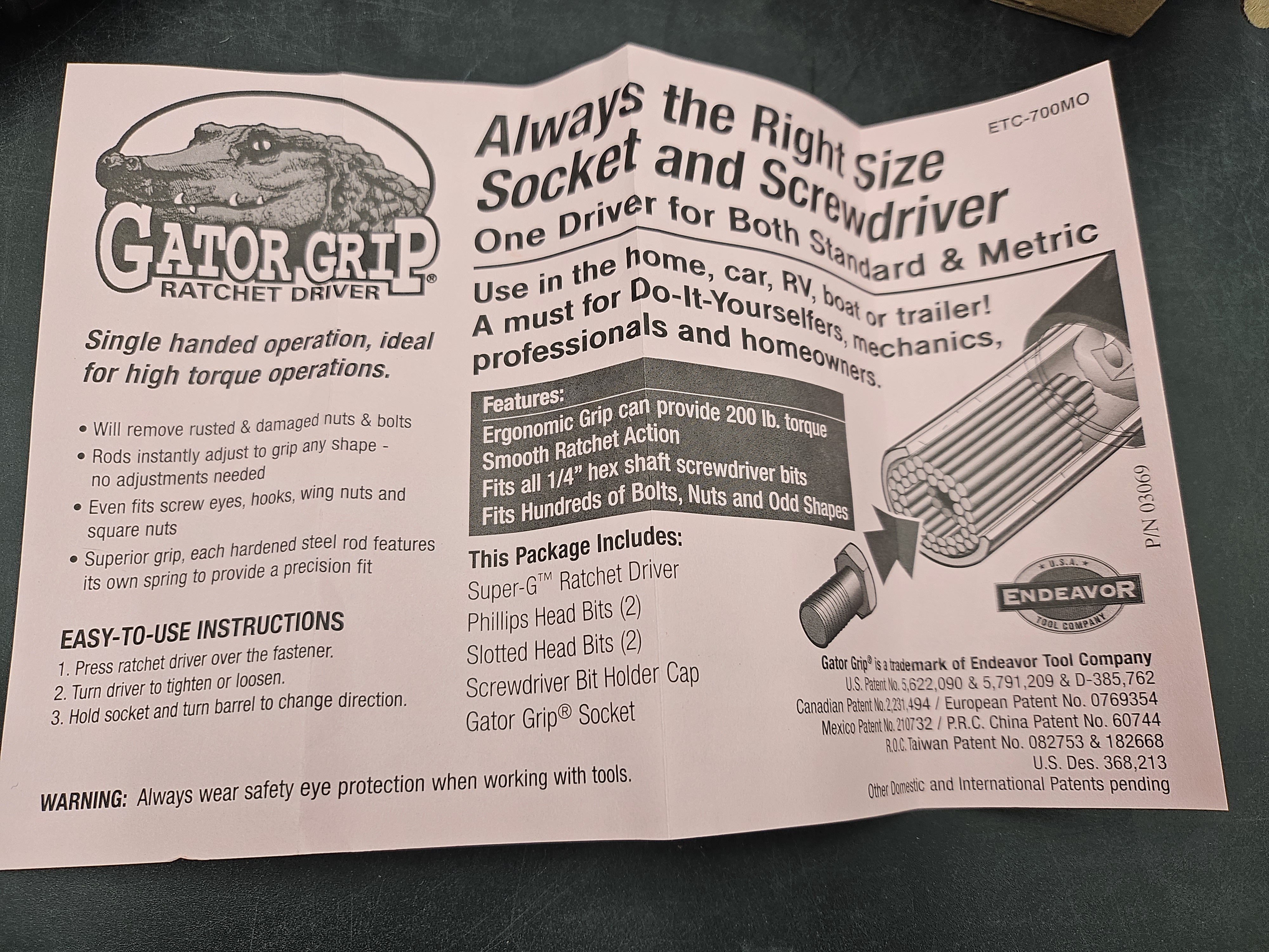 Gator-Grip passar i stort sett allt som inte är runt: sexkantiga muttrar och bultar, ögonbultar, vingmuttrar, fyrkantiga muttrar, trasiga muttrar, krokar med mera. Använd Gator-Grip runt hemmet, på båtar, husbilar, bilar, motorcyklar och cyklar. Tryck bara på den och vrid. Det fungerar utmärkt med elverktyg . Unikt patenterat grepp ger två gånger mer drivkraft än vanliga skruvmejslar. 200 in-lb vridmoment.