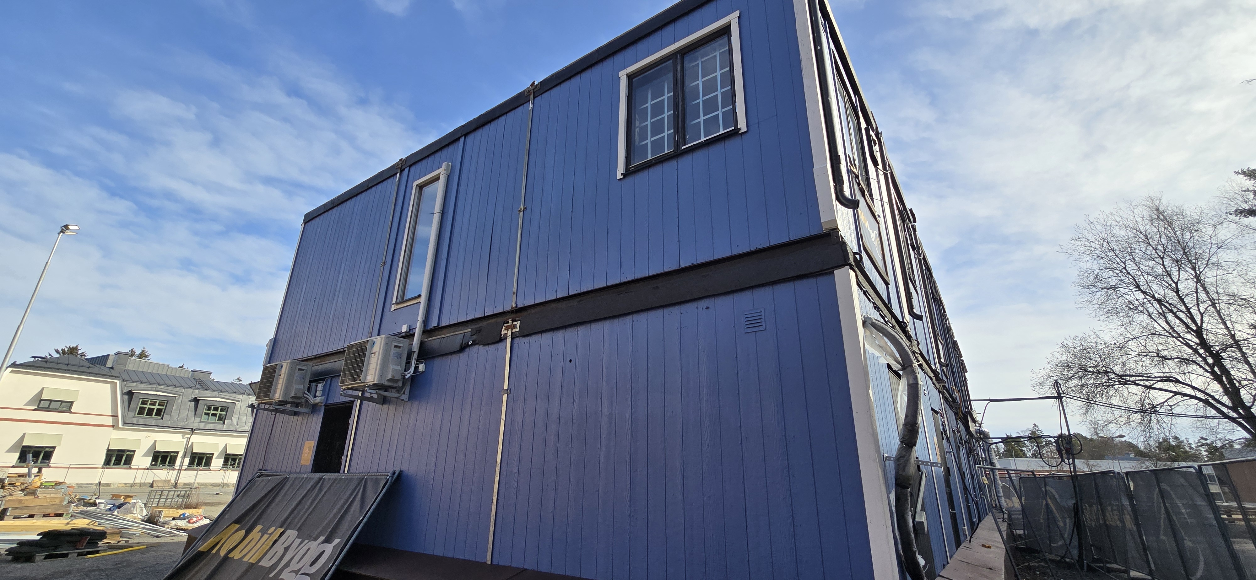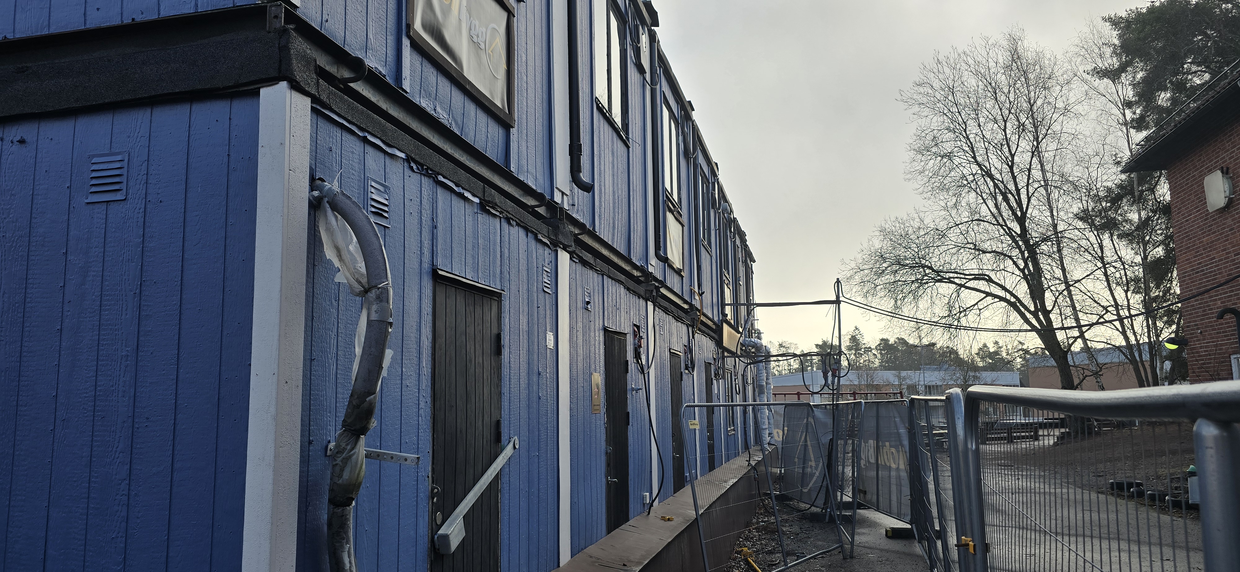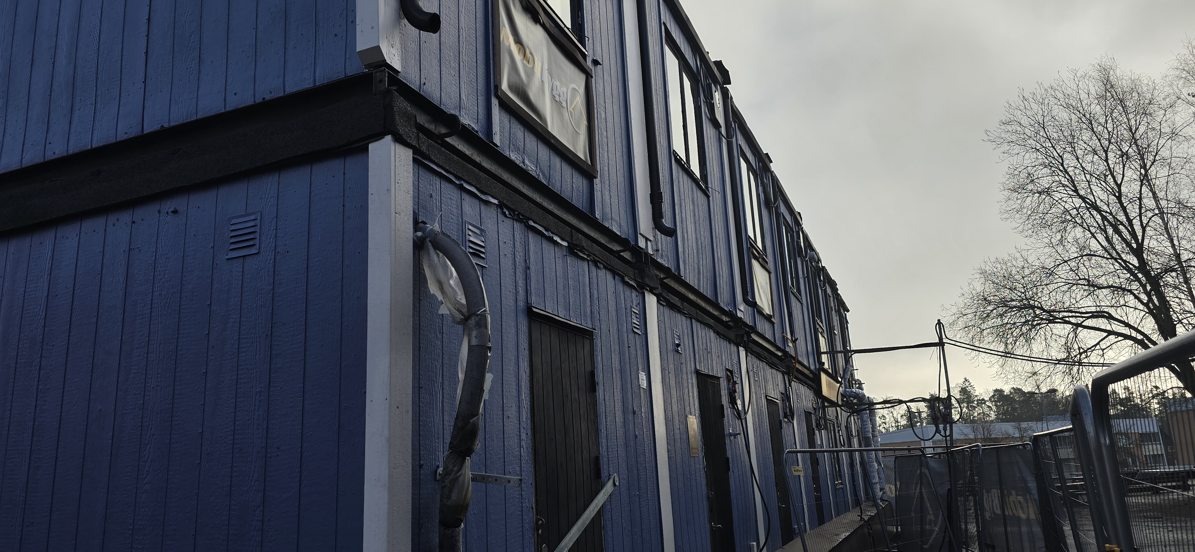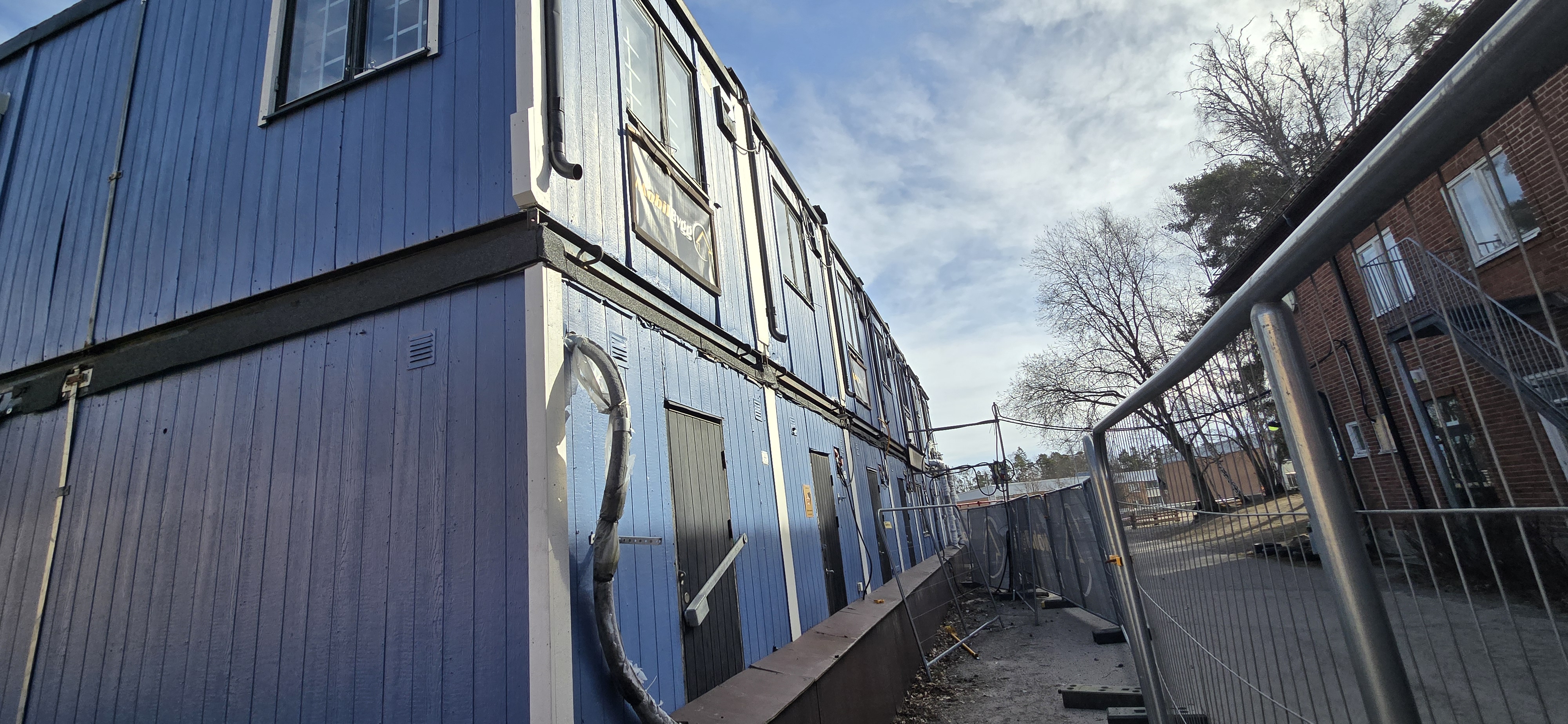 14 st byggbodar ca 1990-2000 års modell uppställda i Tumba. Måste skyndsamt monteras ner och forslas bort senast 29/4-2025.