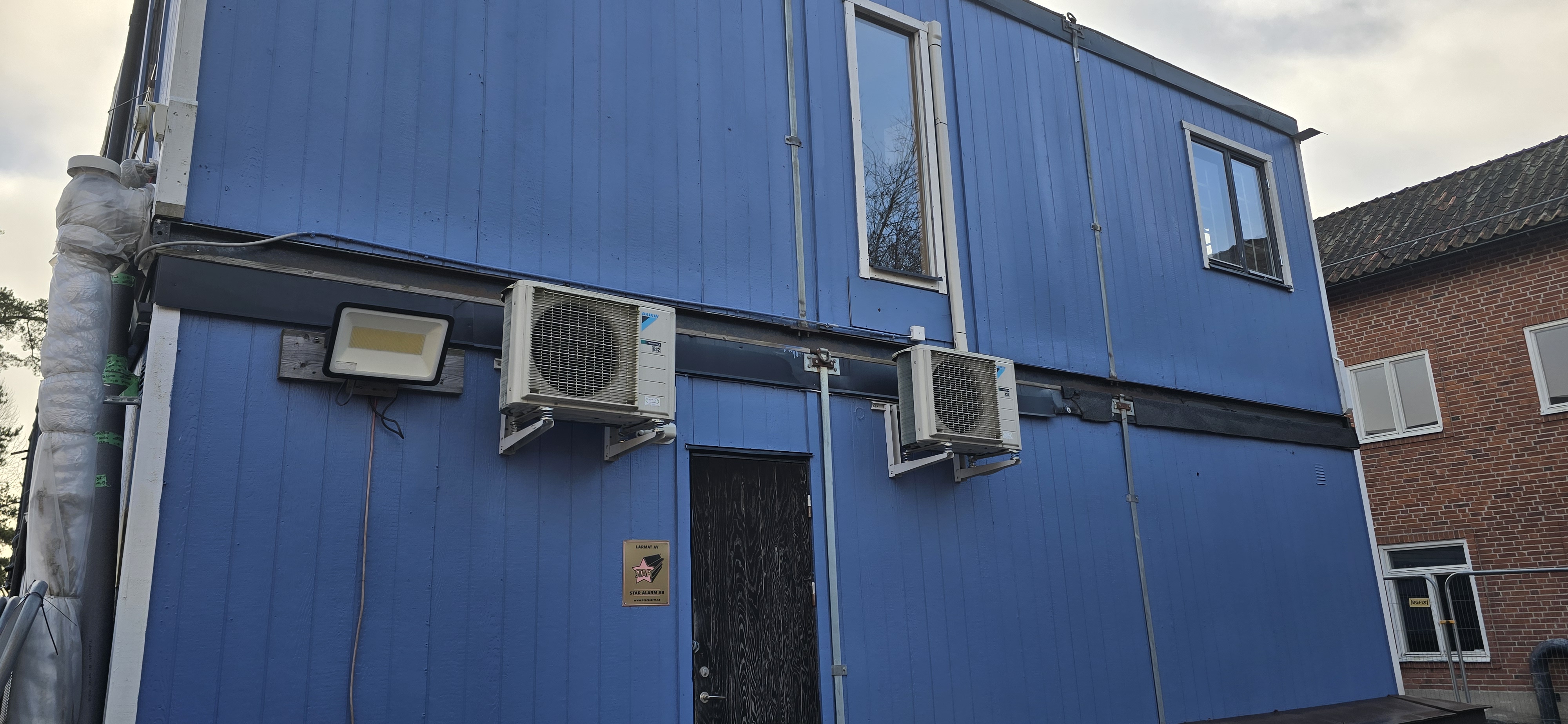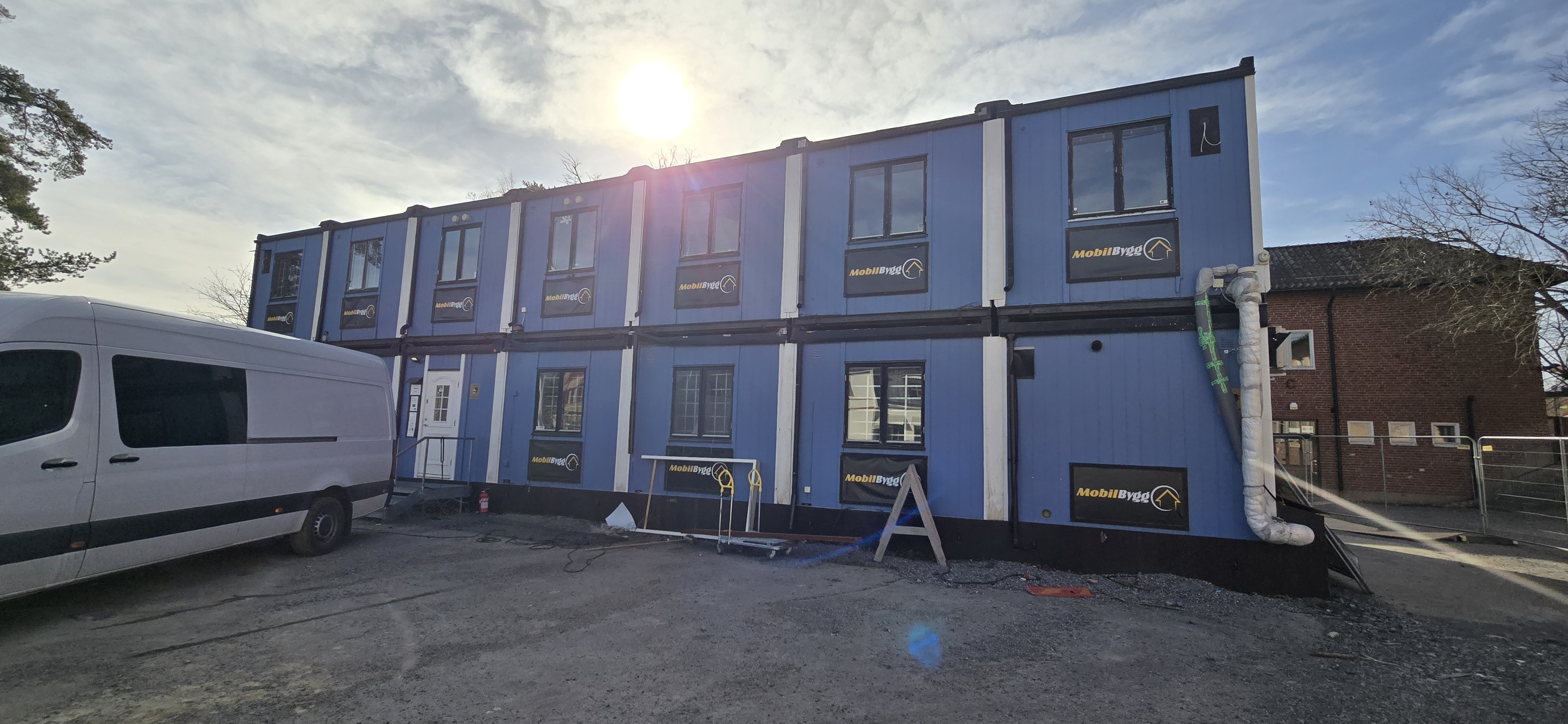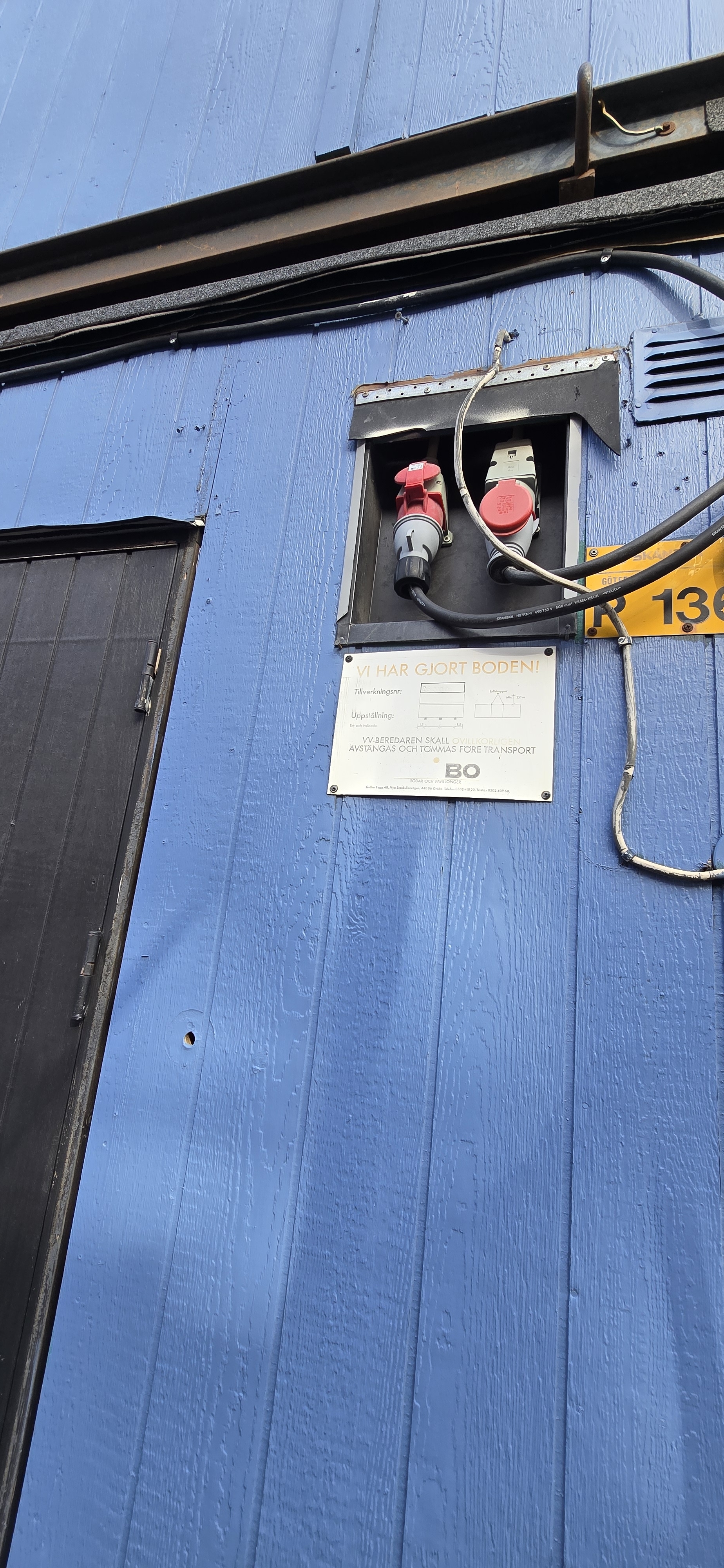 14 st byggbodar ca 1990-2000 års modell uppställda i Tumba. Måste skyndsamt monteras ner och forslas bort senast 29/4-2025.