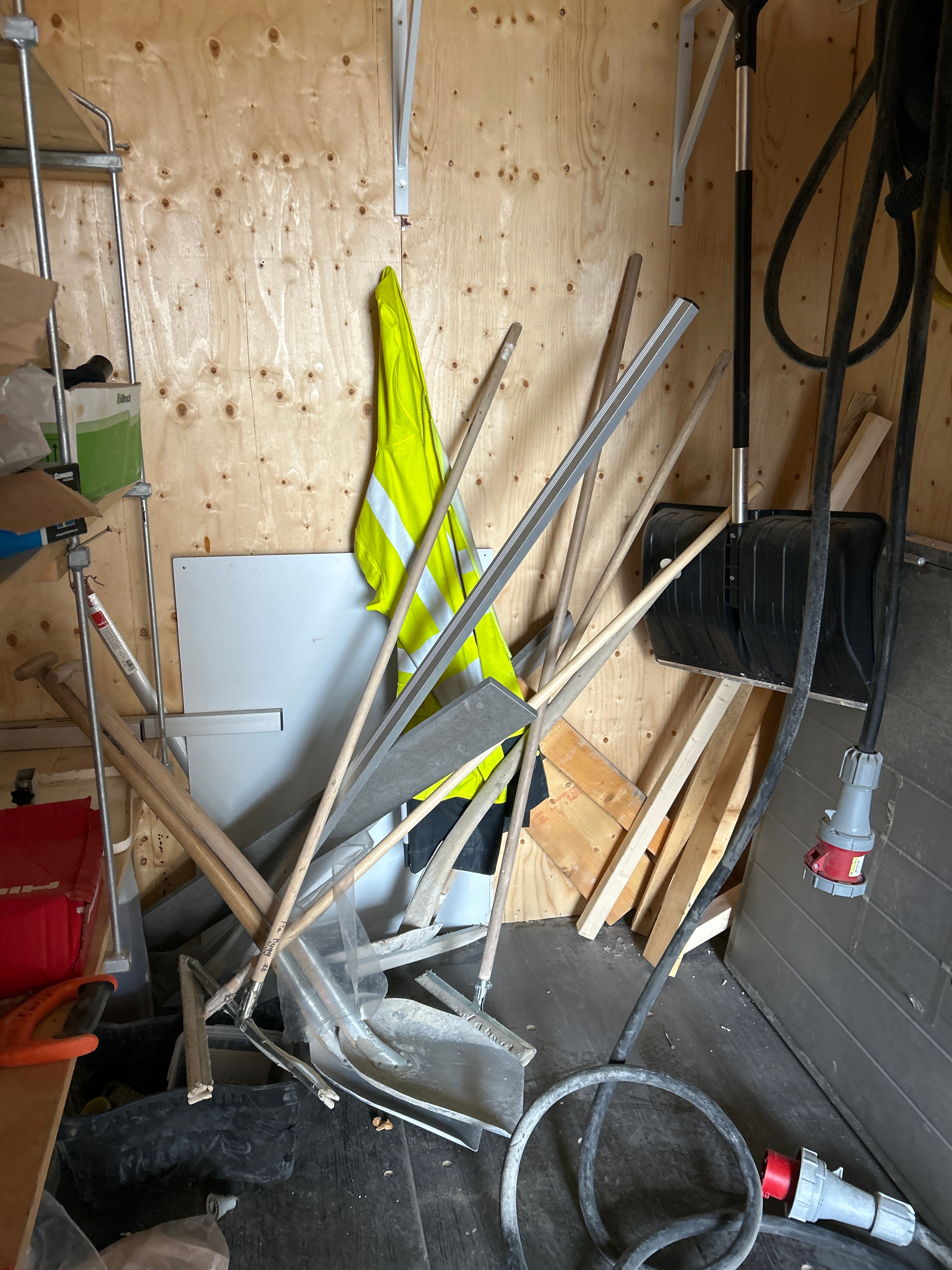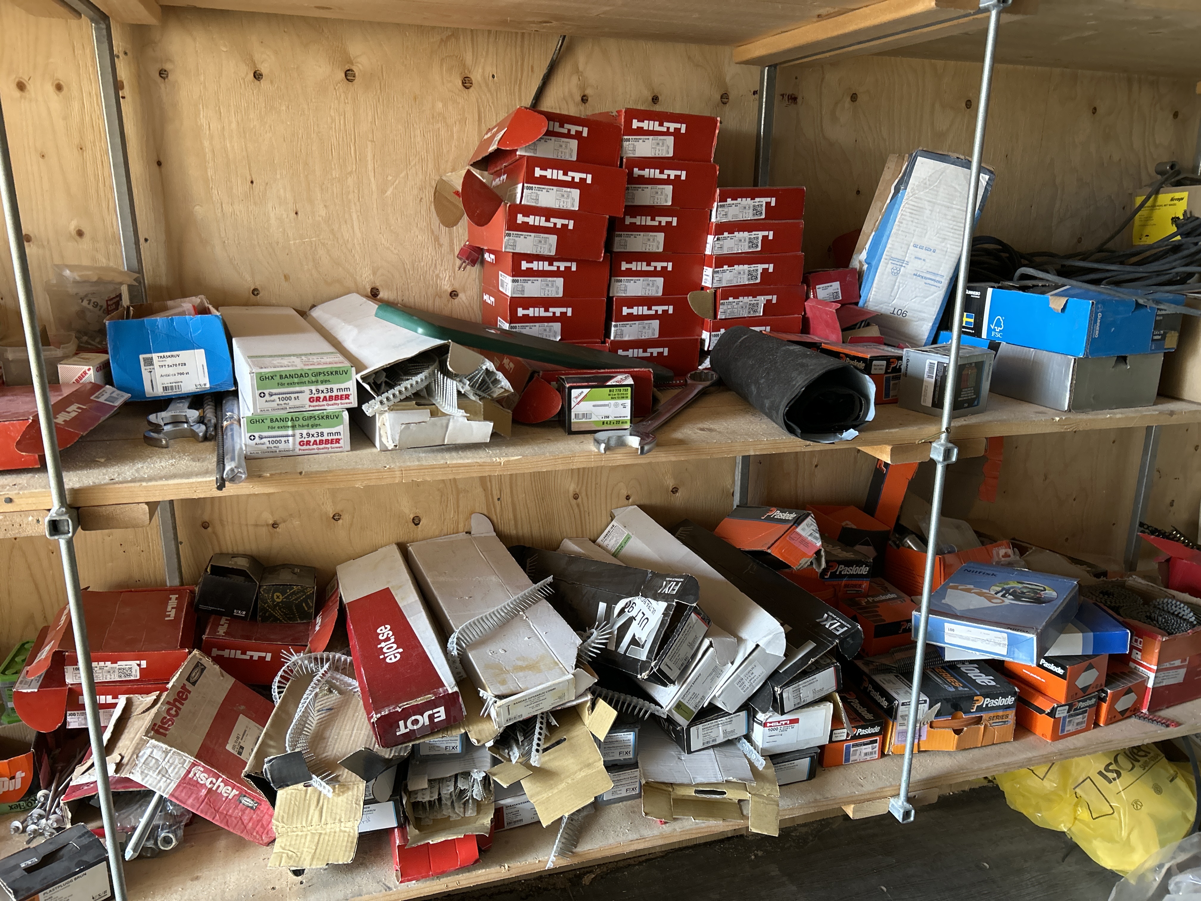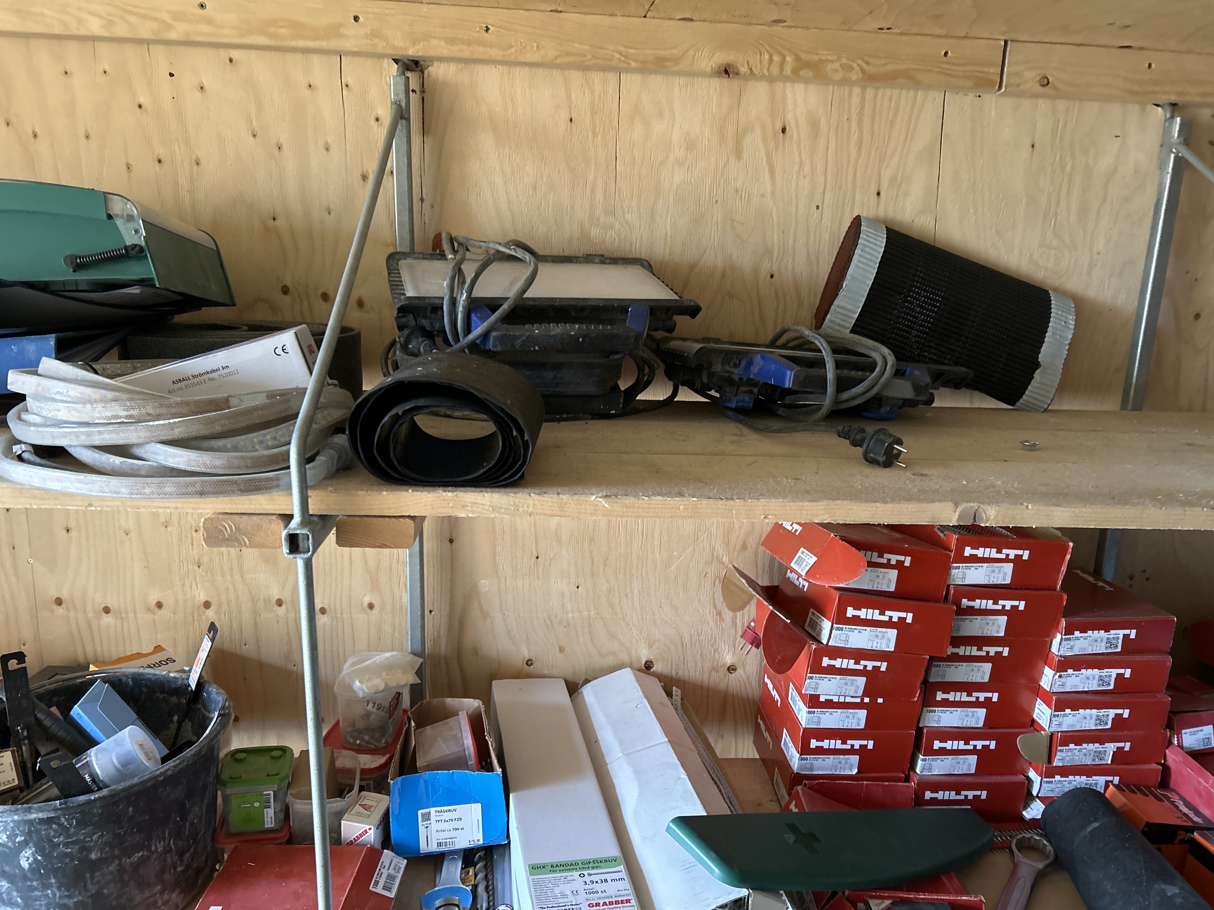 - Övrigt material: Byggmaterial, isolering, samt diverse småförpackningar med komponenter.