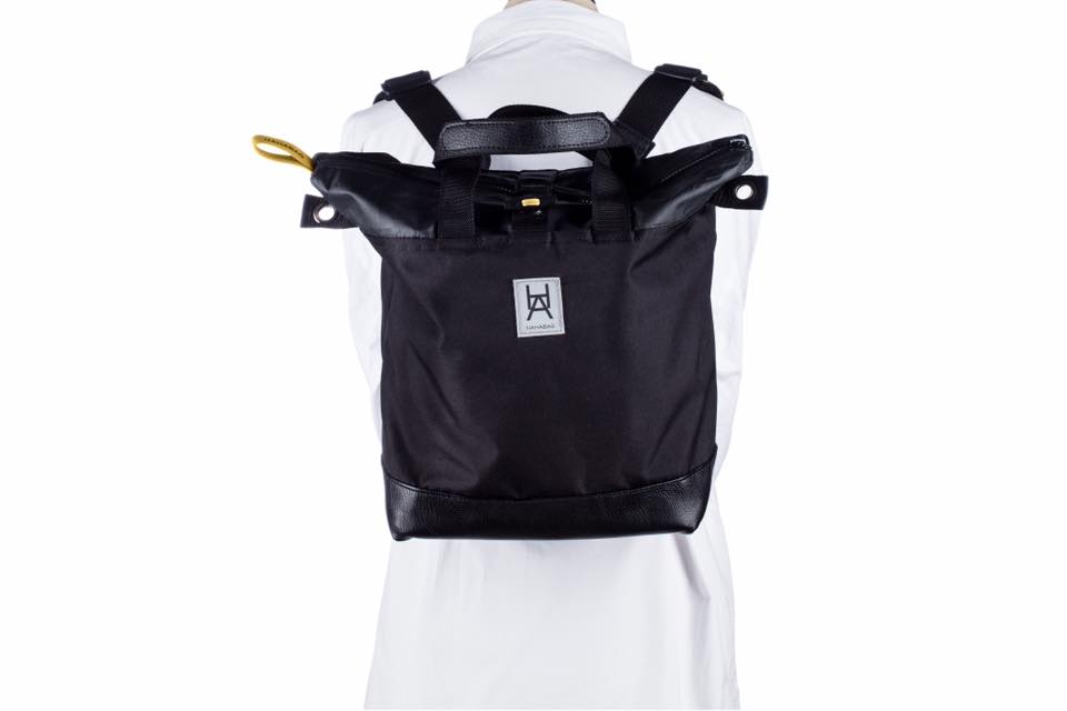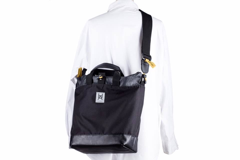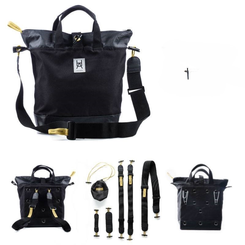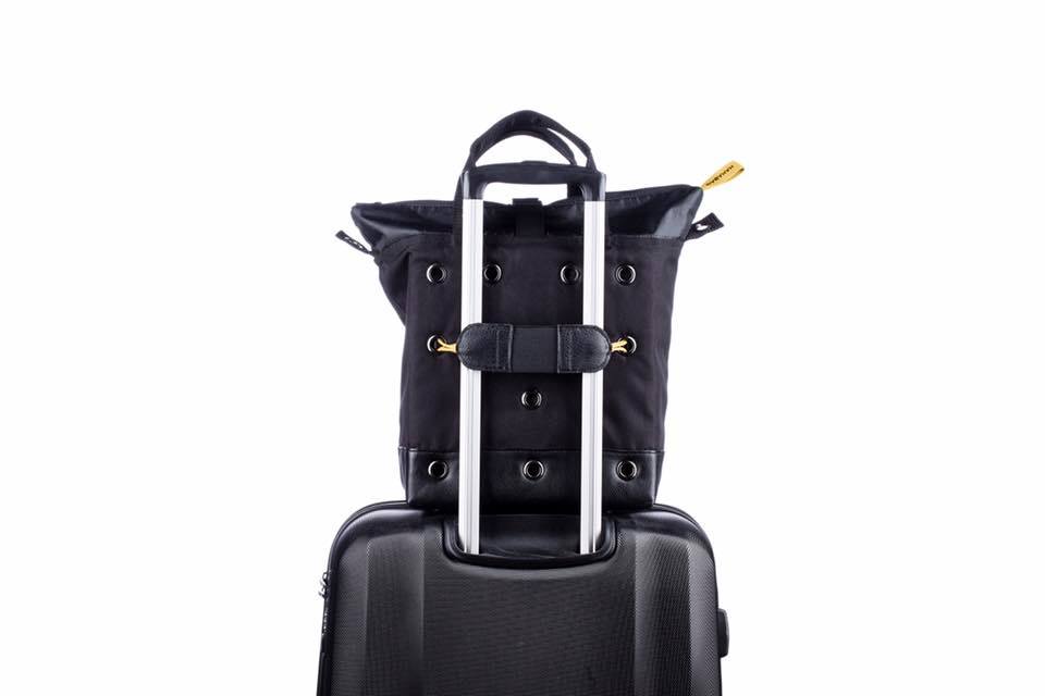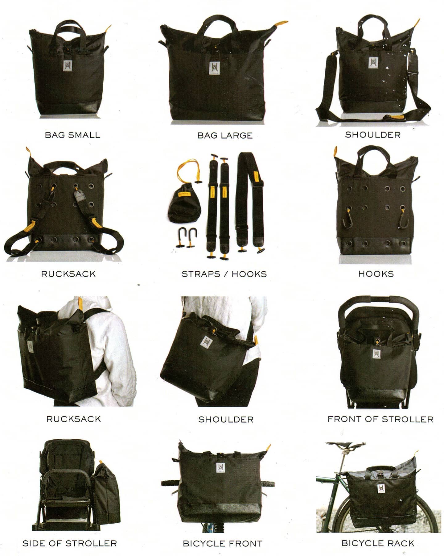 Multifunktionell väska i enkel tidlös design. Öljett systemet på baksidan och tillhörande remmar möjliggör väskans mångsidighet. Knapparna på remmarnas fästen vinklas och sätts in i önskad öljett. Dessa trycks sedan ut genom att stoppa handen i kardborreband öppningen illustrerad med en "hand".