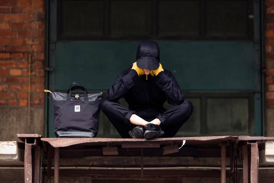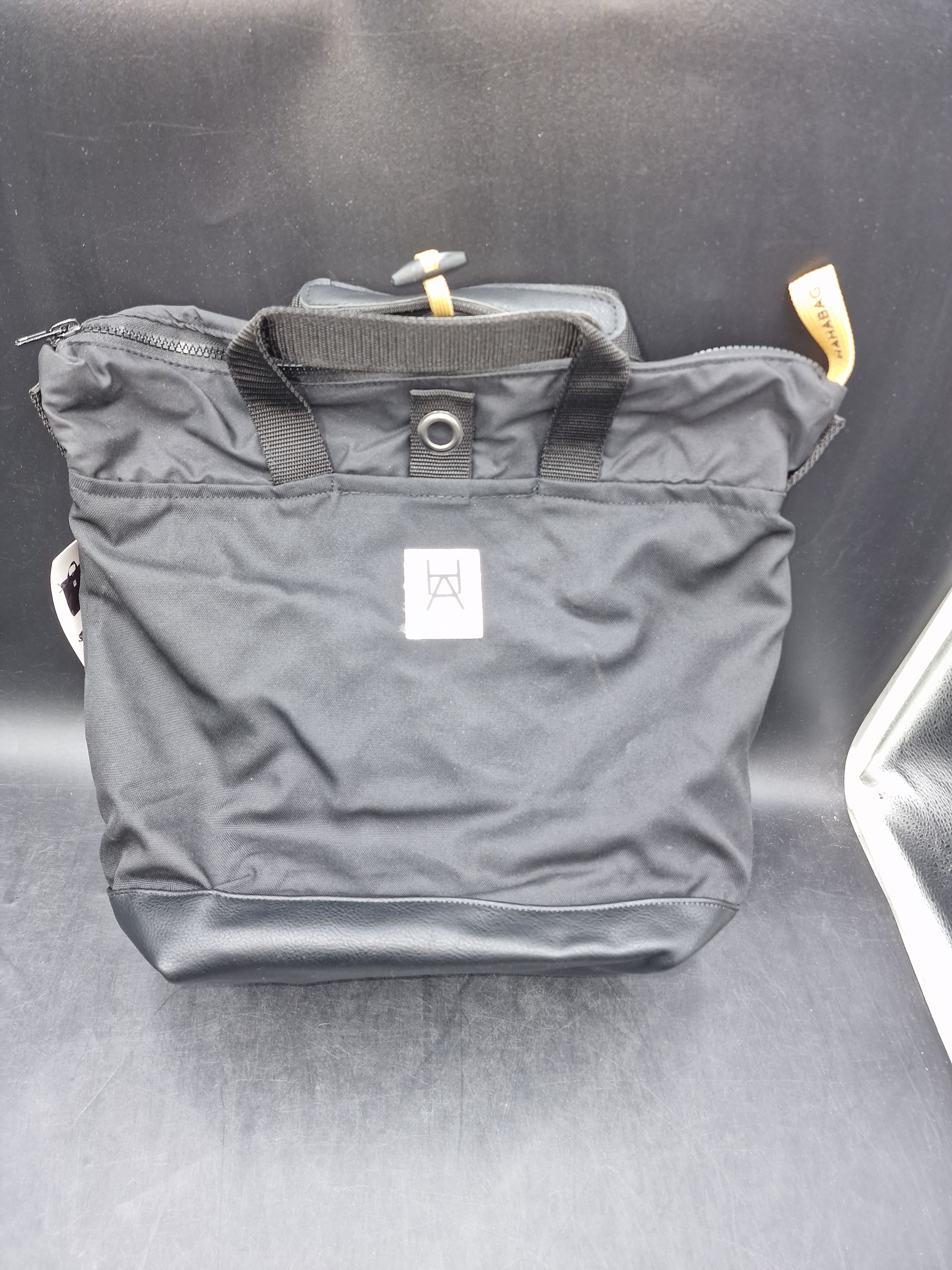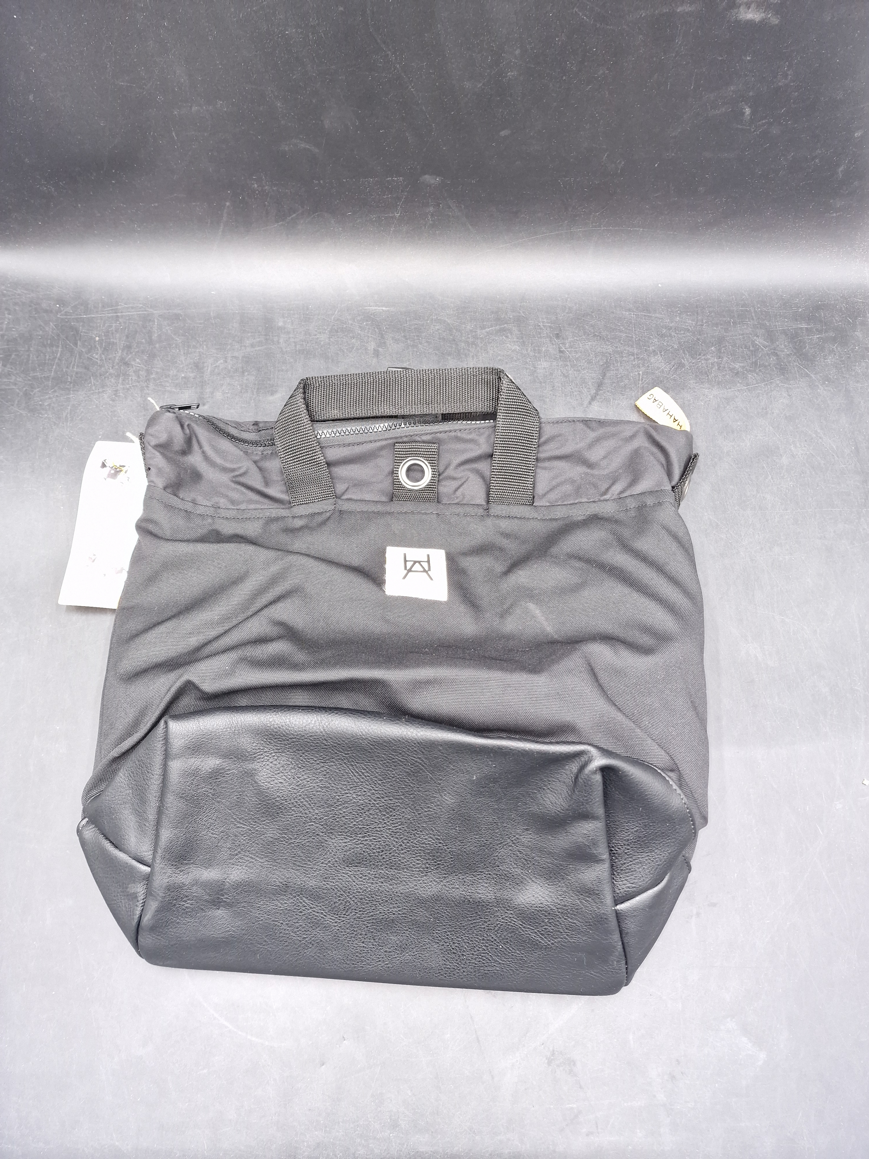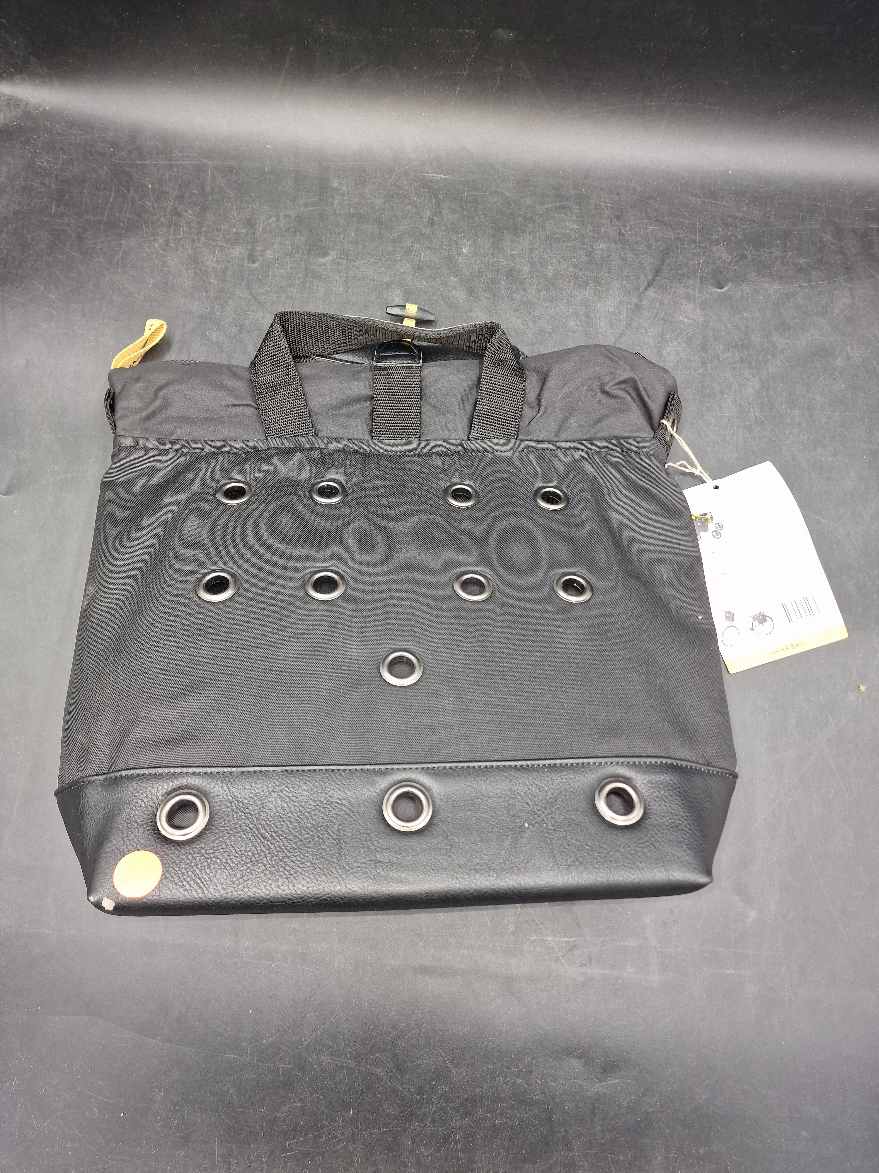Multifunktionell väska i enkel tidlös design. Öljett systemet på baksidan och tillhörande remmar möjliggör väskans mångsidighet. Knapparna på remmarnas fästen vinklas och sätts in i önskad öljett. Dessa trycks sedan ut genom att stoppa handen i kardborreband öppningen illustrerad med en "hand".