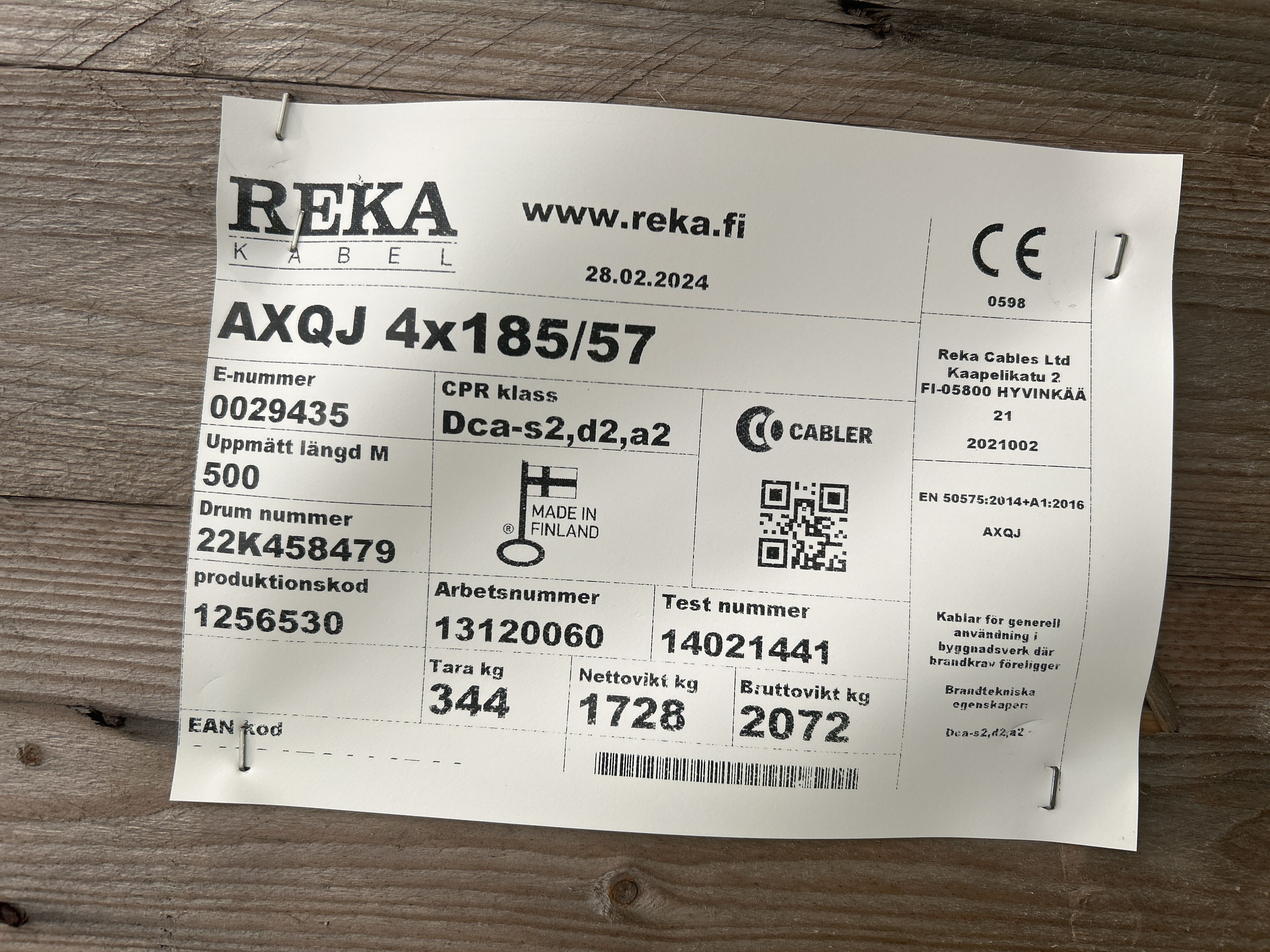 - En kabelrulle med elkabel av typen Reka AXQJ 4x185/57, avsedd för generell användning i byggnadsverk där brandkrav föreligger.