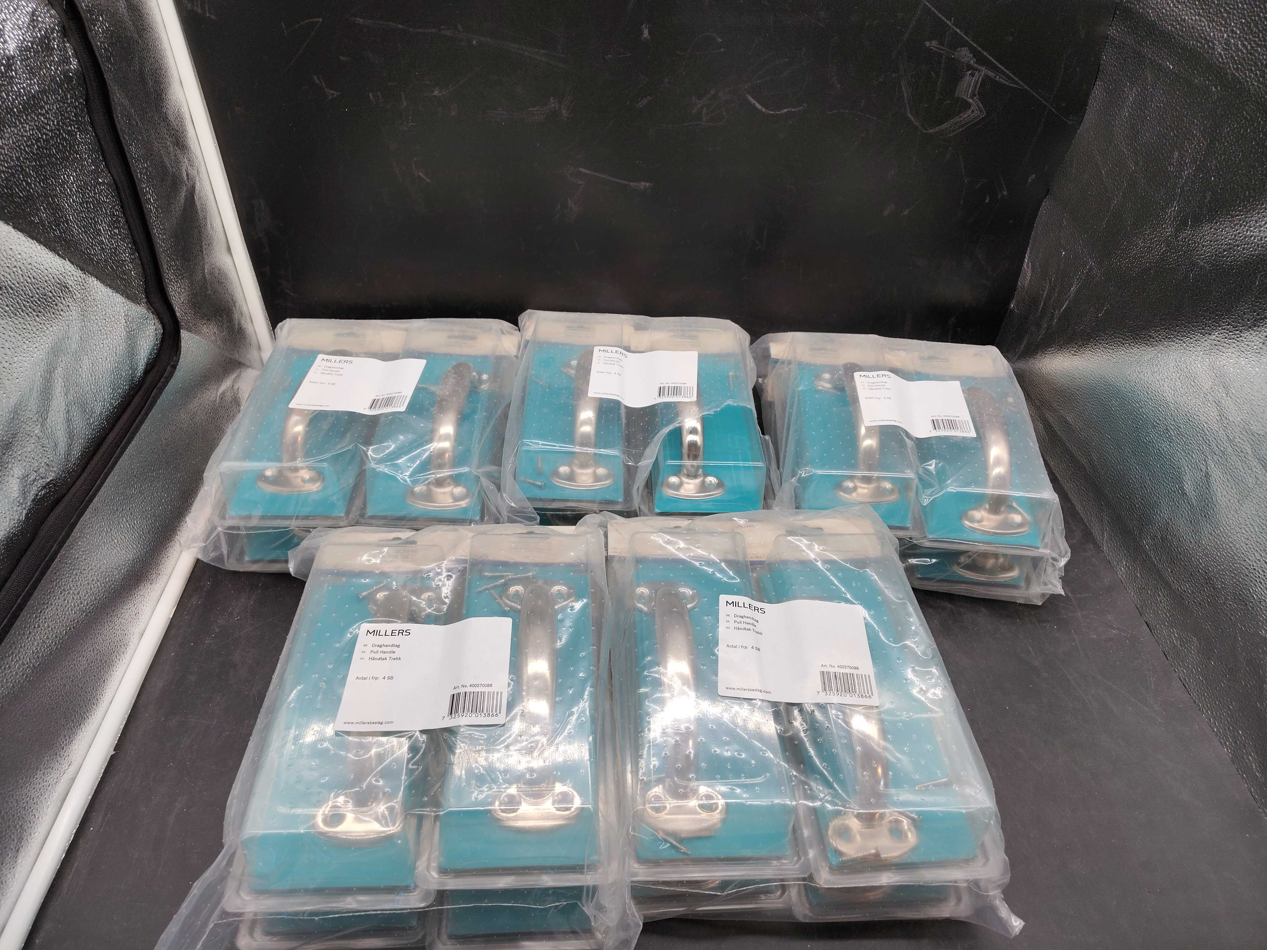 Parti med klassiska draghandtag i borstat nickelutförande. Passar dörrar, lådor eller luckor i exempelvis verkstad, garage eller kök.