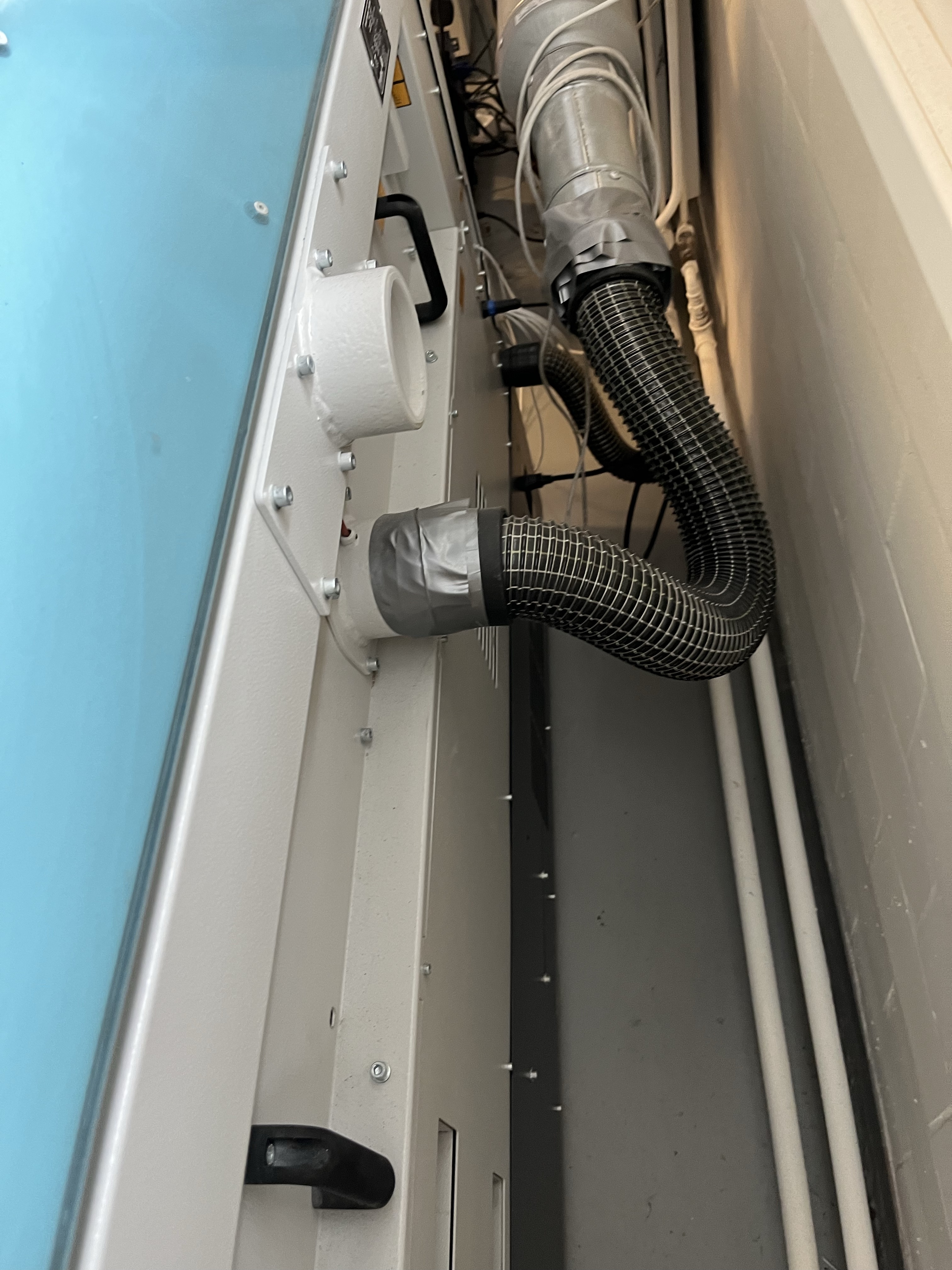 Lasermaskin för skärning och gravering, utrustad med extern luftfiltreringsenhet.