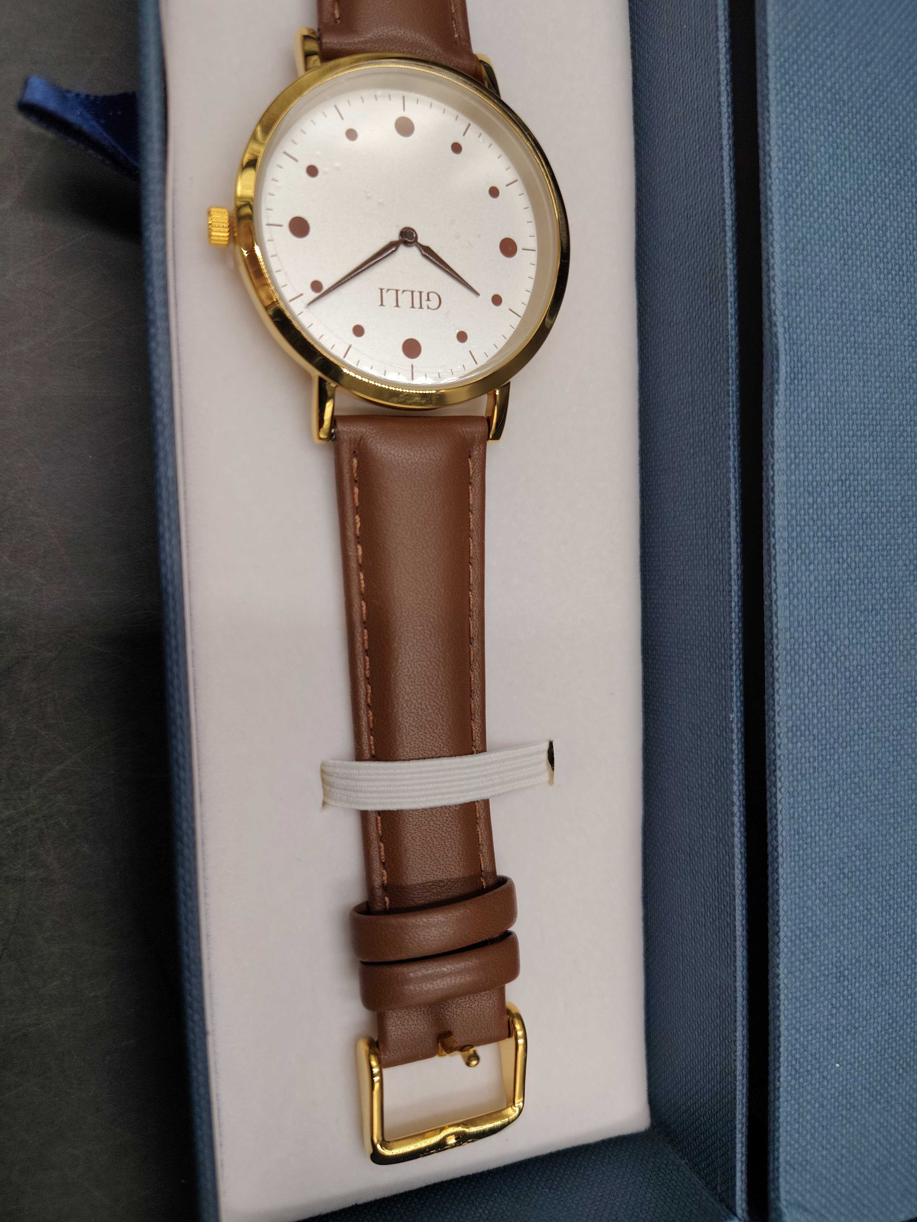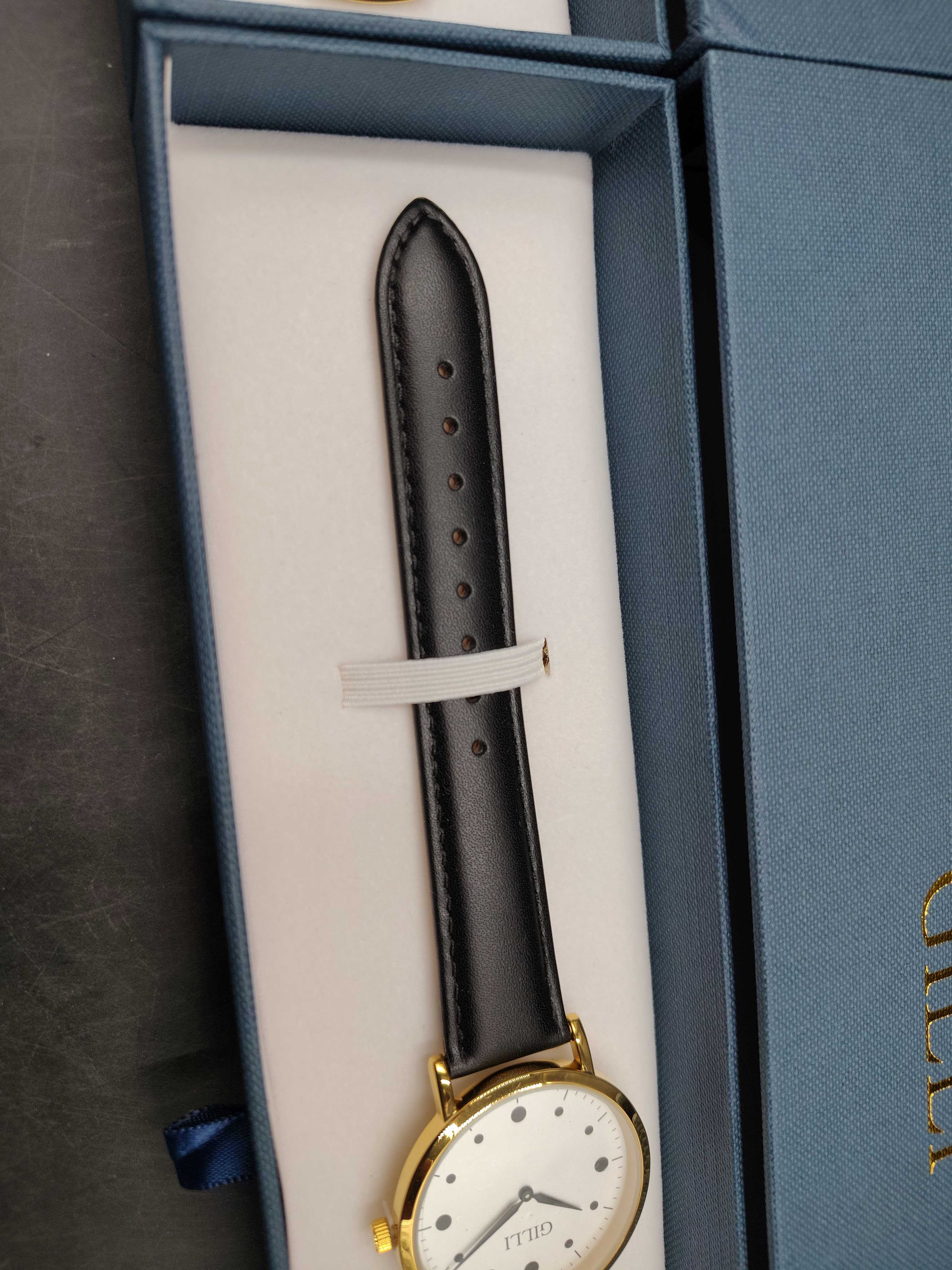 GILLI 001 är en stilren och elegant klocka designad för den svenska marknaden. Klockan har ett robust rostfritt stålboett (316L Stainless Steel) i guldton och en vit urtavla med runda indexmarkeringar. De större markeringarna vid klockslag 12, 3, 6 och 9 förstärker dess klassiska och moderna design. Klockans sekundvisare är 20 % längre än minutvisaren, medan timvisaren är 20 % kortare än minutvisaren för en välbalanserad estetik.