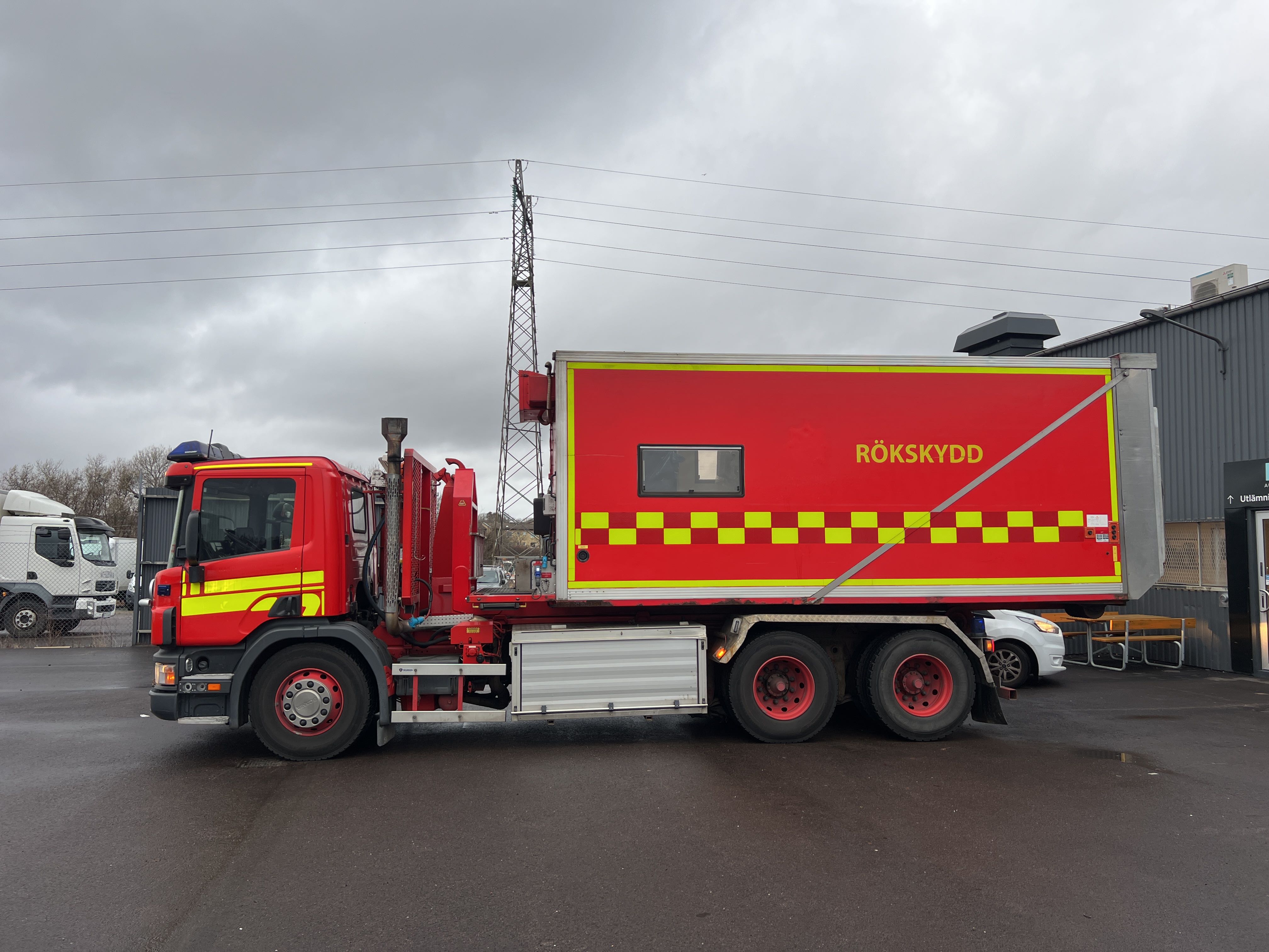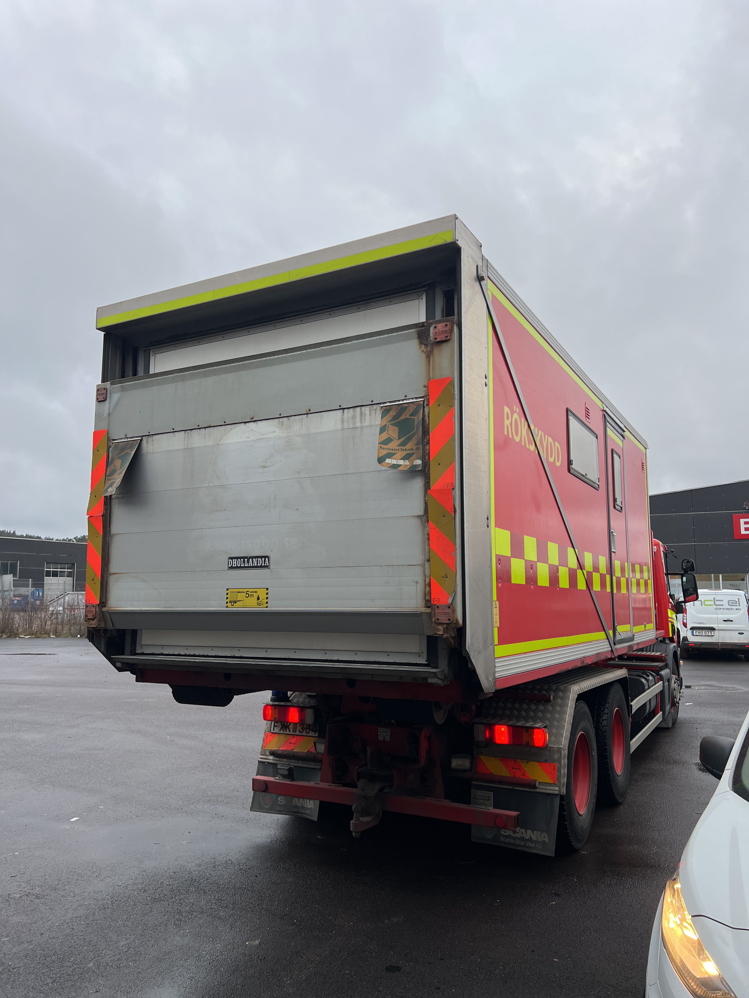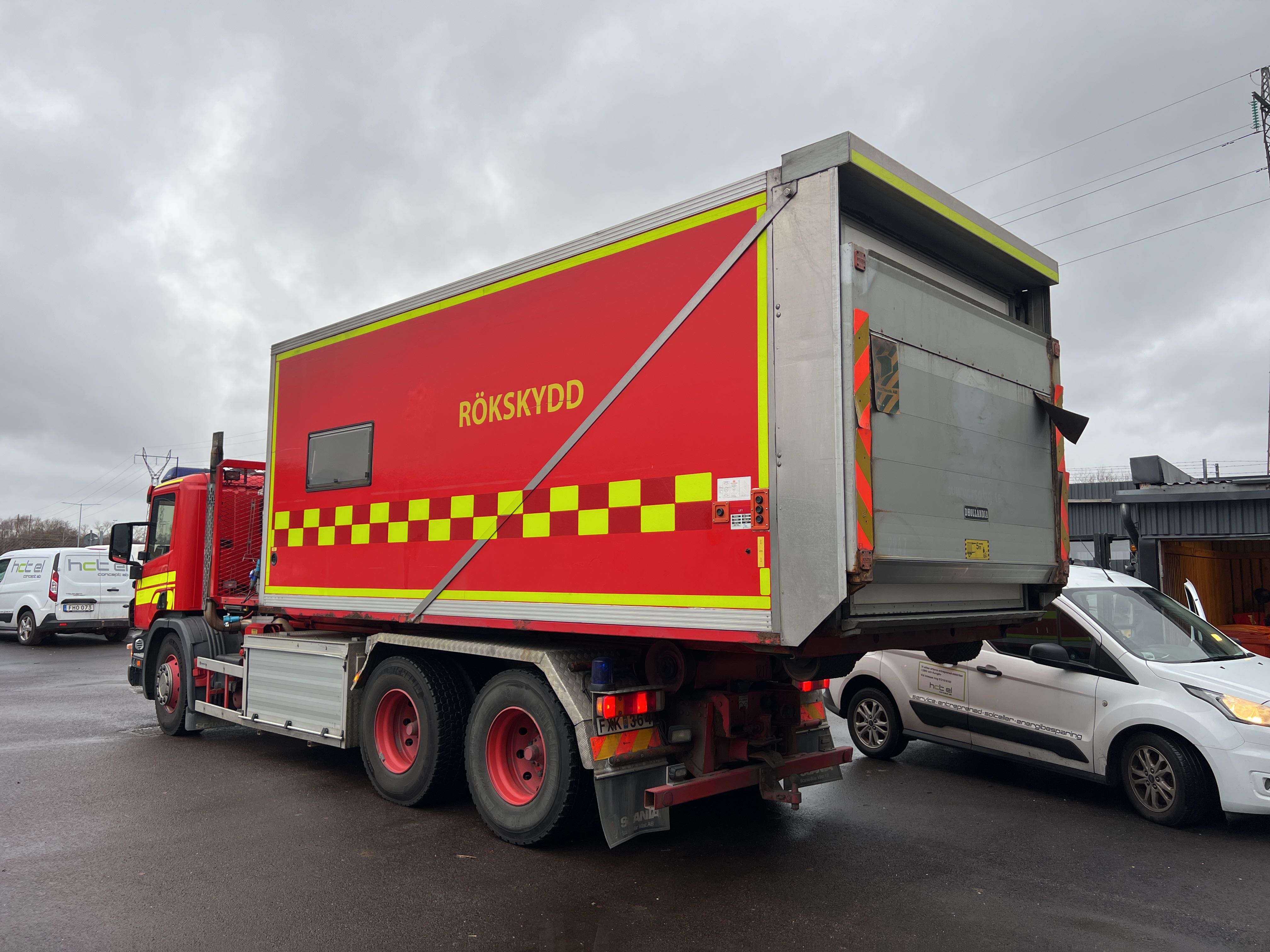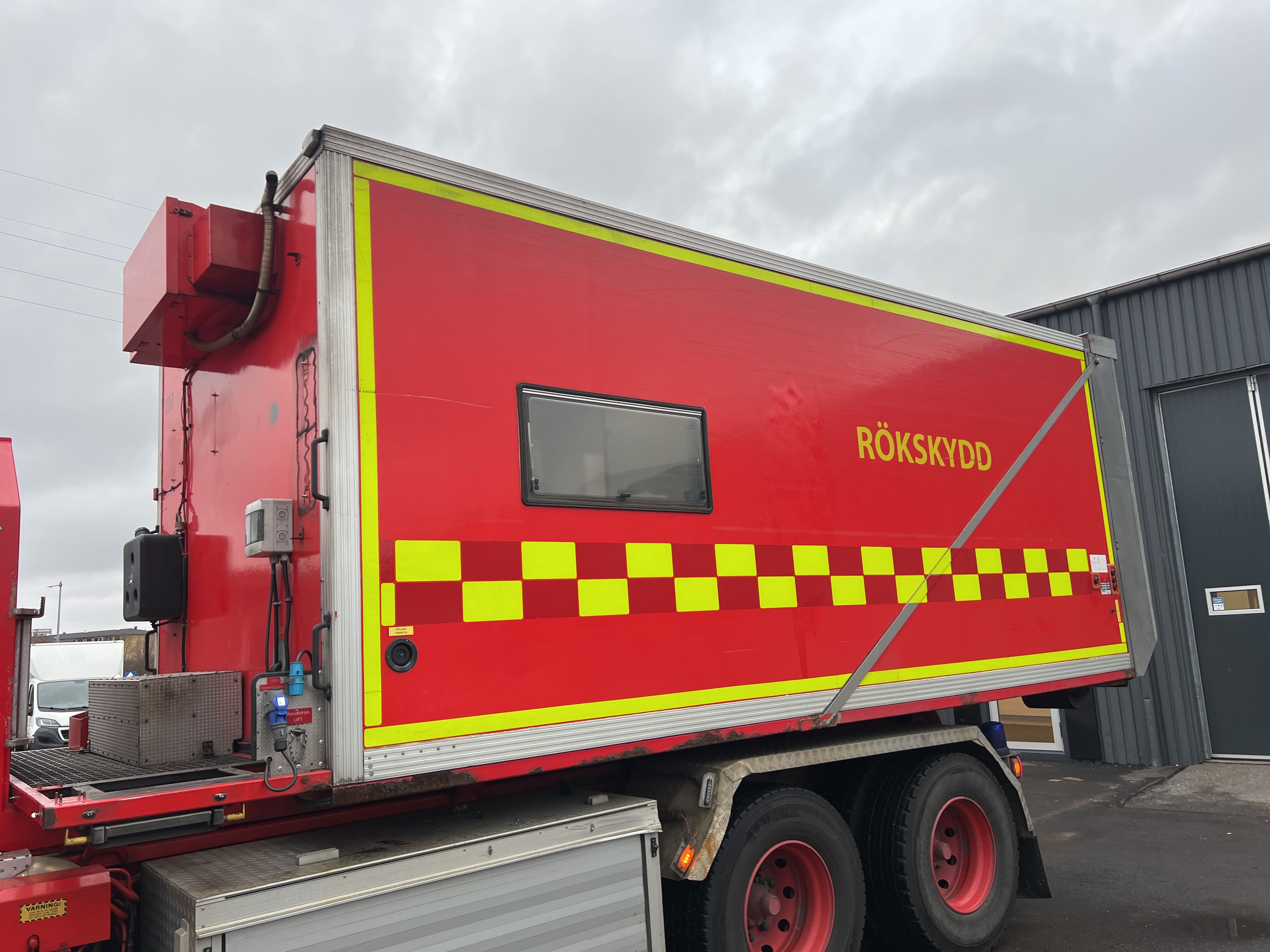 - Räddningstjänstfordon/brandbil med påbyggd enhet märkt "Rökskydd", inredd med hyllsystem, sittplatser och enklare köksdel. Utrustad med Dhollandia bakgavellyft och elanslutningar.