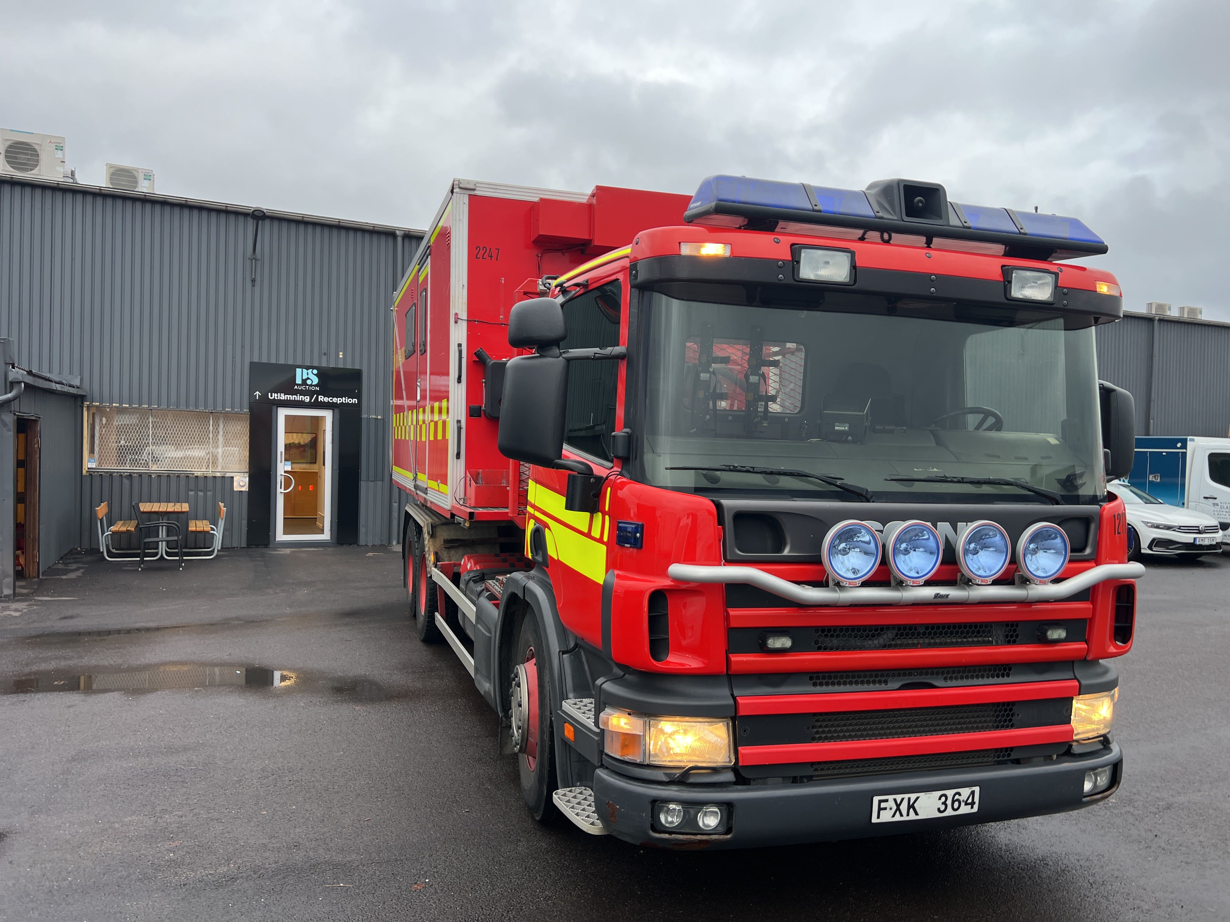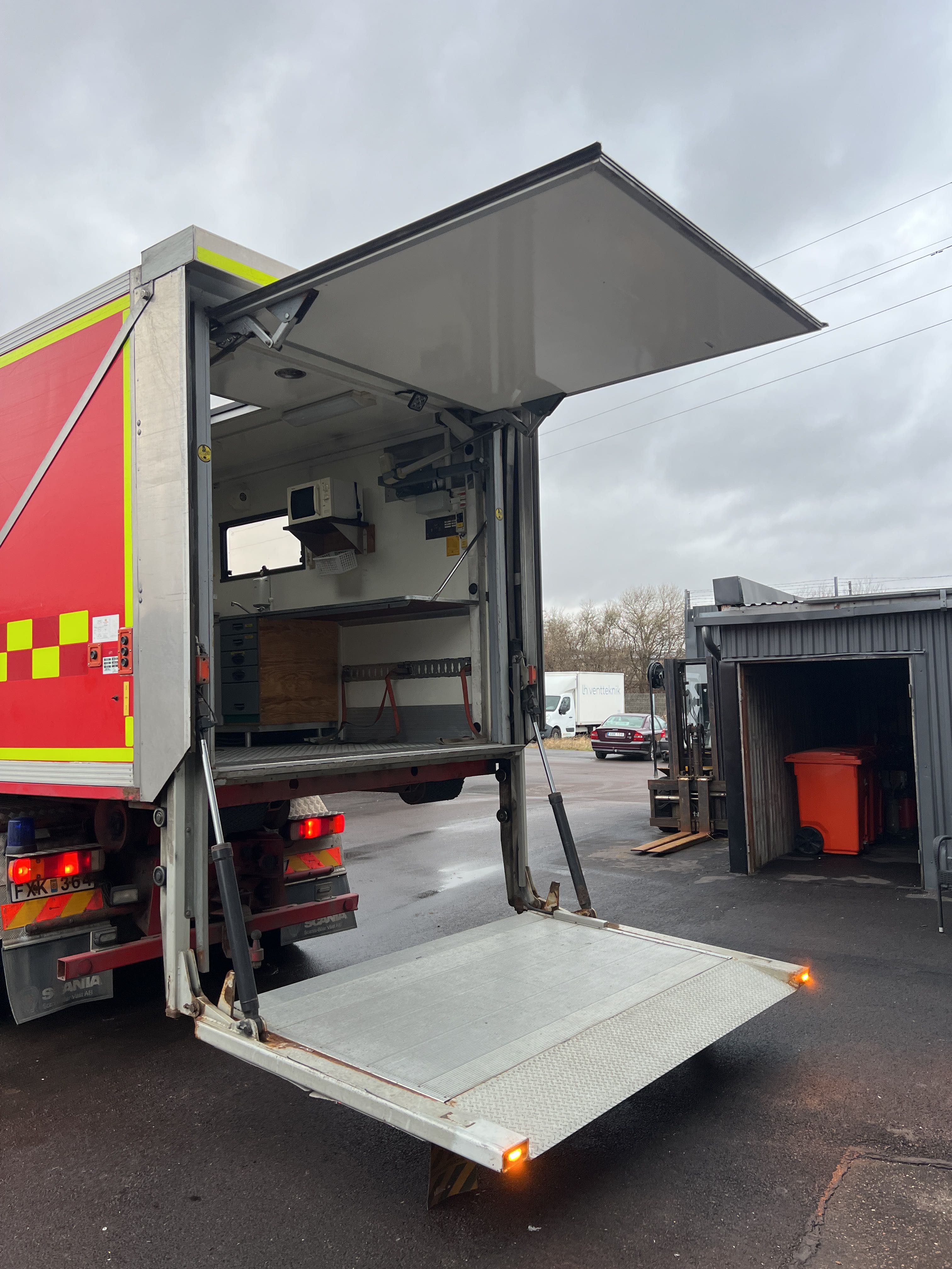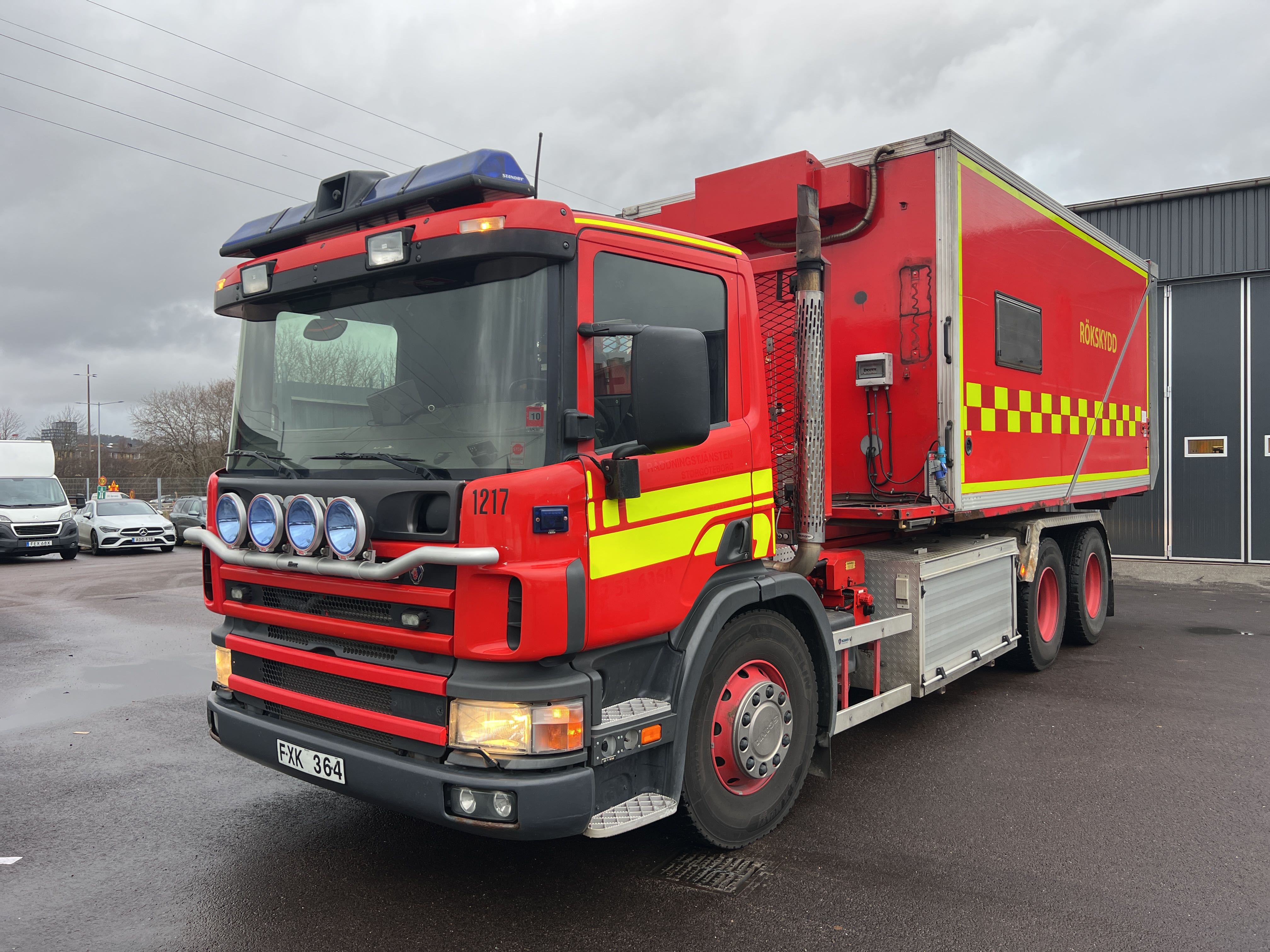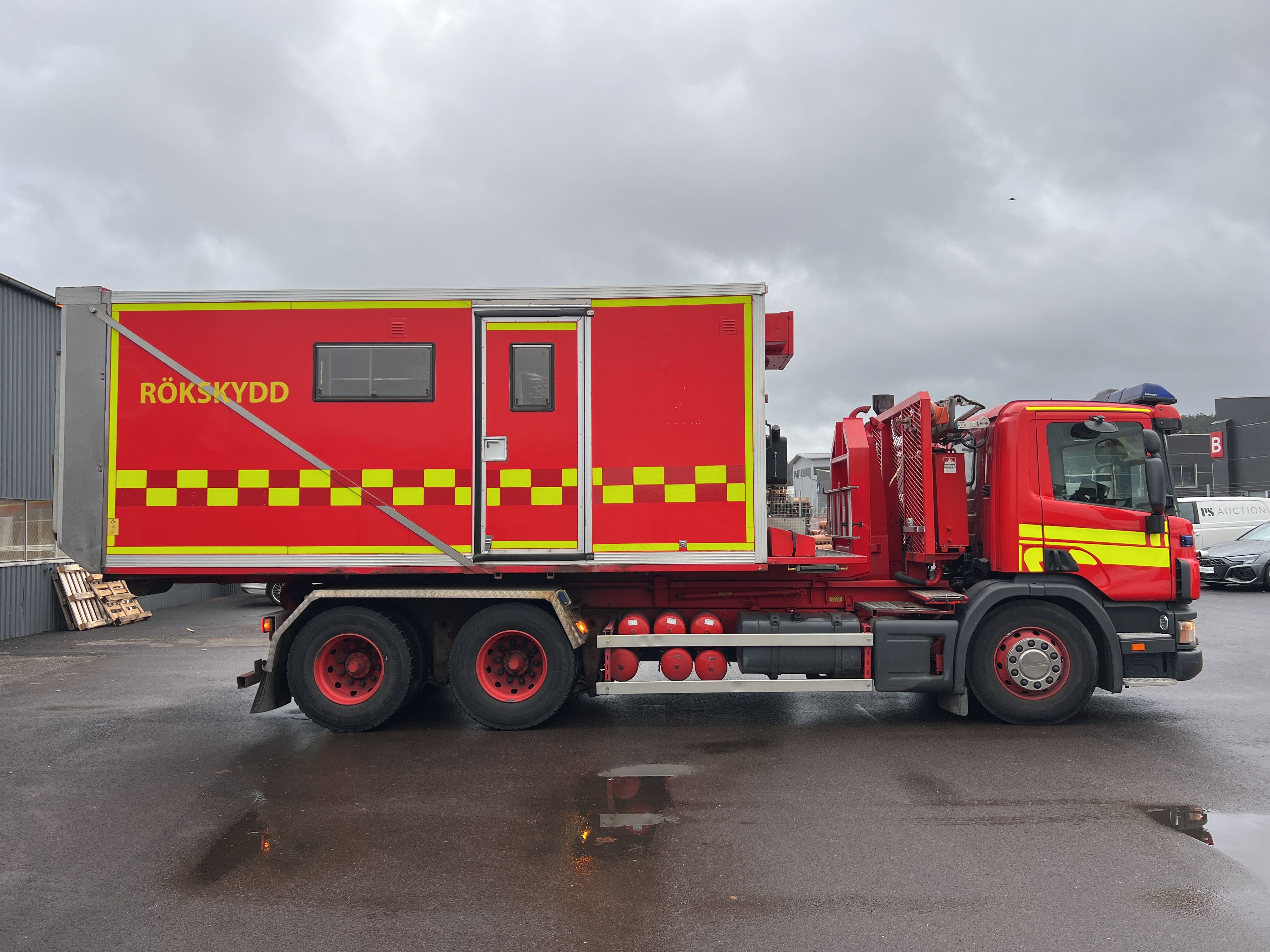 - Räddningstjänstfordon/brandbil med påbyggd enhet märkt "Rökskydd", inredd med hyllsystem, sittplatser och enklare köksdel. Utrustad med Dhollandia bakgavellyft och elanslutningar.