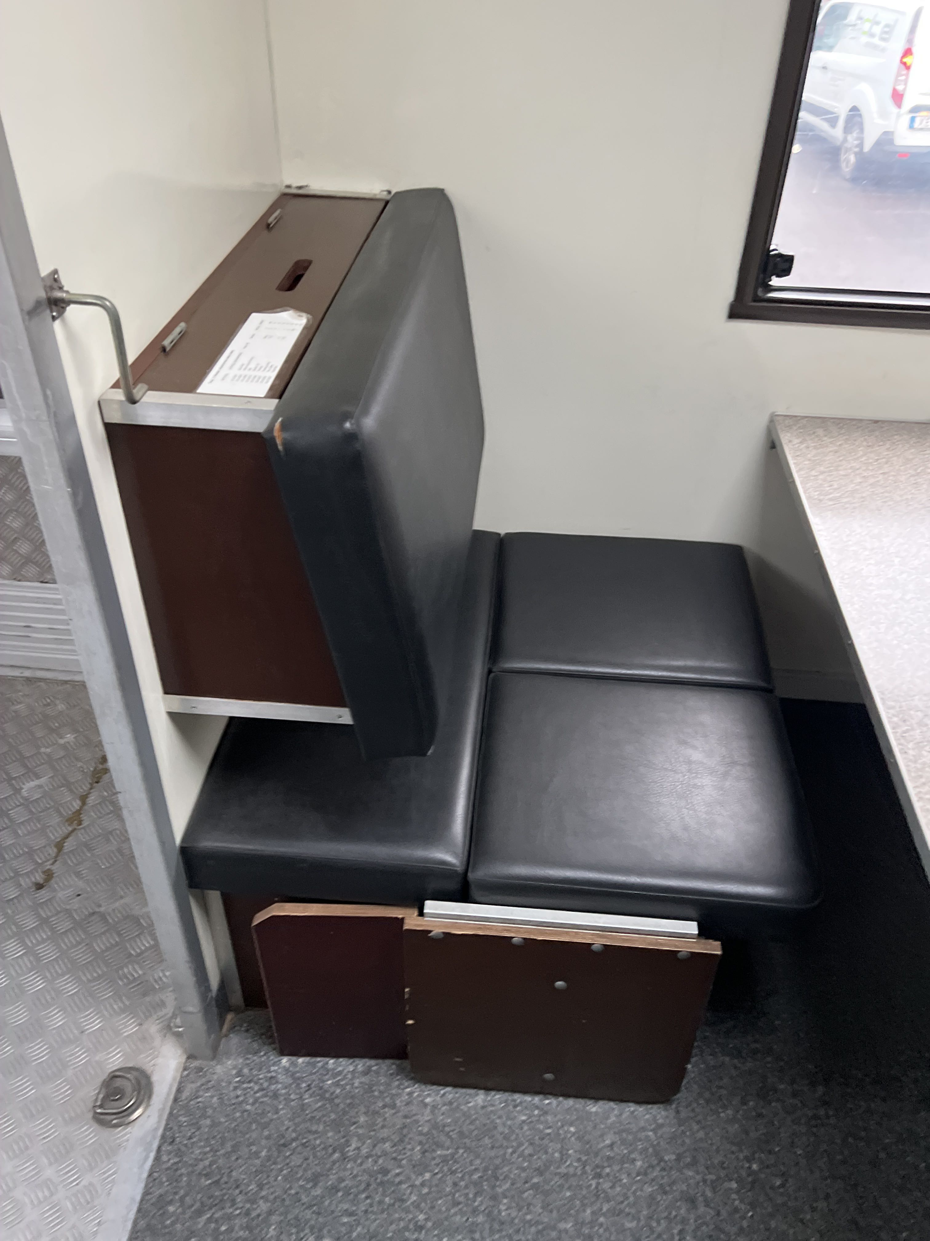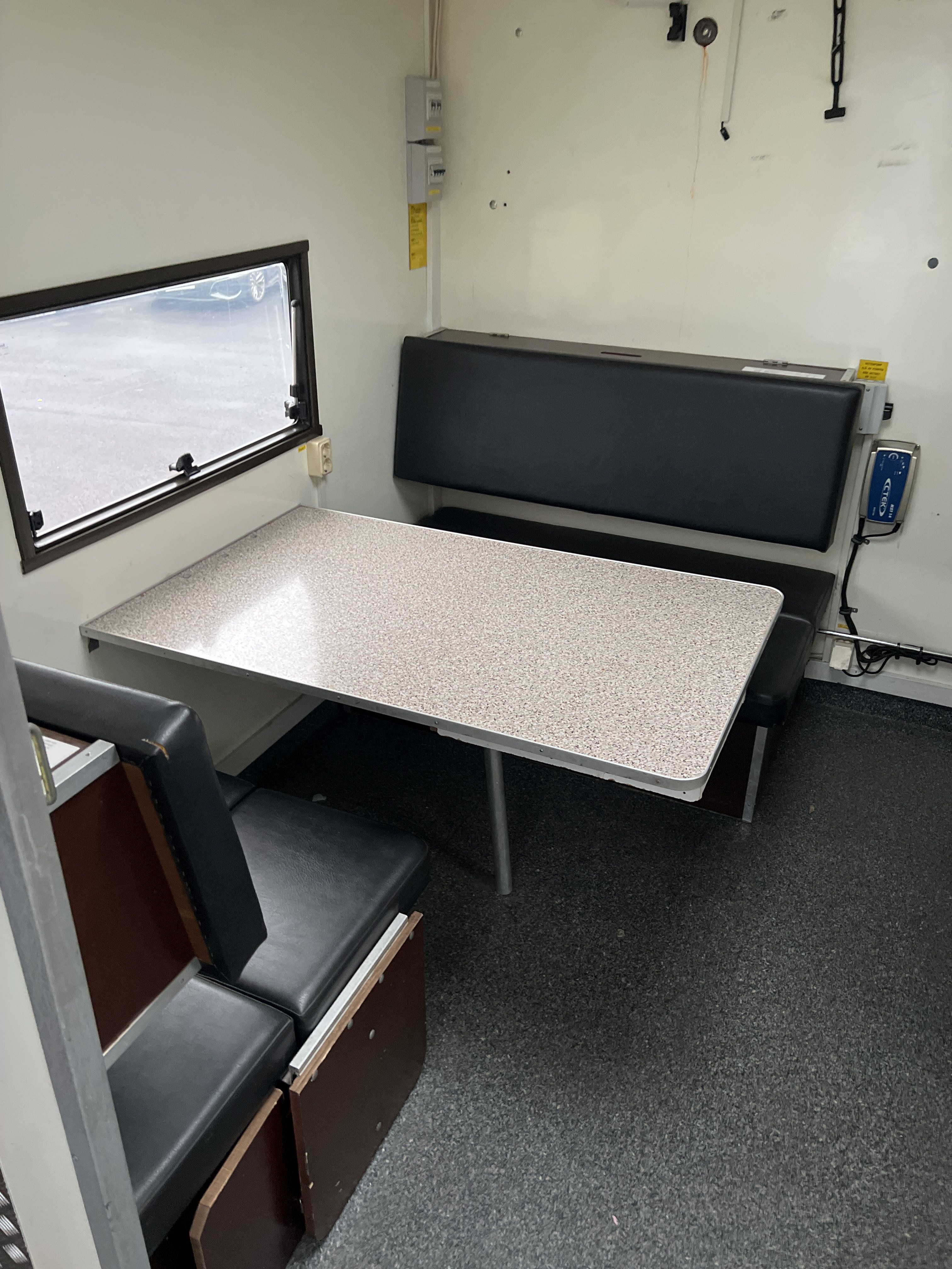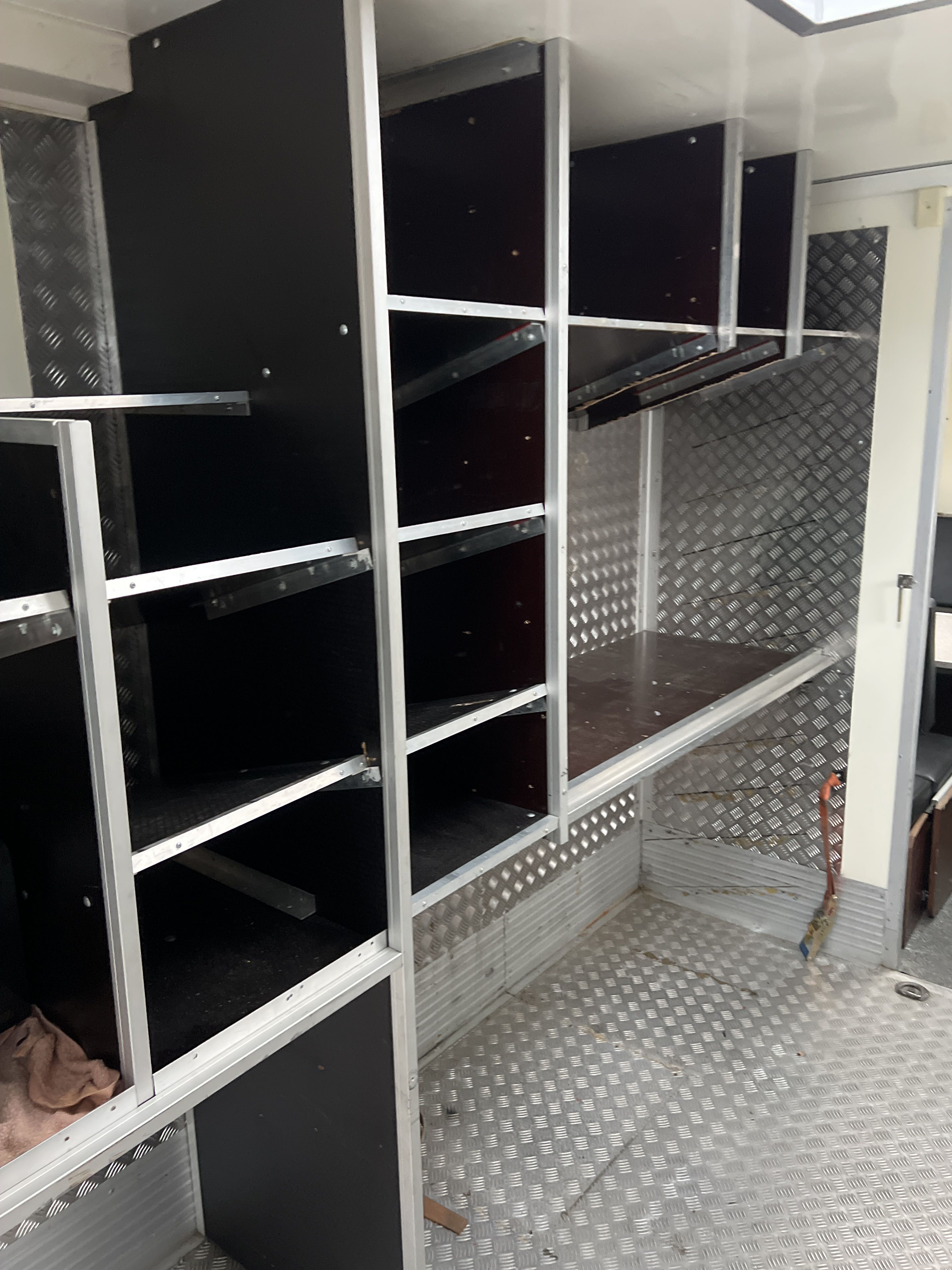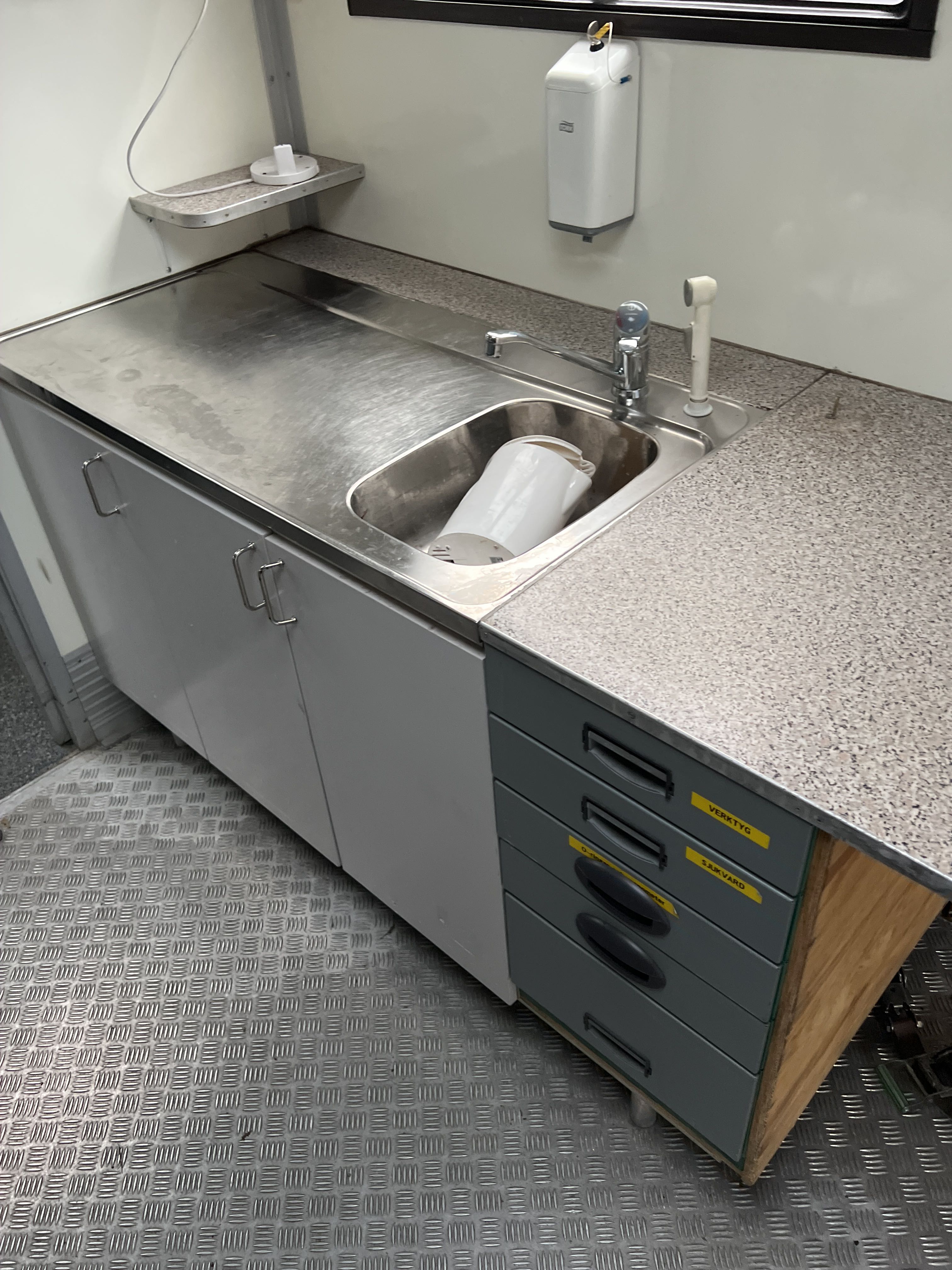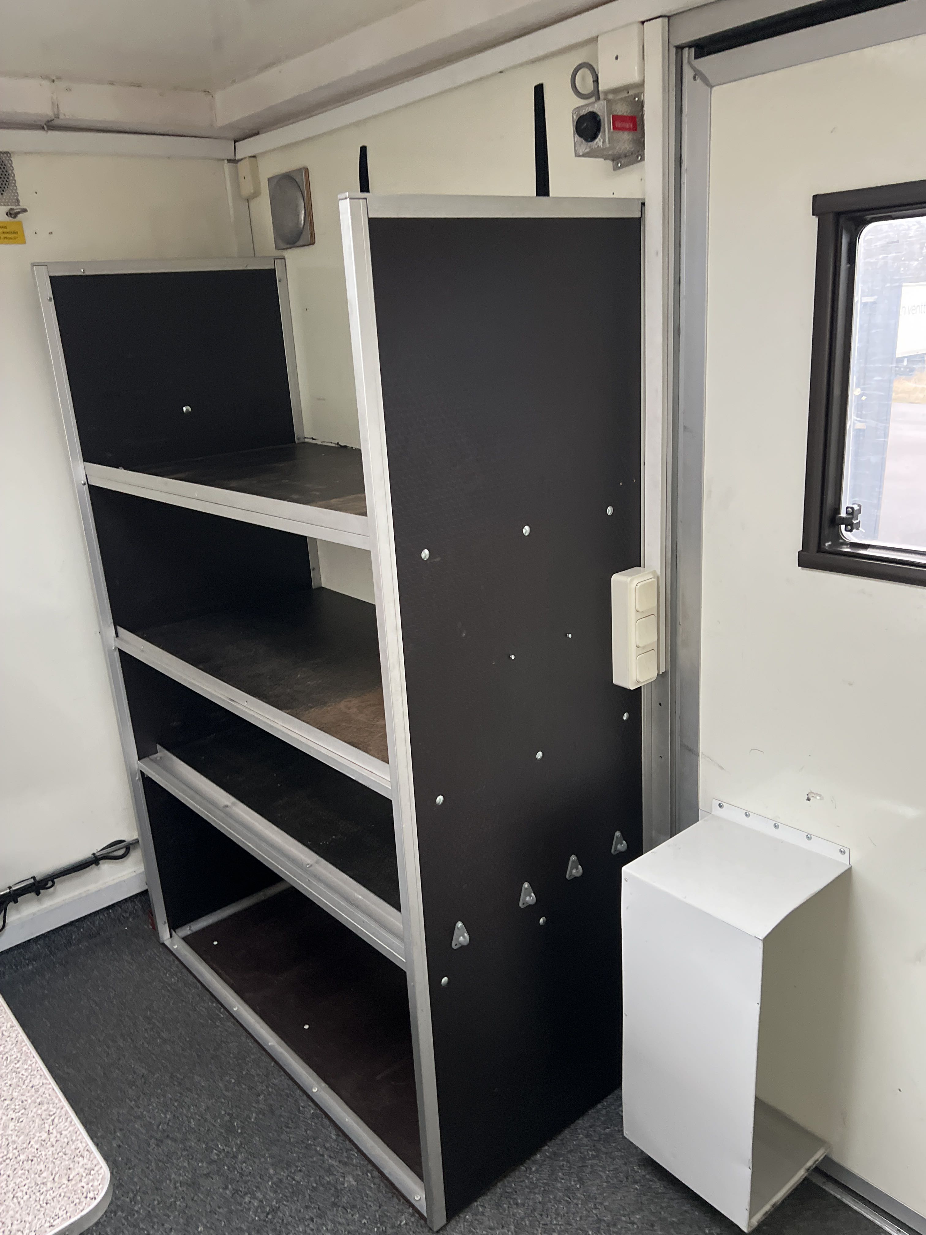 Invändig fast inredning enligt bilder: Hyllor, förvaring, sittplatser med bord, diskbänk med vask och skåp