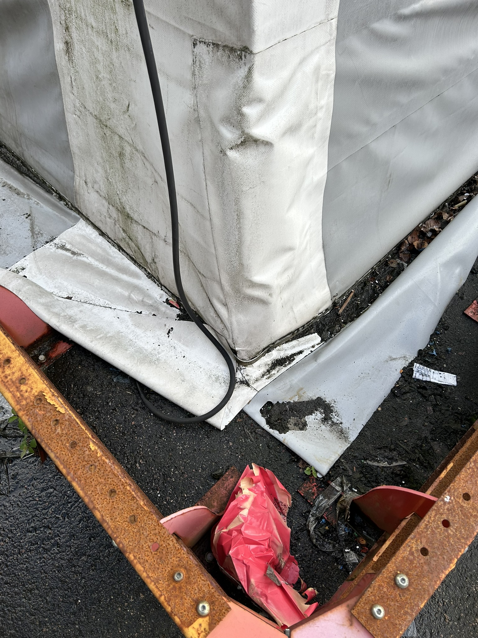 Förankras med dubbla förankringsjärn (ca 1 meter) som slås ned i marken