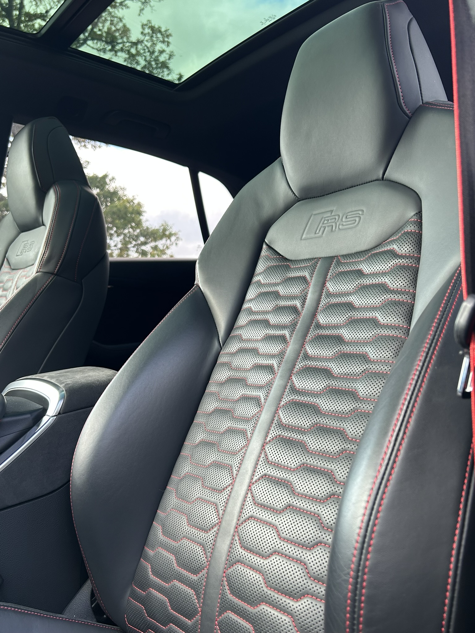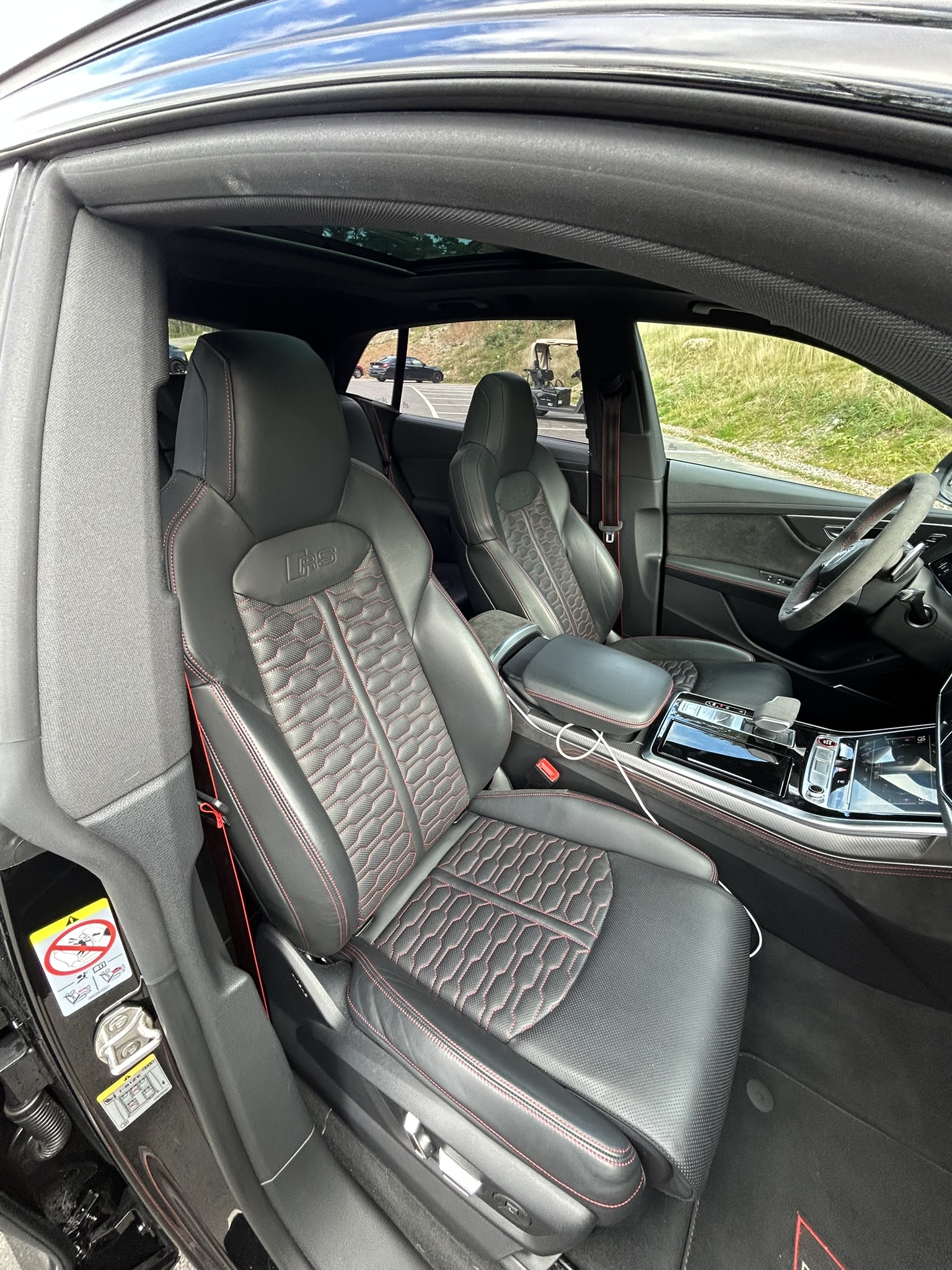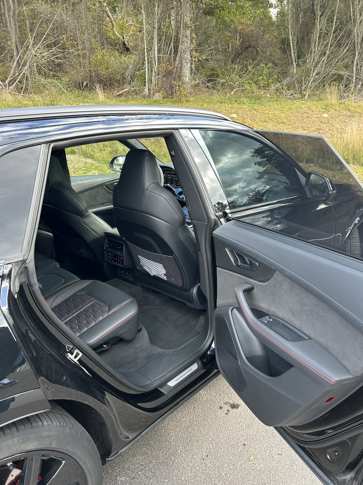 Interiör: Svart helskinn med röda kontrastsömmar