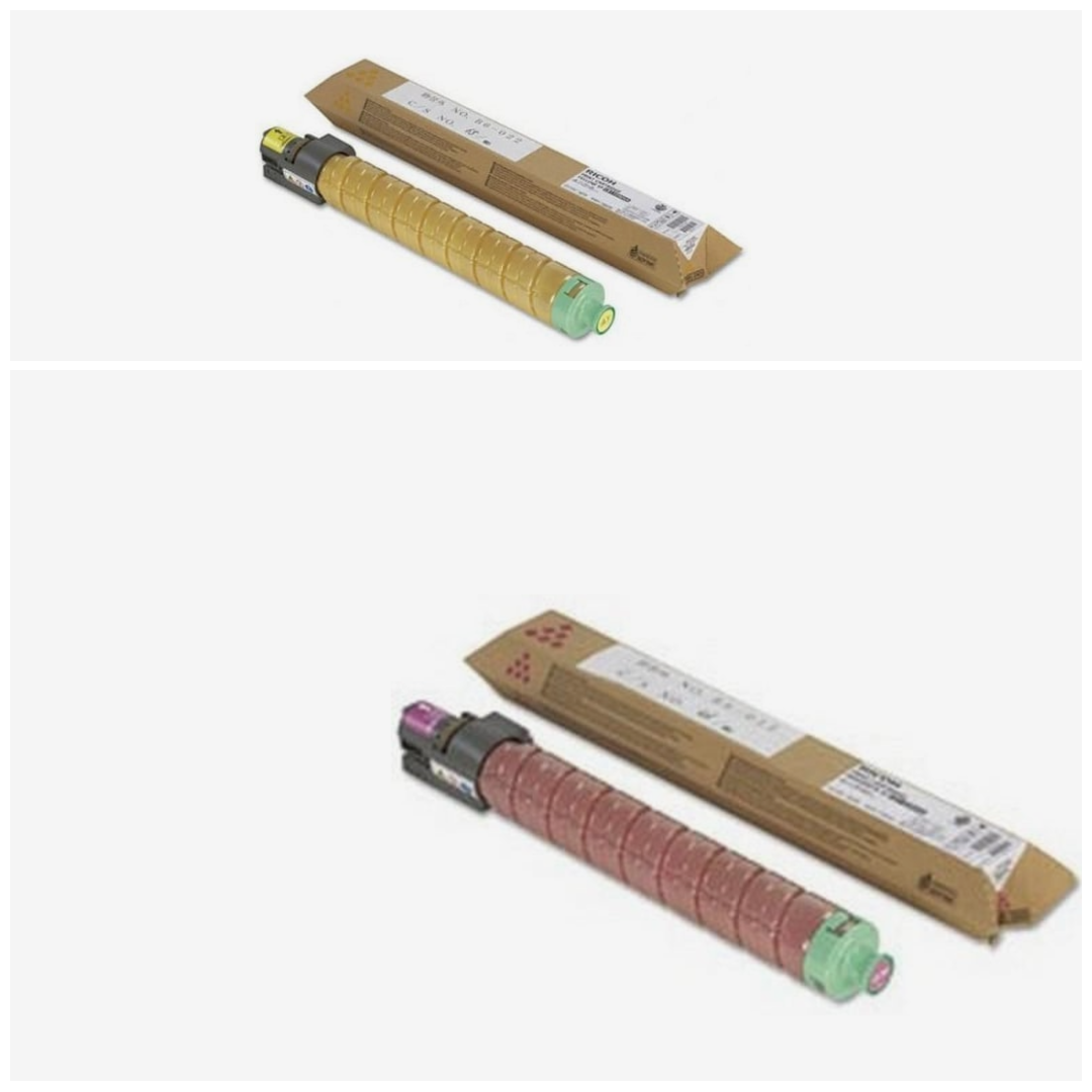 Två original tonerkassetter från Ricoh, kompatibla med modellerna MP C3003 och MP C3503.