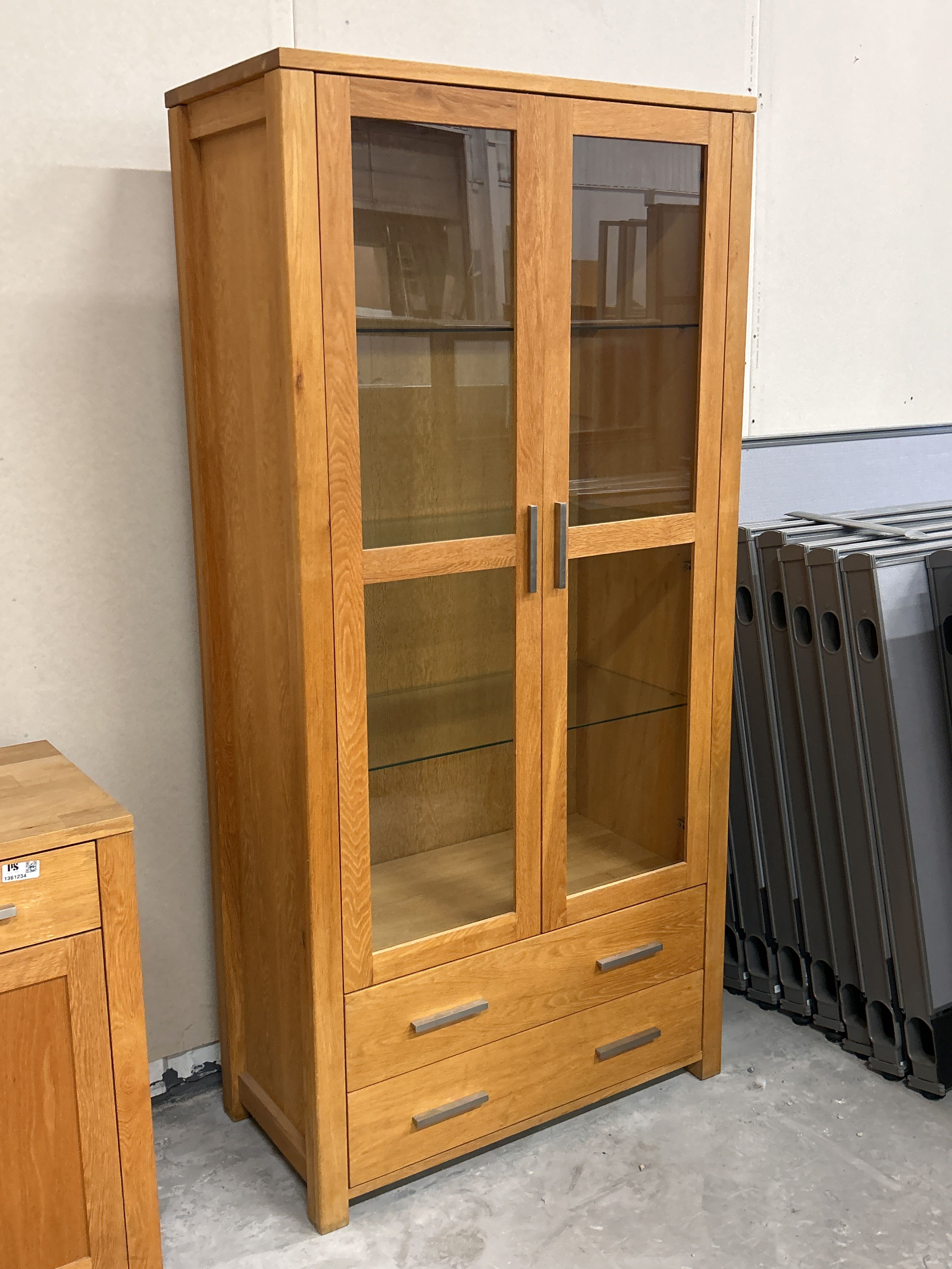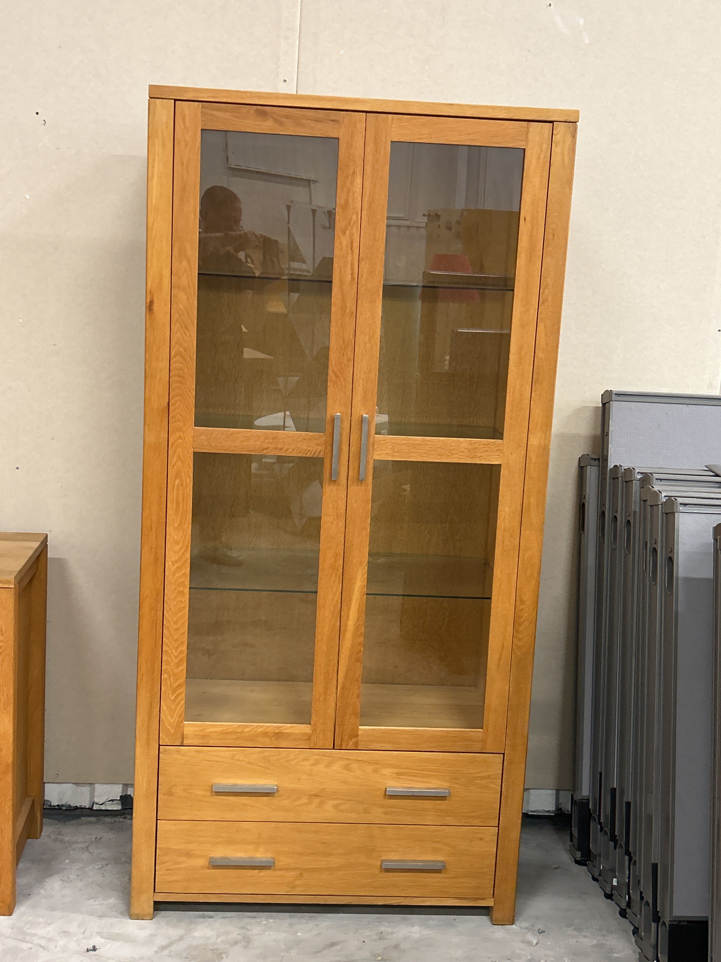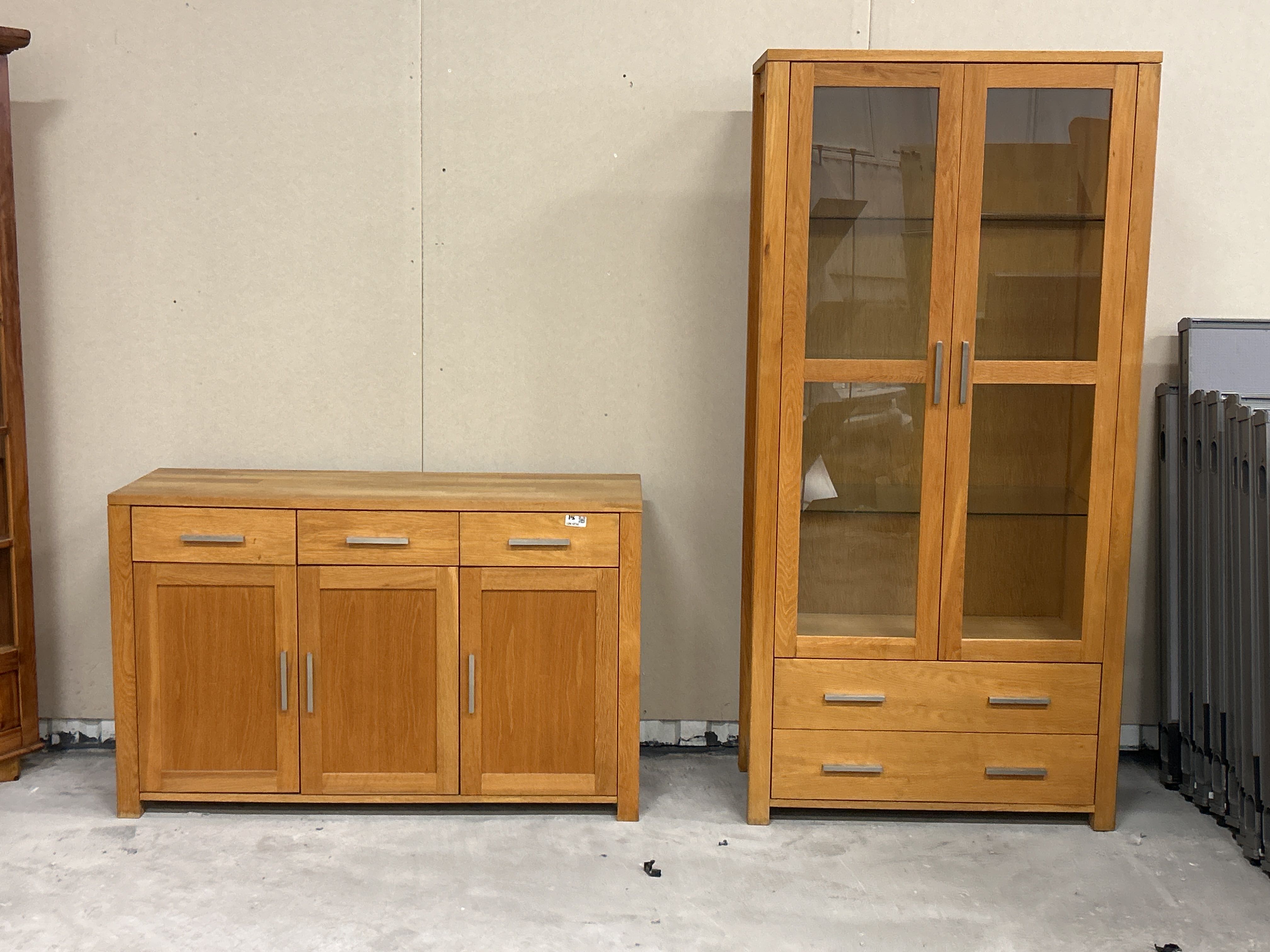 Byrå med lådor och skåpsluckor samt ett vitrinskåp med glasdörrar och utdragslådor.