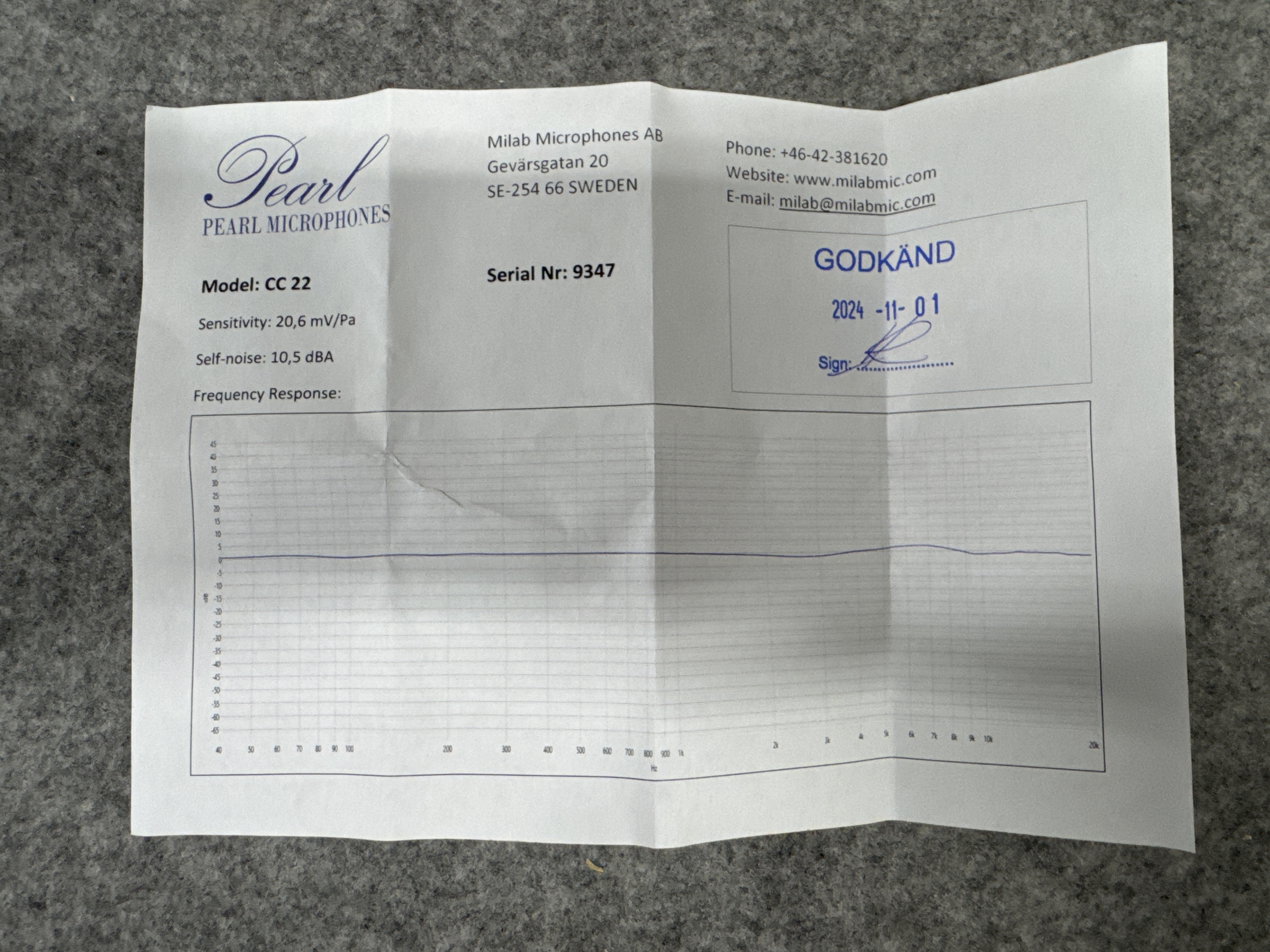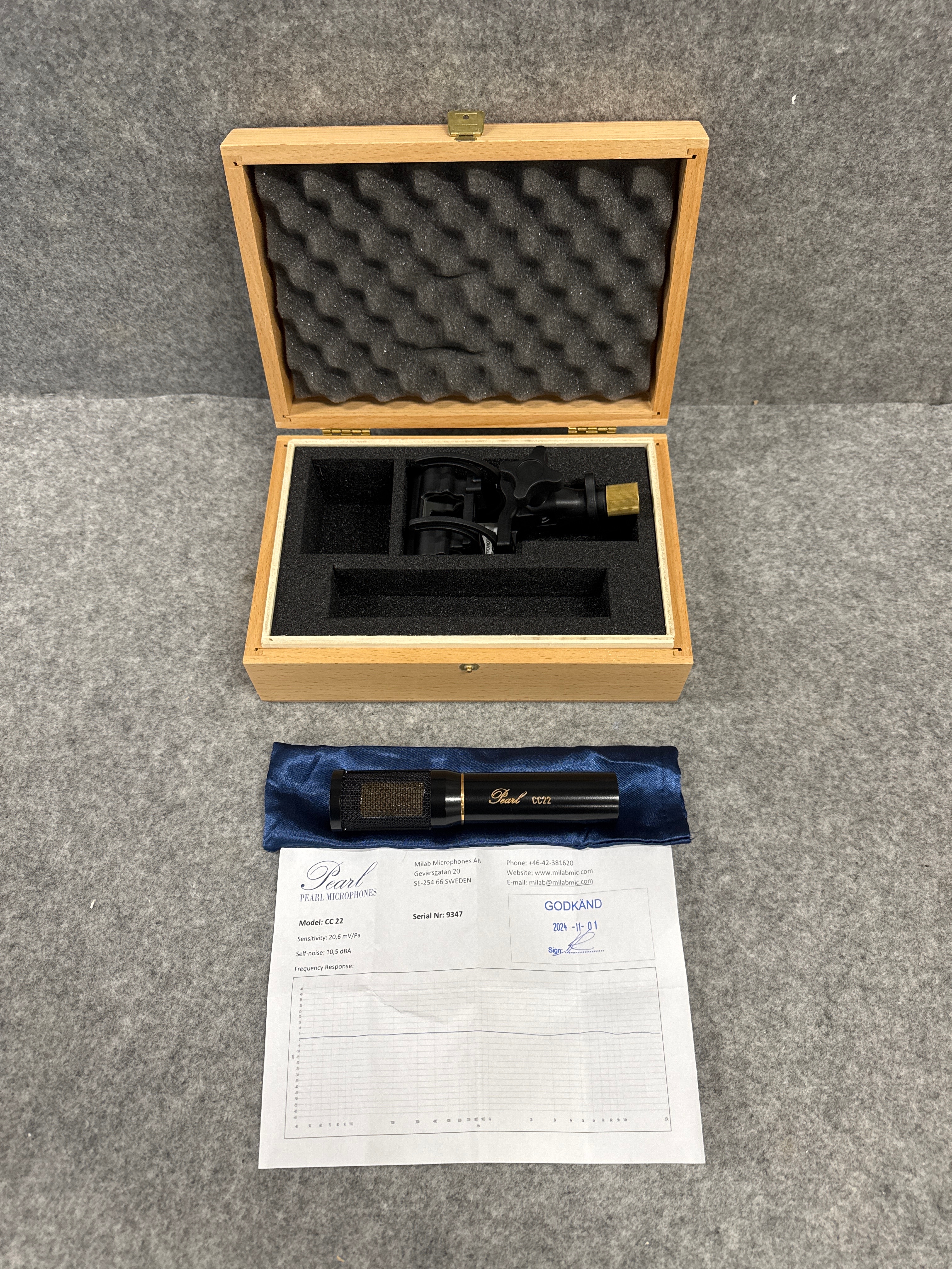 Från tillverkarens hemsida: “The Pearl CC 22 is a very fine microphone, matching or exceeding the sonic capabilities of its marketplace peers. Combining the consistent polar response of a small-diaphragm mic with the clarity and body of a large-diaphragm mic.”