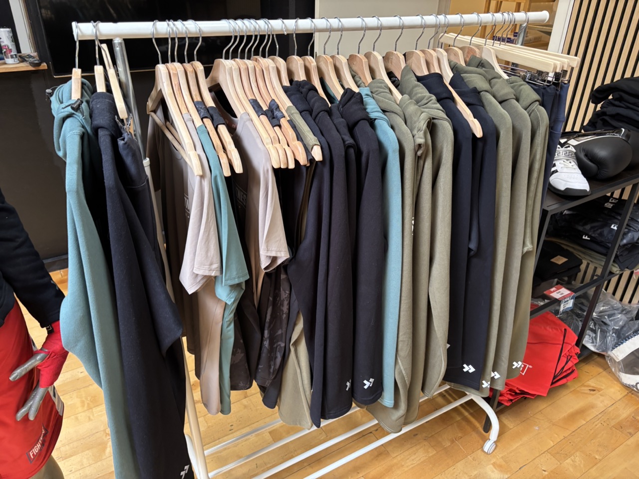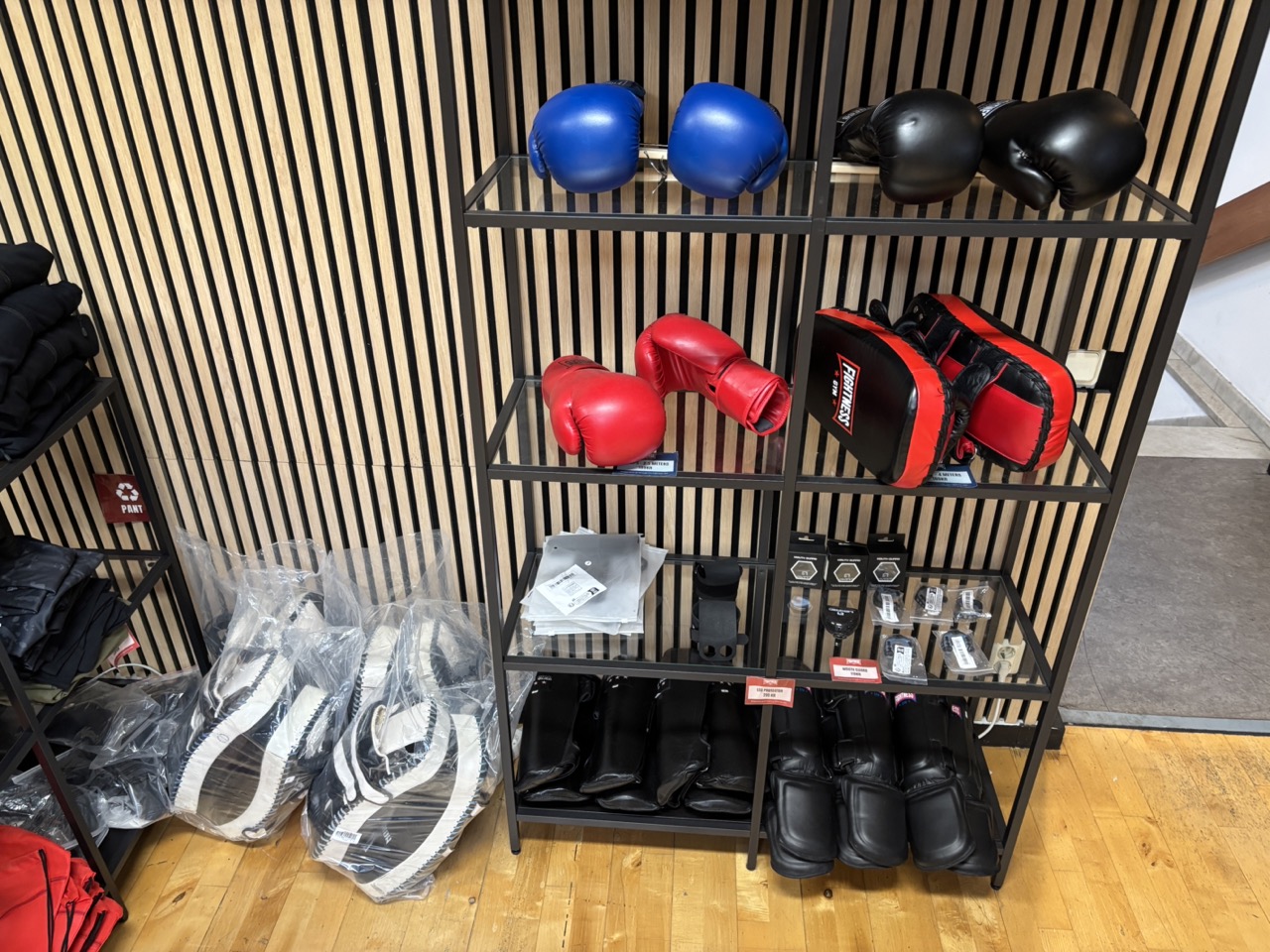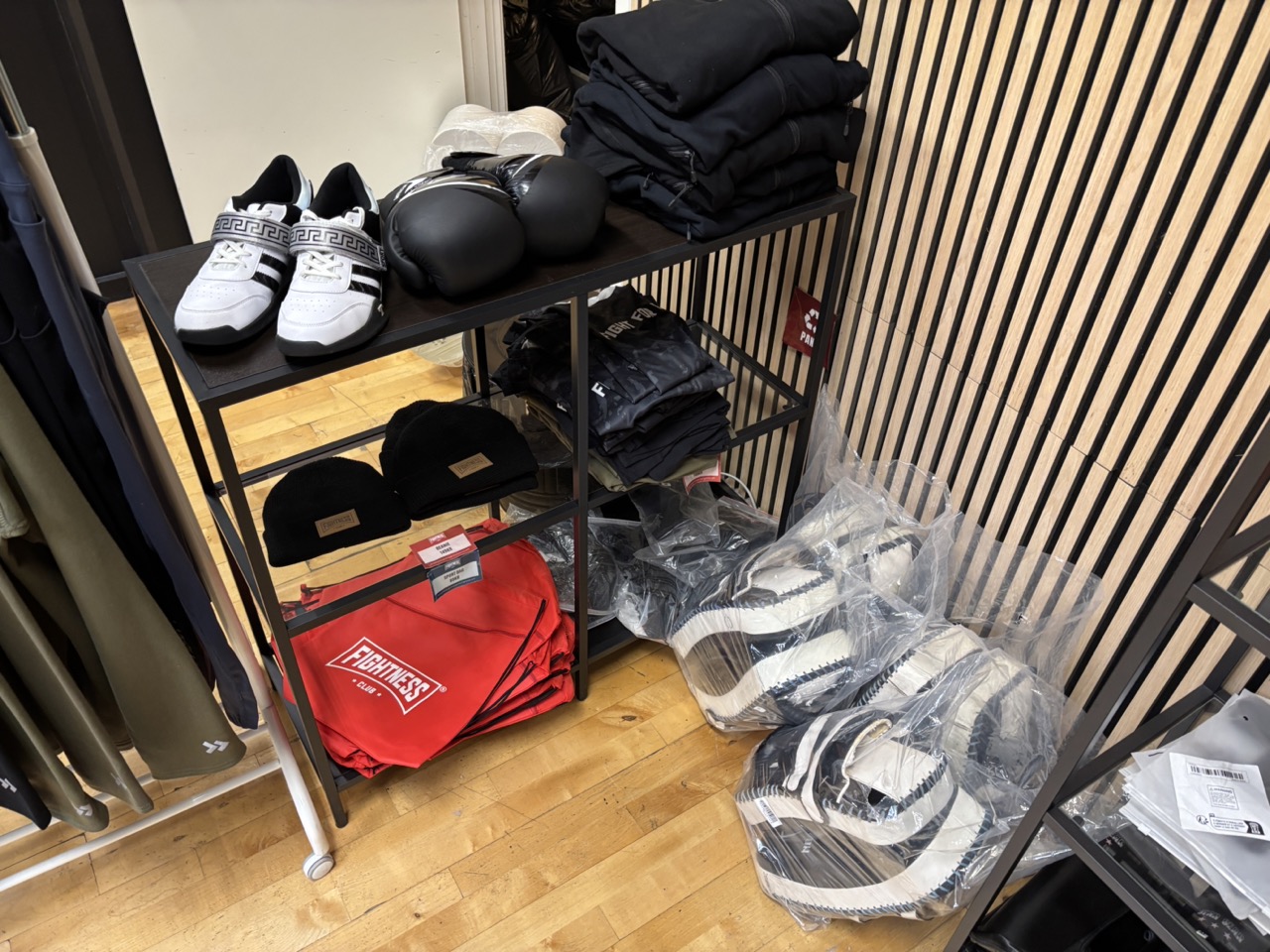 Träningskläder och träningsutrustning från förbutik i gym.