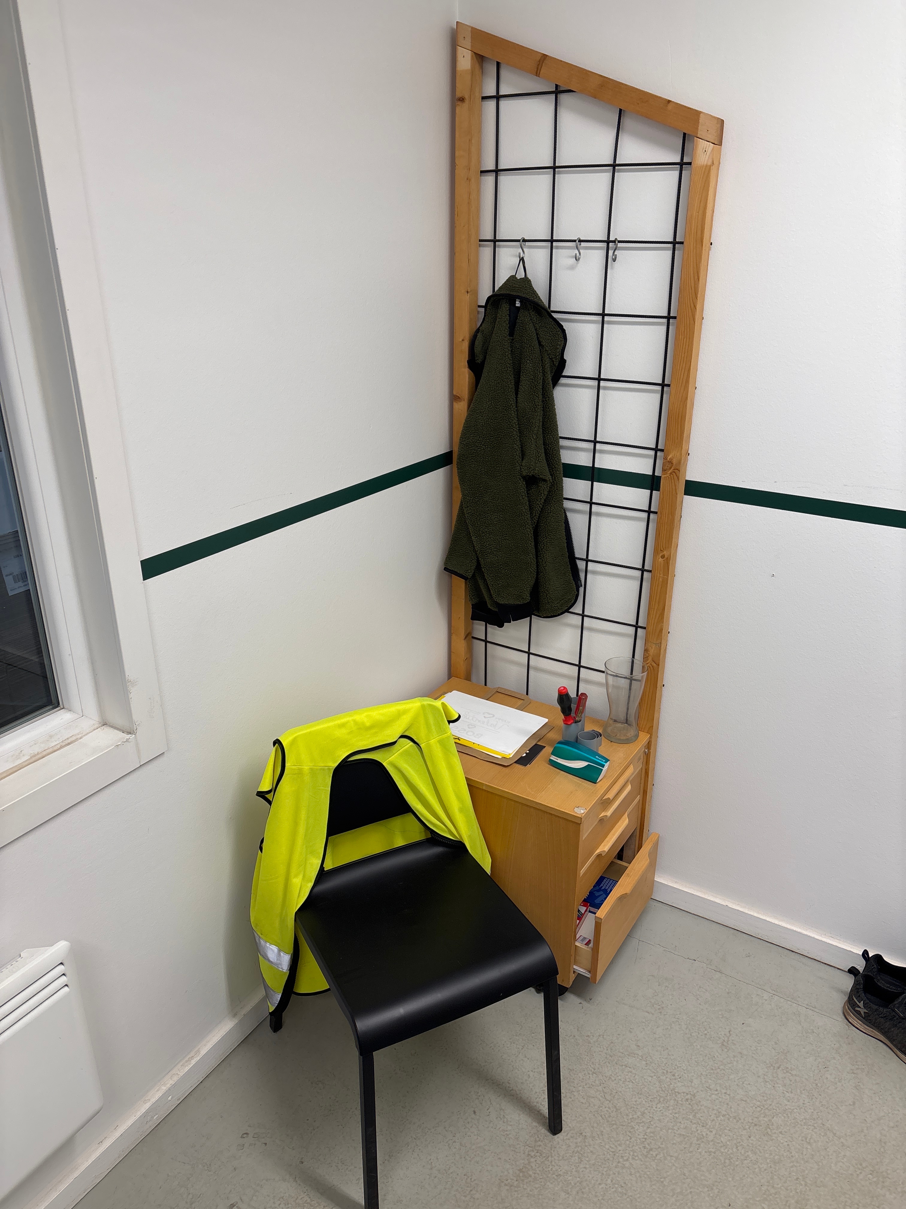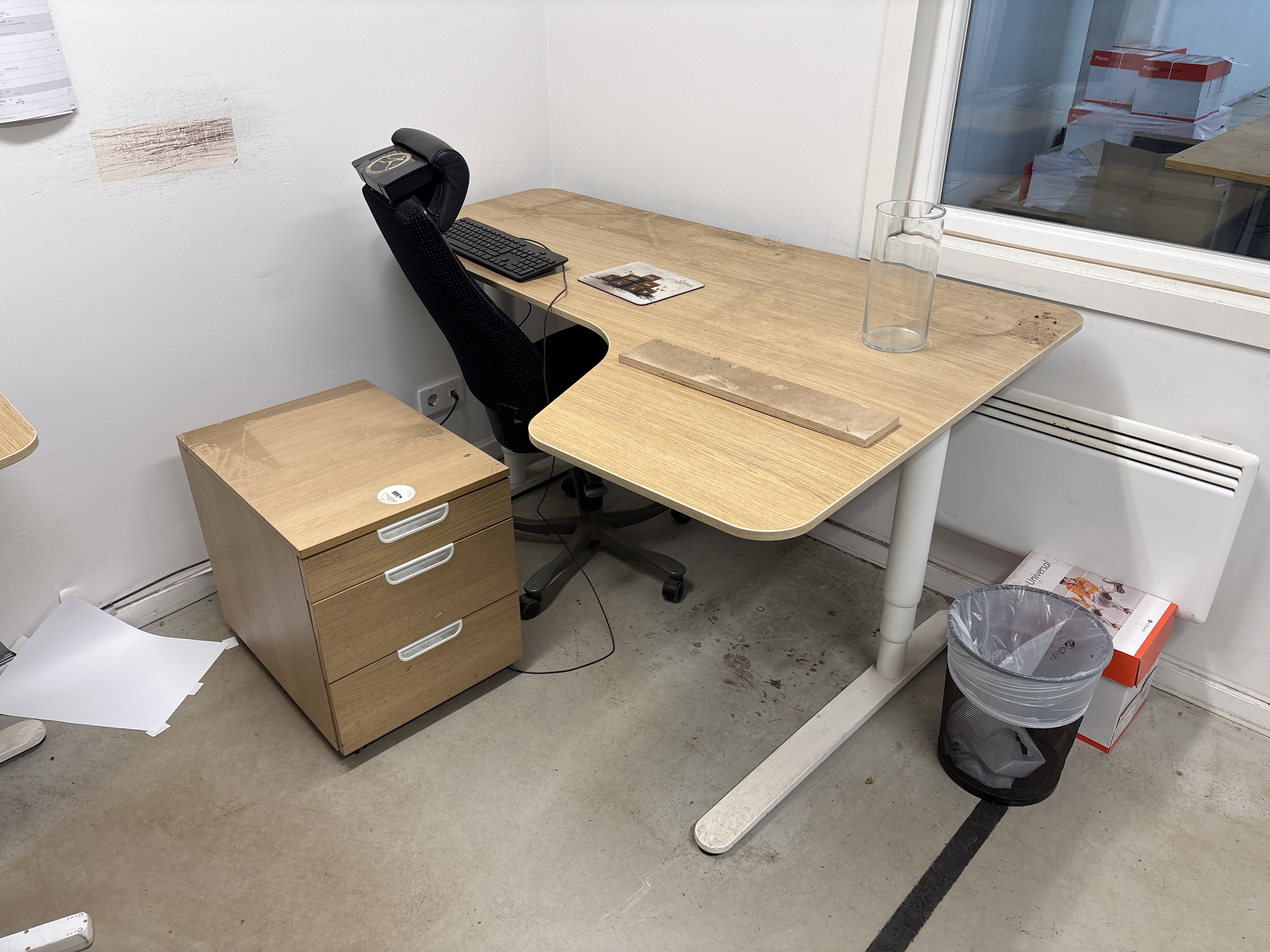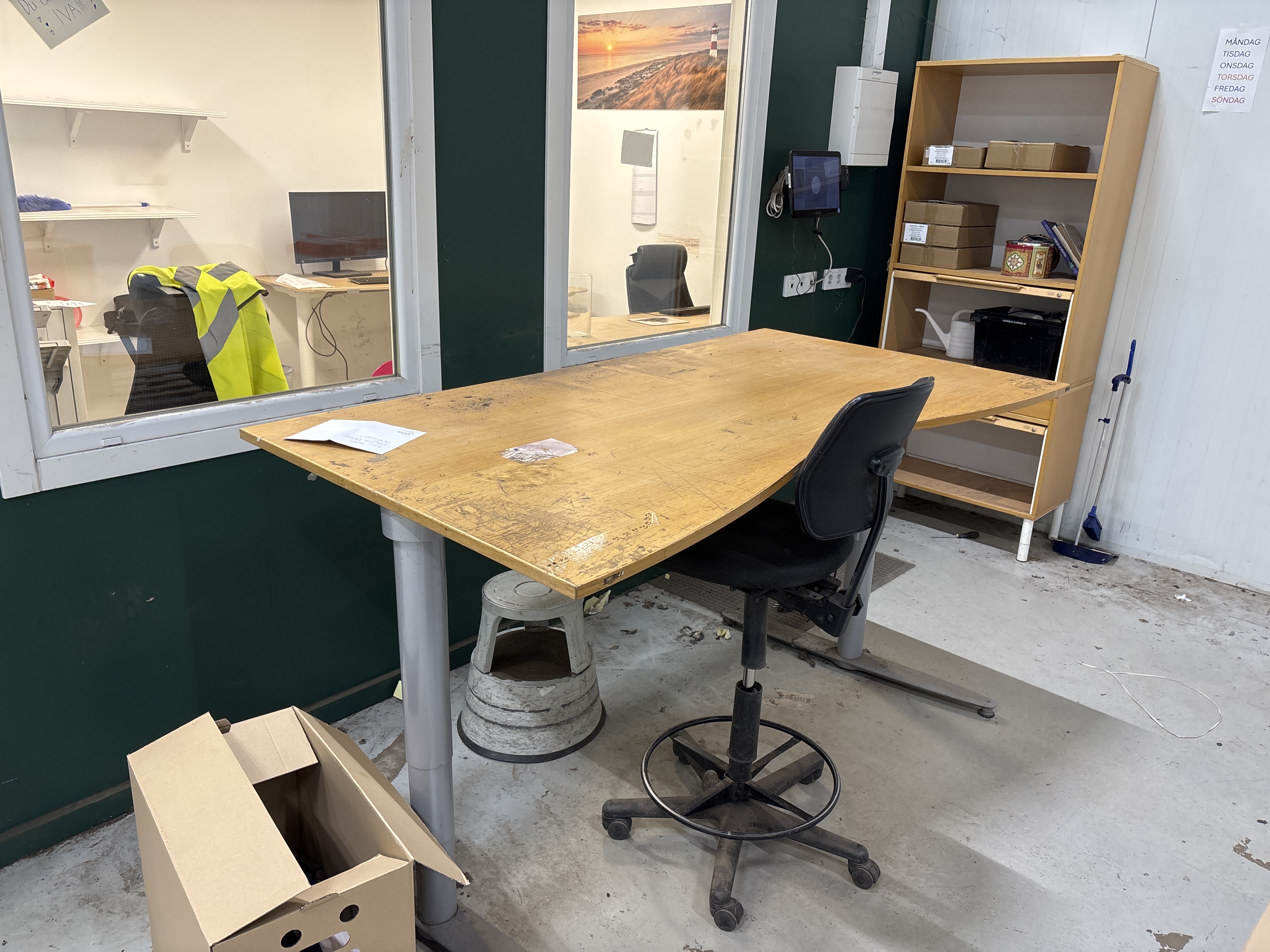 Bland objekten finns skrivbord, etikettskrivare, tippcontainrar, pallar med förpackningsmaterial, krukor i olika volymer samt sträckfilmsmaskiner och inplastningsutrustning.