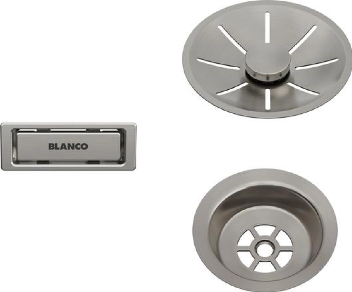 Set med avlopps- och bräddavloppsdetaljer i rostfritt stål för diskho. Innehåller en avloppssil, en avloppskorg samt en rektangulär bräddavloppsdel.