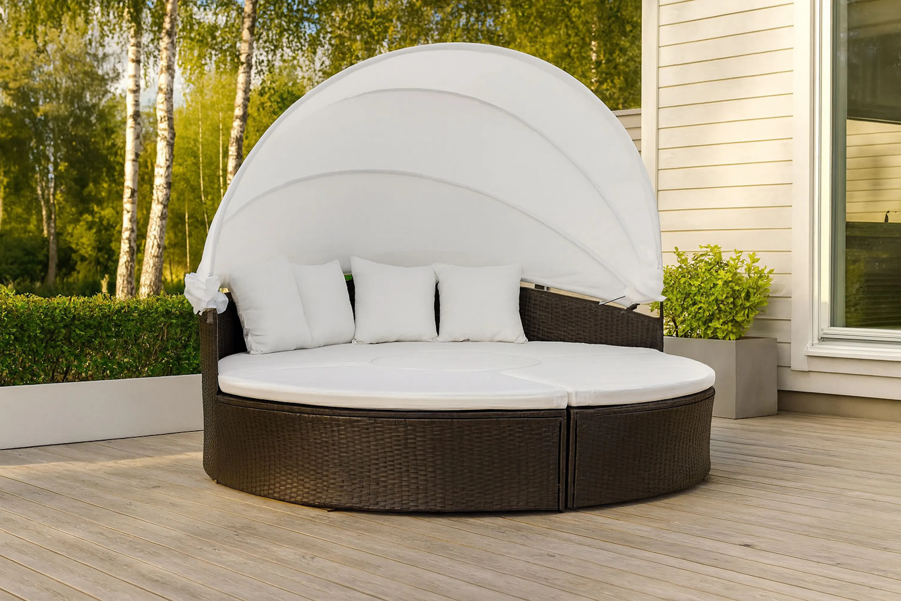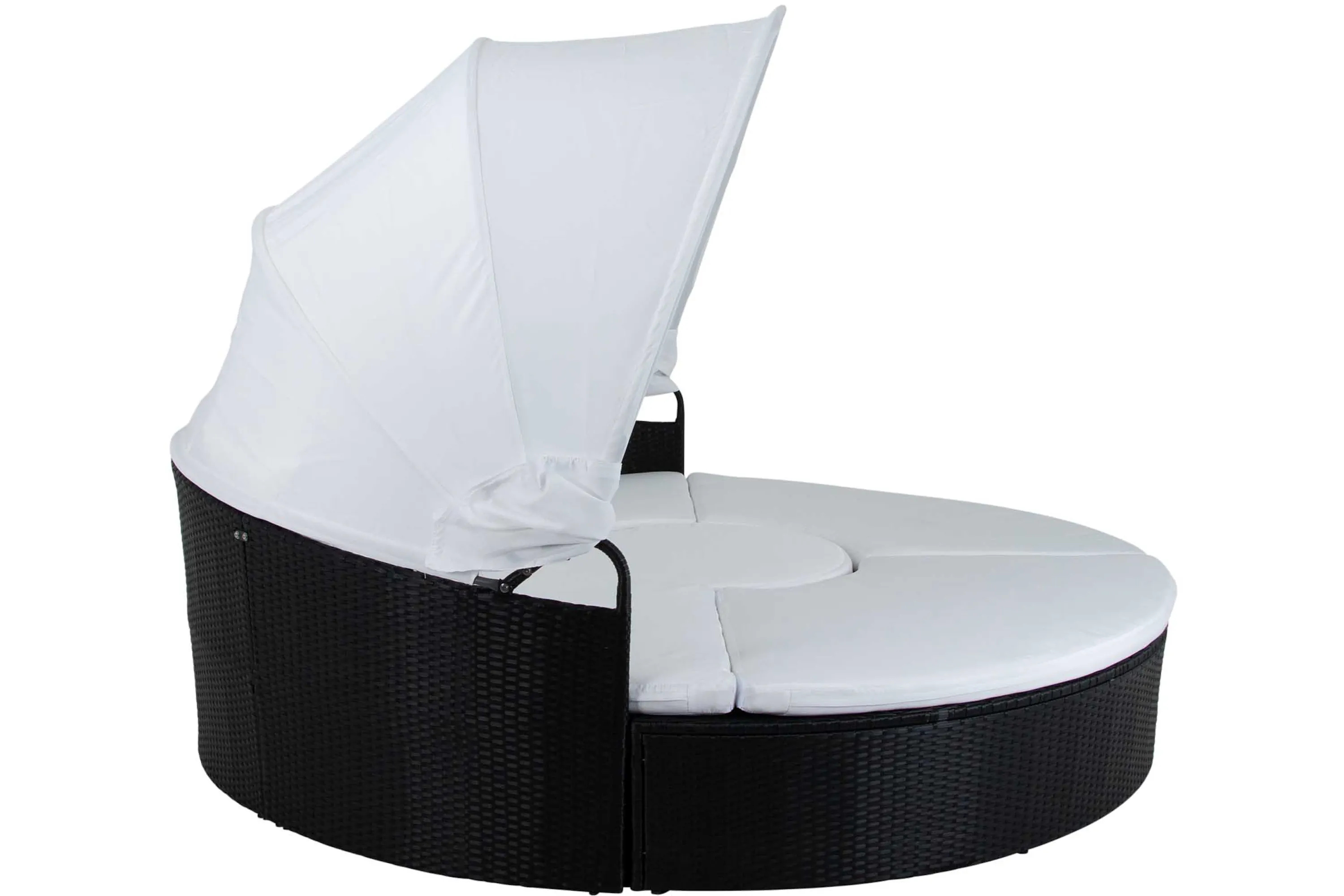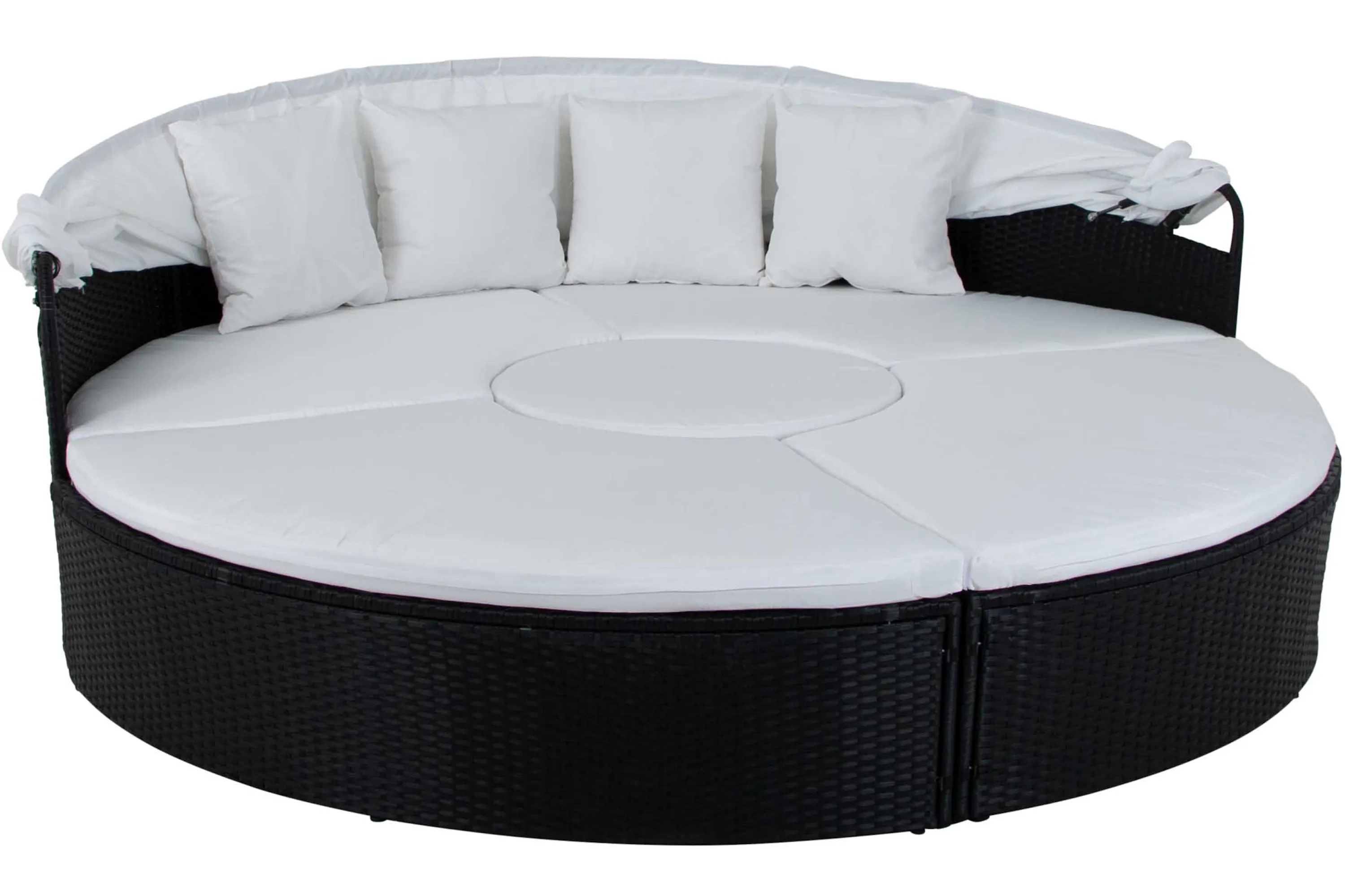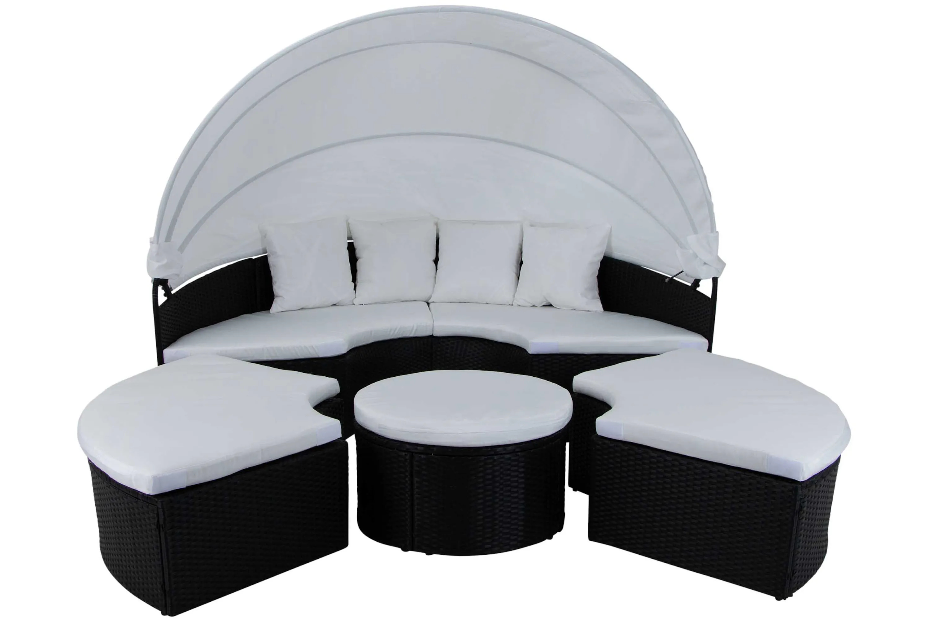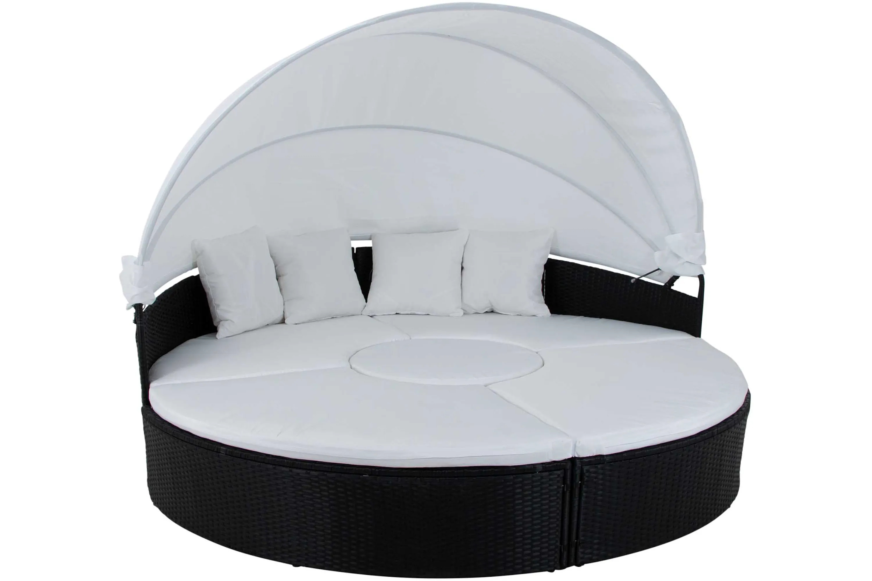 • Flexibel solsäng i fyra separata moduler som kan användas som rund loungesoffa eller dagbädd. Utrustad med justerbart tak för solskydd och mjuka dynor med avtagbara överdrag.
