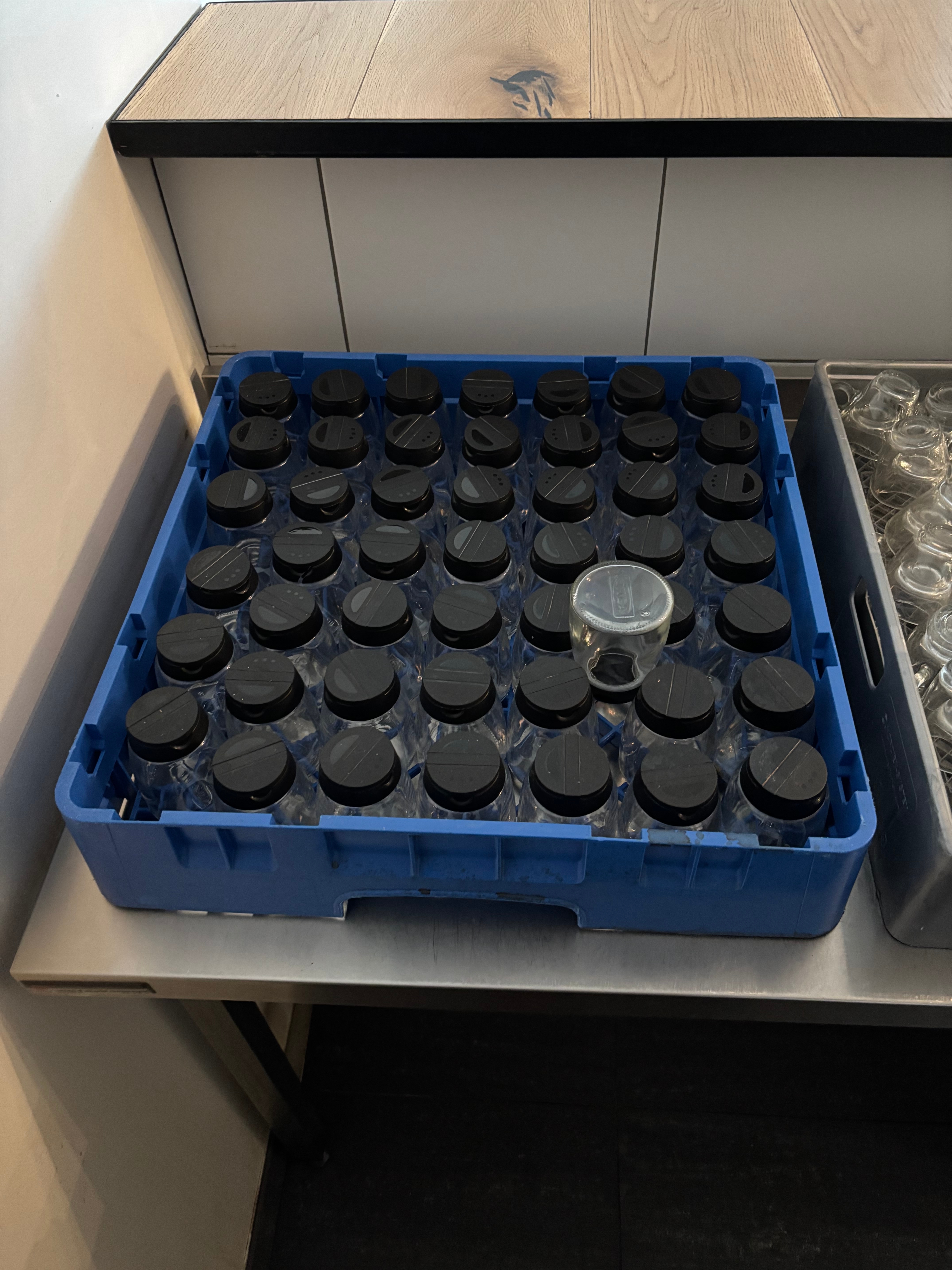Serveringsbänk i rostfritt med tillhörande koppar, glas och burkar