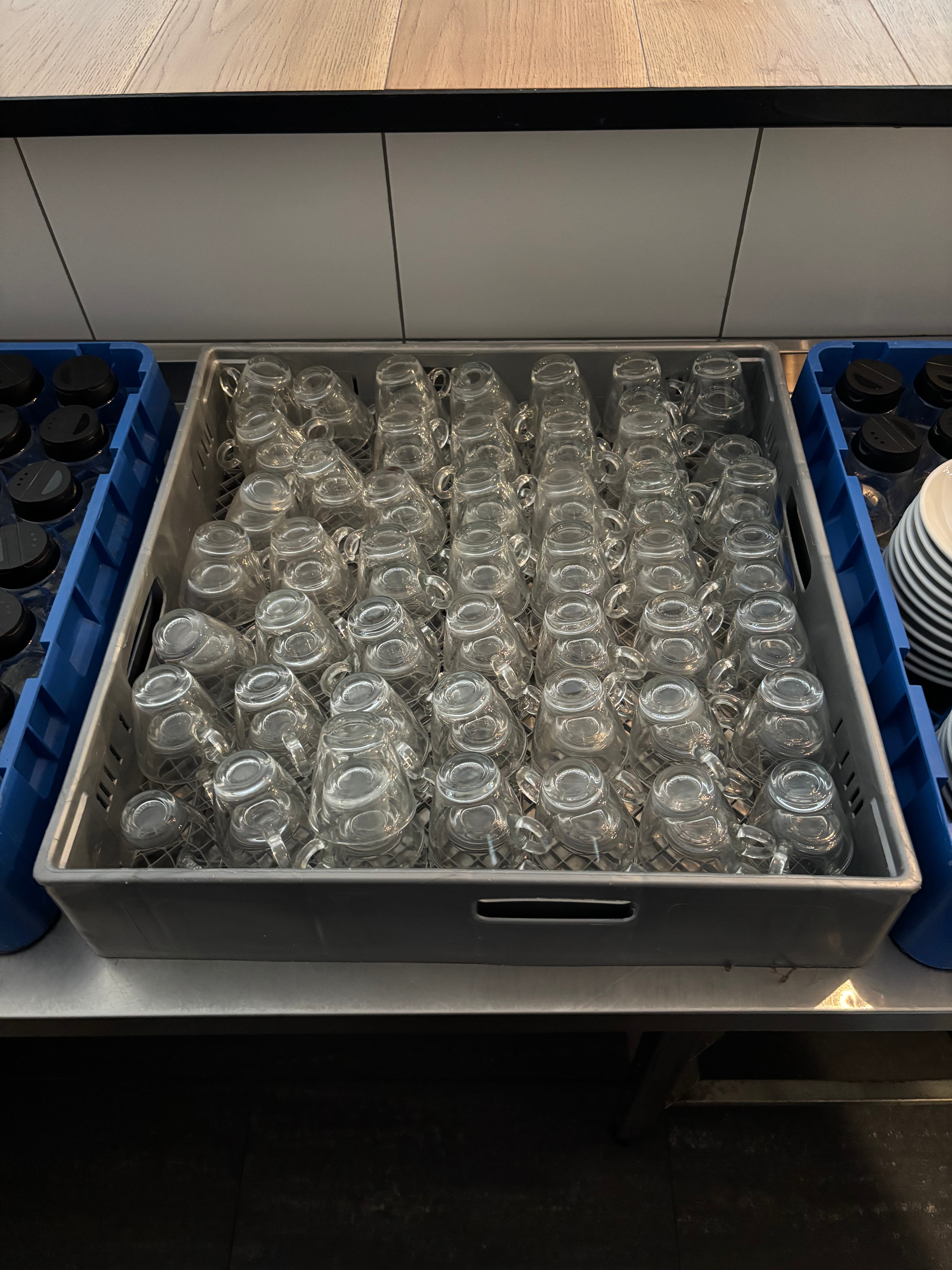 Förvaring: Förvarade i blå och grå diskkorgar under bänken