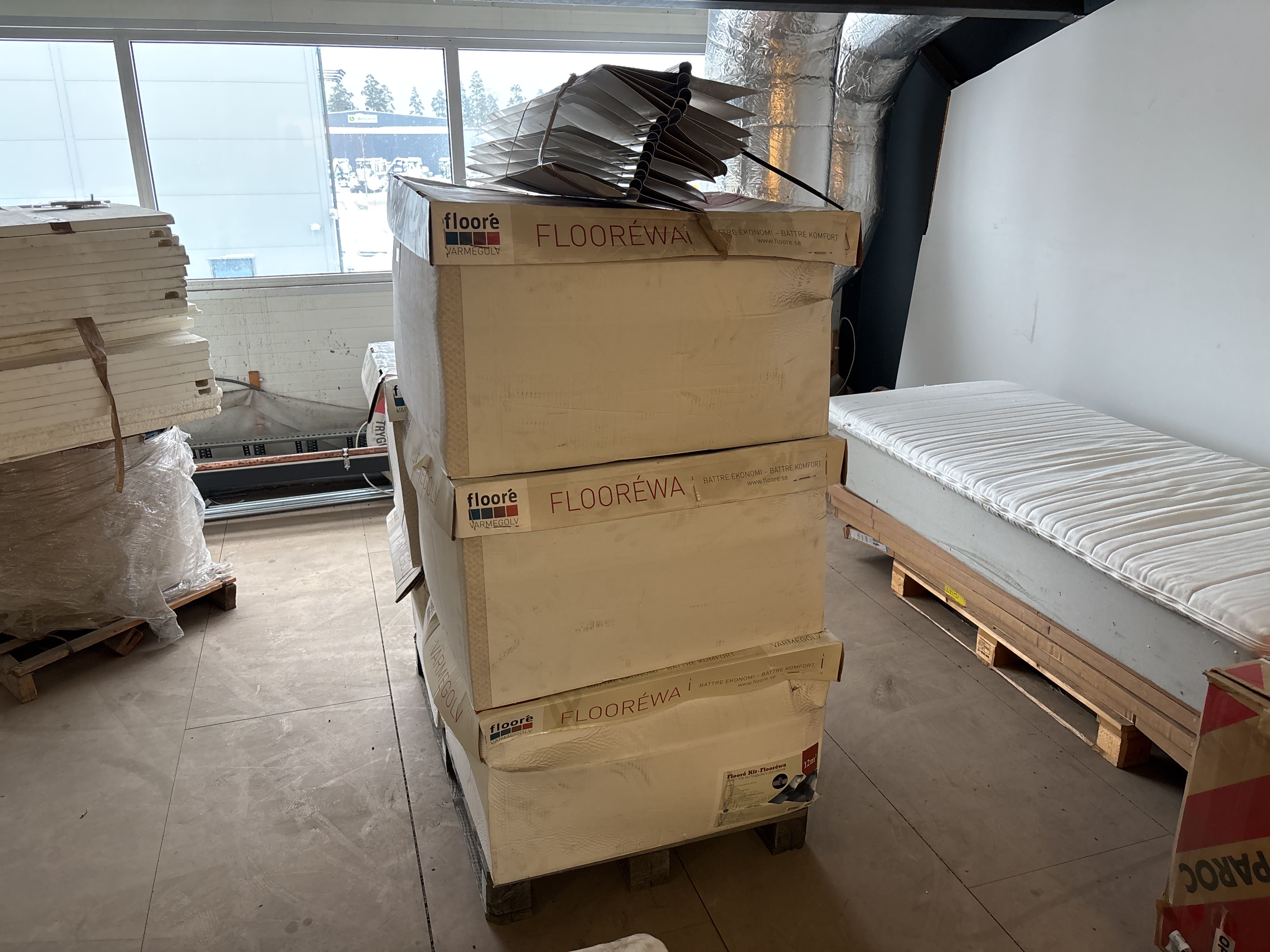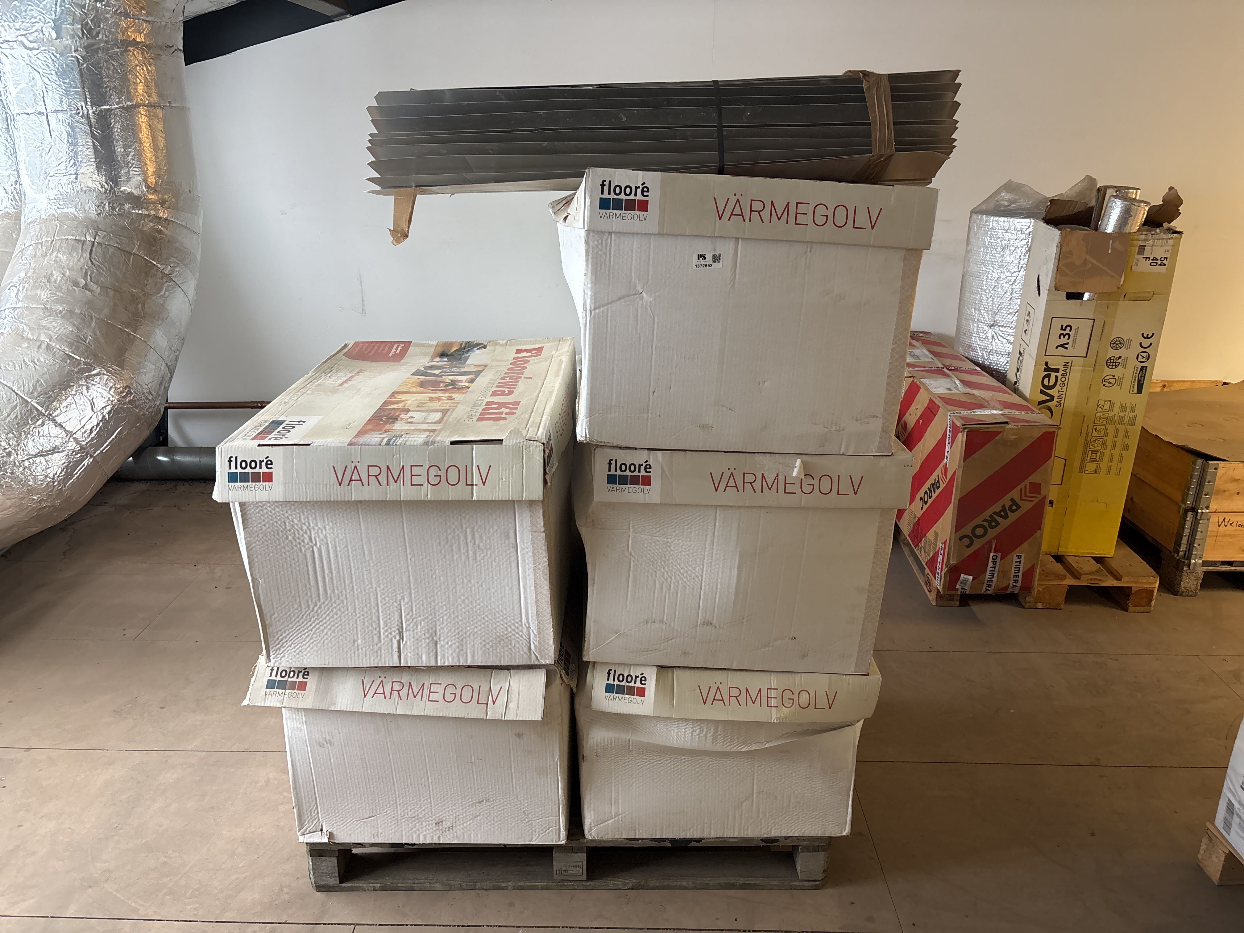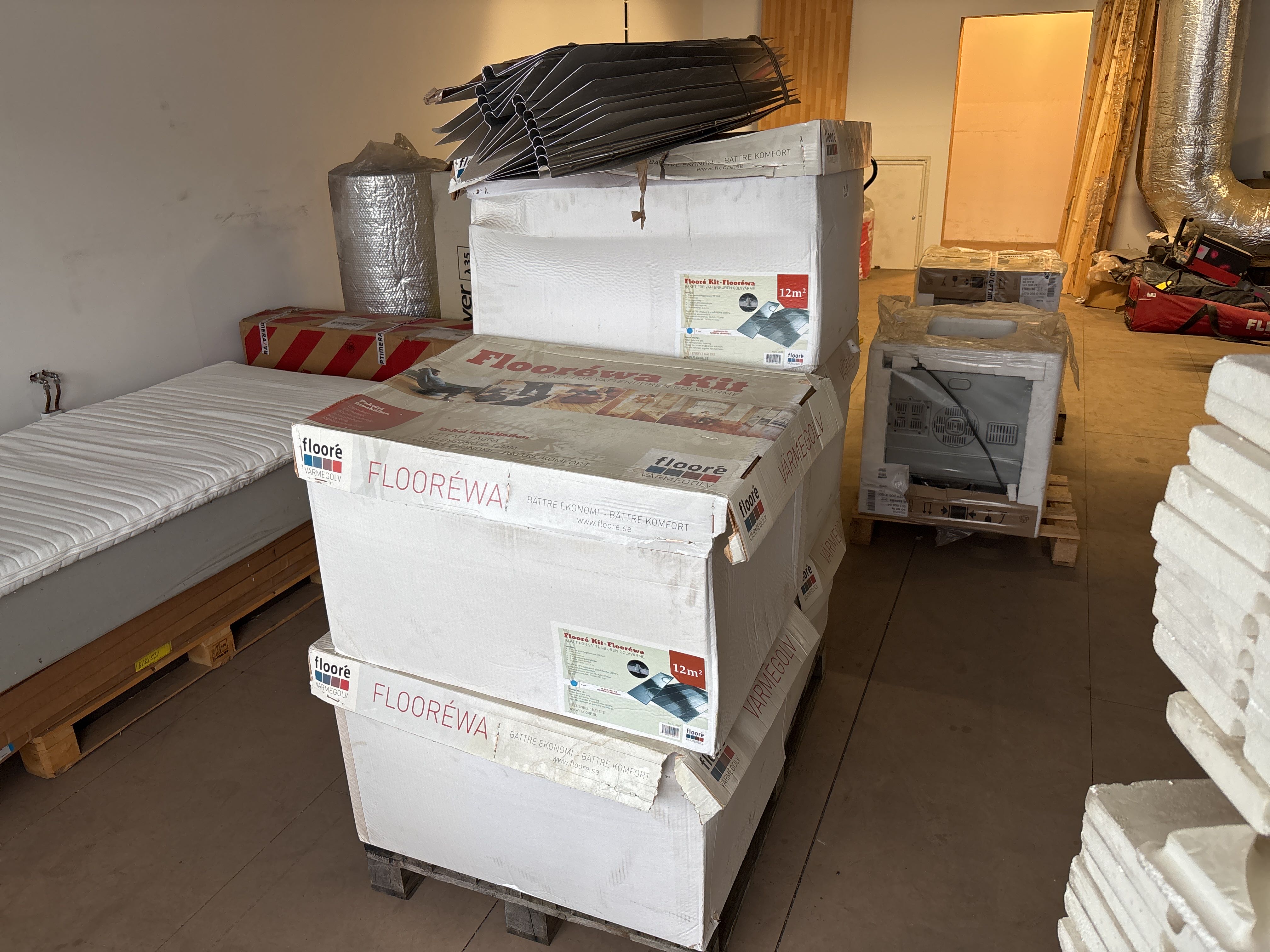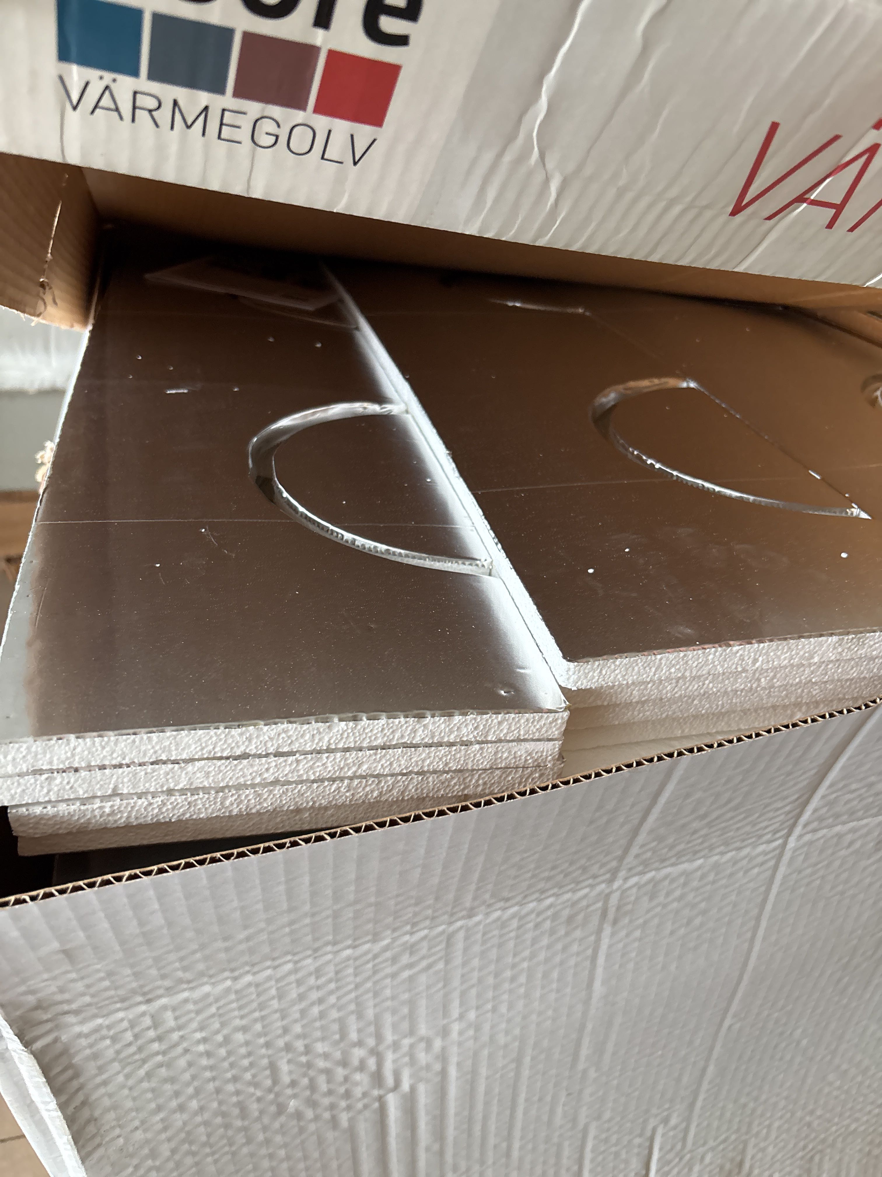 Ej komplett sats – isolering och aluminiumprofiler/skenor saknas delvis. Avsett för vattenburet värmesystem med rörläggning i spårade skivor.