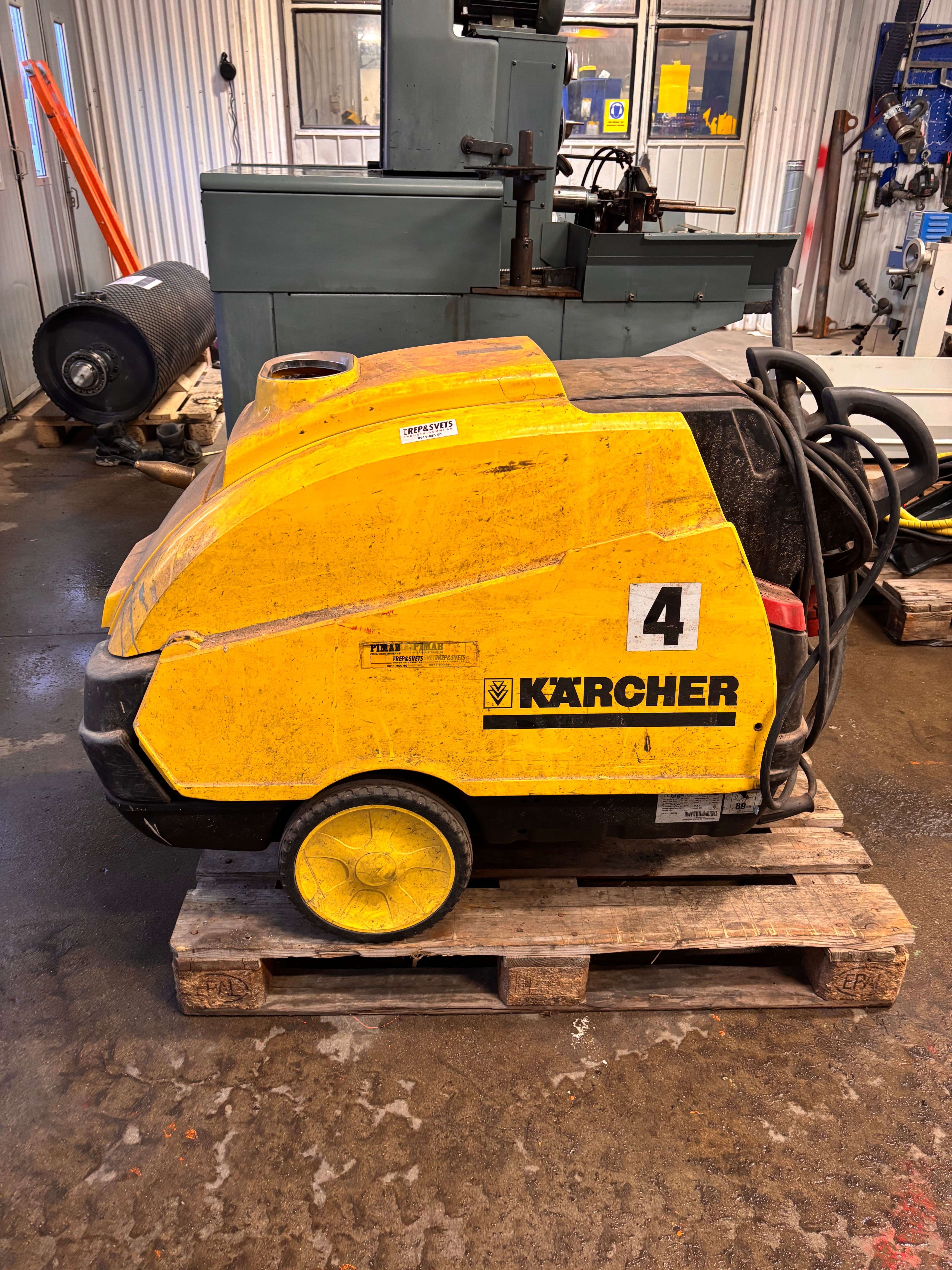 Kompakt hetvattentvätt för professionell rengöring inom verkstad, industri eller lantbruk. Modellen är utrustad med dieselbrännare för varmvatten samt elansluten högtryckspump. Objektet är rapporterat defekt – ger inget tryck.