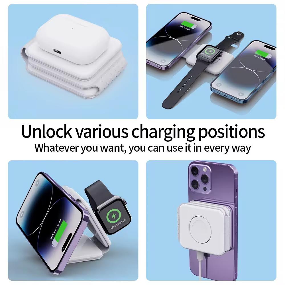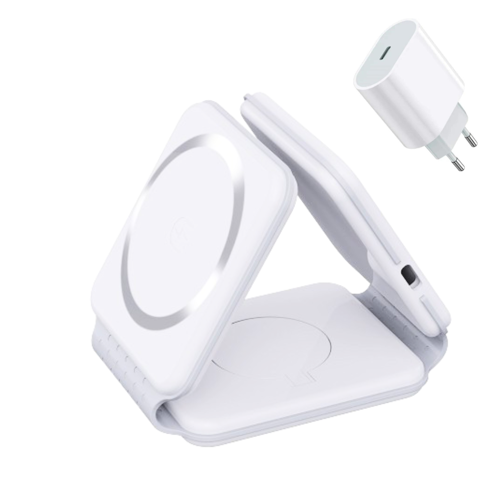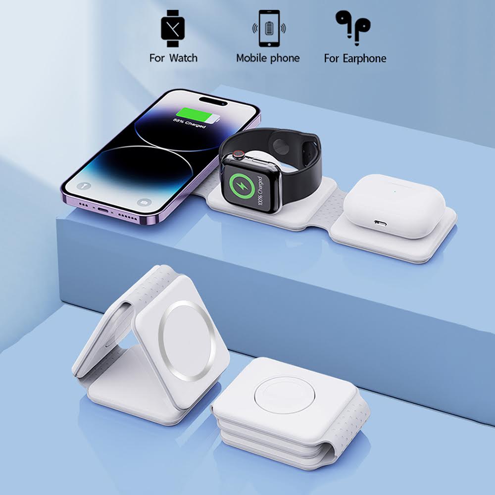 Trådlös laddstation med tre laddytor som möjliggör samtidig laddning av mobiltelefon, smartklocka och trådlösa hörlurar. Designen är vikbar och kompakt, vilket gör den praktisk för både hemmet och resan. Den är utrustad med inbyggda magneter för att stabilt hålla kompatibla enheter på plats under laddning.