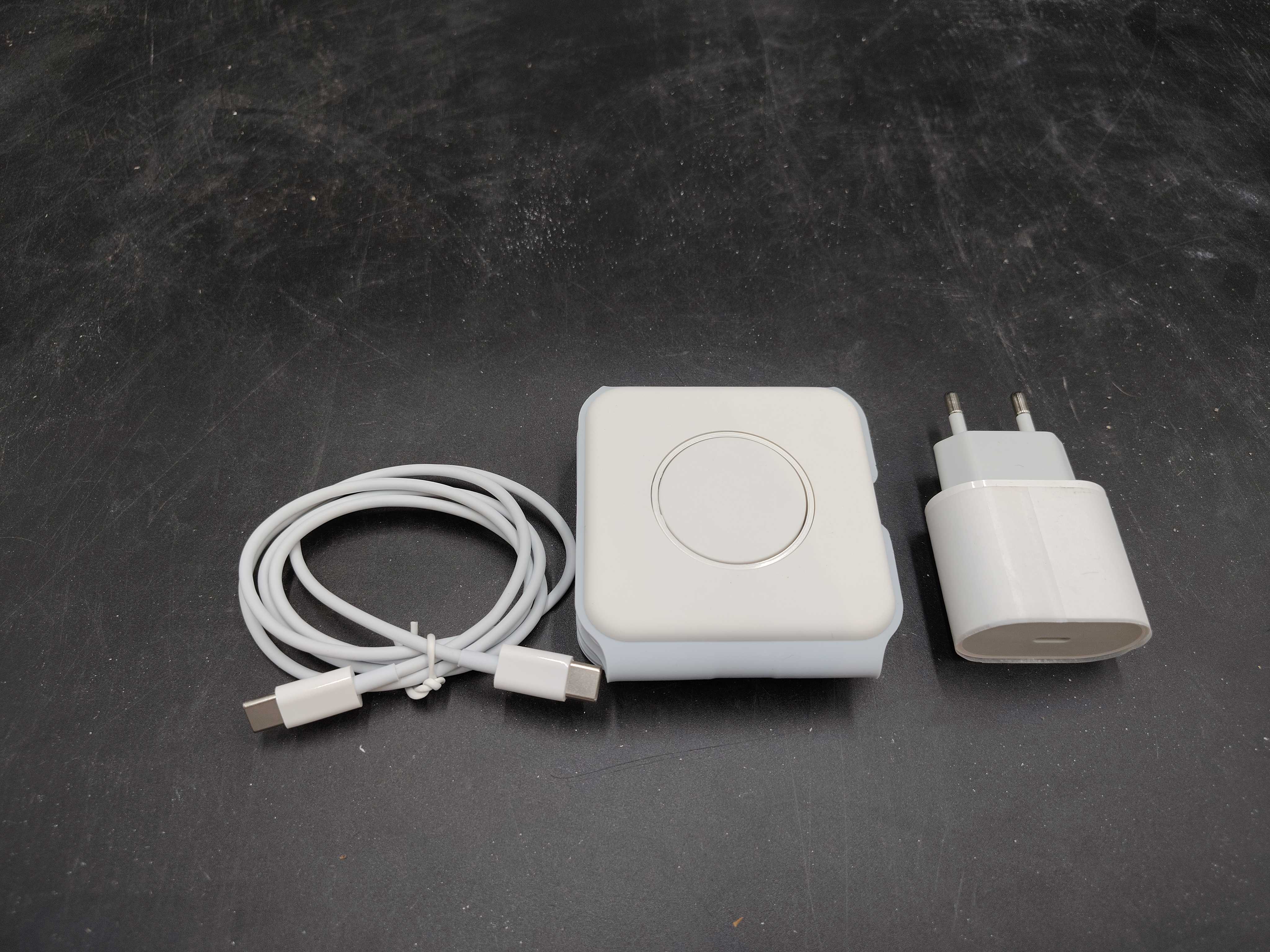 Levereras med USB-C till USB-C laddkabel och väggadapter med tvåstiftskontakt.