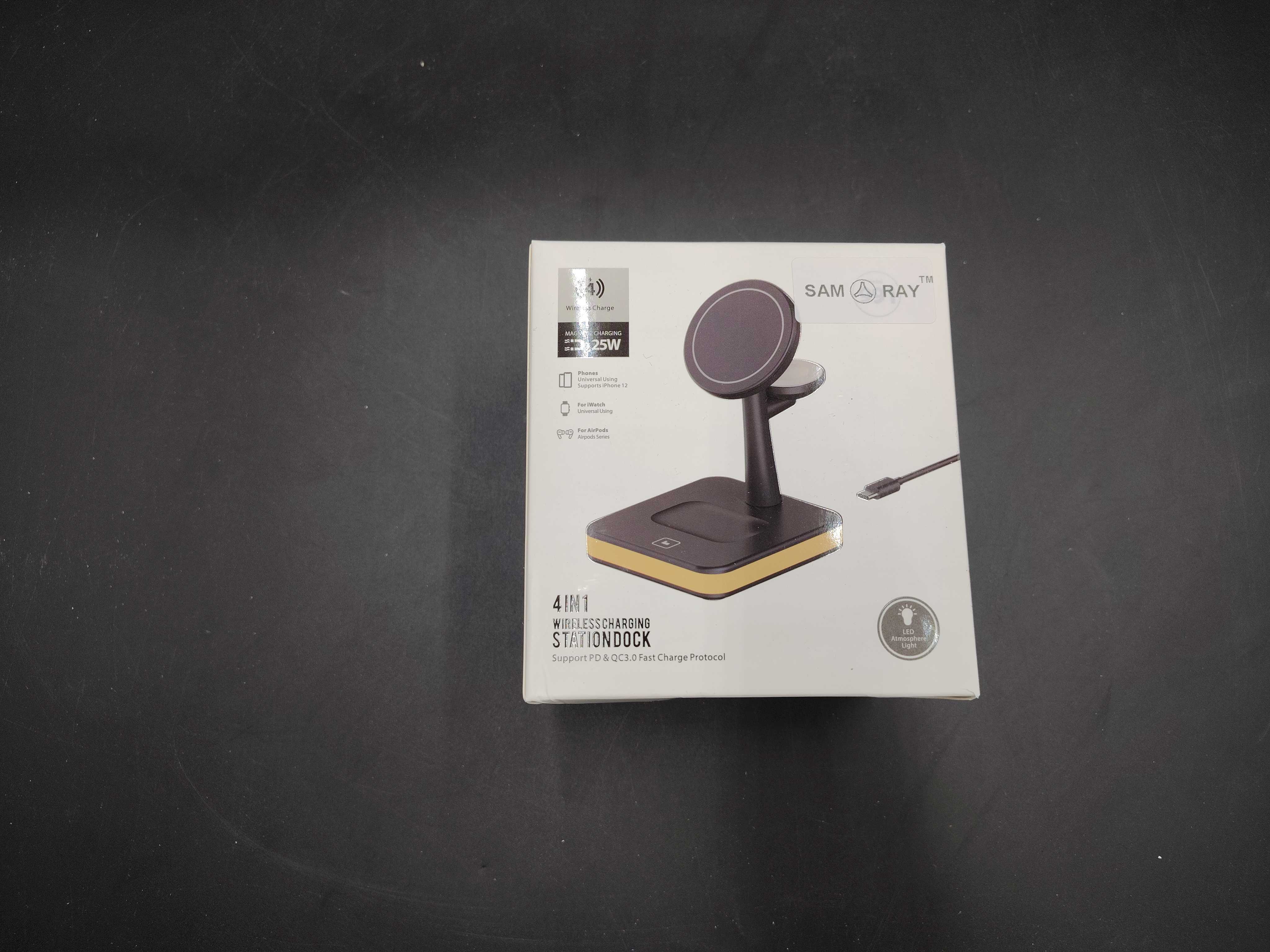 Trådlös laddstation av märket Samray, med kapacitet att ladda upp till fyra enheter samtidigt. Produkten stödjer PD- och QC3.0-protokoll med en maxeffekt på 25W. Kompatibel med iPhone, Apple Watch och AirPods. Levereras med tillhörande nätadapter och USB-C kabel.