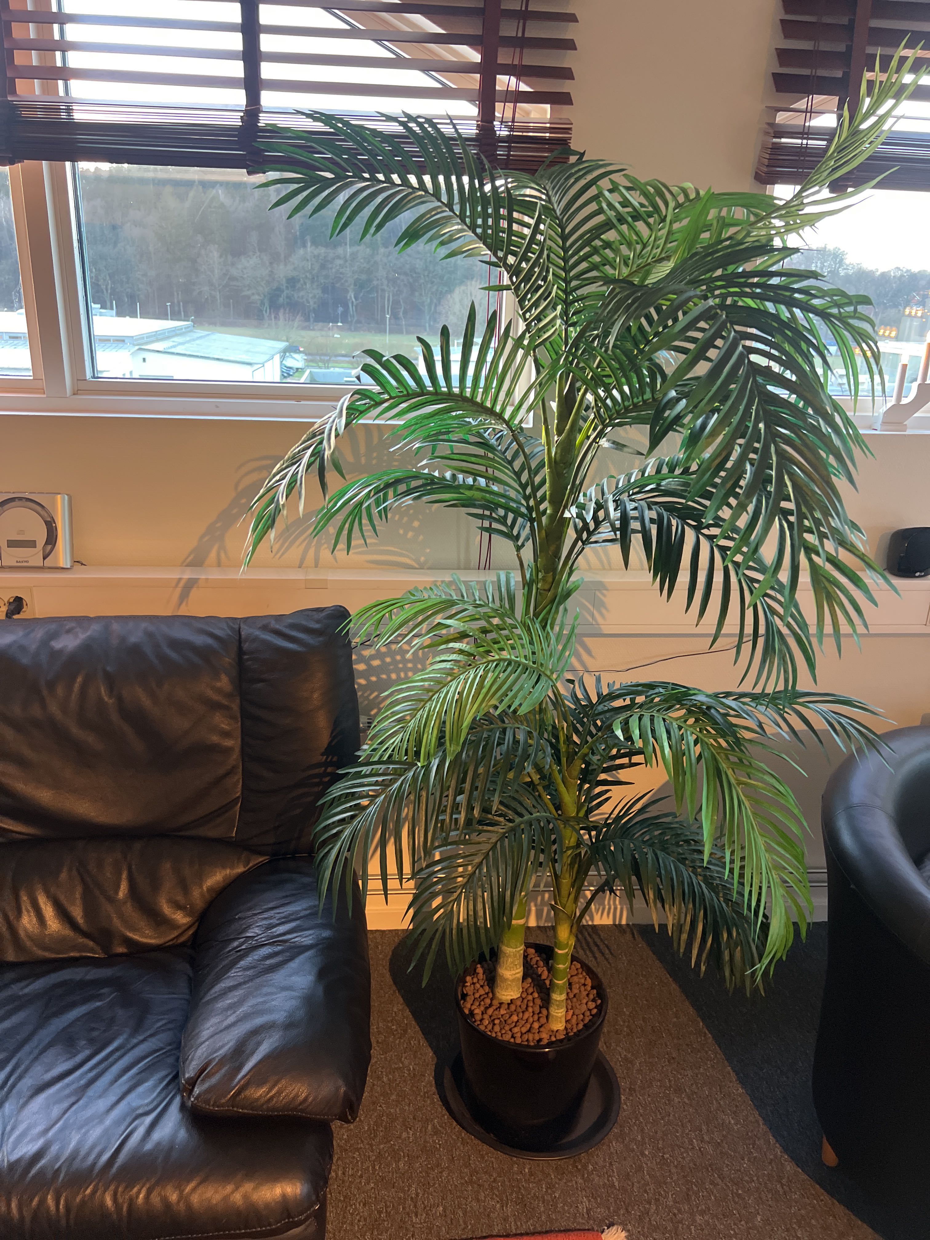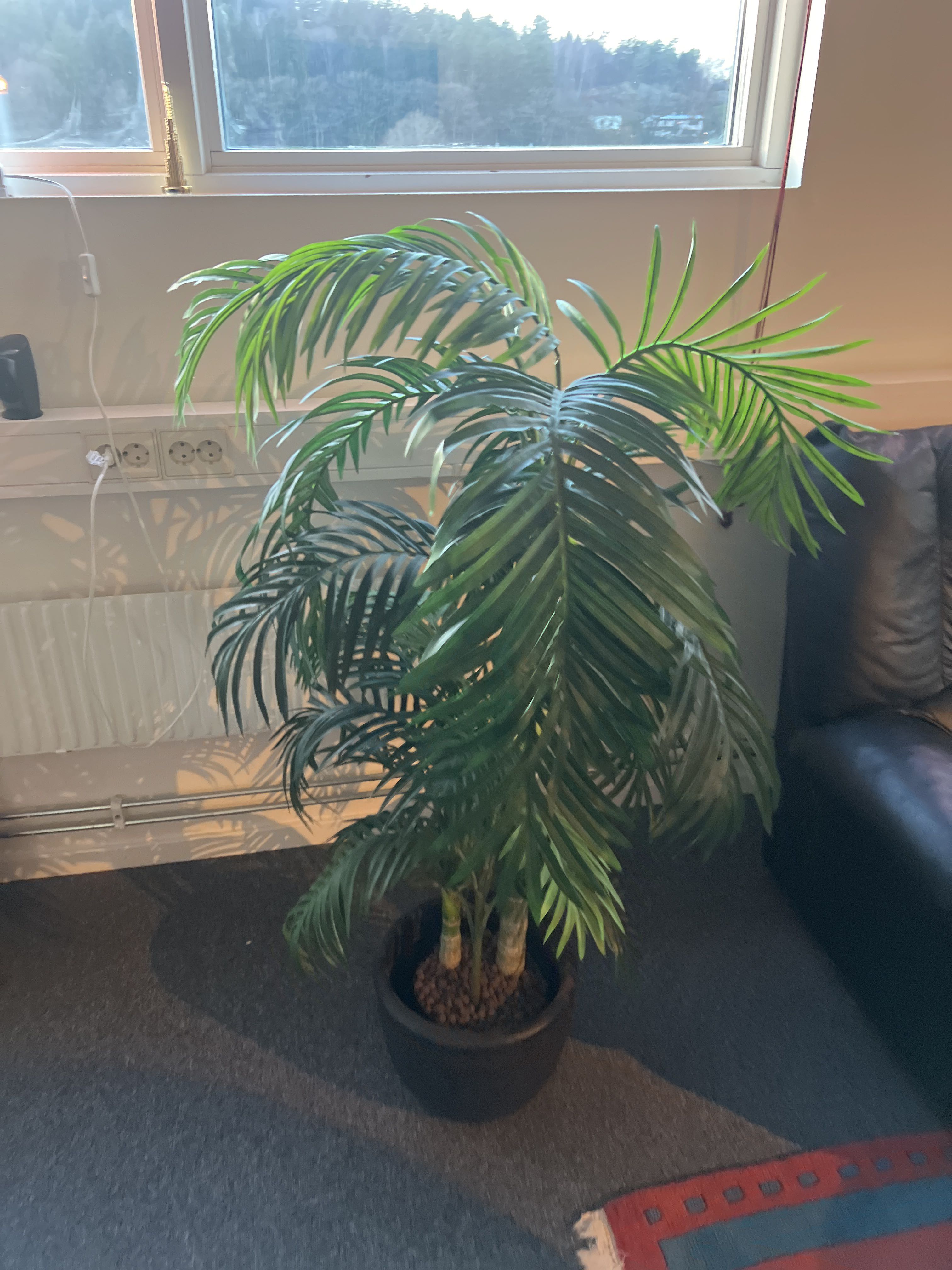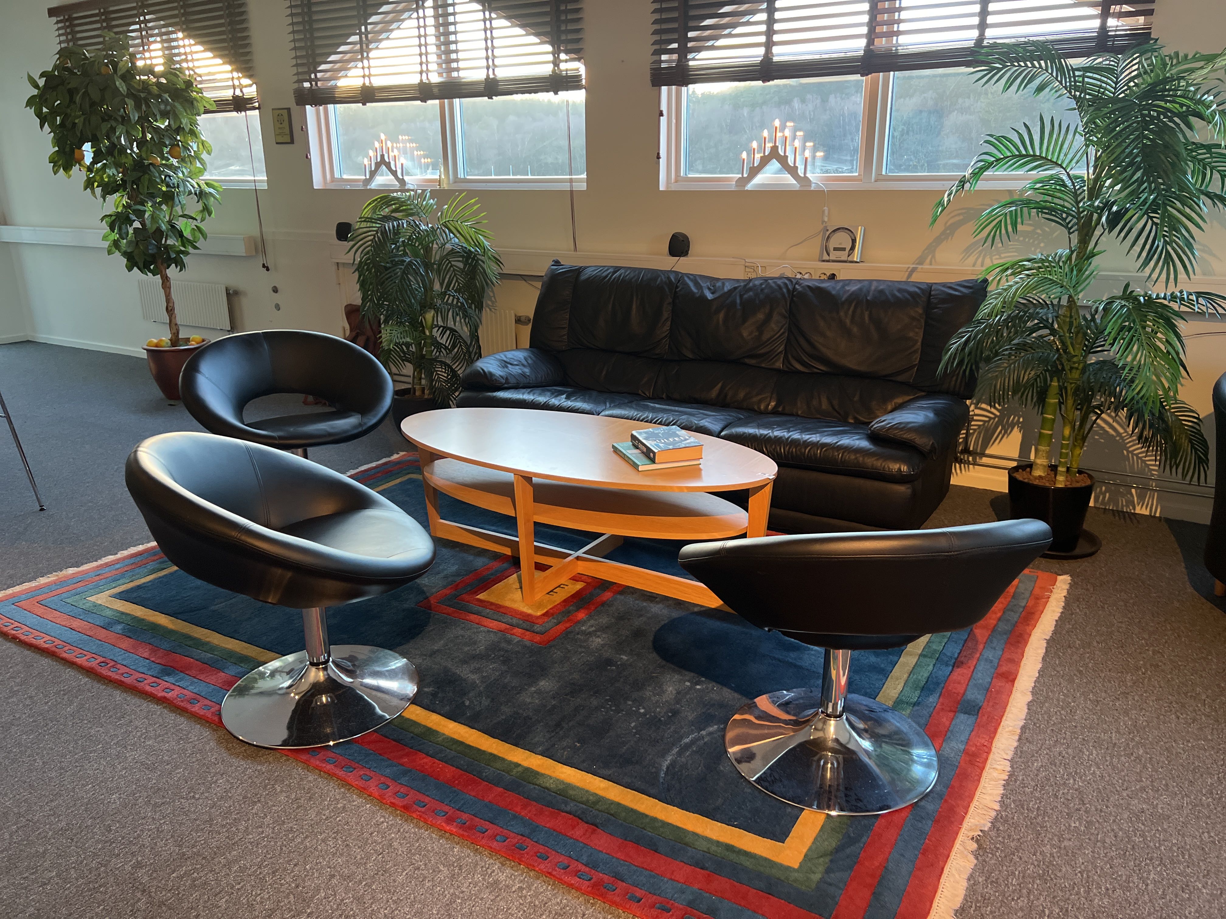 Möbler - Soffa, fåtöljer, soffbord, matta och konstväxter.
