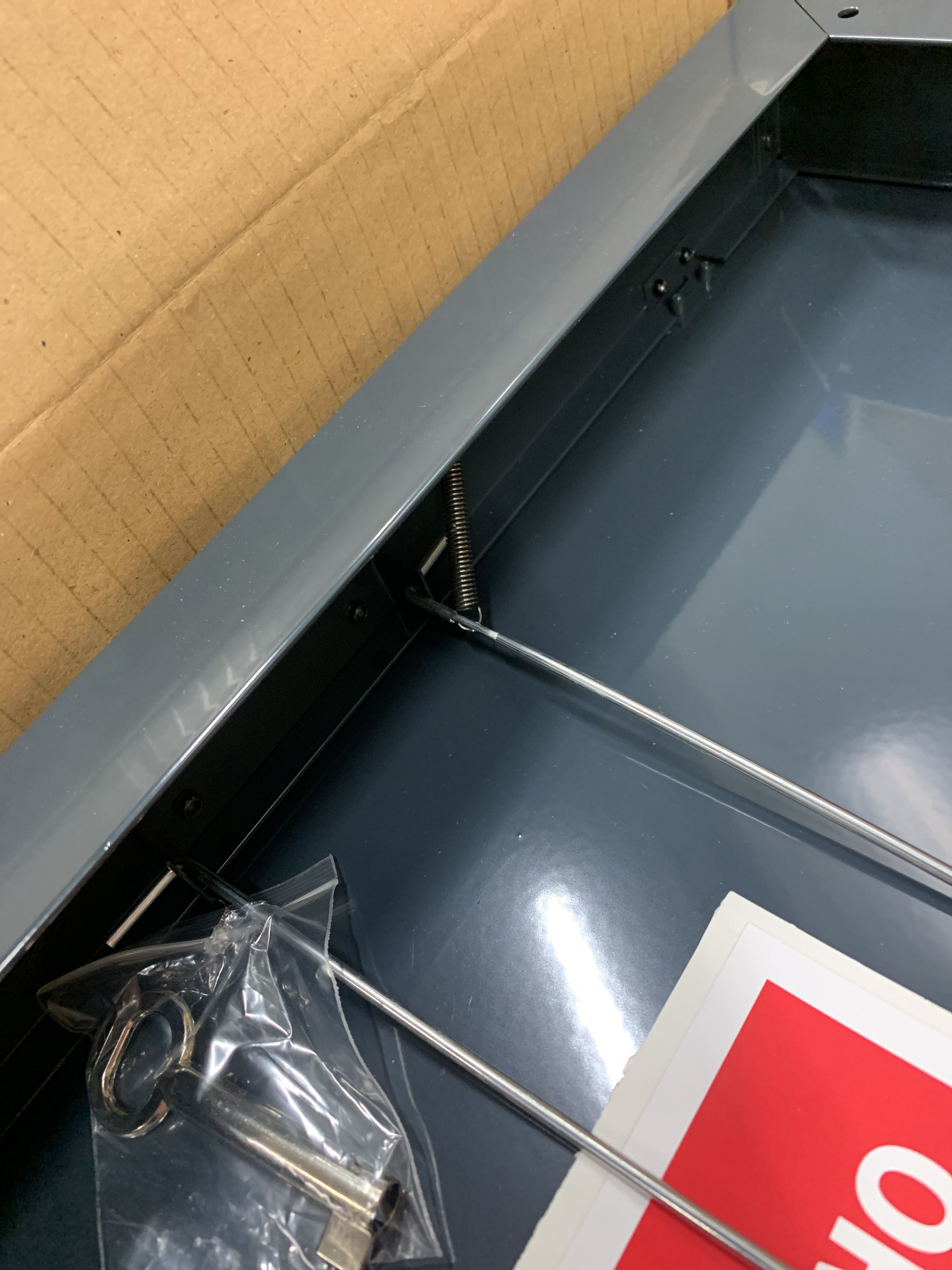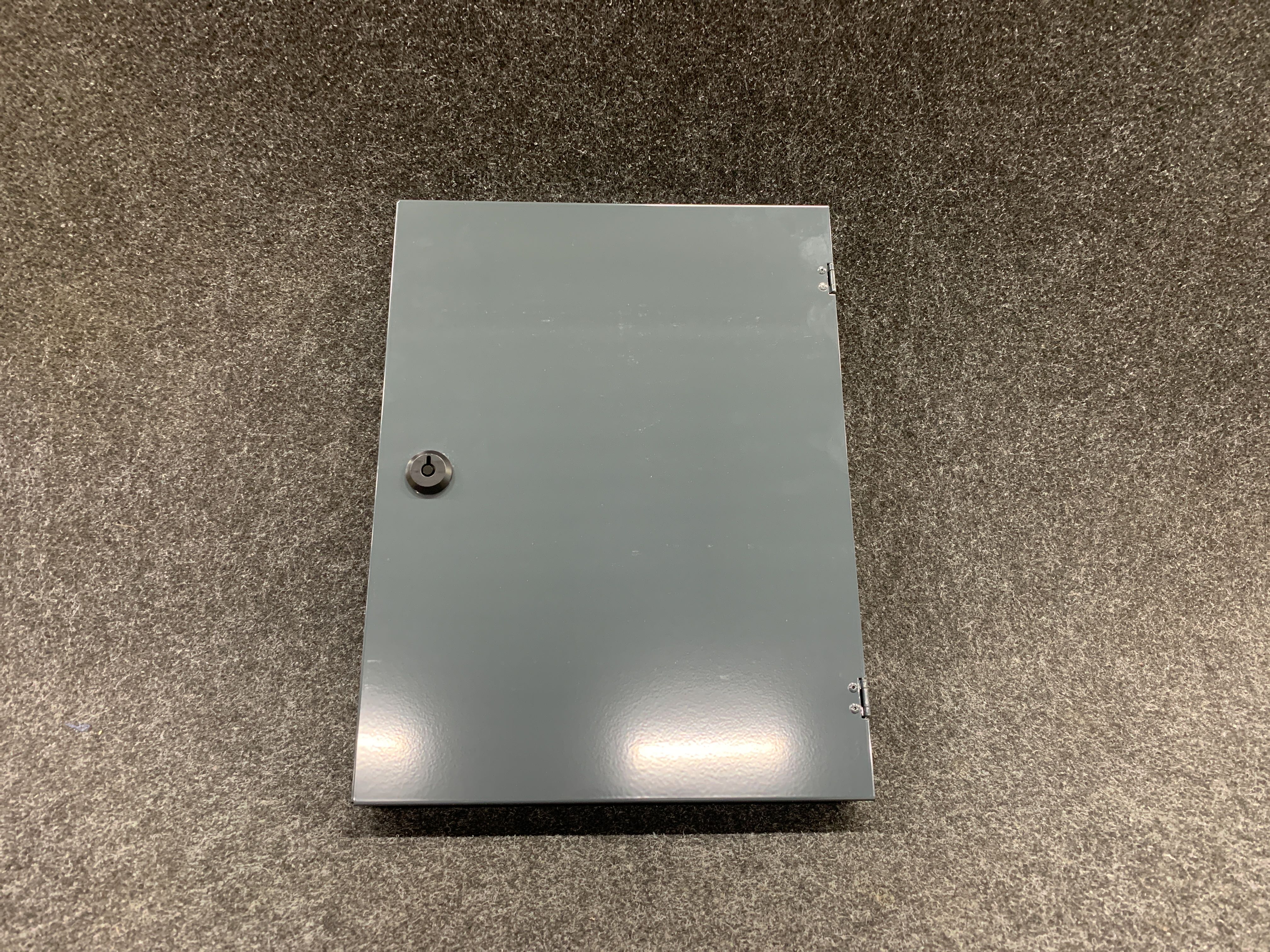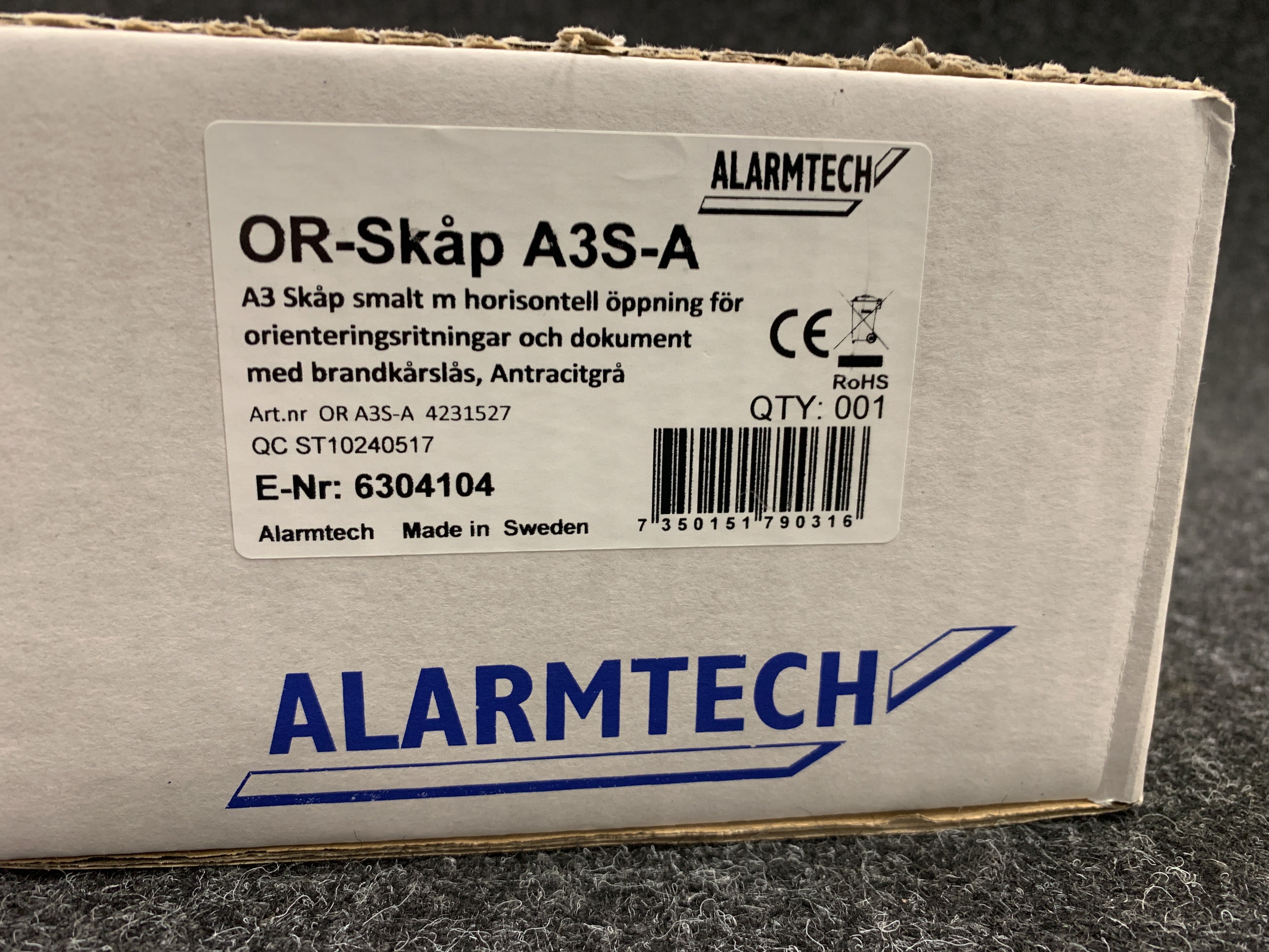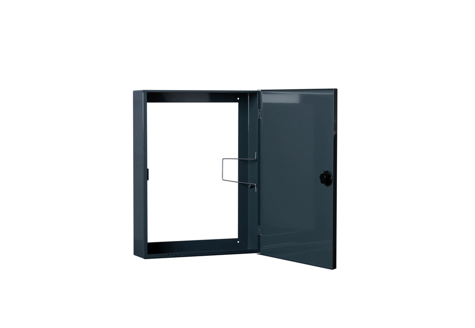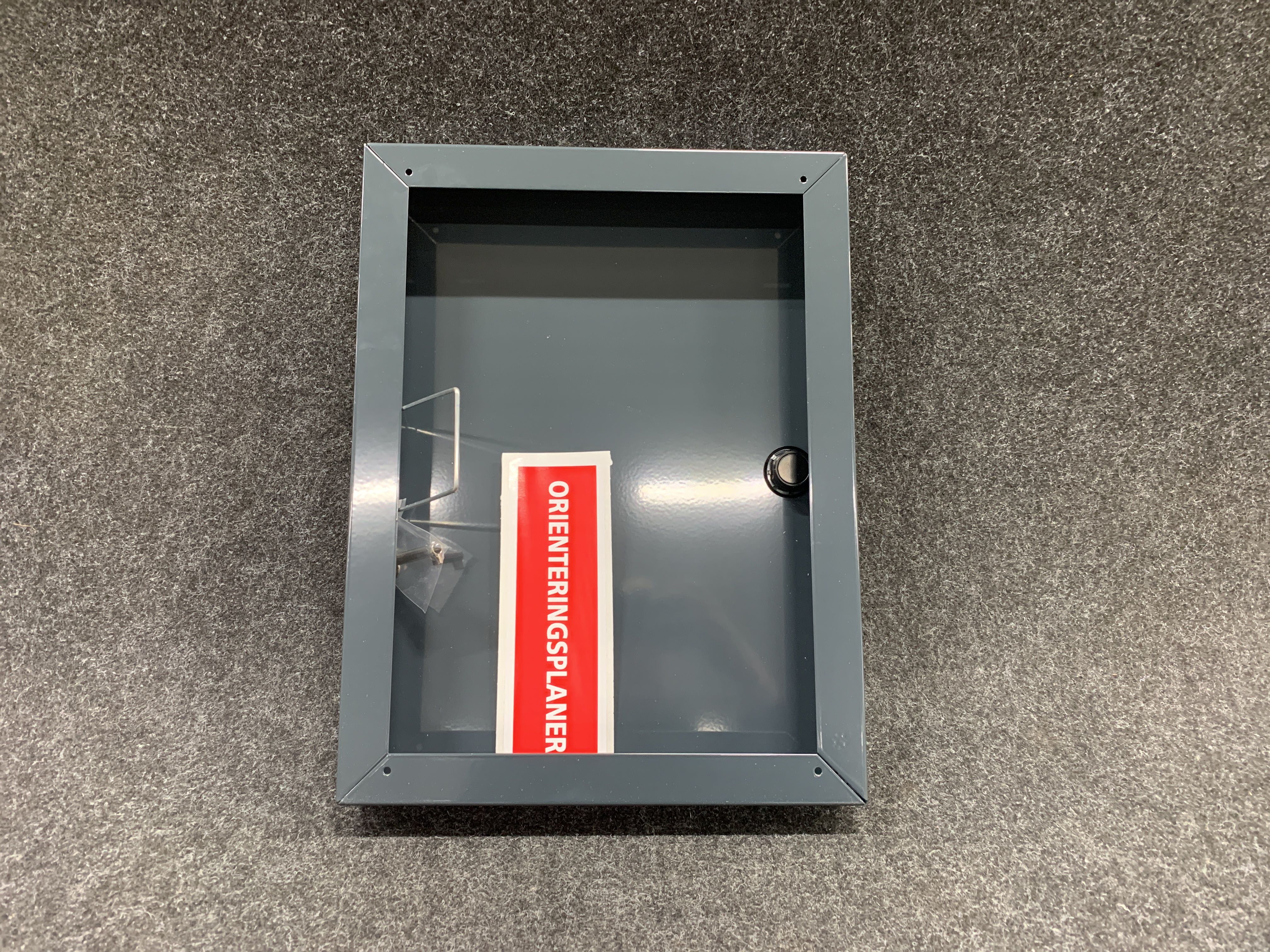 Skåp till brandlarmsanläggningar för orienterings- och serviceritningar, med öppen baksida för att dölja t.ex en manöverpanel eller kopplingsplint. Knock-out för kabel finns på ovansidan. Öppnas horisontellt med klämma för dokumenten. A3 format i antracit grå (mörkgrå) och 55mm djup. Inkluderar brandkårslås enligt SS3654:2016 och en nyckel samt etikett som kan fästas på skåpet med texten "Orienteringsritning för brandlarmsanläggning". Tillverkat i 1,5mm stålplåt, pulverlackerad.