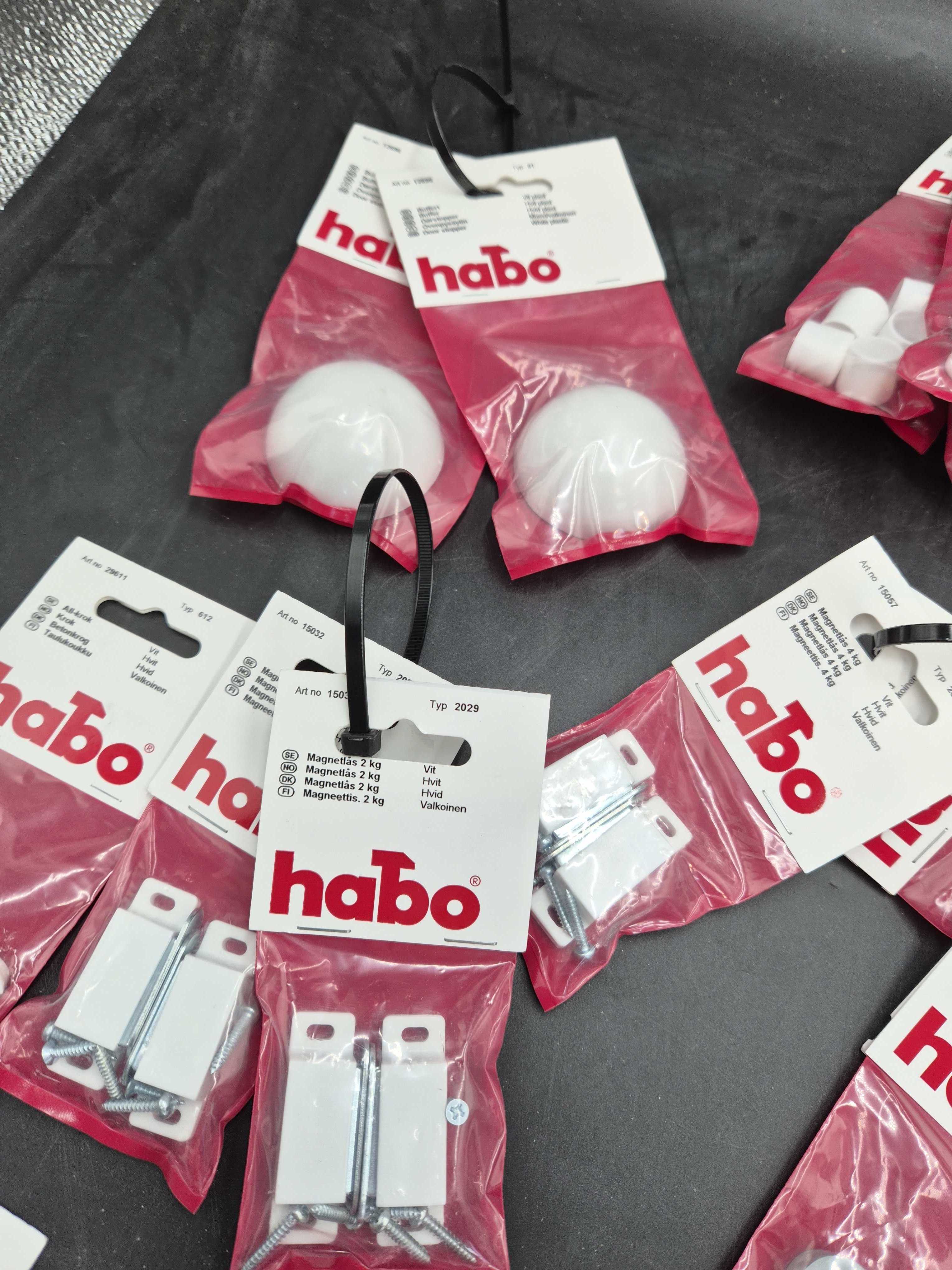 illbehör och detaljer från Habo för möbelmontage, dörrdämpning och väggskydd. Flera olika komponenter i plast och metall för praktisk användning i hem och offentliga miljöer.