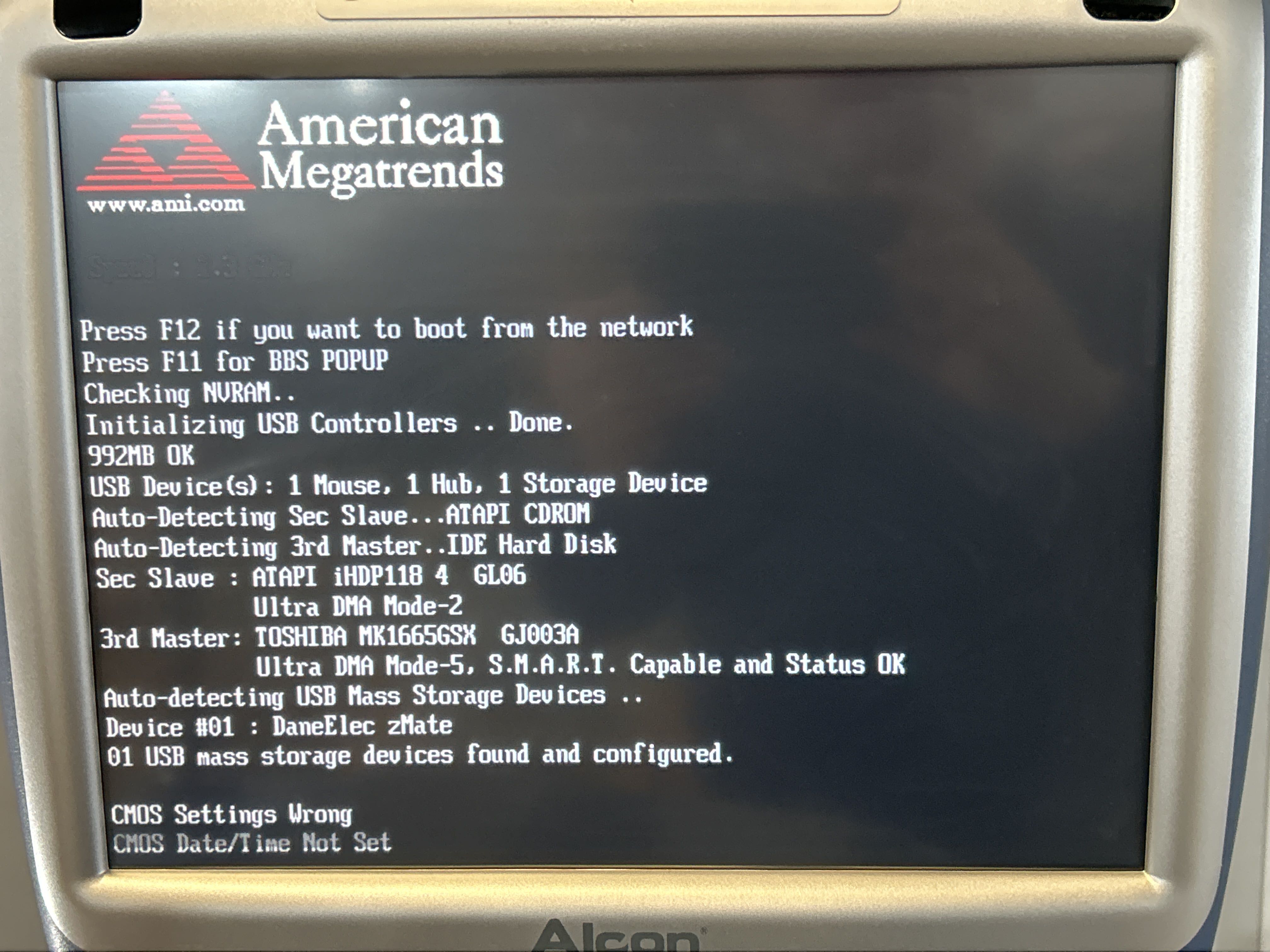 Displaybilder visar system- och mjukvaruinformation vid uppstart.