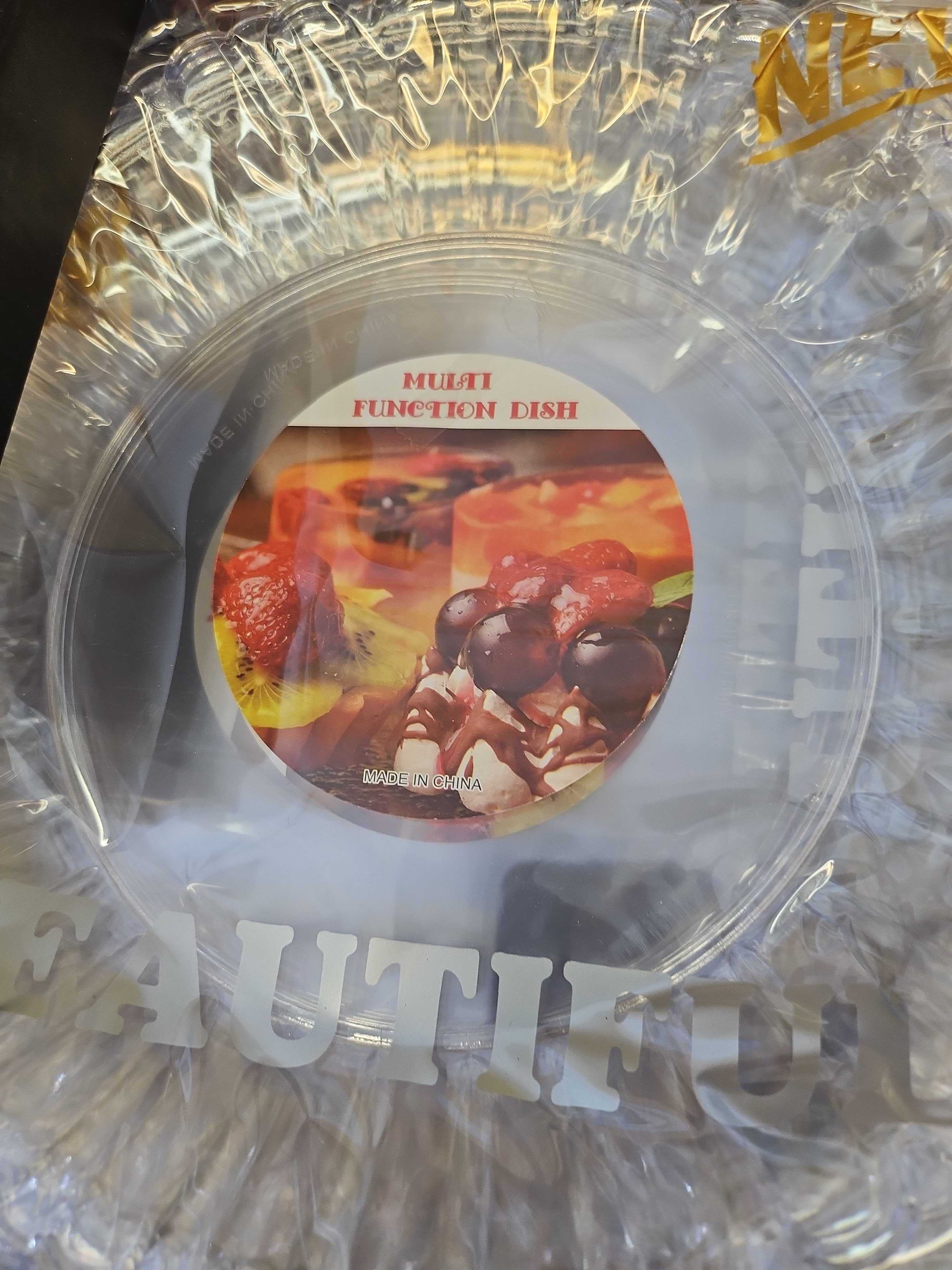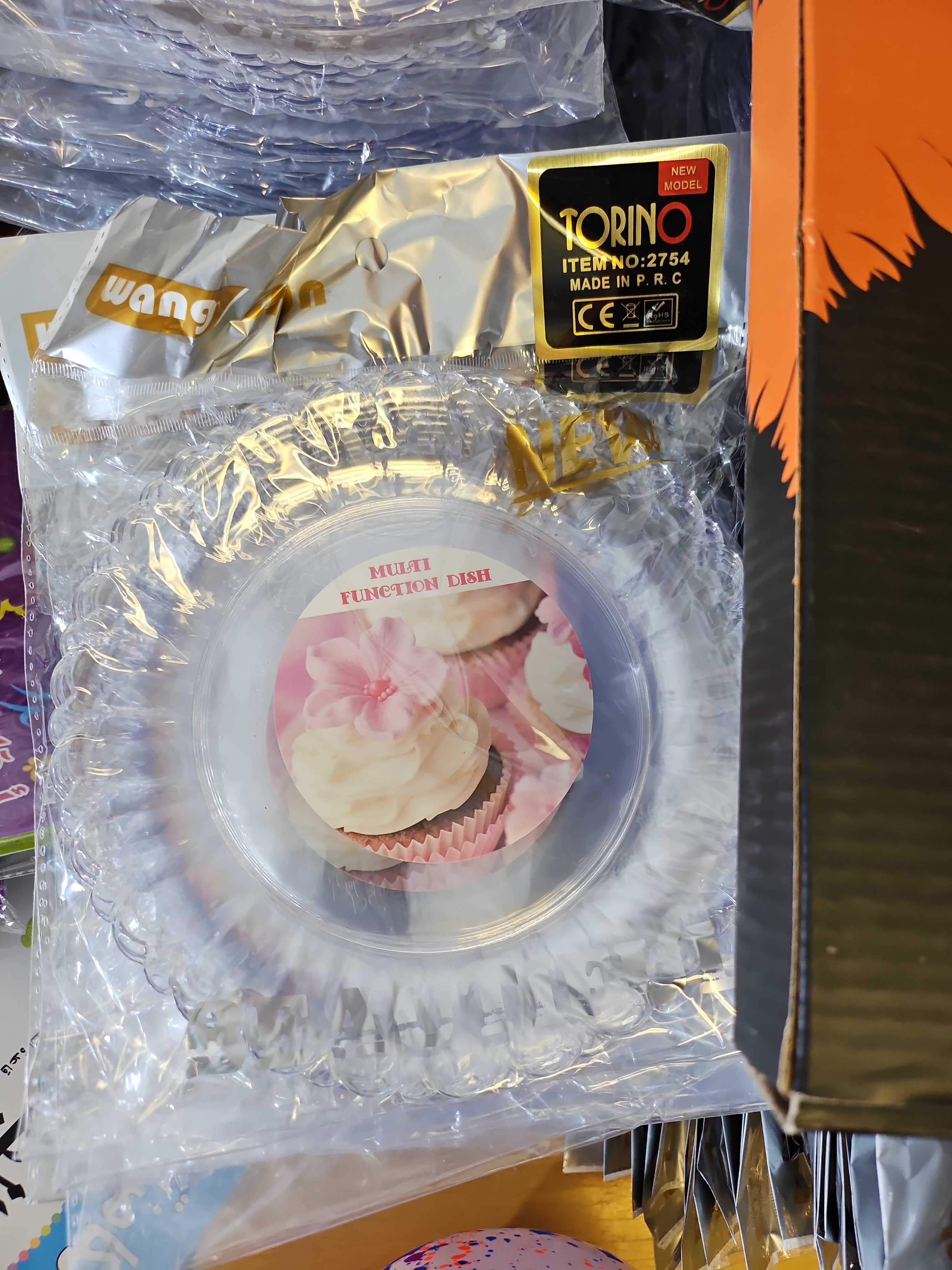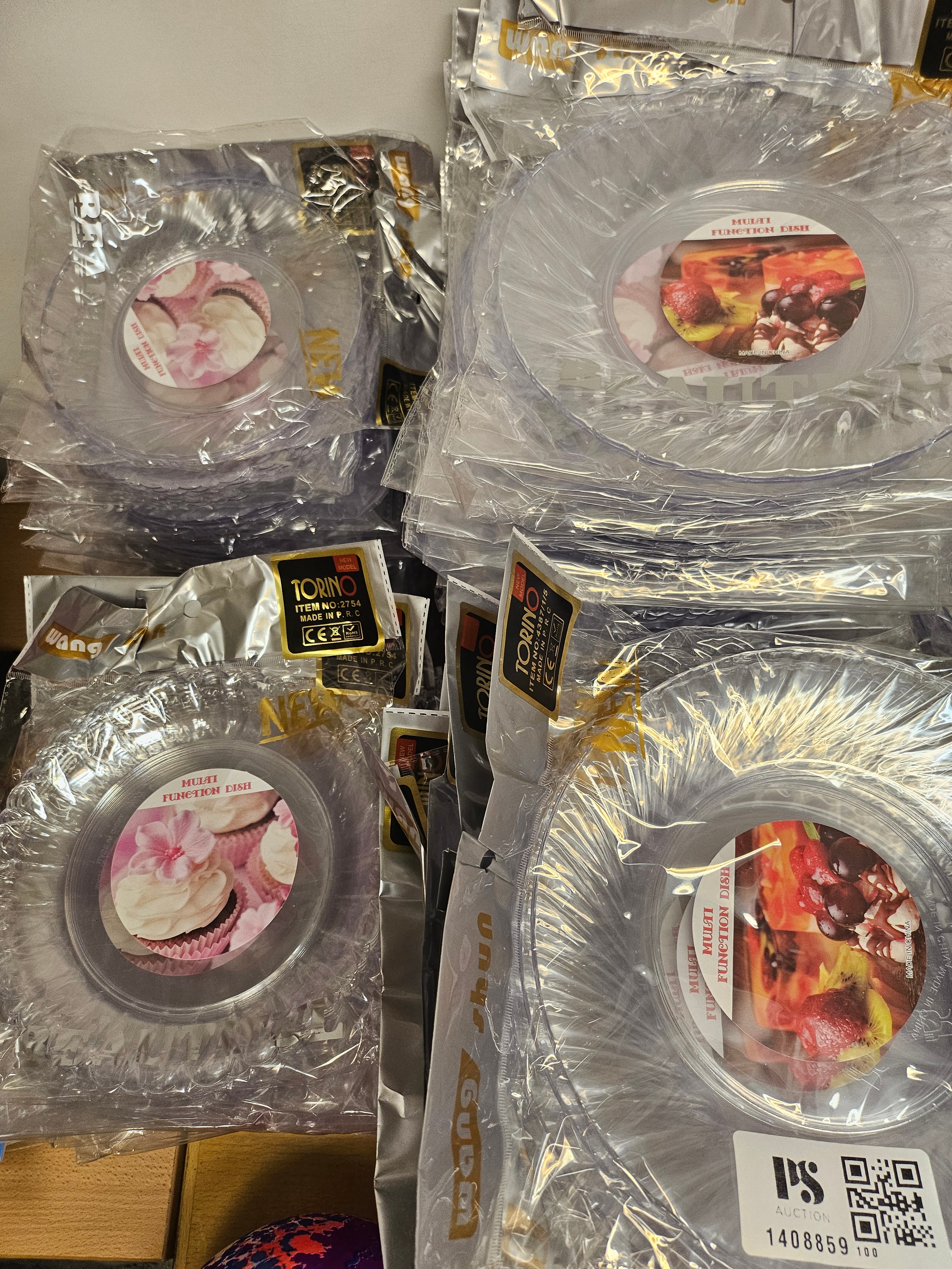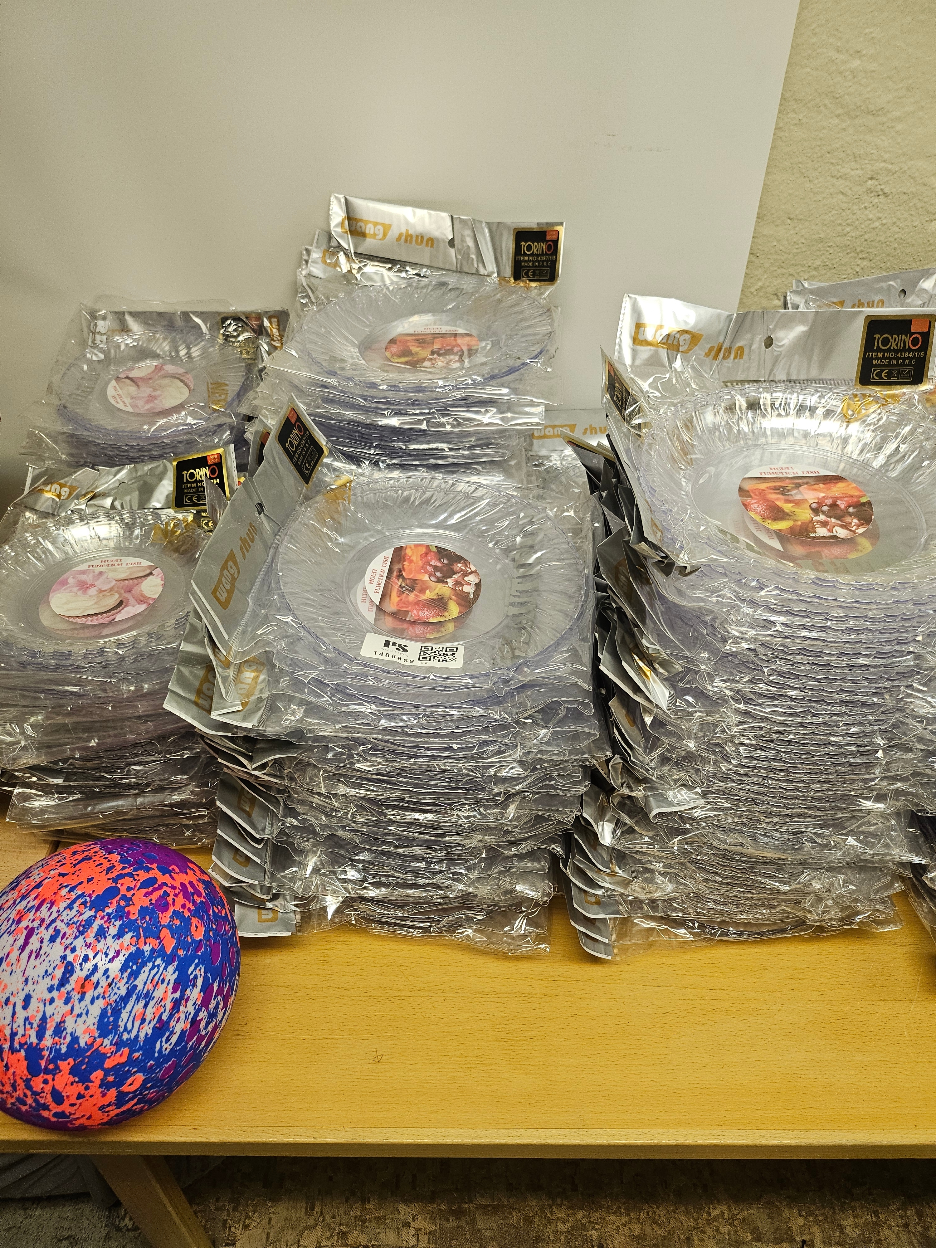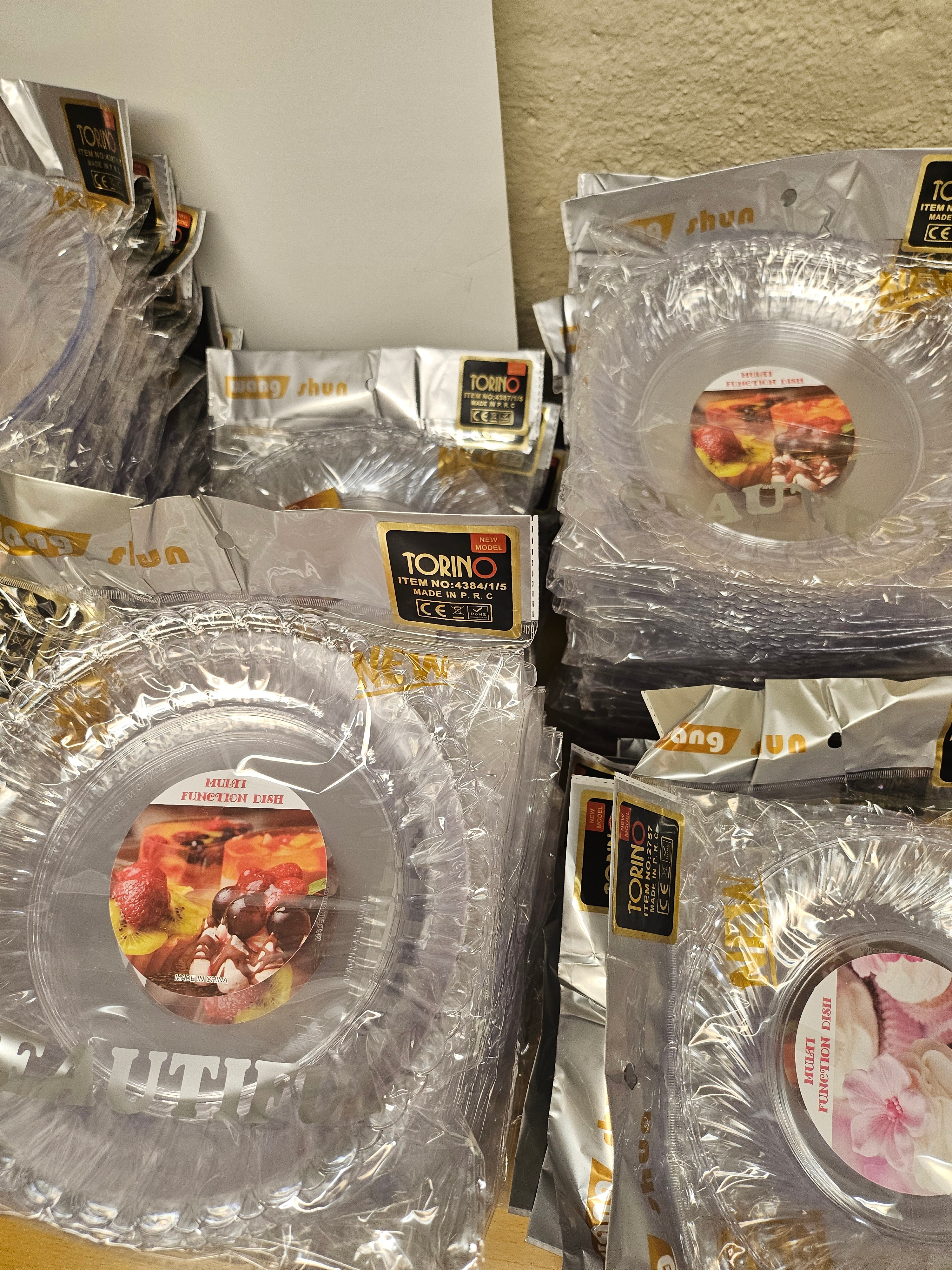 Ett större parti med transparenta engångstallrikar i plast, förpackade i buntar. Tallrikarna har rund form.