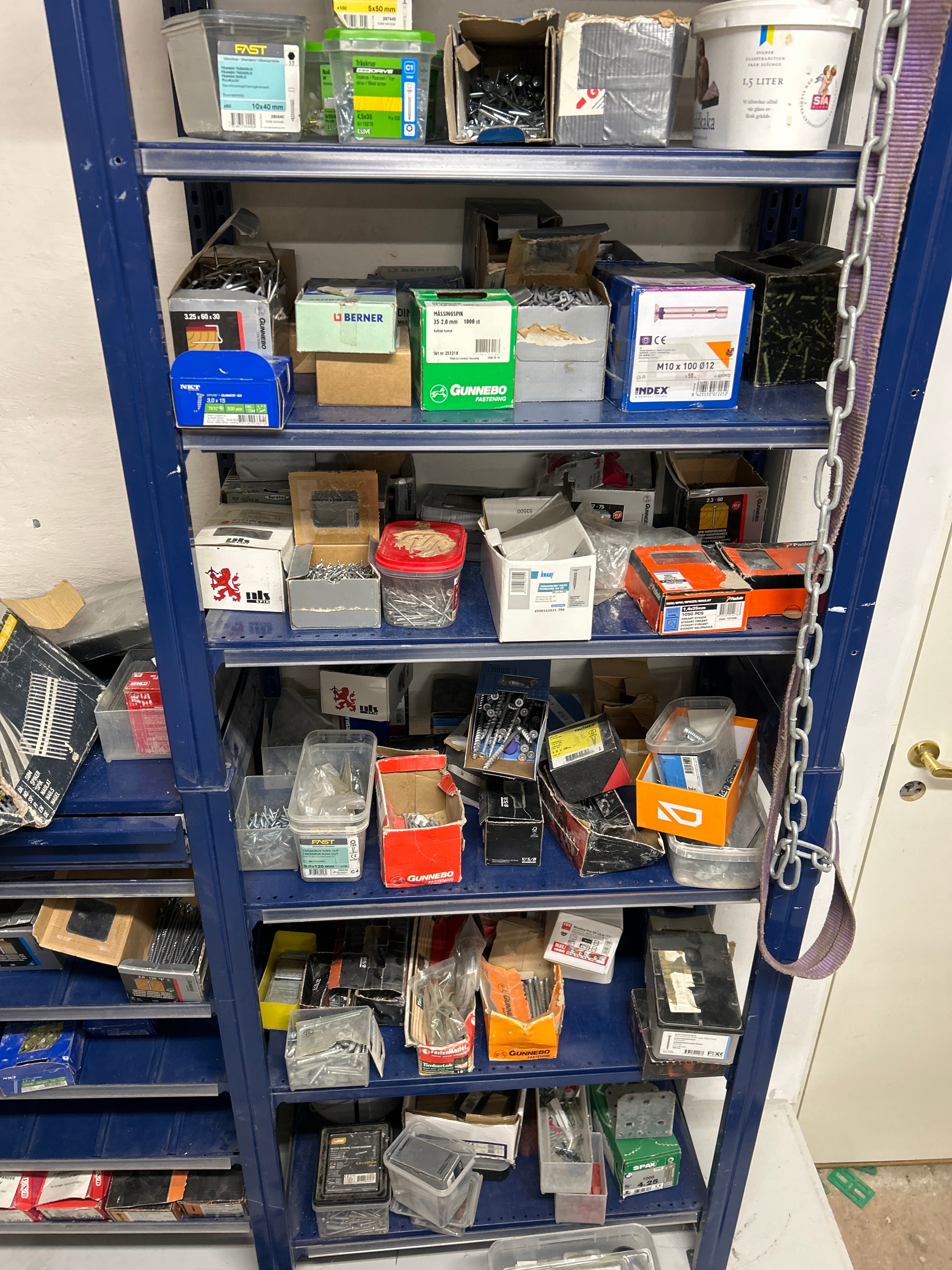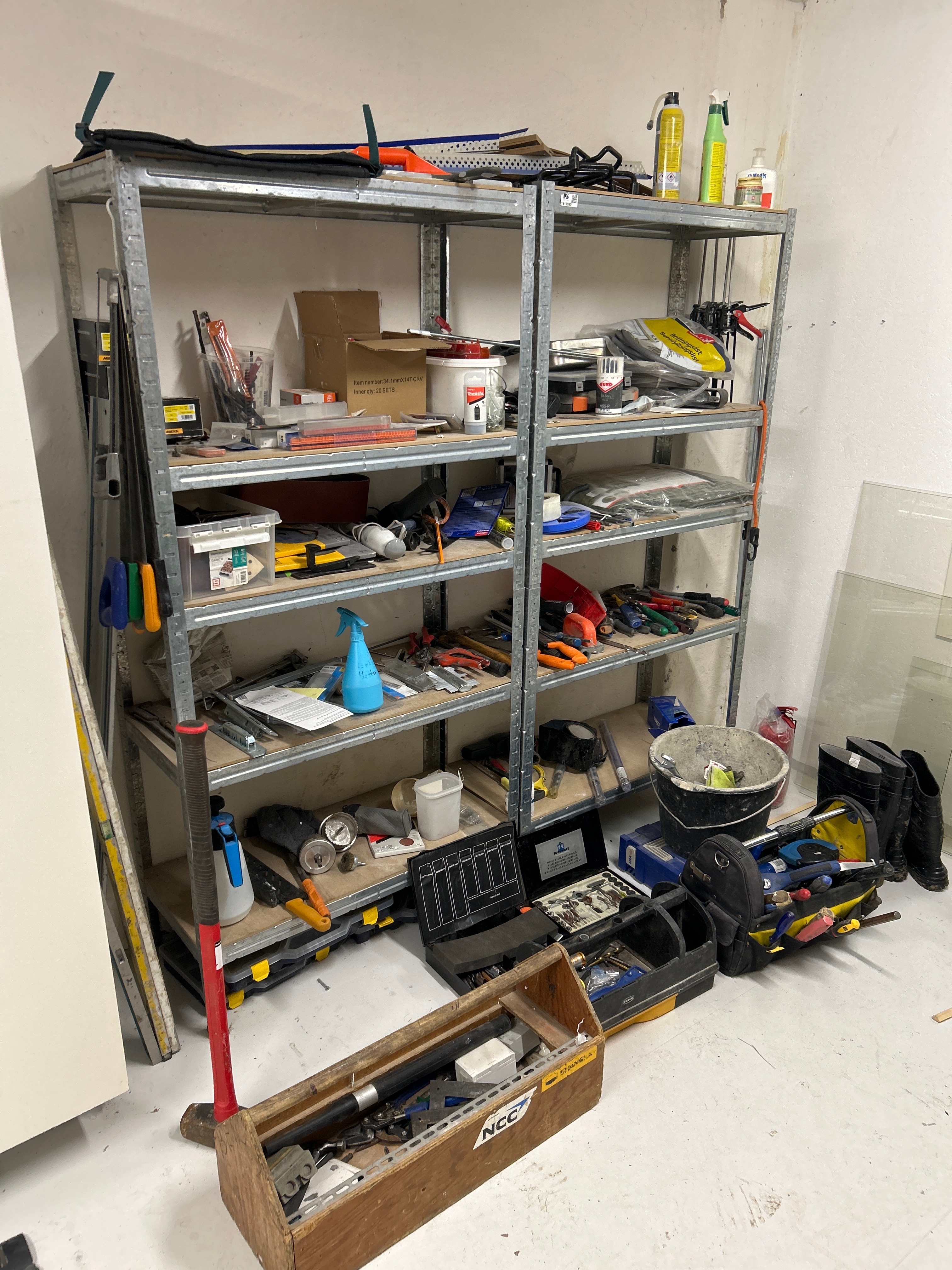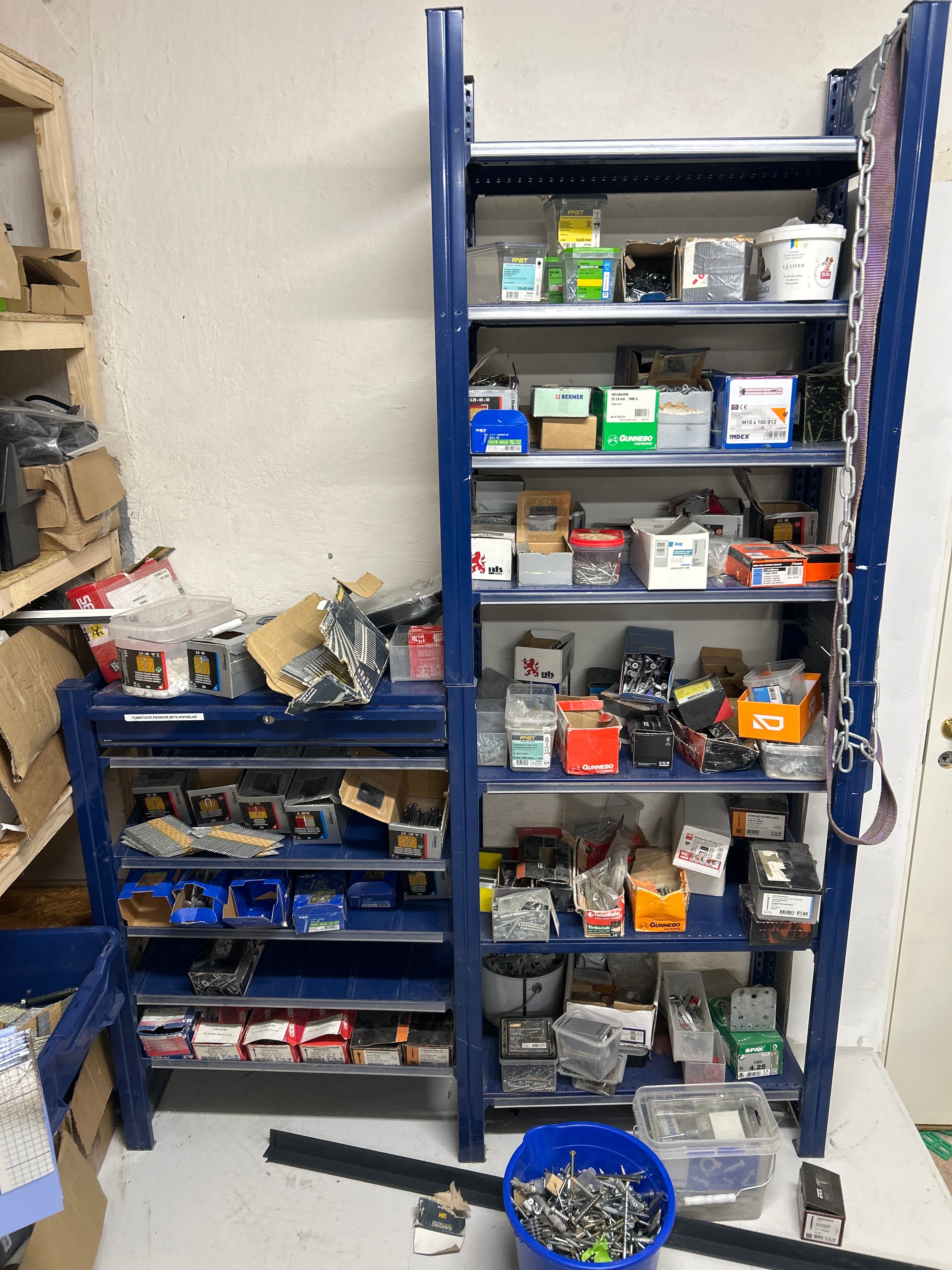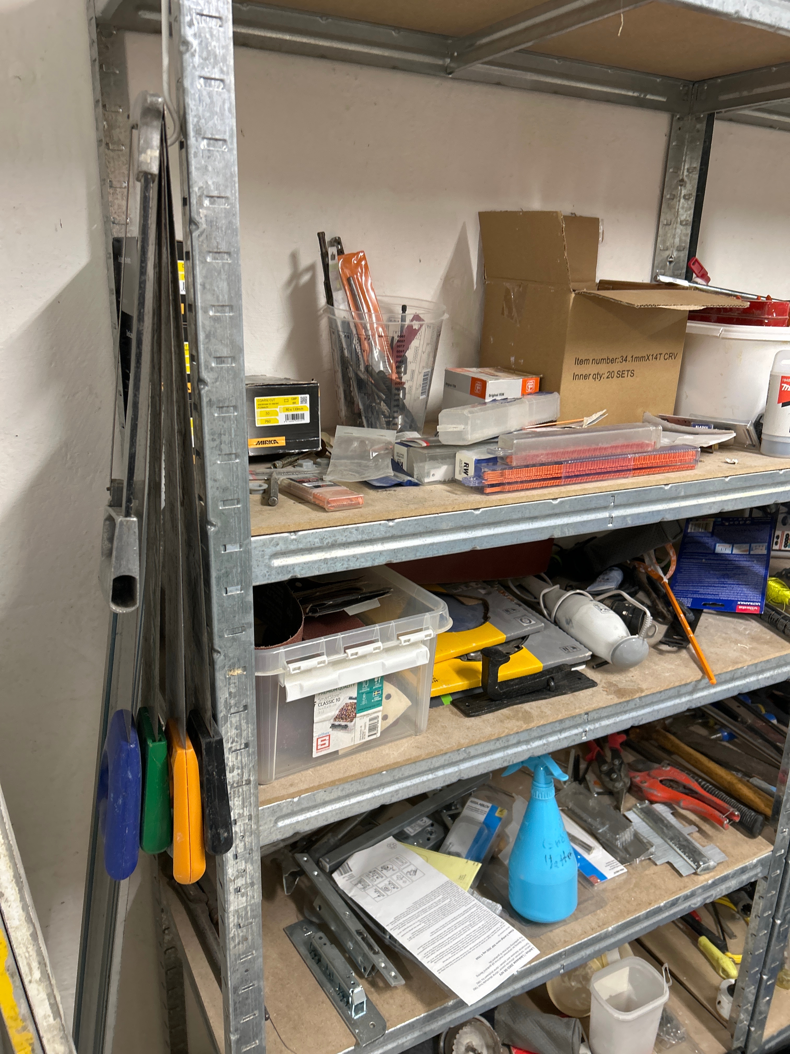 Parti med handverktyg, infästningsmaterial och lagerhyllor m.m