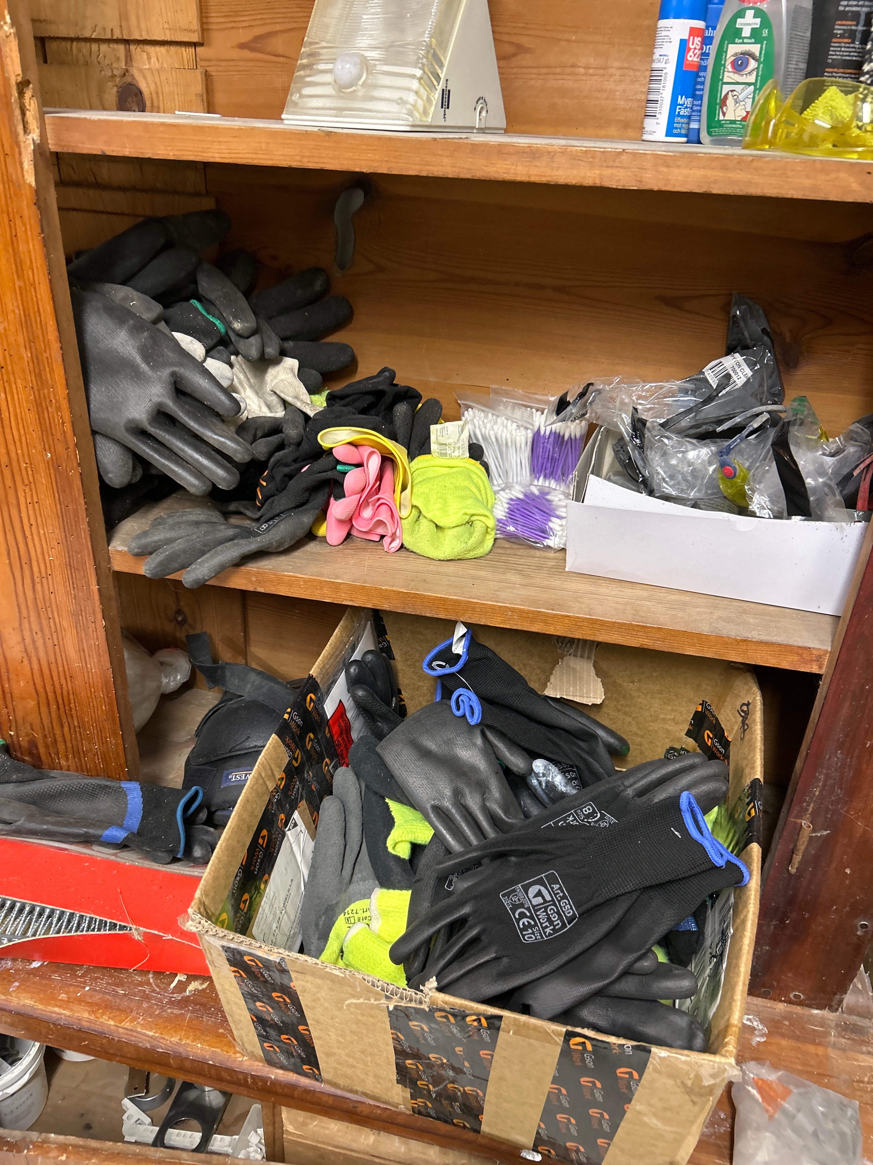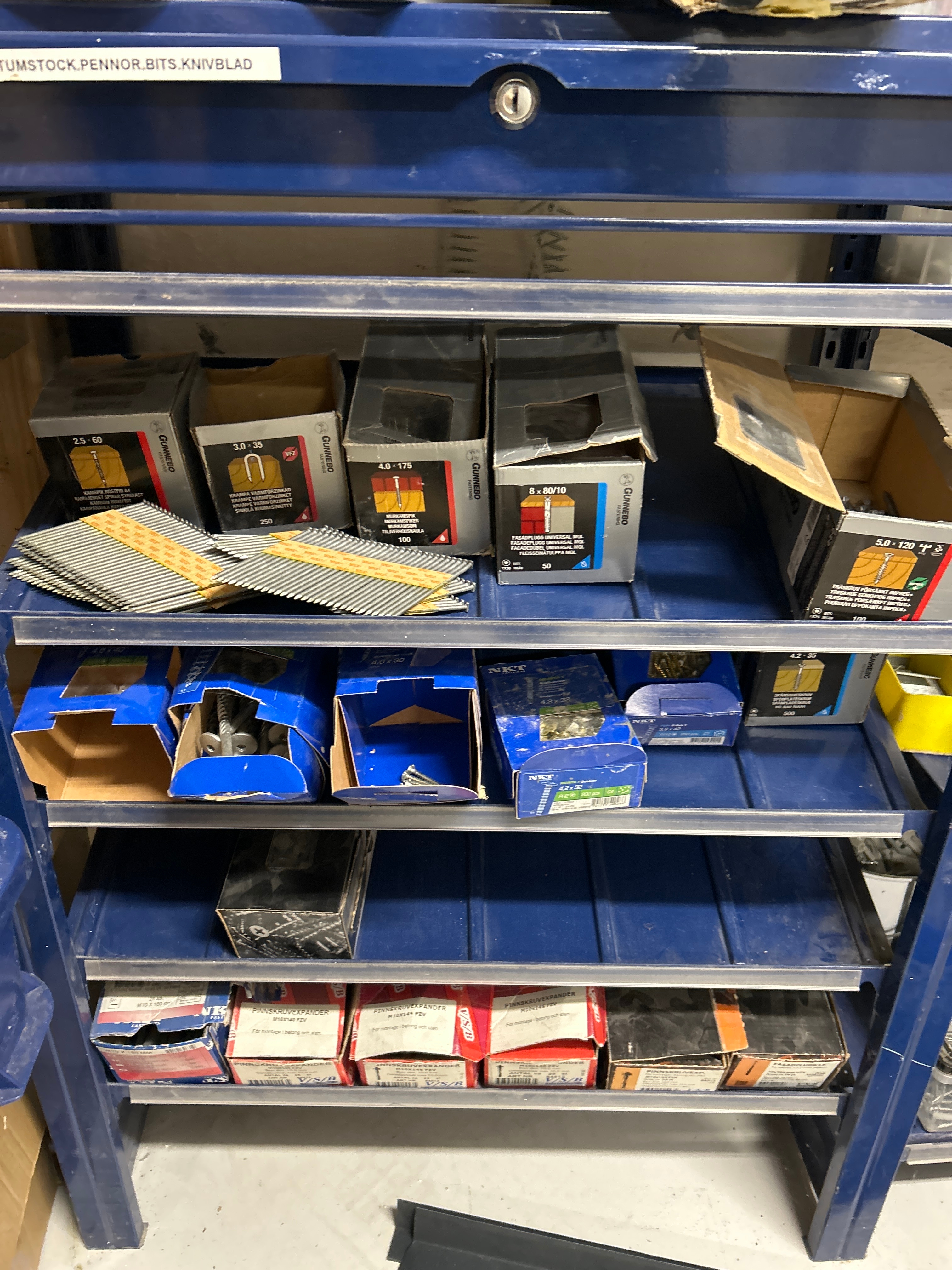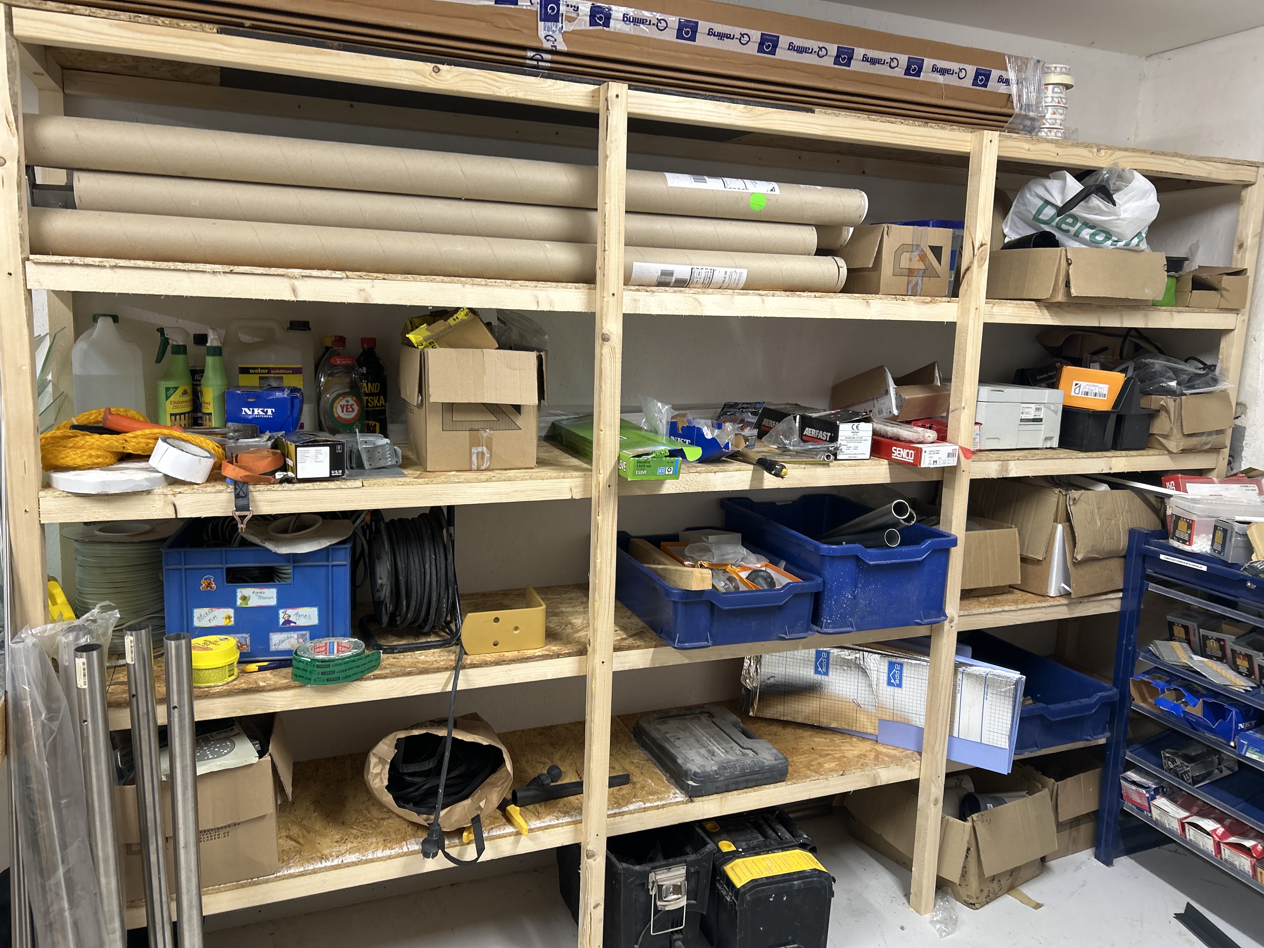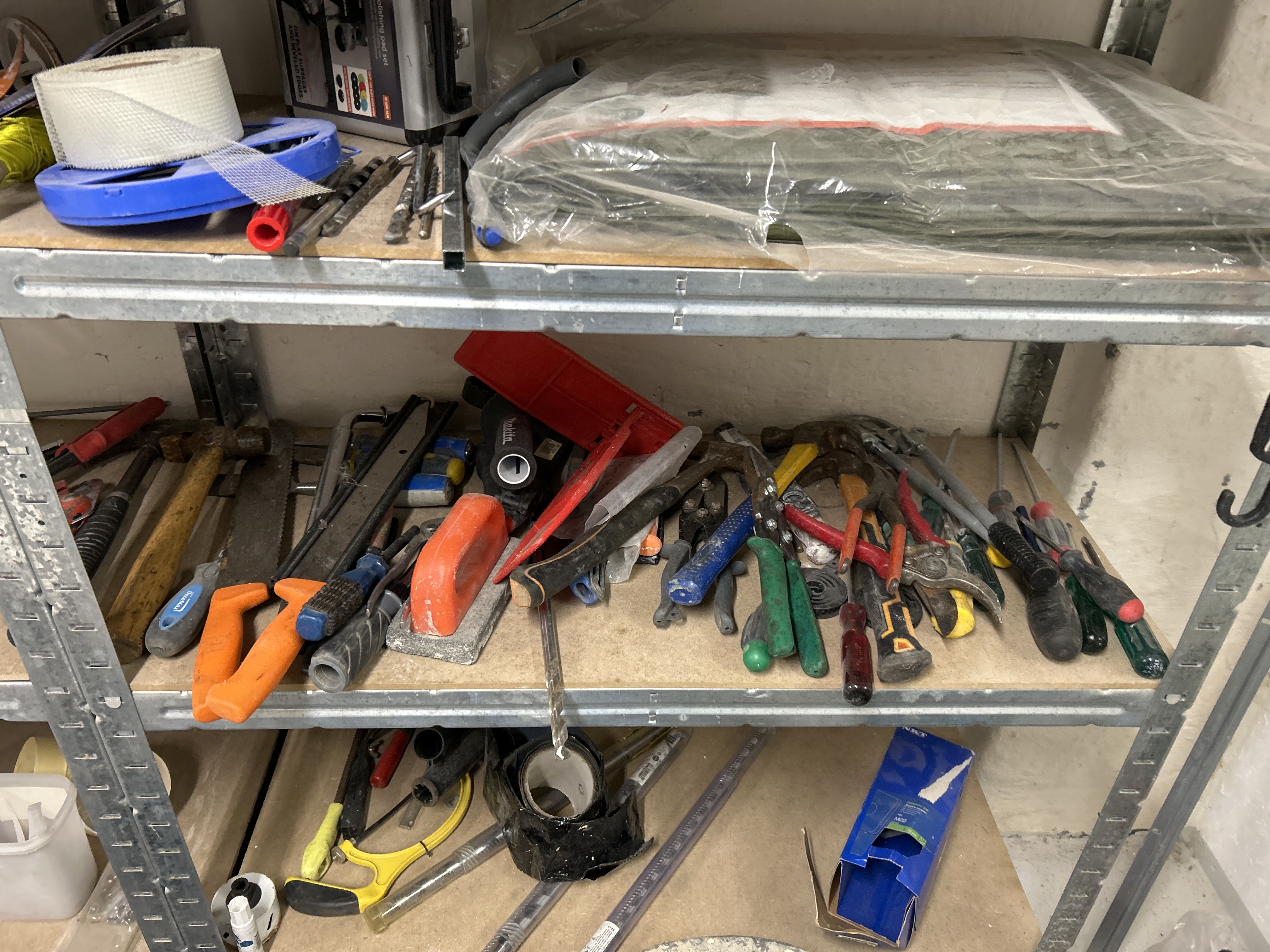 Parti med handverktyg, infästningsmaterial och lagerhyllor m.m