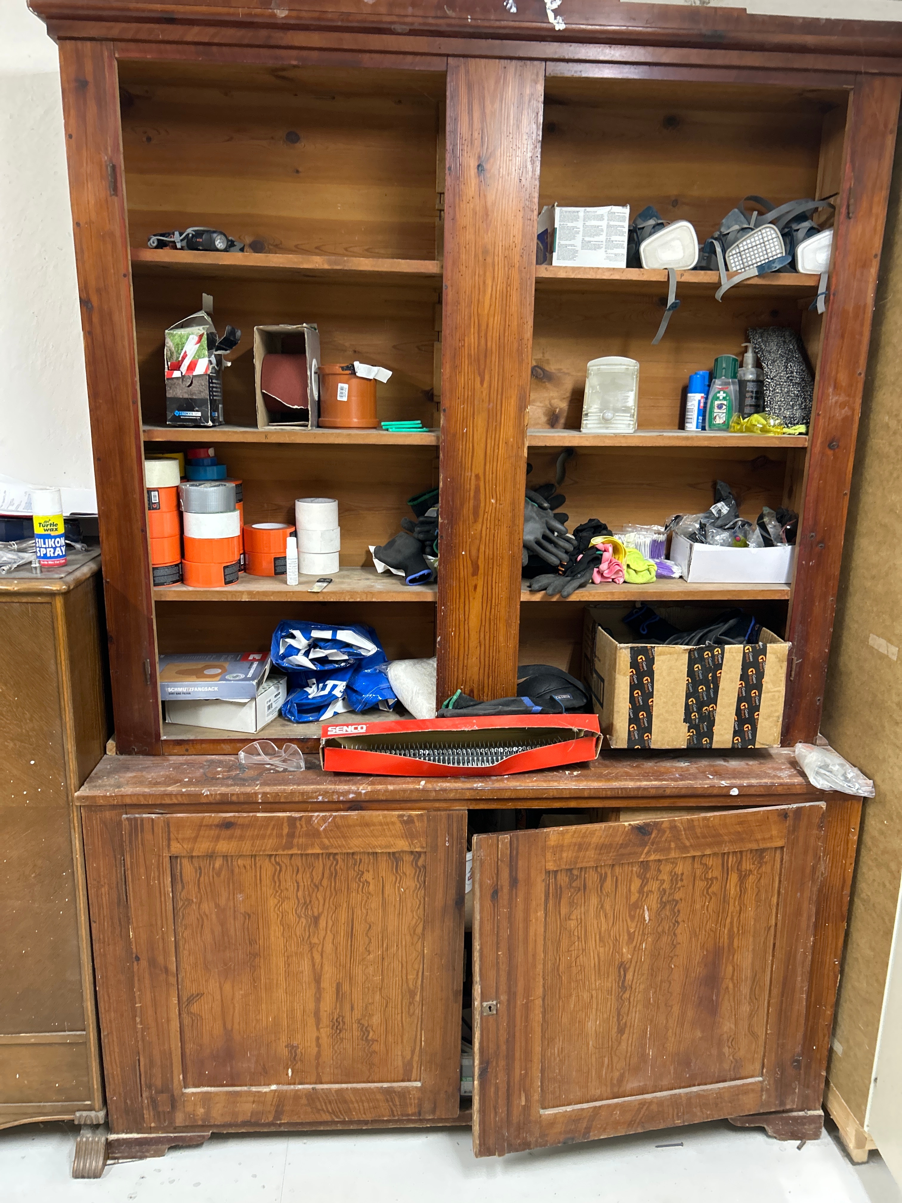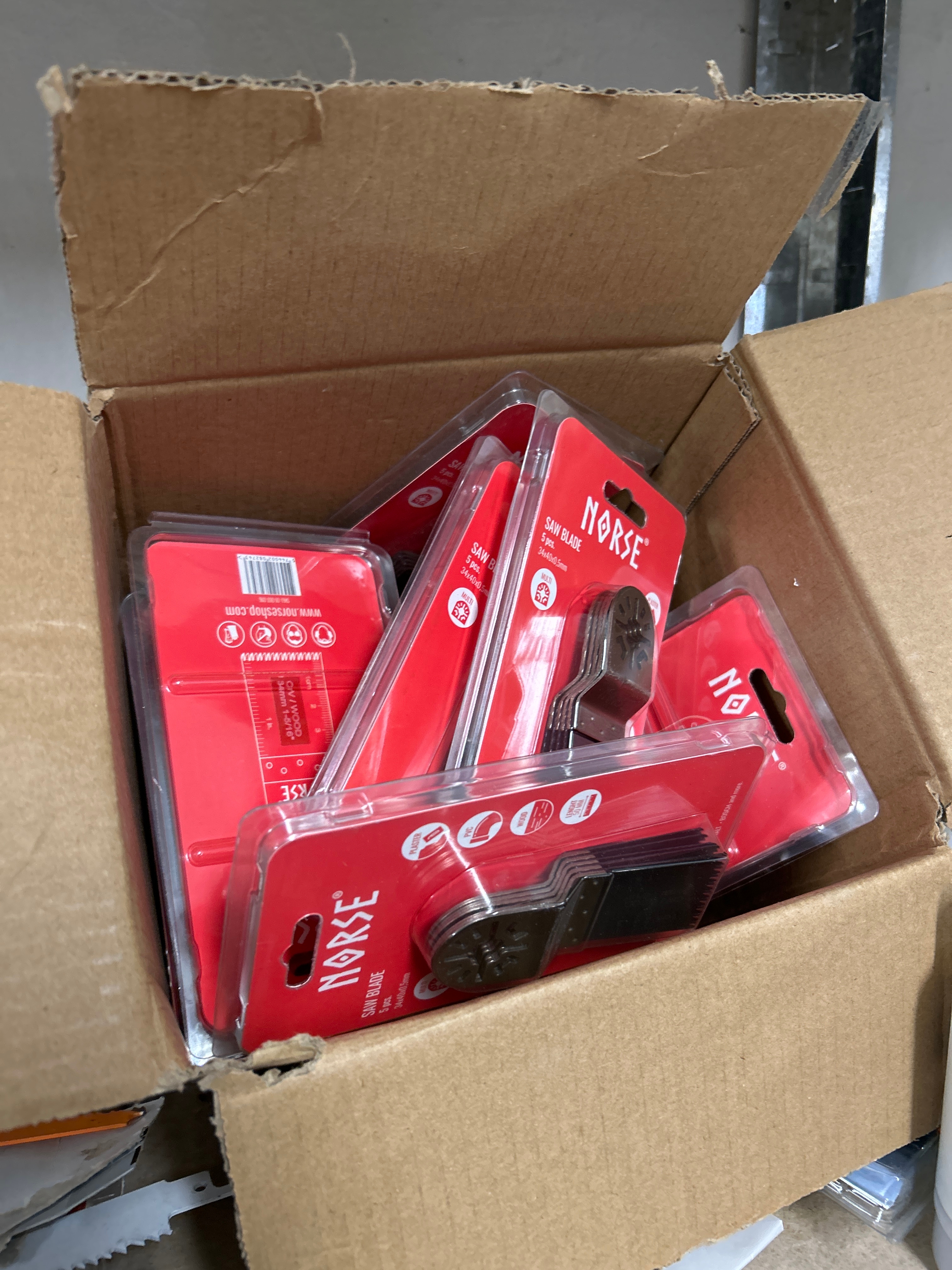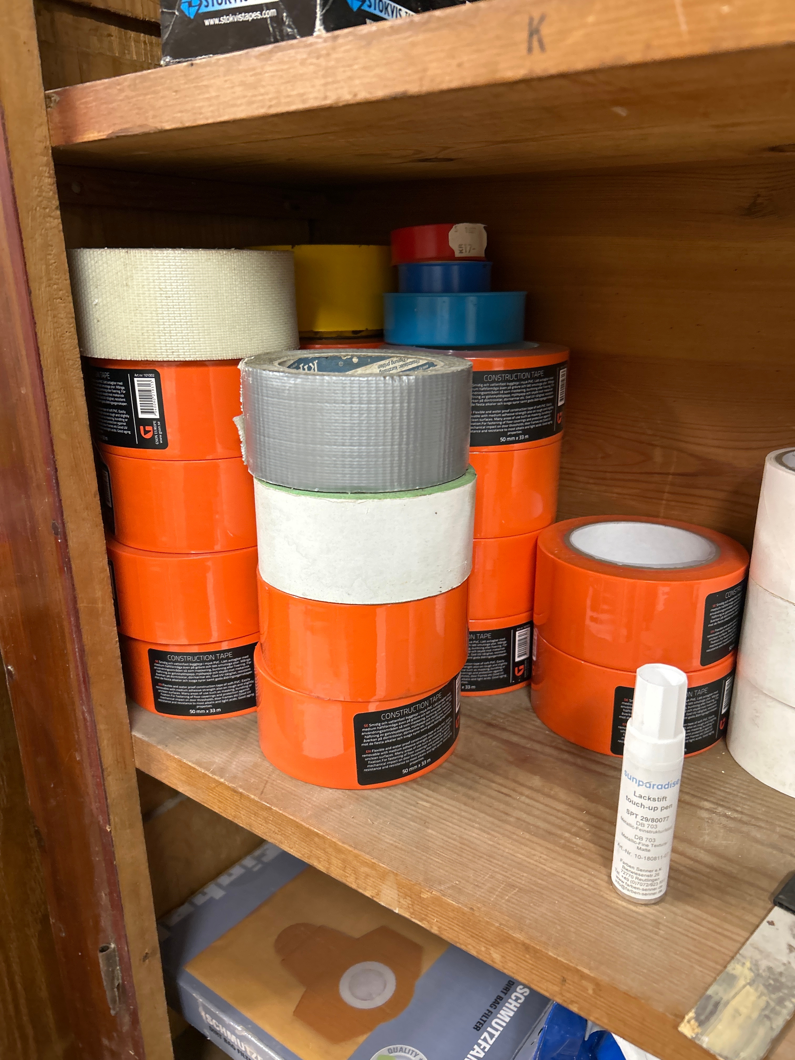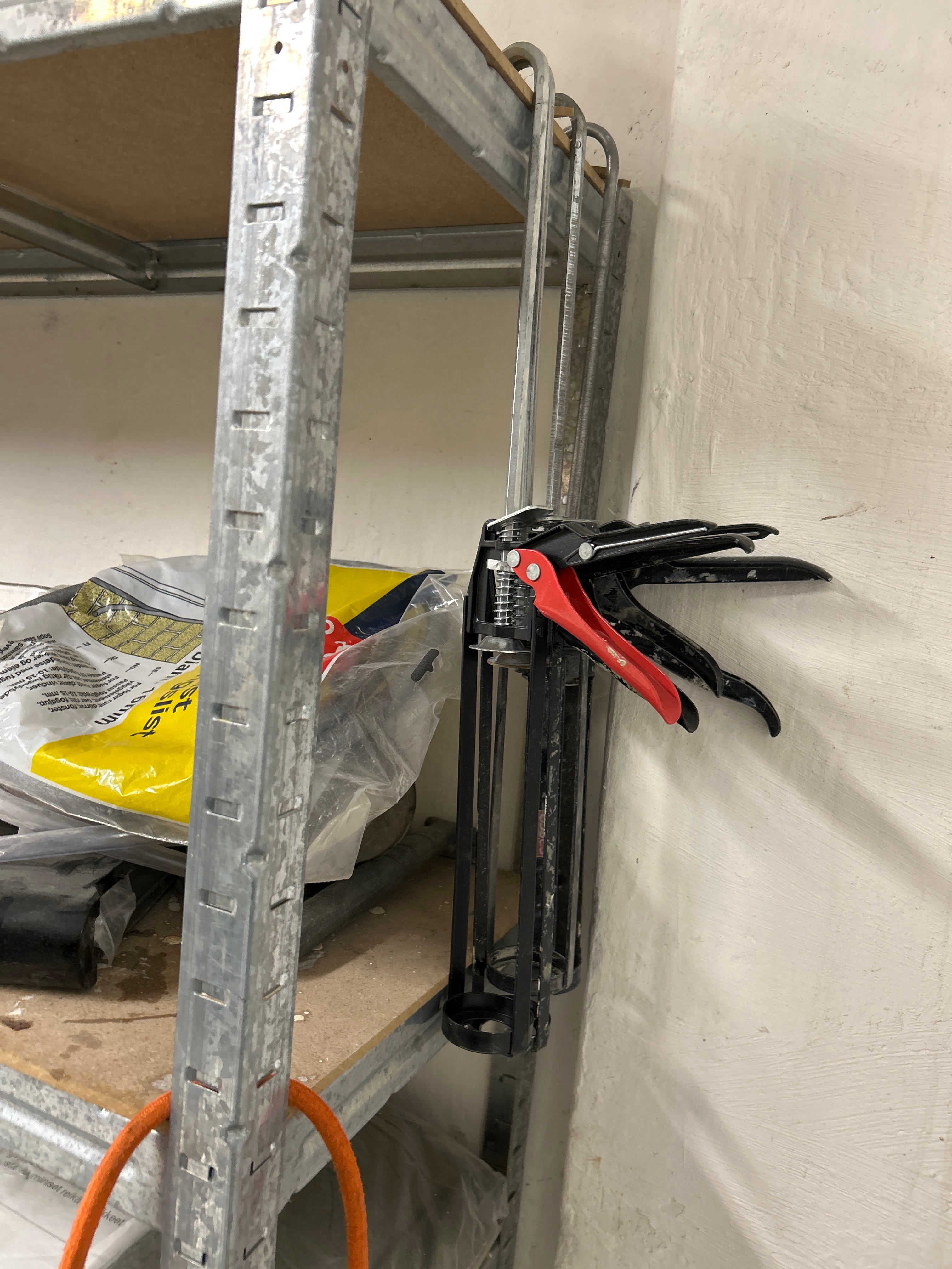 Parti med handverktyg, infästningsmaterial och lagerhyllor m.m