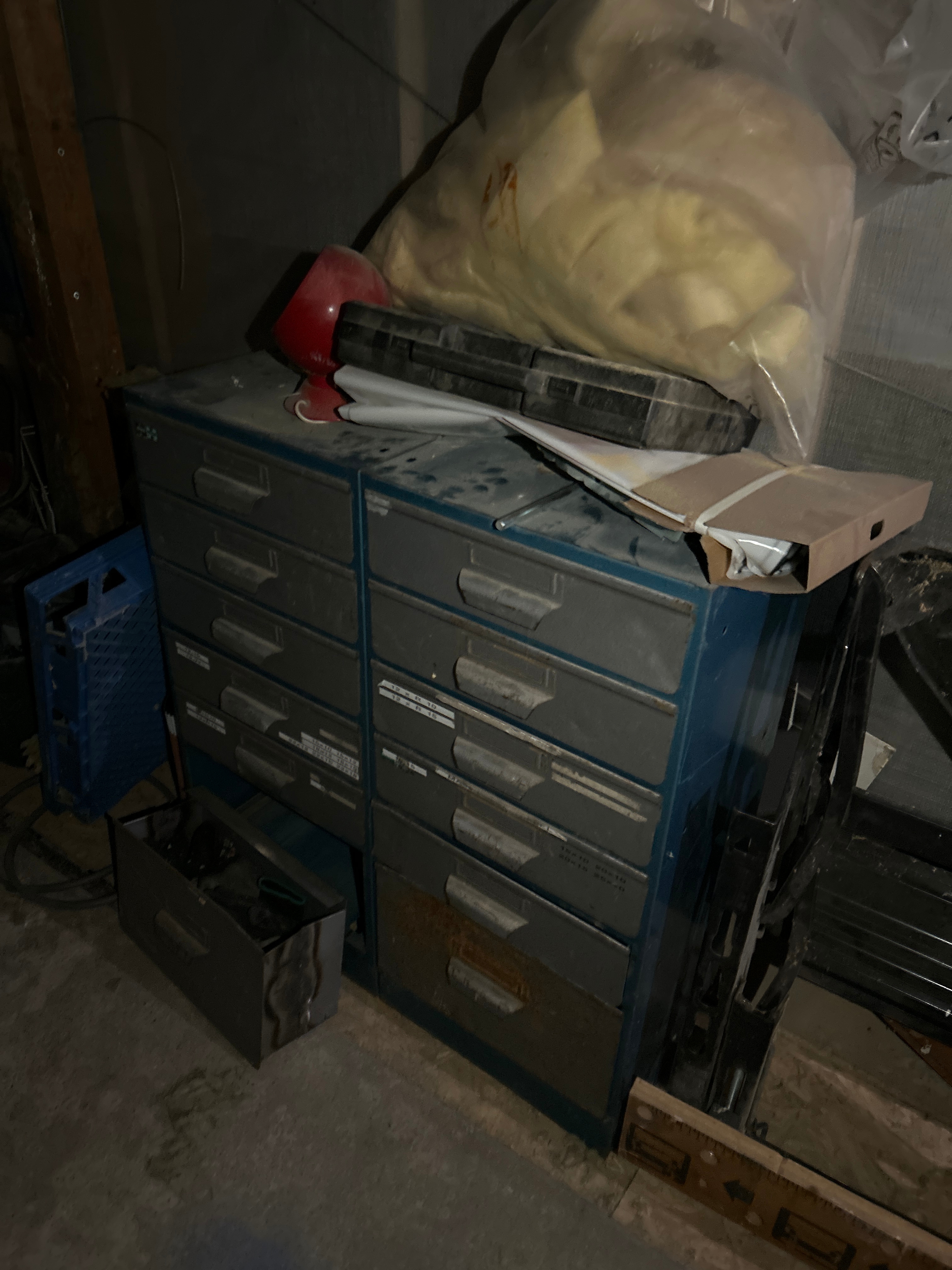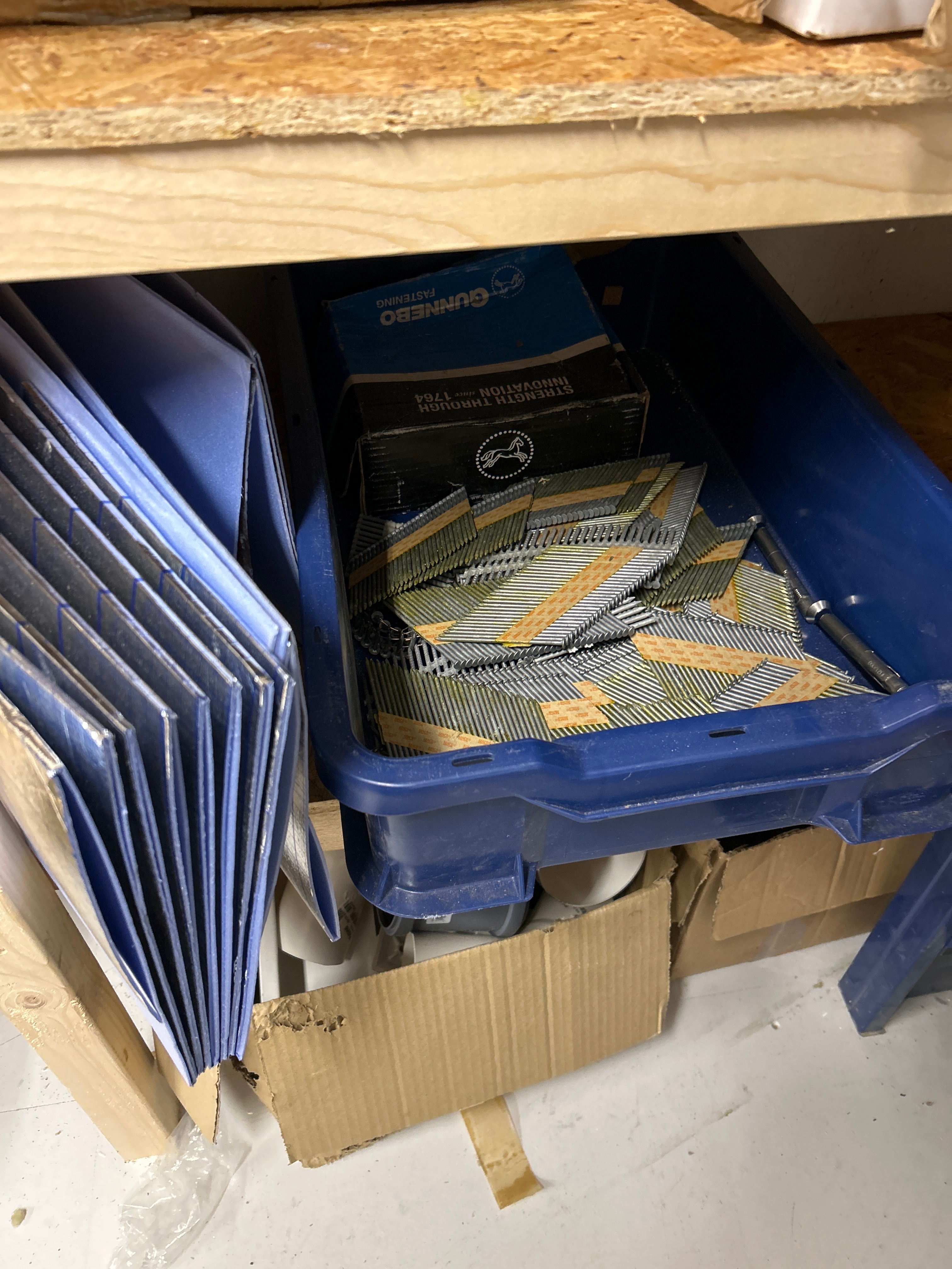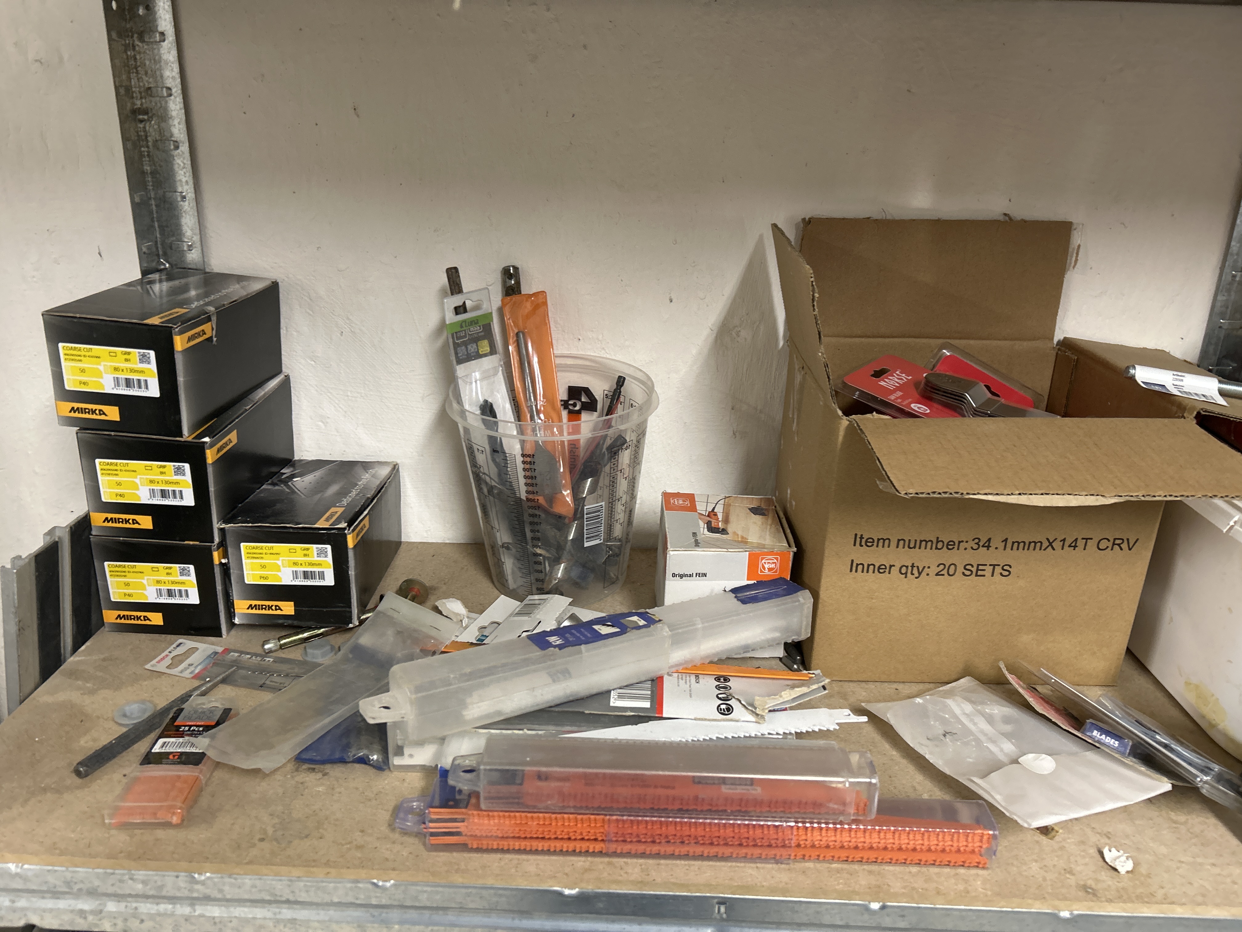 Parti med verkstads- och byggrelaterat material, inklusive verktyg, fästelement och förvaringshyllor.