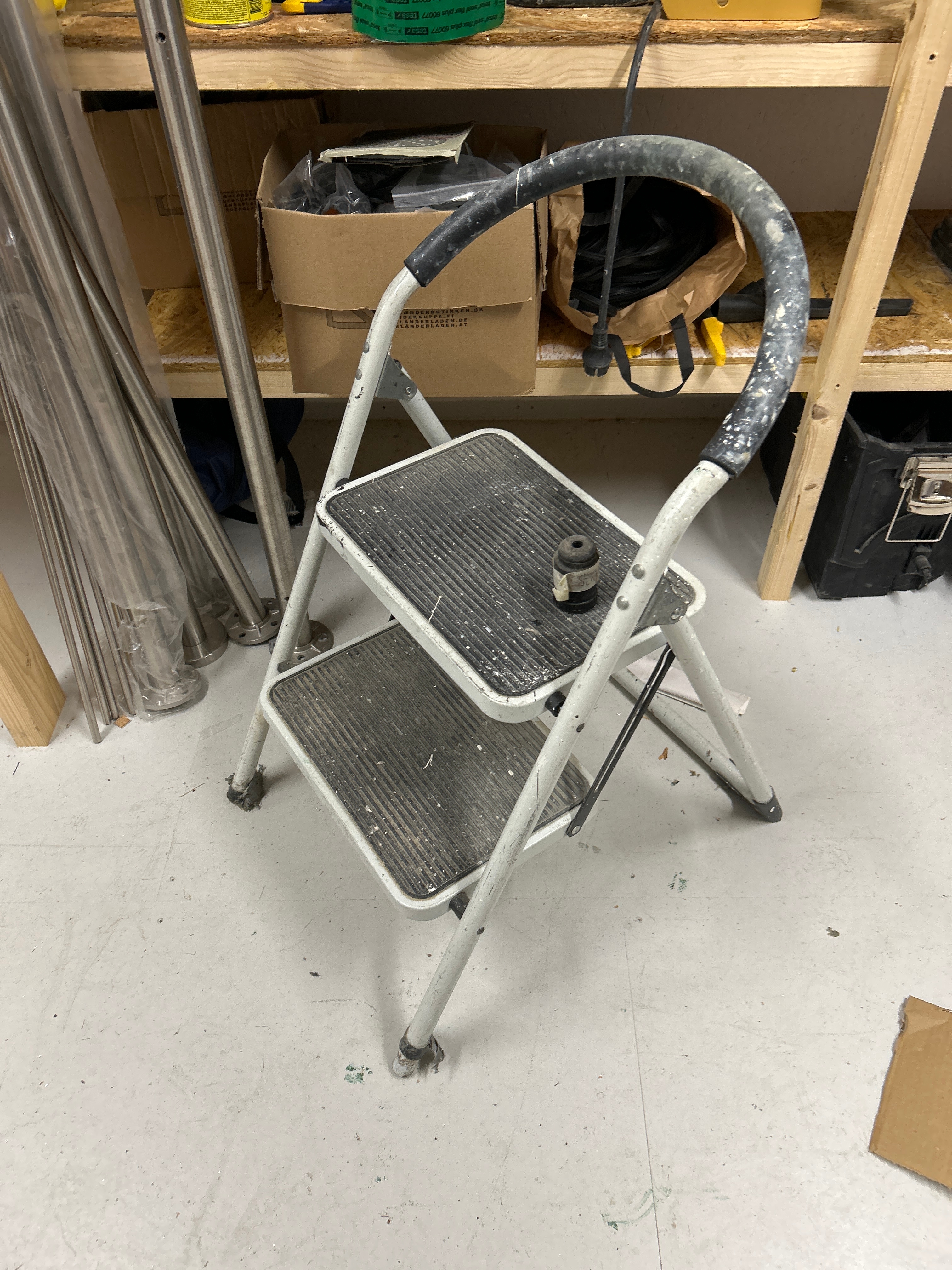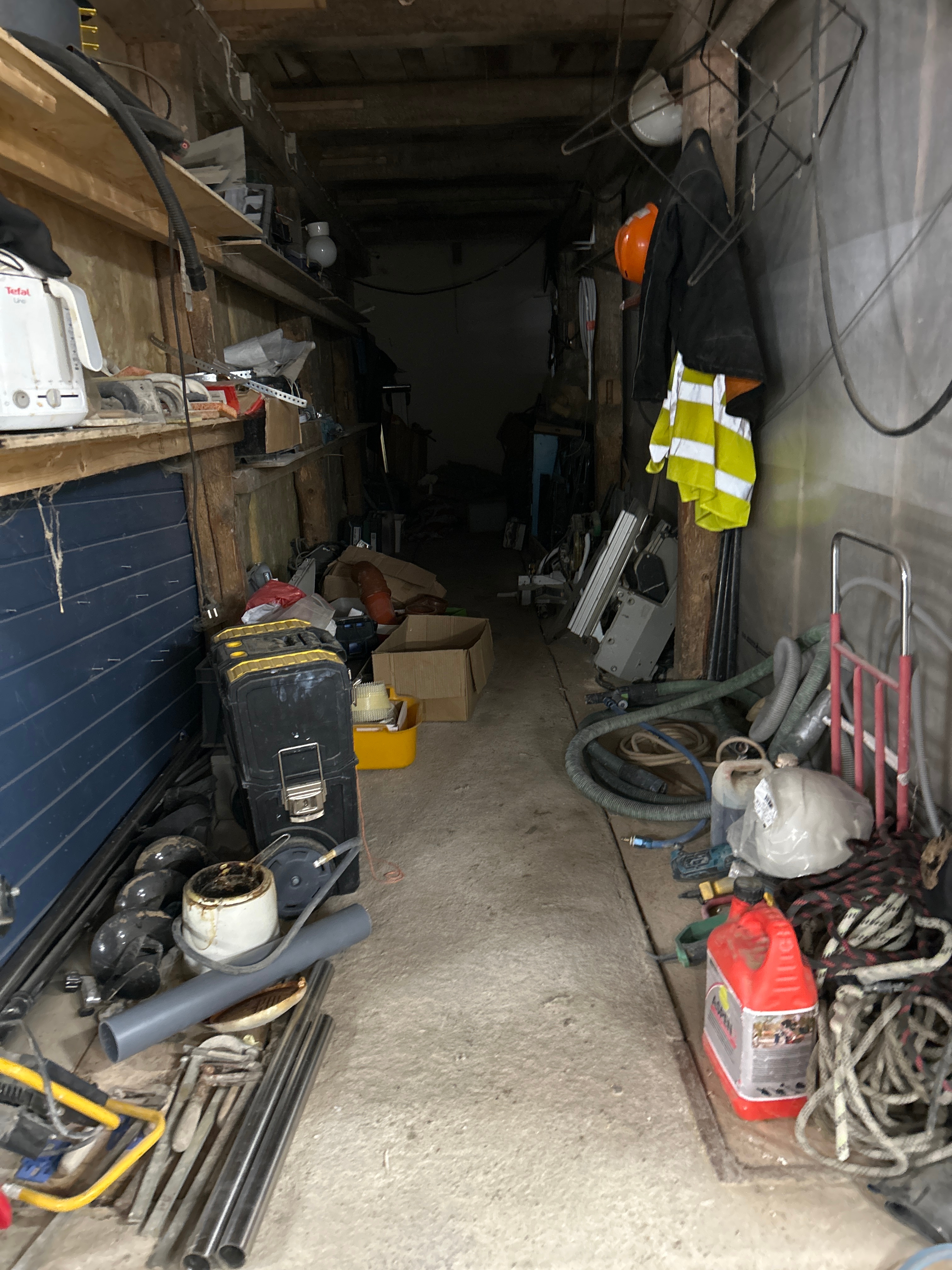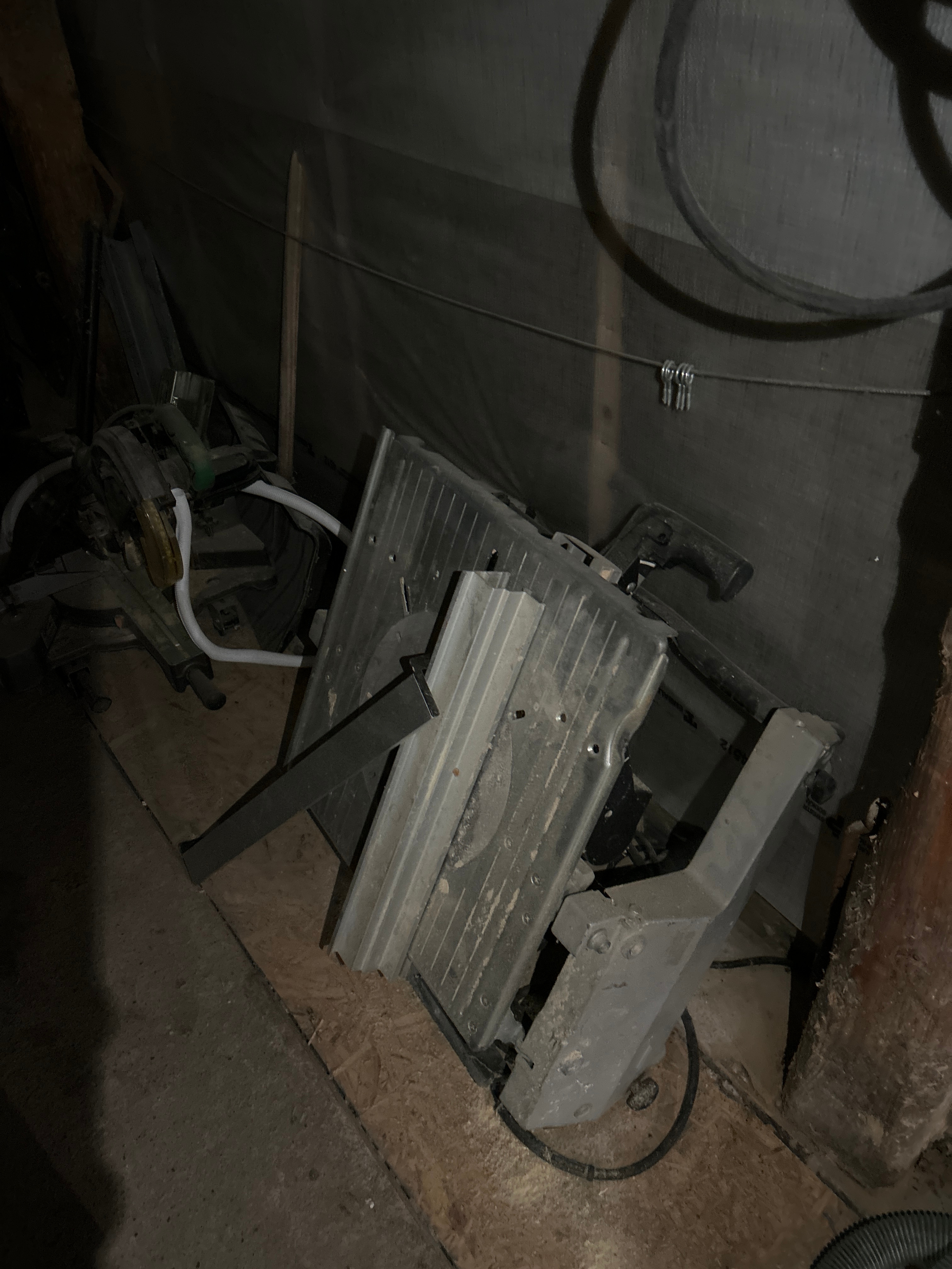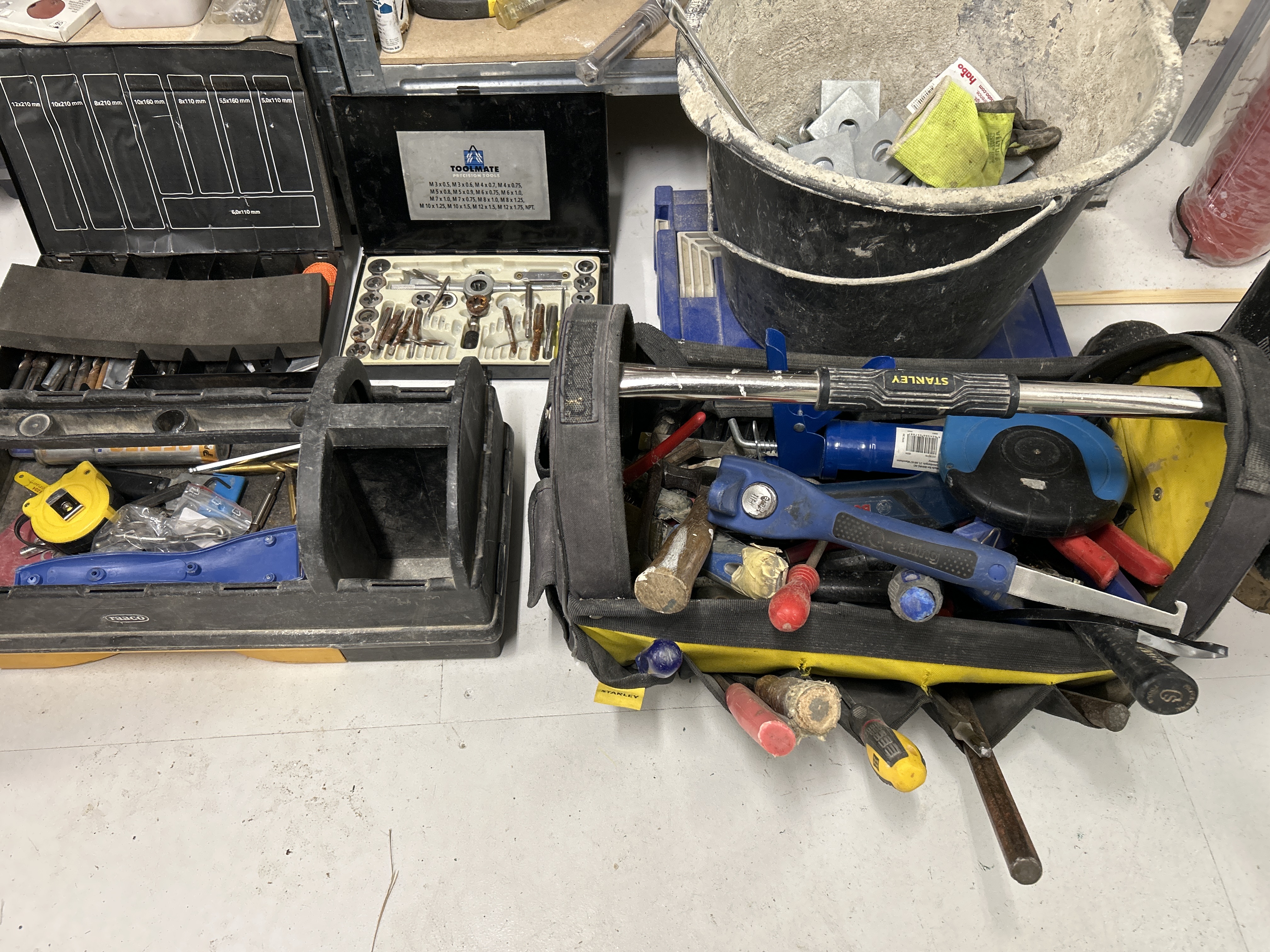 Parti med verkstads- och byggrelaterat material, inklusive verktyg, fästelement och förvaringshyllor.