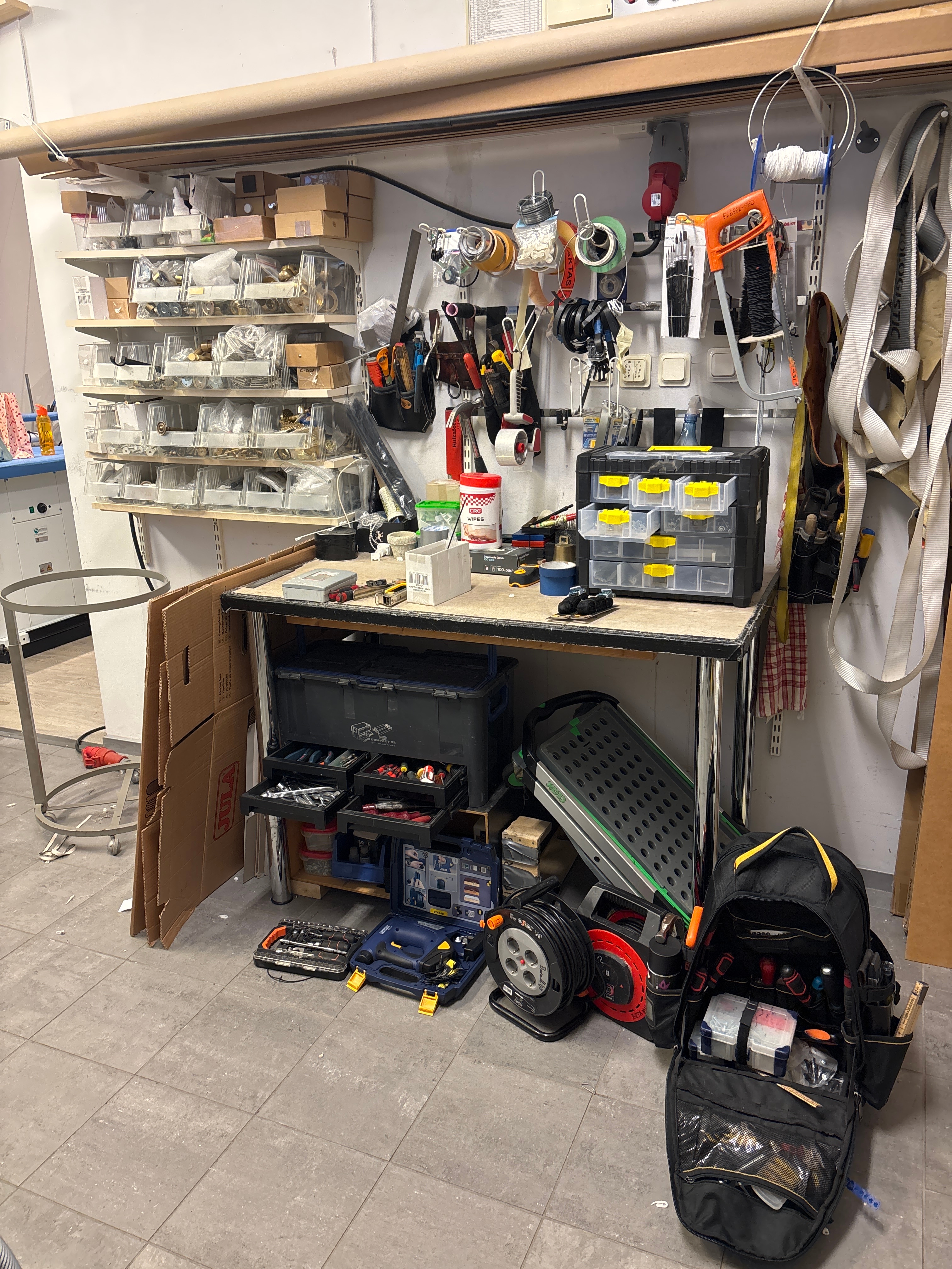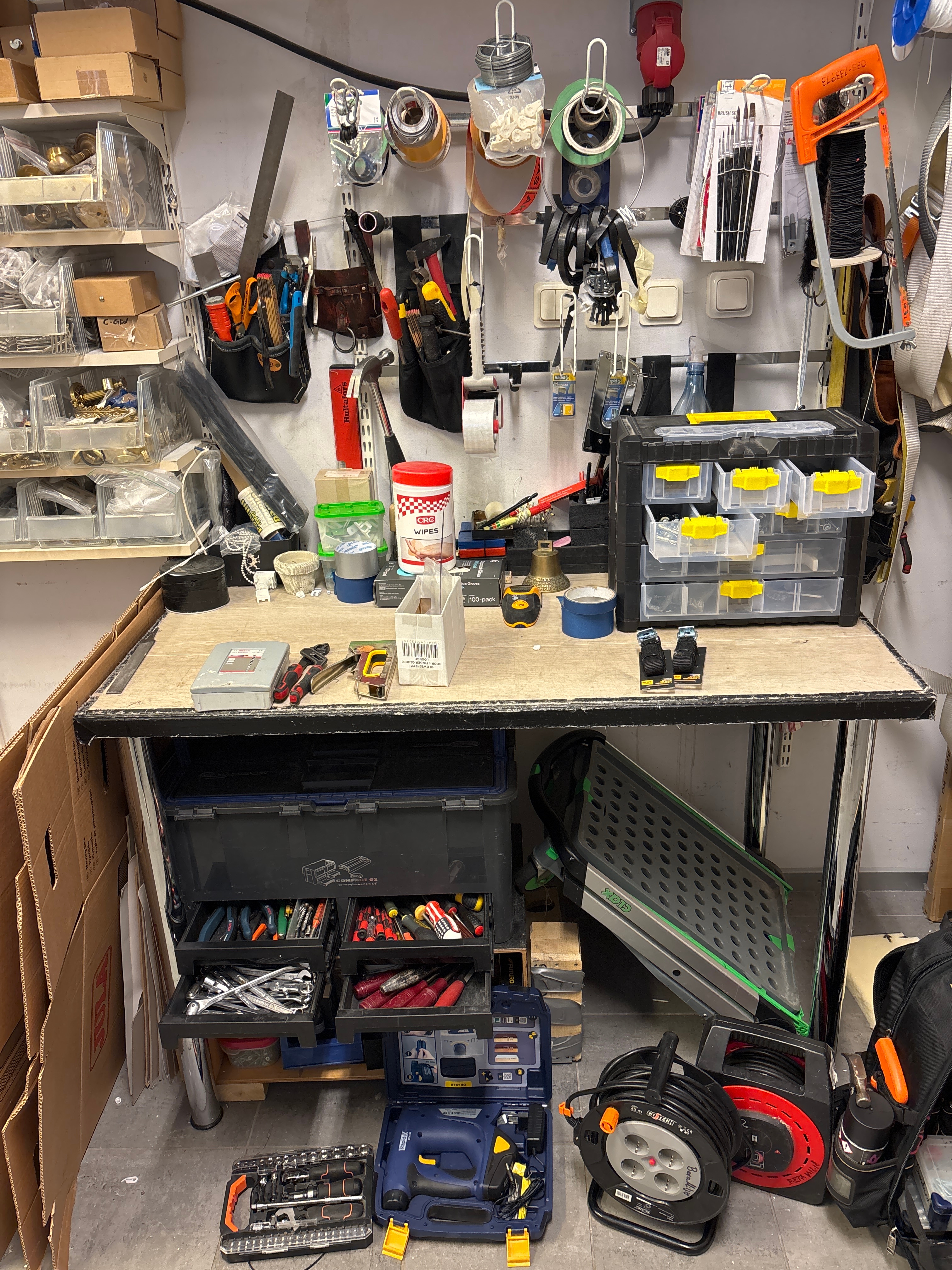 Arbetsbänk med blandade verktyg och utrustning