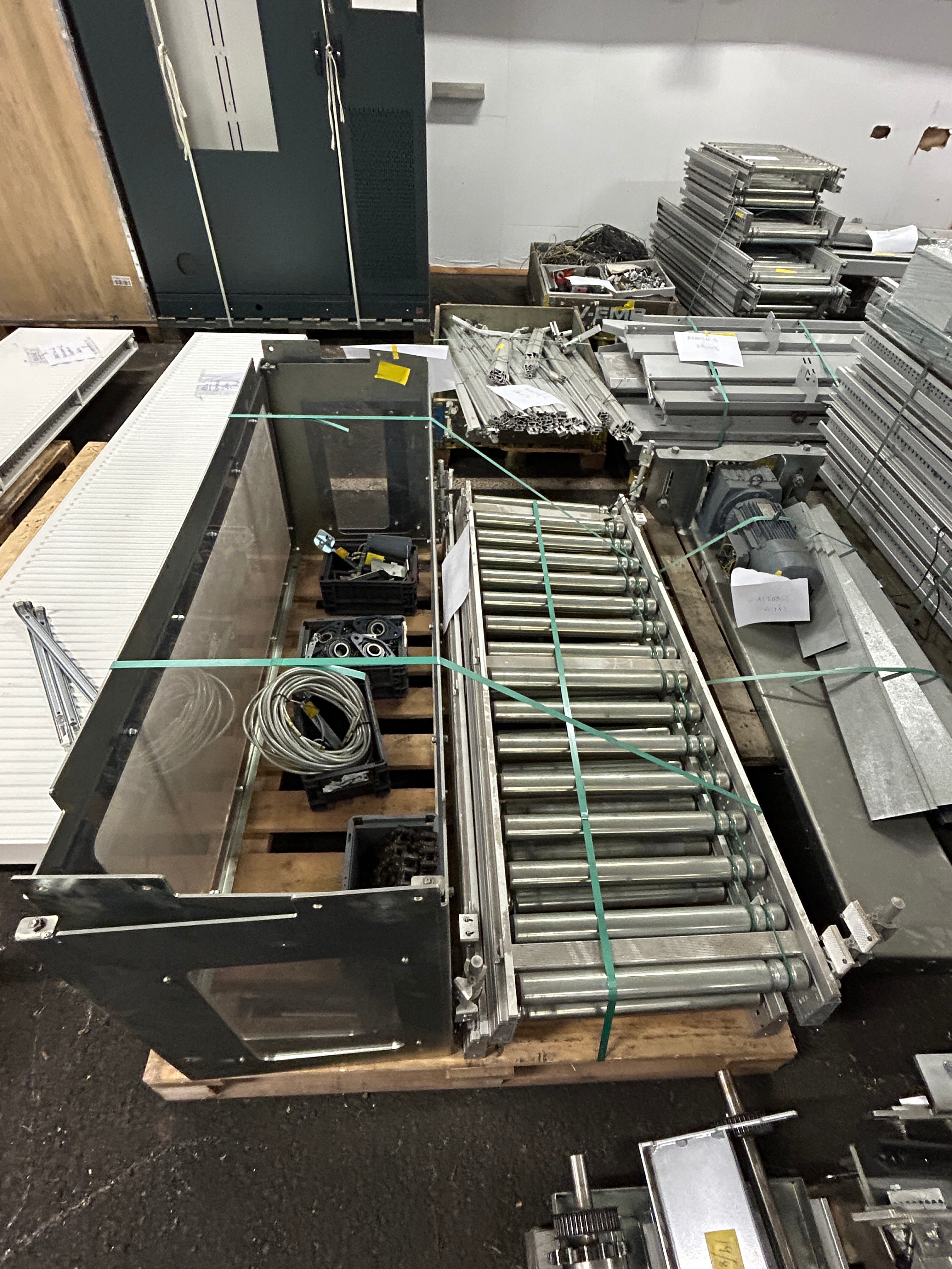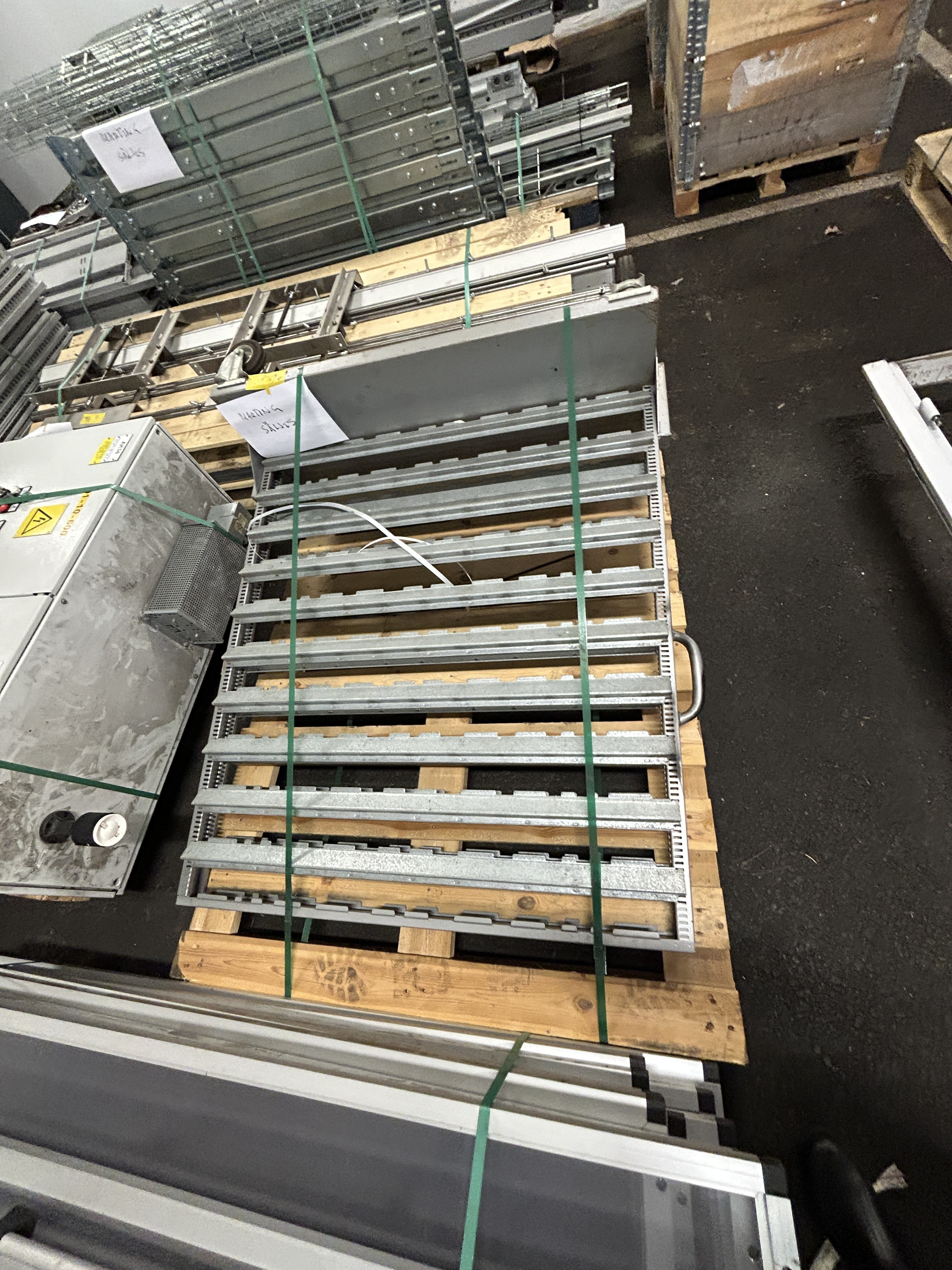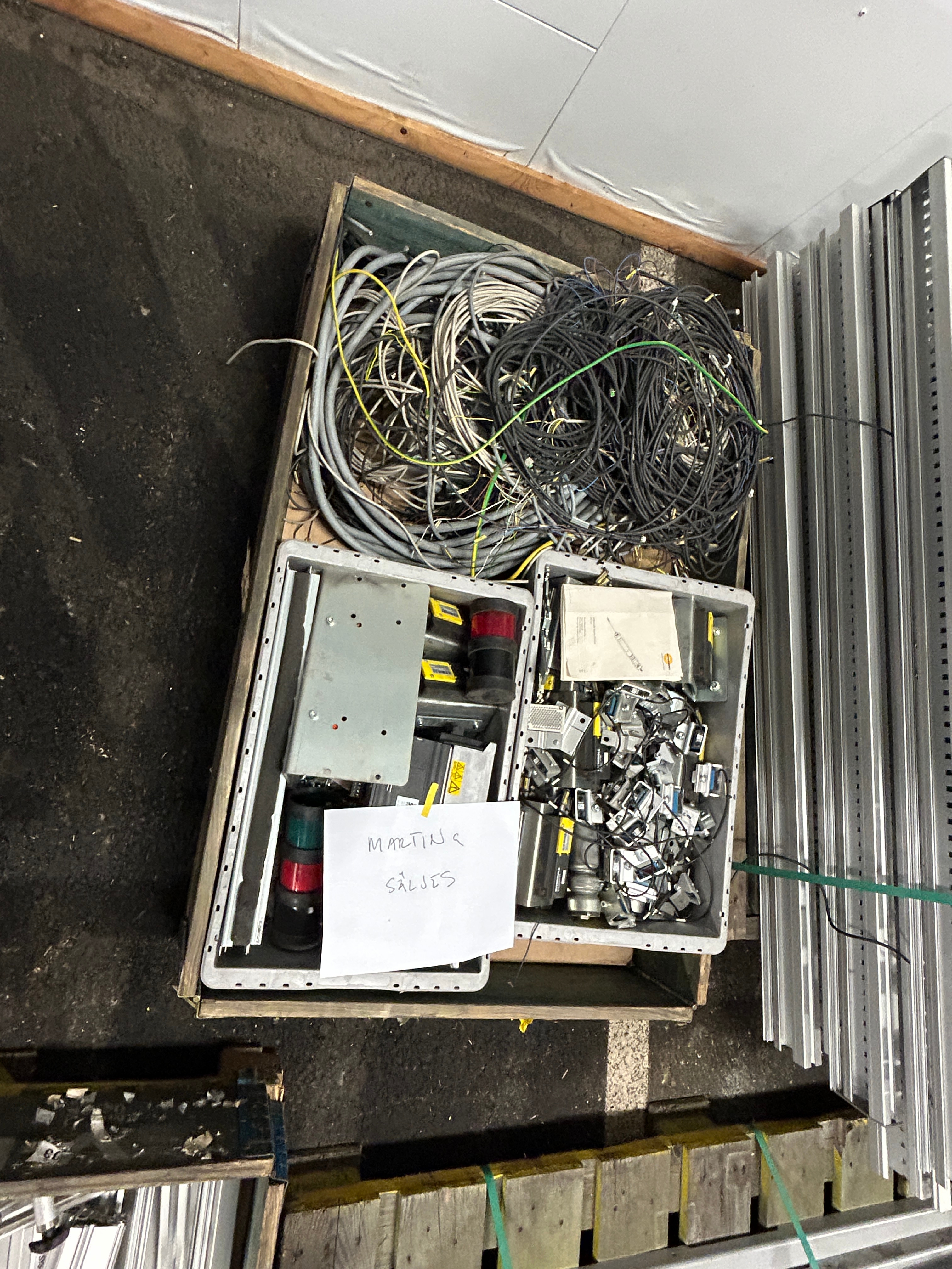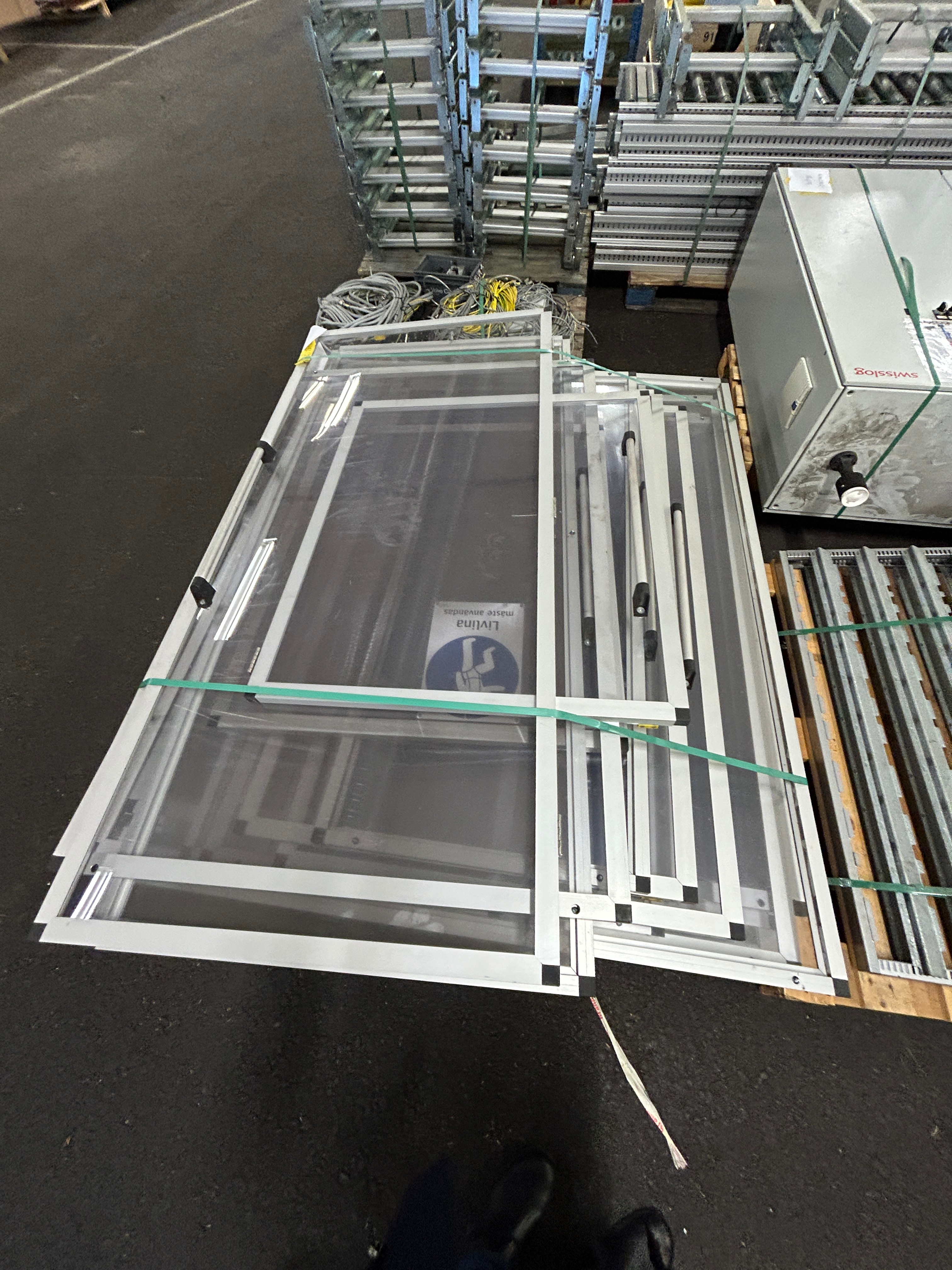 Hissen är demonterad i sektioner och samtliga komponenter är sorterade och märkta på pall för enkel transport och återmontering.