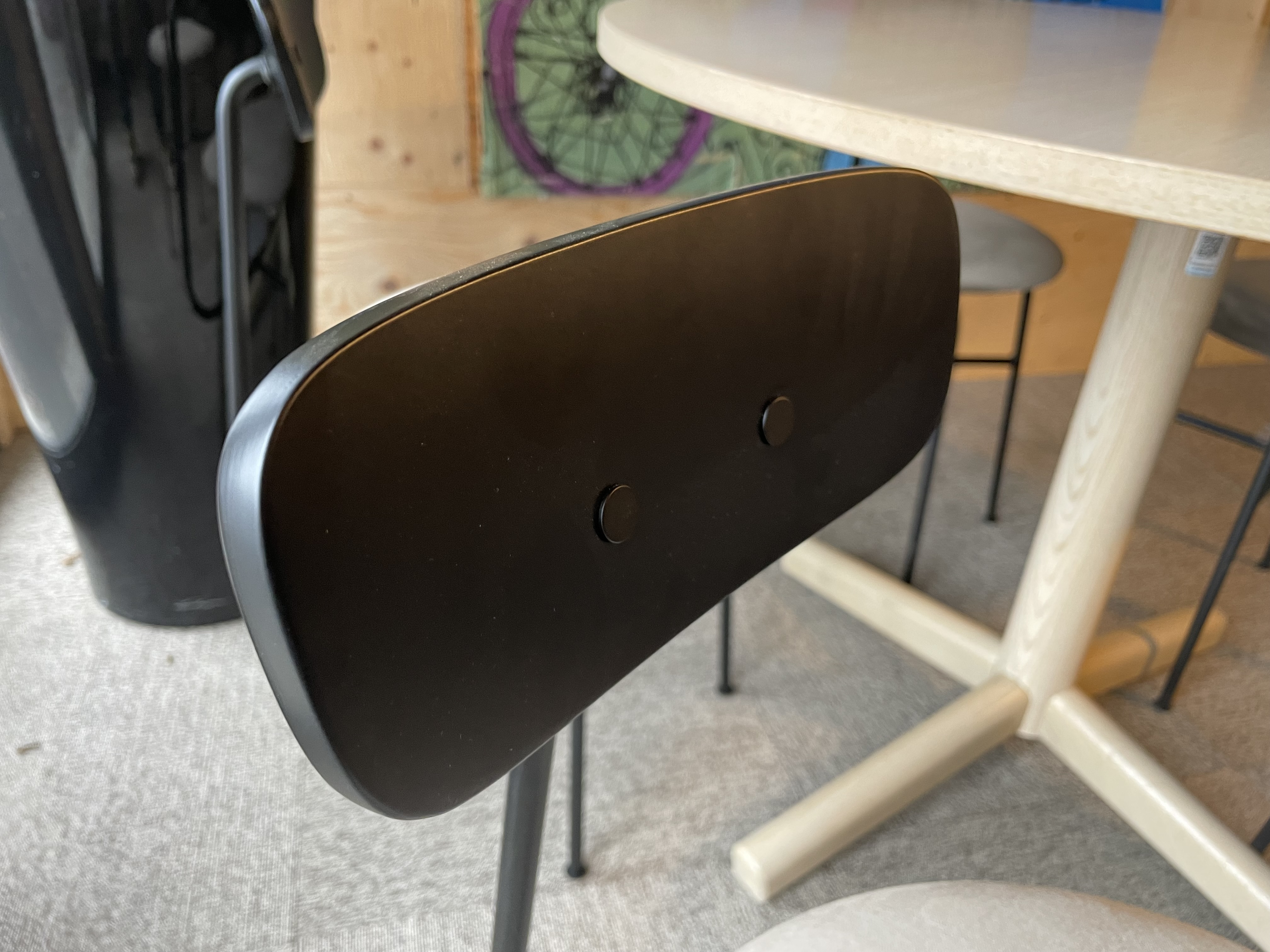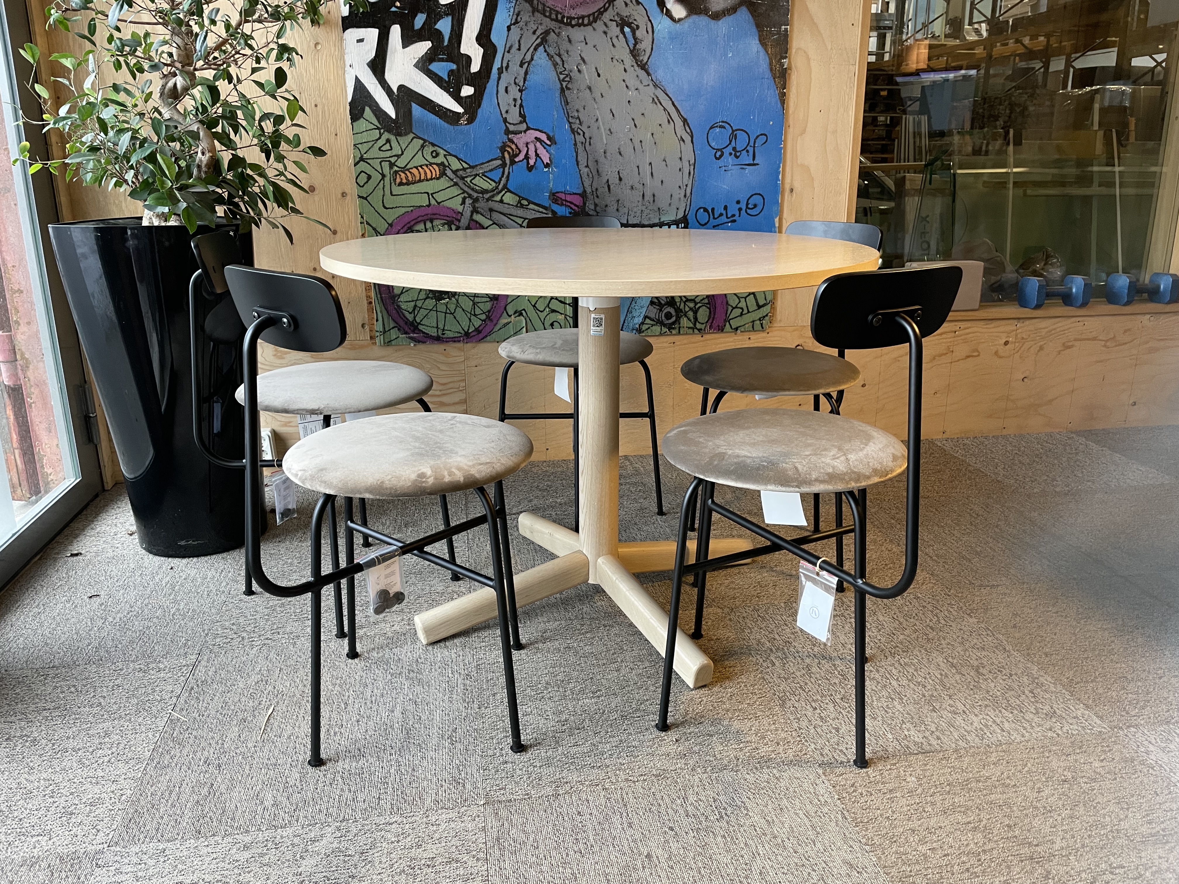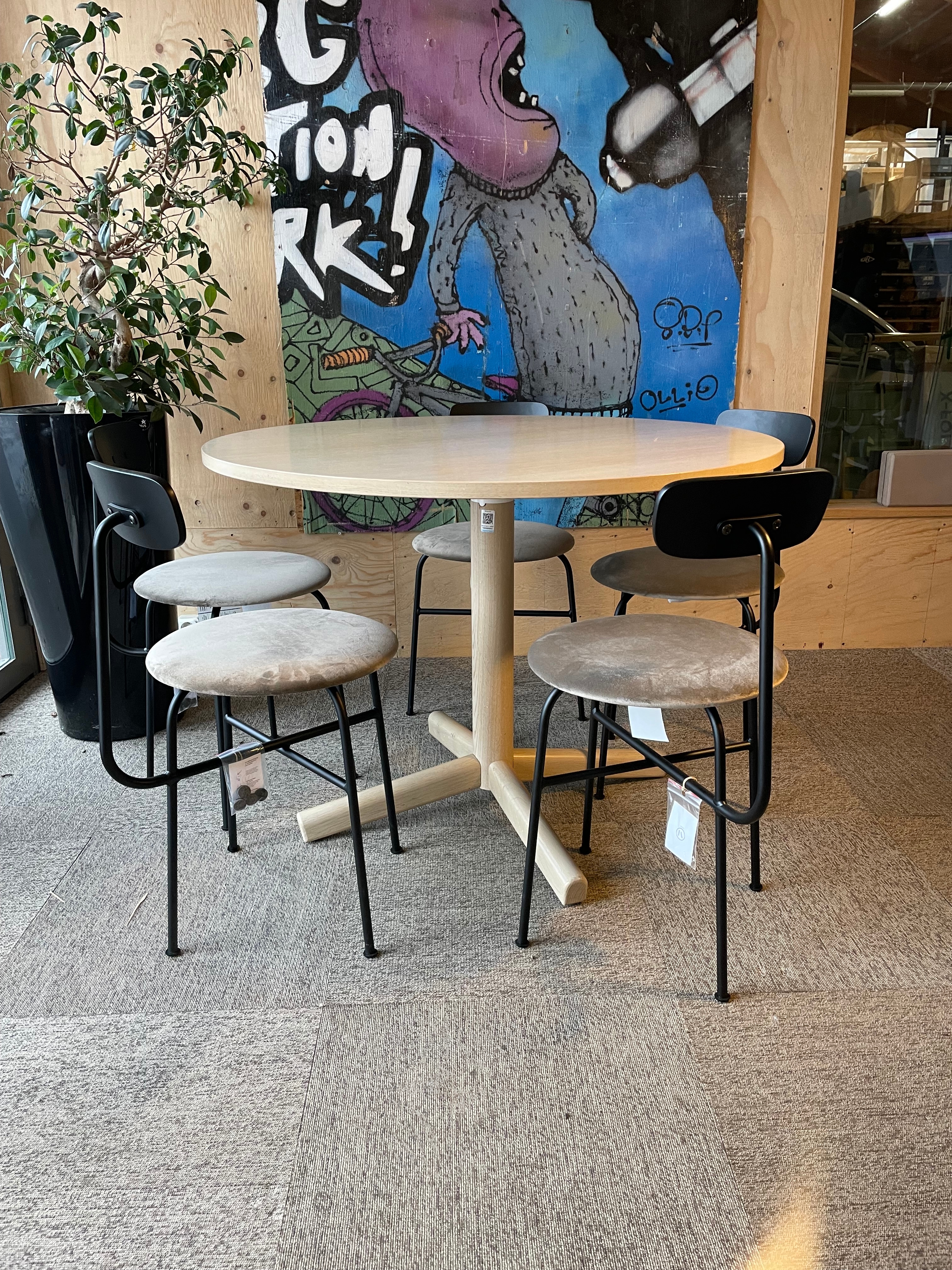 5st stolar som passar både i lunchrummet och i hemmet. Inklusive bord i askfanér 100 cm i diameter.