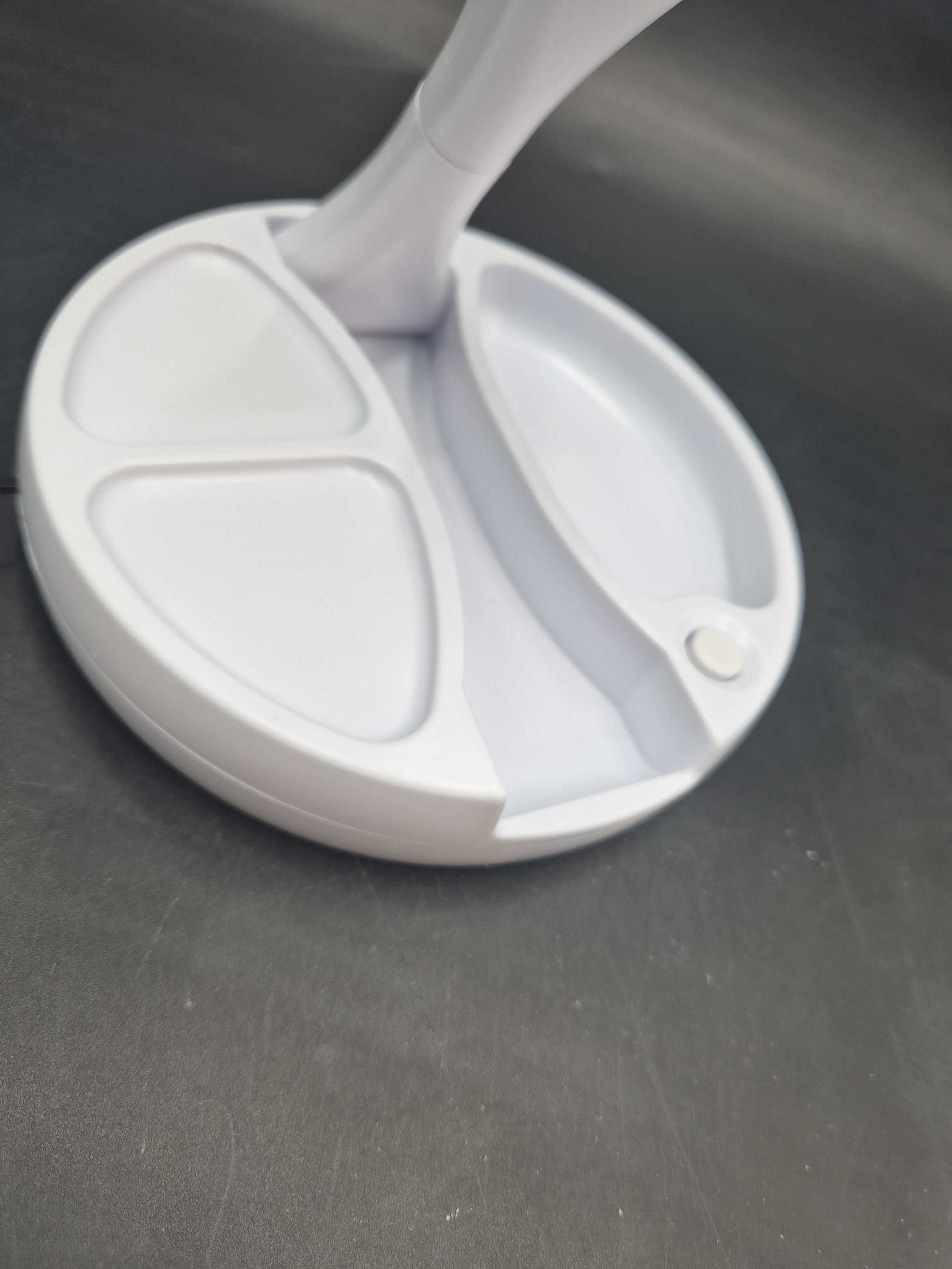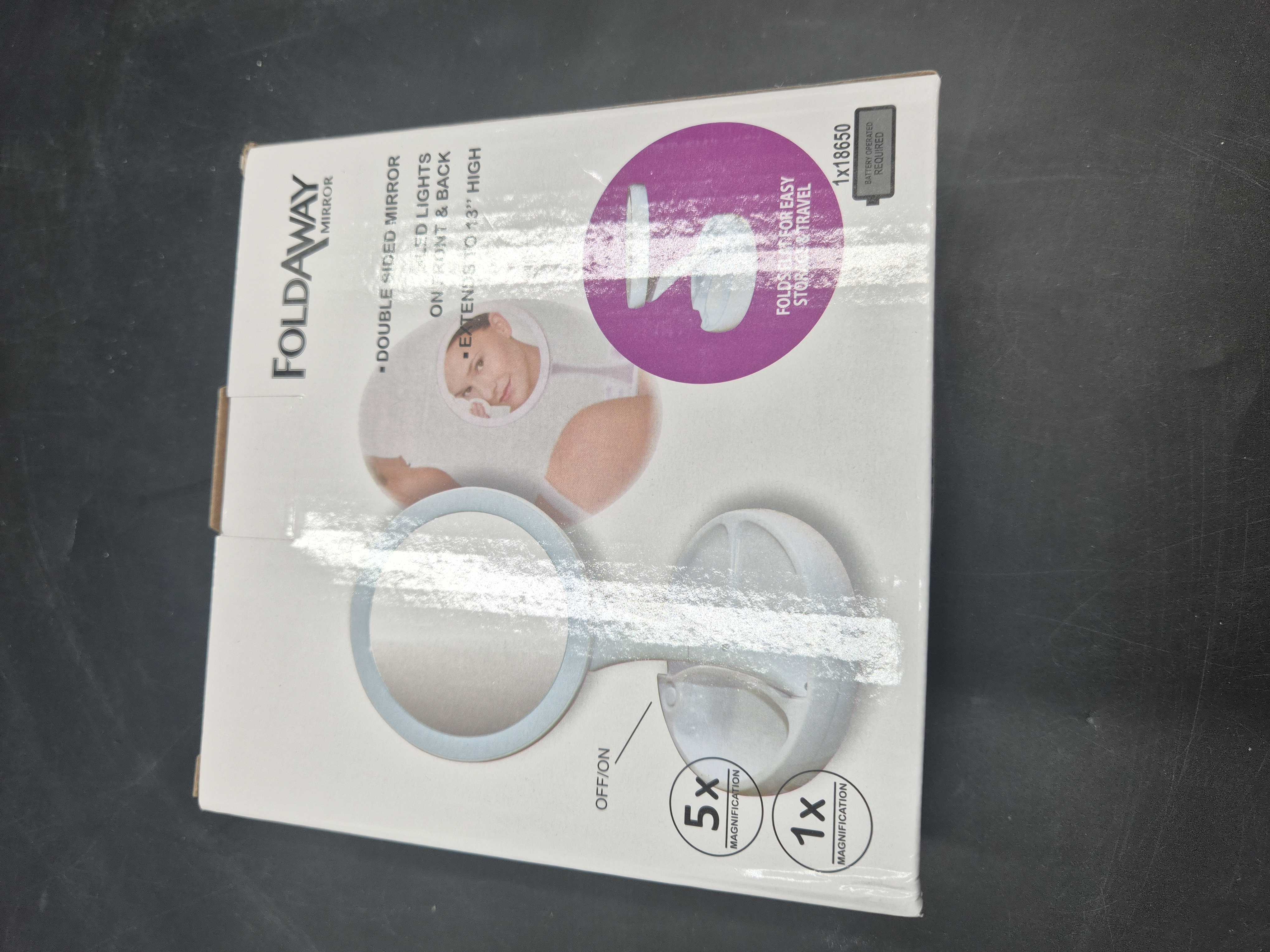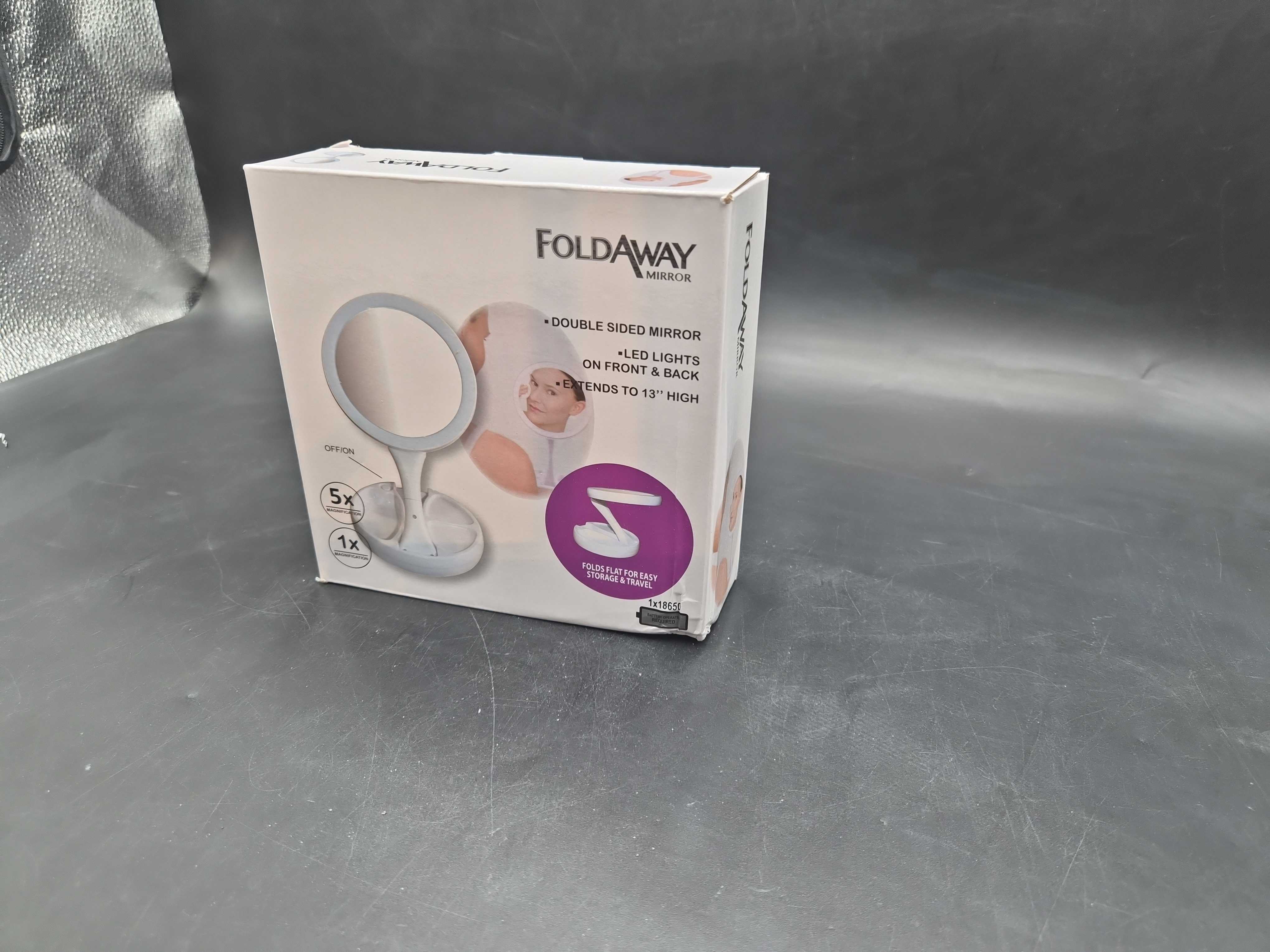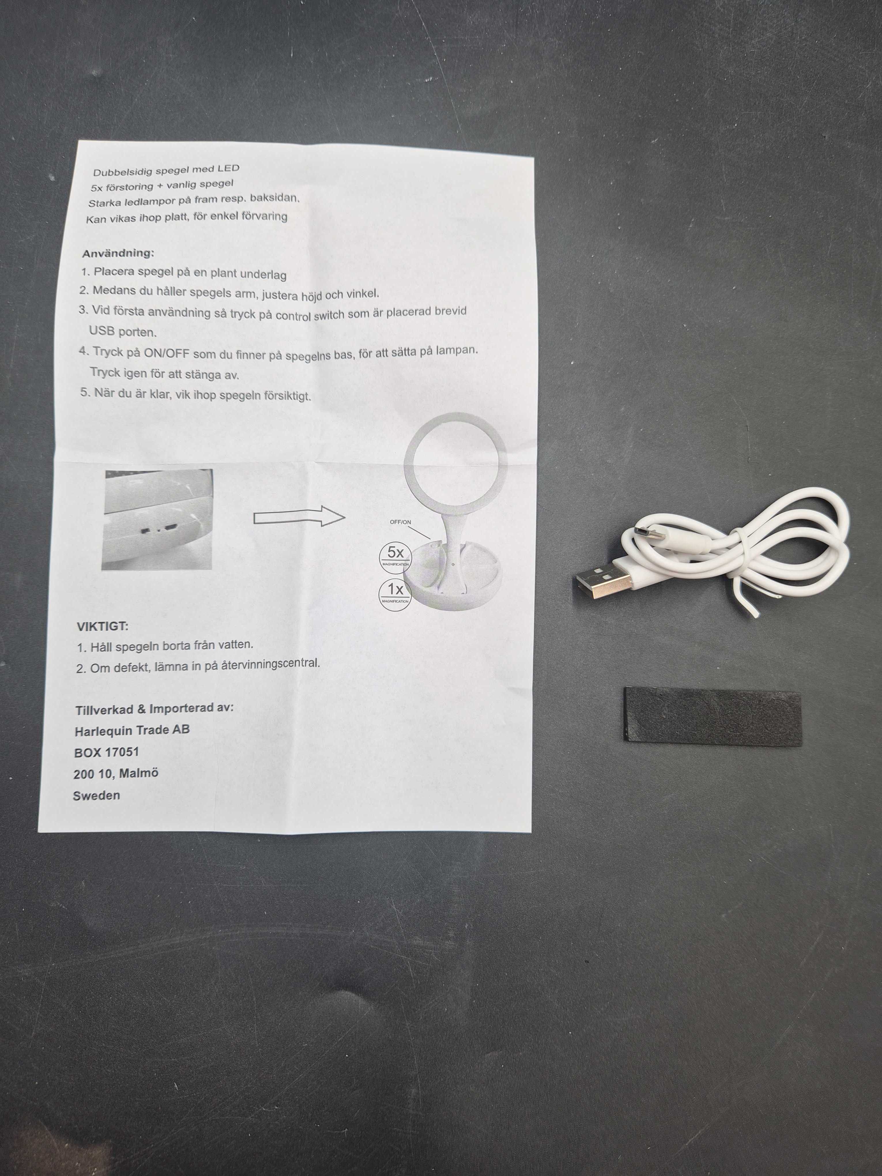 Dubbelsidad spegel med inbyggd LED-belysning. ca 30 cm höjd och är enkel att fälla ihop för förvaring eller resa. Uppladdningsbar via USB. Spegeldiameter ca 15 cm.