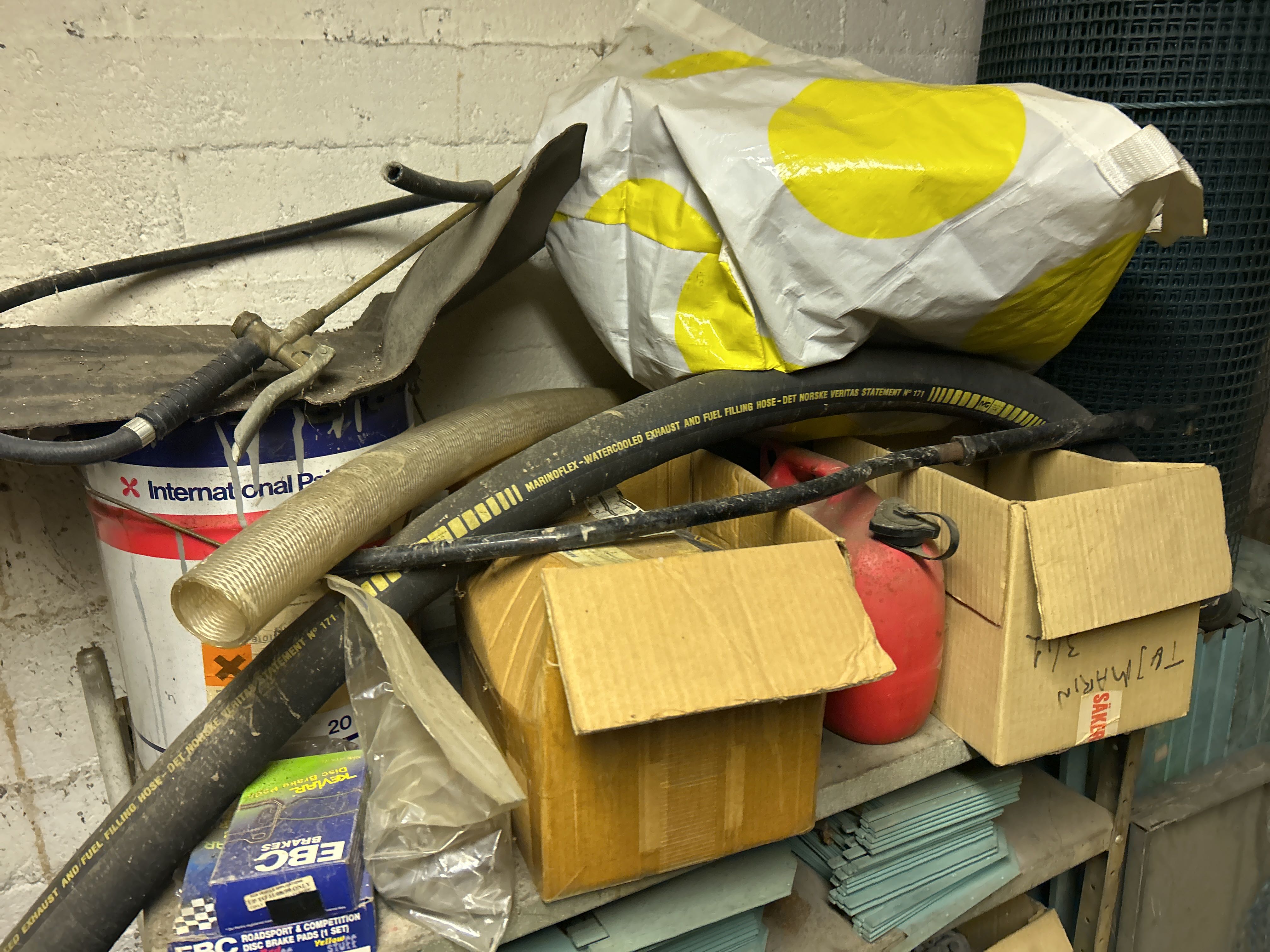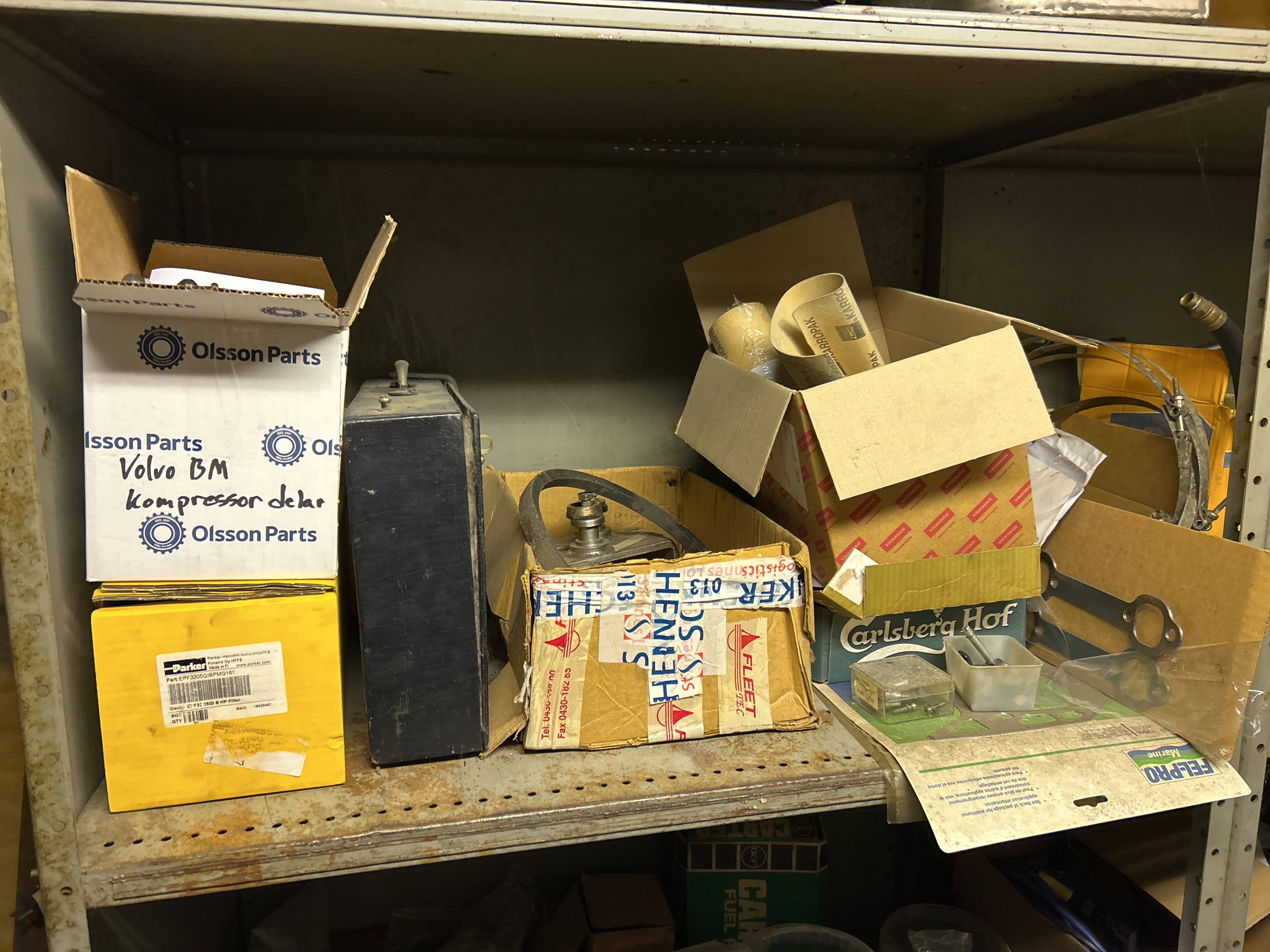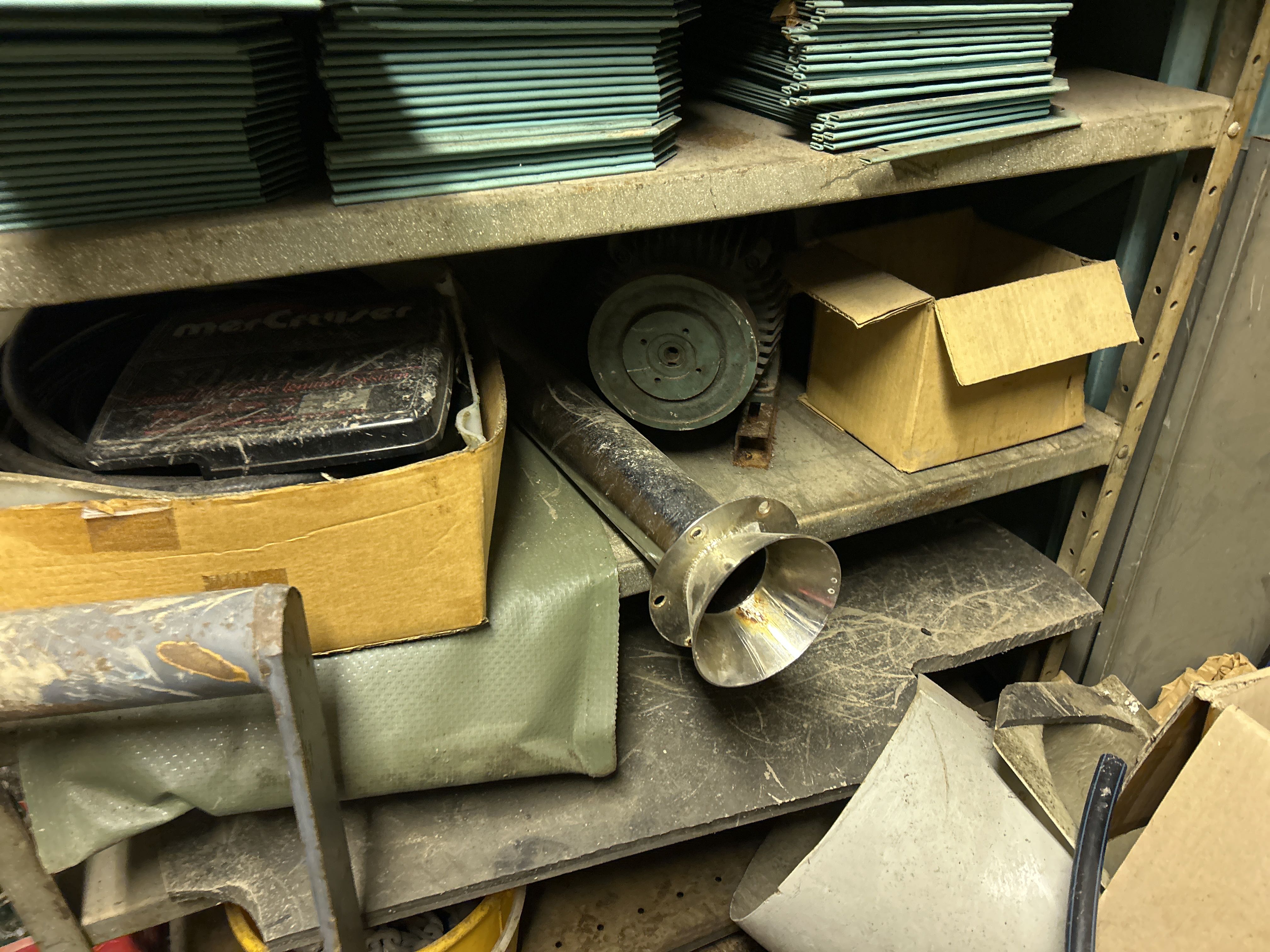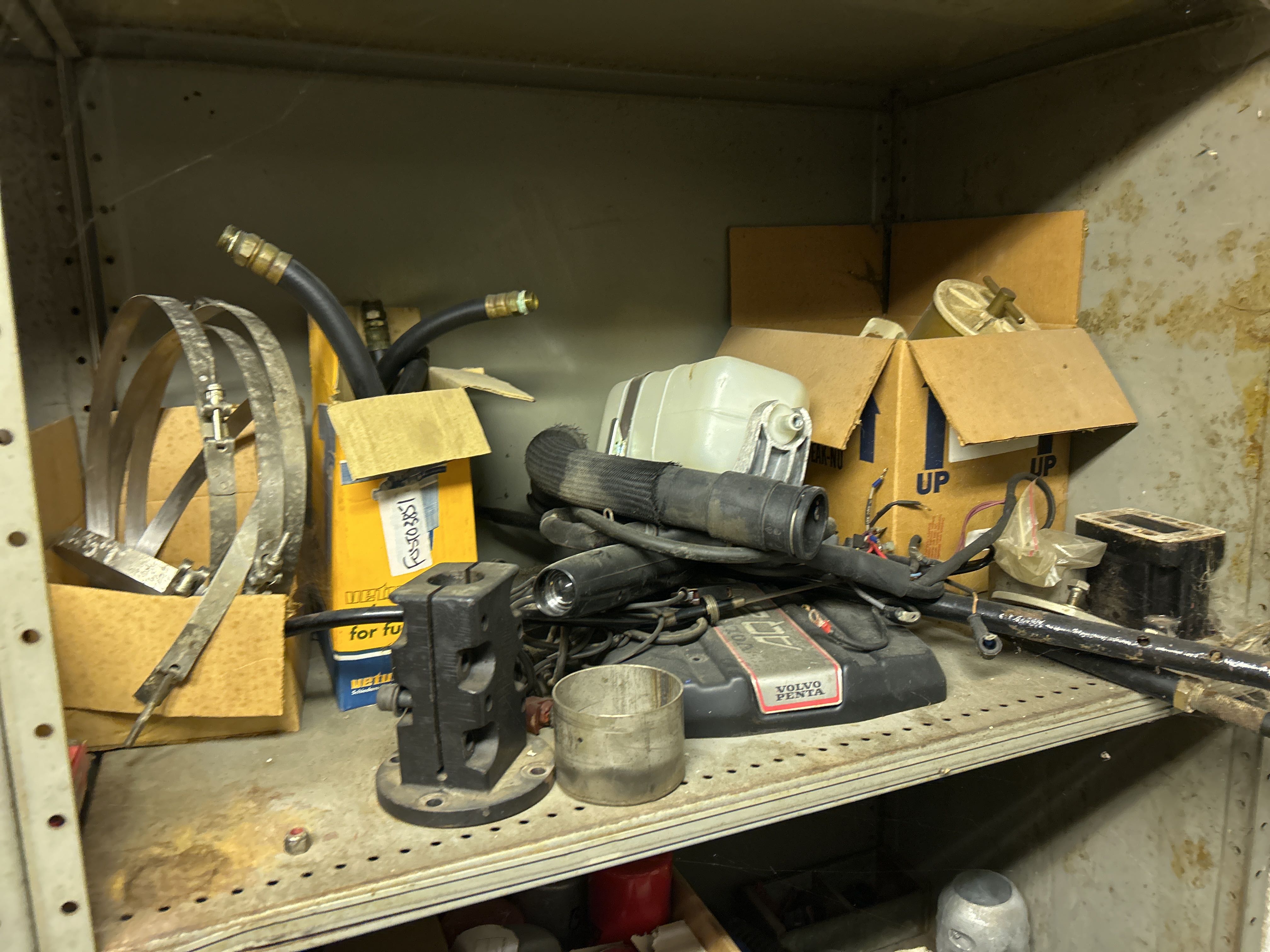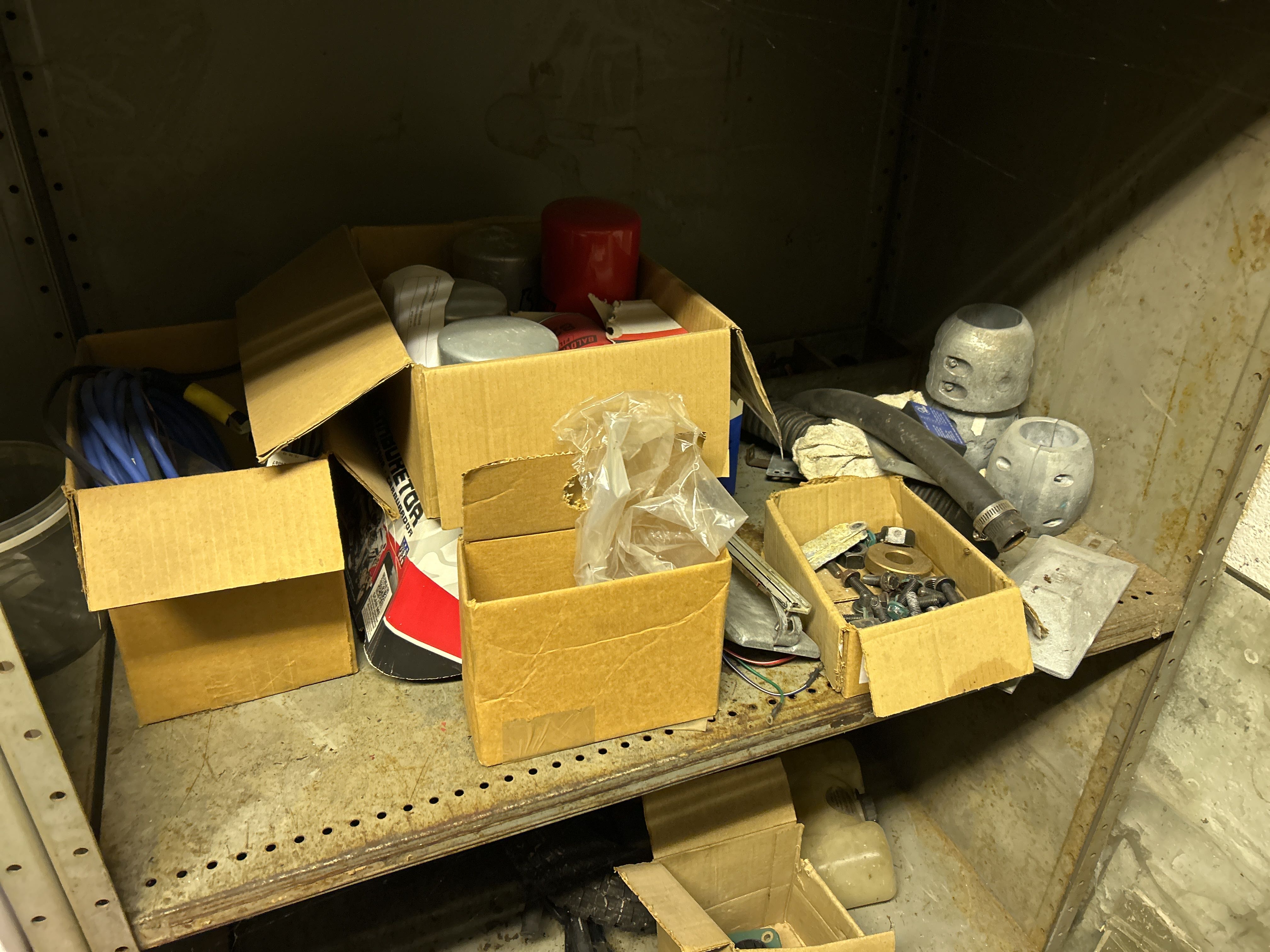 Större samling med diverse reservdelar och inventarier från båtverkstad