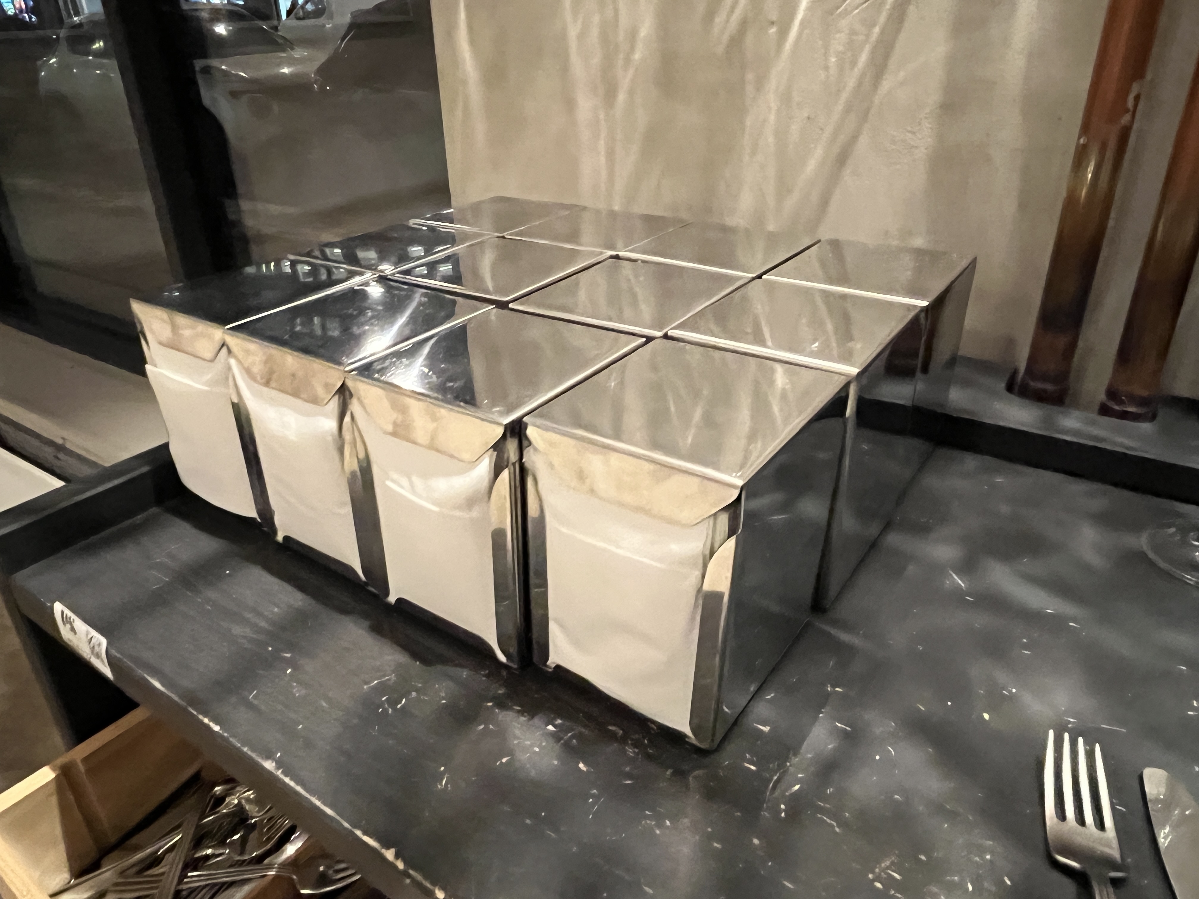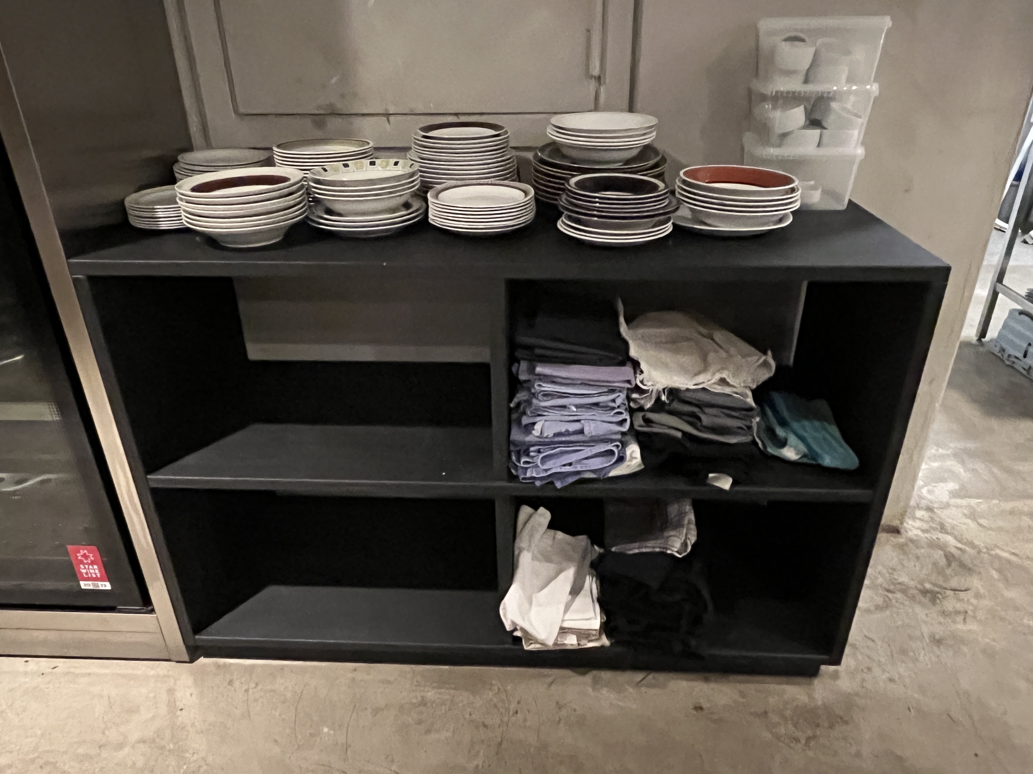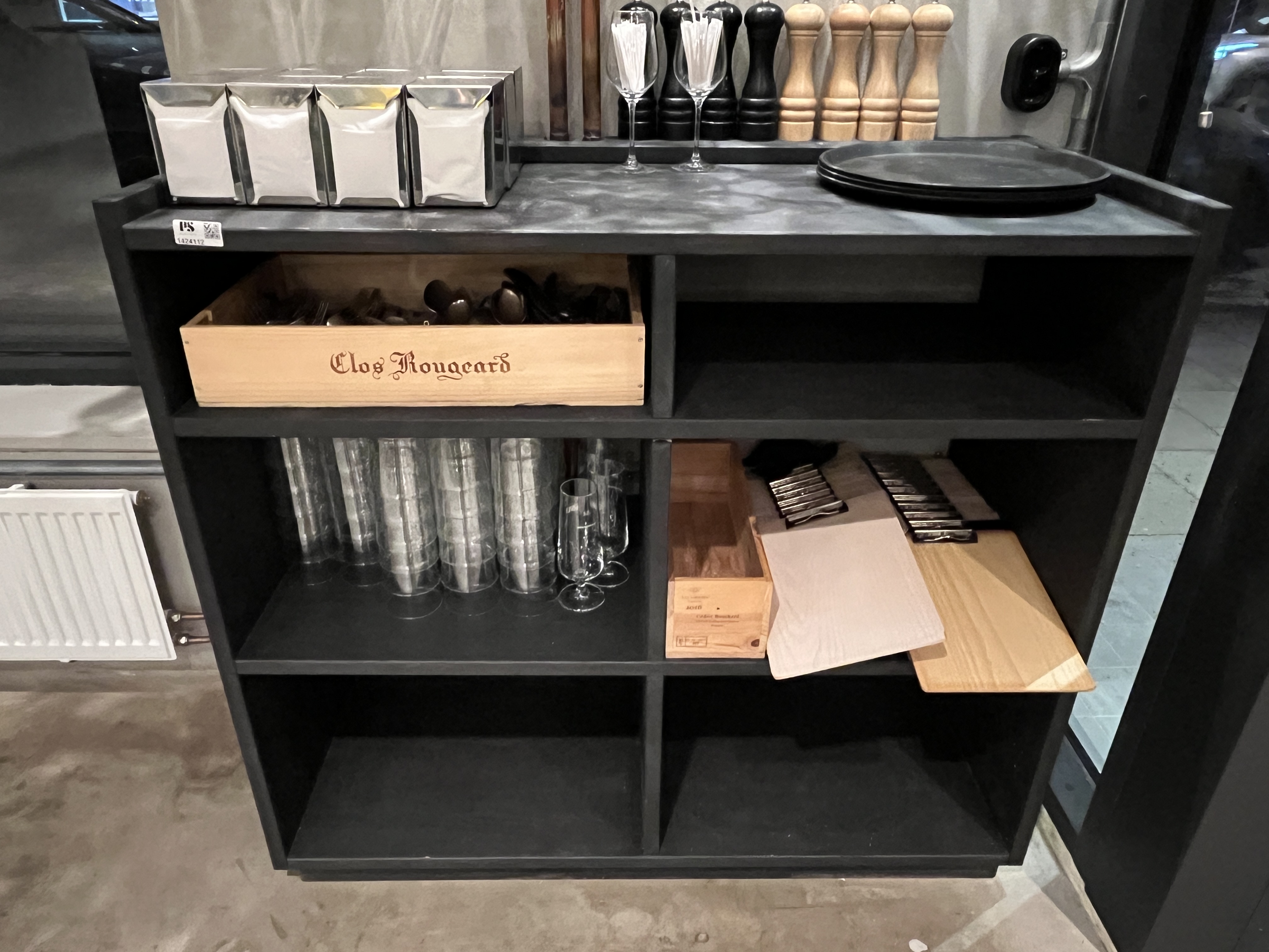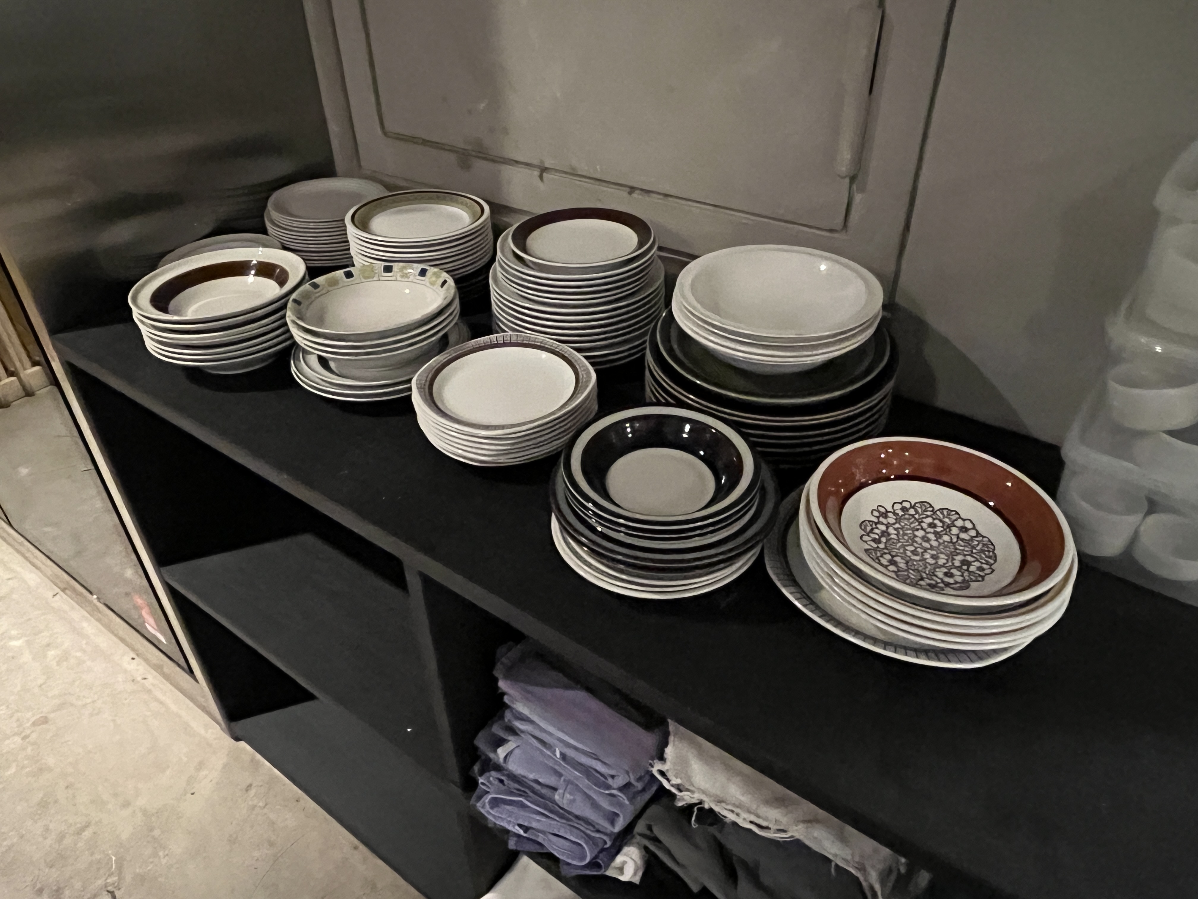 - Uppsättning serveringsutrustning för restaurang eller café. Innehåller blandade delar av klassiskt porslin, rostfria bestick, vattenglas samt två öppna förvaringsbord.