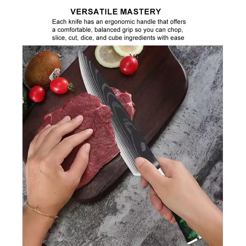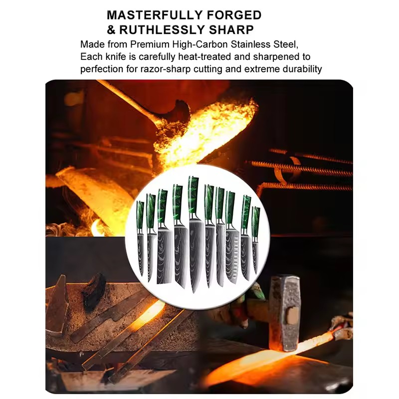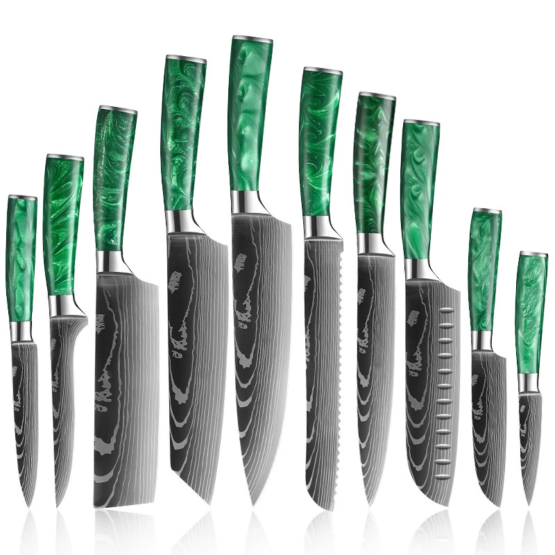 10-delars knivset i höglegerat rostfritt stål med damaskusmönster. Innehåller alla viktiga knivar: santoku, nakiri, kockkniv, brödkniv och fler. Grön marmorfinish på handtagen ger en elegant och ergonomisk design. Perfekt för hemmaköket, restaurangen eller som företagspresent.