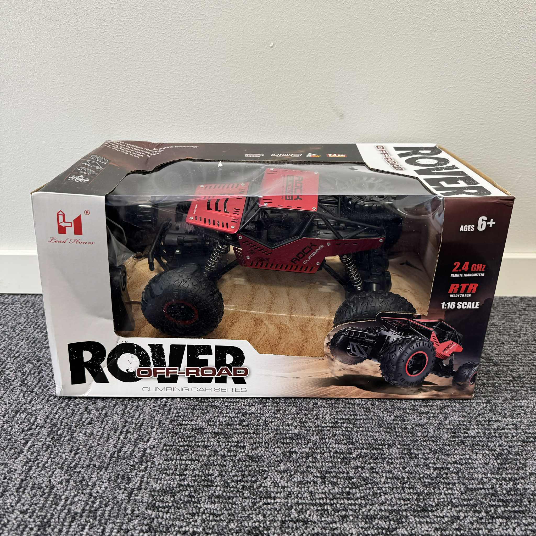 Radiostyrd bil utrustad med stötdämpning och grova däck för körning i terräng. Passar både inom- och utomhus på olika underlag.